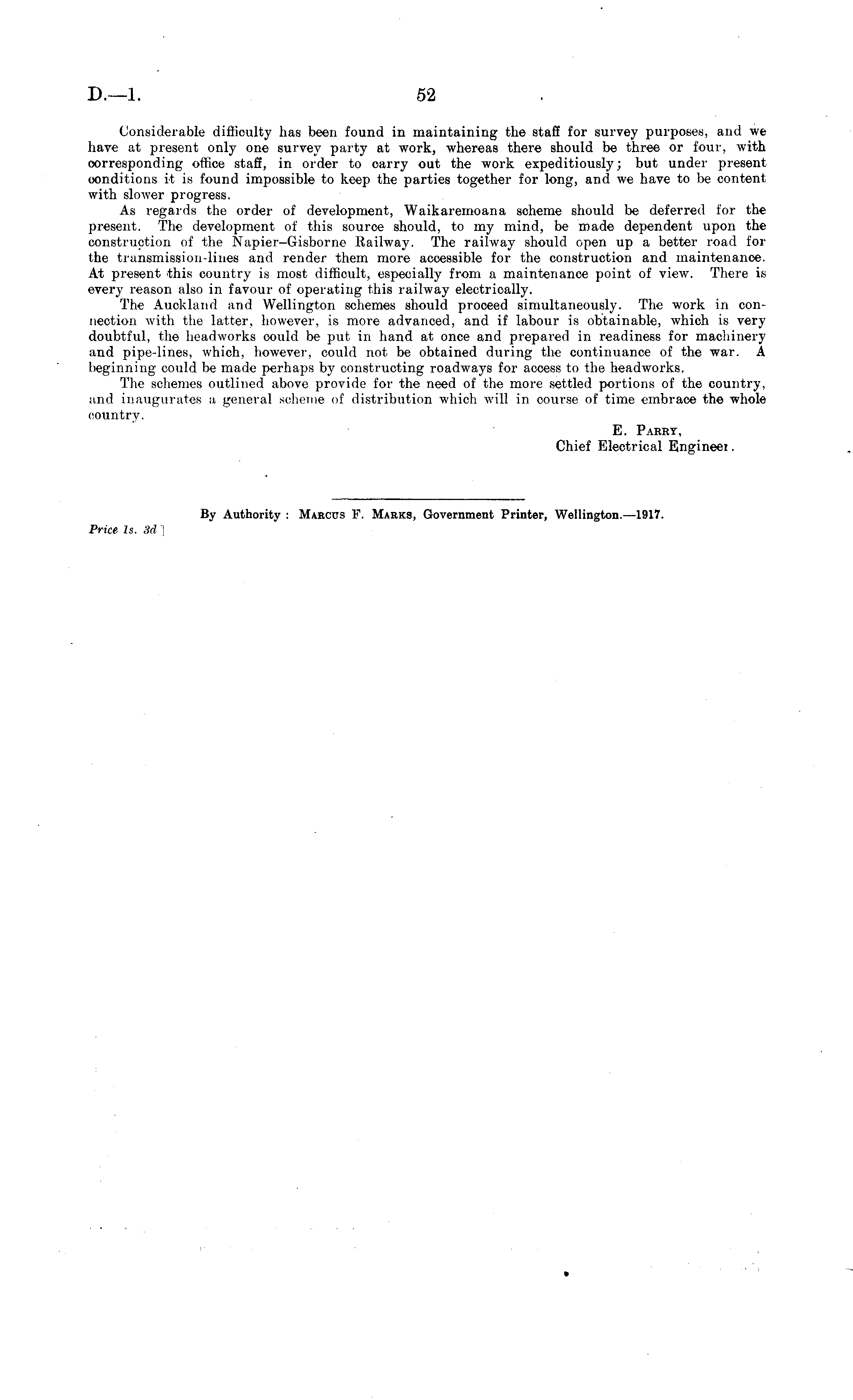 Considerable difficulty has been found in maintaining the staff for survey purposes, and we have at present only one survey party at work, whereas there should be three or four, with corresponding office staff, in order to carry out the work expeditiously; but under present conditions it is found impossible to keep the parties together for long, and we have to be content with slower progress. As regards the order of development, Waikaremoana scheme should be deferred for the present. The development of this source should, to my mind, be made dependent upon the construction of the Napier—Gisborne Railway. The railway should open up a better road for the transmission-lines and render them more accessible for the construction and maintenance. At present -this country is most difficult, especially from a maintenance point of view. There is every reason also in favour of operating this railway electrically. The Auckland and Wellington schemes should proceed simultaneously. The work in connection with the latter, however, is more advanced, and if labour is obtainable, which is very doubtful, the headworks could be put in hand at once and prepared in readiness for machinery and pipe-lines, which, however, could not be obtained during the continuance of the war. A beginning could be made perhaps by constructing roadways for access to the headworks. The schemes outlined above provide for the need of the more settled portions of the country, and inaugurates a general scheme of distribution which will in course of time embrace the whole country. E. Parry, Chief Electrical Engineei.