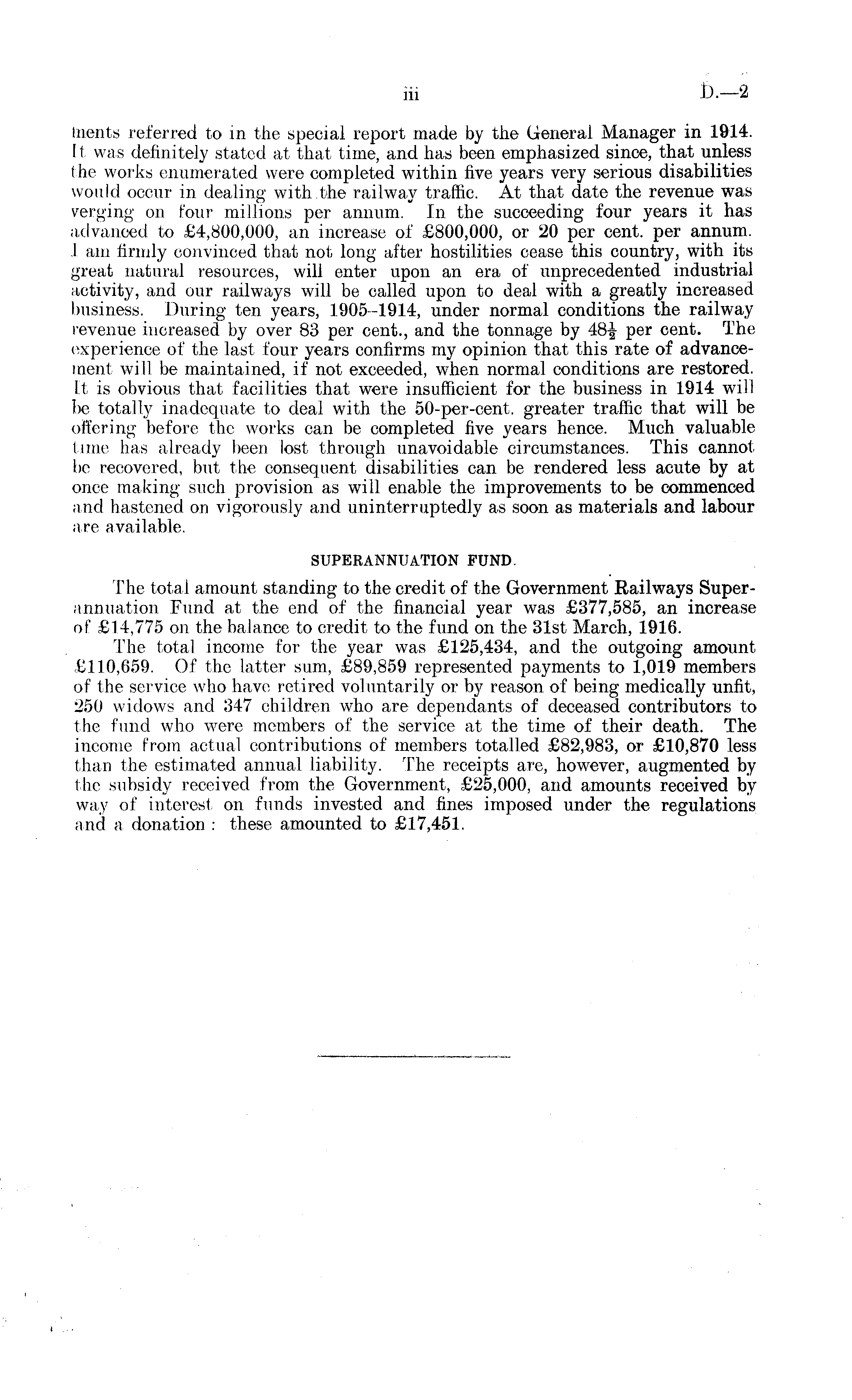tnents referred to in the special report made by the General Manager in 1914. [t was definitely stated at that time, and has been emphasized since, that unless the works enumerated were completed within five years very serious disabilities would occur in dealing with the railway traffic. At that date the revenue was verging on four millions per annum. In the succeeding four years it has advanced to £4,800,000, an increase of £800,000, or 20 per cent, per annum. 1 am firmly convinced that not long after hostilities cease this country, with its great natural resources, will enter upon an era of unprecedented industrial activity, and our railways will be called upon to deal with a greatly increased business. During ten years, 1905-1914, under normal conditions the railway revenue increased by over 83 per cent., and the tonnage by per cent. The experience of the last four years confirms my opinion that this rate of advancement will be maintained, if not exceeded, when normal conditions are restored. It is obvious that facilities that were insufficient for the business in 1914 will be totally inadequate to deal with the 50-per-cent. greater traffic that will be offering before the works can be completed five years hence. Much valuable time has already been lost through unavoidable circumstances. This cannot be recovered, but the consequent disabilities can be rendered less acute by at once making such provision as will enable the improvements to be commenced and hastened on vigorously and uninterruptedly as soon as materials and labour are available. SUPERANNUATION FUND The total amount standing to the credit of the Government Railways Superannuation Fund at the end of the financial year was £377,585, an increase of £14,775 on the balance to credit to the fund on the 31st March, 1916. The total income for the year was £125,434, and the outgoing amount £110,659. Of the latter sum, £89,859 represented payments to 1,019 members of the service who have retired voluntarily or by reason of being medically unfit, 250 widows and 347 children who are dependants of deceased contributors to the fund who were members of the service at the time of their death. The income from actual contributions of members totalled £82,983, or £10,870 less than the estimated annual liability. The receipts are, however, augmented by the subsidy received from the Government, £25,000, and amounts received by way of interest, on funds invested and fines imposed under the regulations and a donation : these amounted to £17,451.