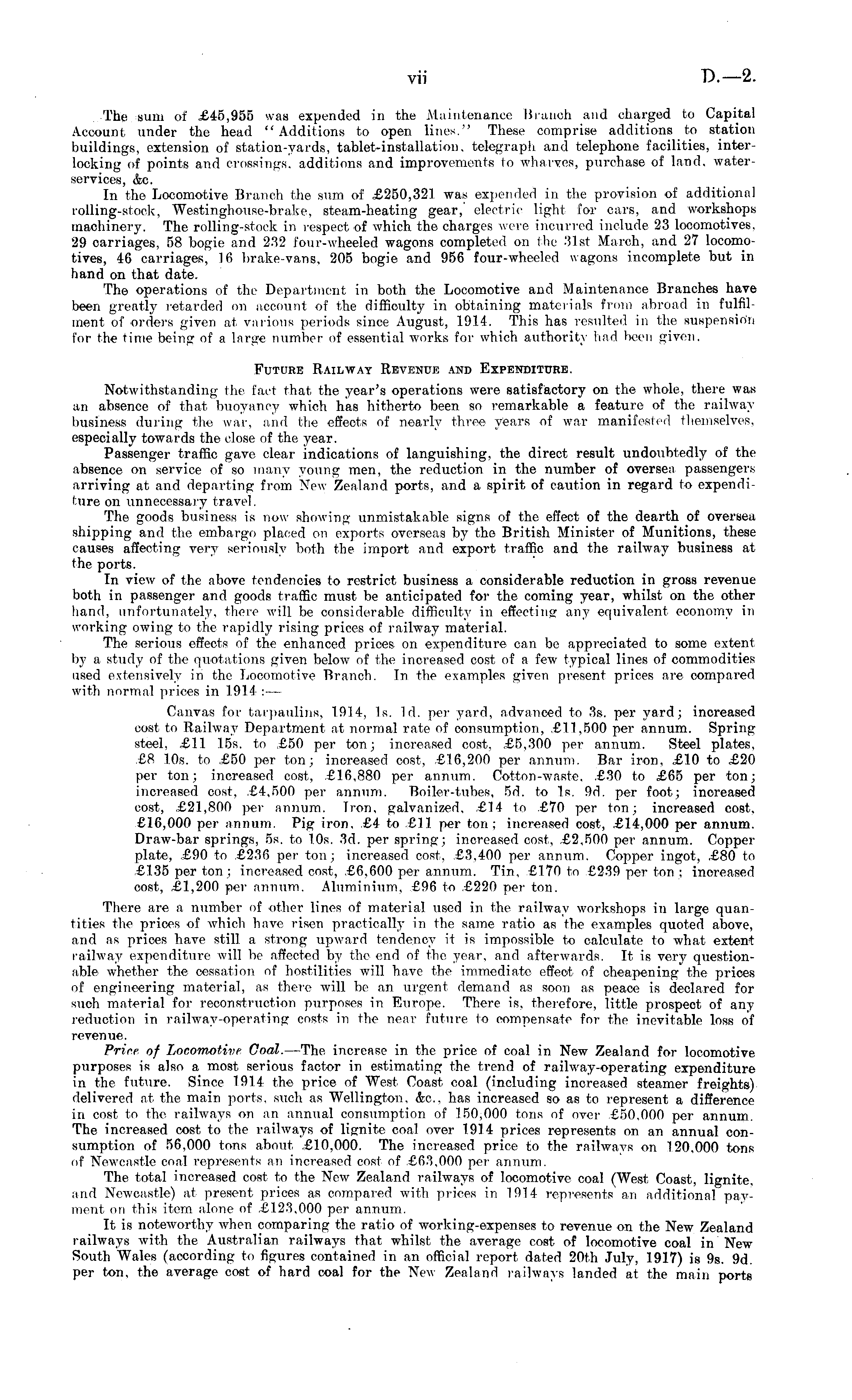 The sum of £45,955 was expended in the Maintenance Branch and charged to Capital Account under the head "Additions to open lines." These comprise additions to station buildings, extension of station-yards, tablet-installation, telegraph and telephone facilities, interlocking of points and crossings, additions and improvements to wharves, purchase of land, waterservices, &c. In the Locomotive Branch the sum of £250,321 was expended in the provision of additional rolling-stock, Westinghouse-brake, steam-heating gear,' electric light for cars, and workshops machinery. The rolling-stock in respect of which the charges were incurred include 23 locomotives. 29 carriages, 58 bogie and 232 four-wheeled wagons completed on the 31st March, and 27 locomotives, 46 carriages, 16 brake-vans, 205 bogie and 956 four-wheeled wagons incomplete but in hand on that date. The operations of the Department in both the Locomotive and Maintenance Branches have been greatly retarded on account of the difficulty in obtaining materials from abroad in fulfilment of orders given at various periods since August, 1914. This has resulted in the suspension for the time being of a large number of essential works for which authority had been given. Future Railway Revenue and Expenditure. Notwithstanding the fact that the year's operations were satisfactory on the whole, there was an absence of that buoyancy which has hitherto been so remarkable a feature of the railway business during the war, and the effects of nearly three years of war manifested themselves, especially towards the close of the year. Passenger traffic gave, clear indications of languishing, the direct result undoubtedly of the absence on service of so many young men, the reduction in the number of oversea passengers arriving at and departing from New Zealand ports, and a spirit of caution in regard to expenditure on unnecessary travel. The goods business is now showing unmistakable signs of the effect of the dearth of oversea shipping and the embargo placed on exports overseas by the British Minister of Munitions, these causes affecting very seriously both the import and export traffic and the railway business at the ports. In view of the above tendencies to restrict business a considerable reduction in gross revenue both in passenger and goods traffic must be anticipated for the coming year, whilst on the other hand, unfortunately, there will be considerable difficulty in effecting any equivalent economy in working owing to the rapidly rising prices of railway material. The serious effects of the enhanced prices on expenditure can be appreciated to some extent by a study of the quotations given below of the increased cost of a few typical lines of commodities used extensively in the Locomotive Branch. In the examples given present prices are compared with normal prices in 1914 : — Canvas for tarpaulins, 1914, Is. Id. per yard, advanced to 3s. per yard; increased cost to Railway Department at normal rate of consumption, £11,500 per annum. Spring steel, £11 15s. to £50 per ton; increased cost, £5,300 per annum. Steel plates, £8 10s. to £50 per ton; increased cost, £16,200 per annum. Bar iron, £10 to £20 per ton; increased cost, £16,880 per annum. Cotton-waste, £30 to £65 per ton; increased cost. £4,500 per annum. Boiler-tubes, sd. to Is. 9d. per foot; increased cost, £21,800 pei- annum. Iron, galvanized, £14 to £70 per ton; increased cost, £16,000 per annum. Pig iron, £4 to £11 per ton; increased cost, £14,000 per annum. Draw-bar springs, ss. to 10s. 3d. per spring; increased cost, £2,500 per annum. Copper plate, £90 to £236 per ton; increased cost, £3,400 per annum. Copper ingot, £80 to £135 per ton ; increased cost, £6,600 per annum. Tin, £170 to £239 per ton ; inoreased cost, £1,200 per annum. Aluminium, £96 to £220 per ton. There are a number of other lines of material used in the railway workshops in large quantities the prices of which have risen practically in the same ratio as the examples quoted above, and as prices have still a strong upward tendency it is impossible to calculate to what extent railway expenditure will be affected by the end of the year, and afterwards. It is very questionable whether the cessation of hostilities will have the immediate effect of cheapening the prices of engineering material, as there will be an urgent demand as soon as peace is declared for such material for reconstruction purposes in Europe. There is, therefore, little prospect of any reduction in railway-operating costs in the near future to compensate for the inevitable loss of revenue. Price of Locomotive Goal. —The increase in the price of coal in New Zealand for locomotive purposes is also a most serious factor in estimating the trend of railway-operating expenditure in the future. Since 1914 the price of West Coast coal (including increased steamer freights) delivered at the main ports, such as Wellington, &c, has increased so as to represent a difference in cost to the railways on an annual consumption of 150,000 tons of over £50,000 per annum. The increased cost to the railways of lignite coal over 1914 prices represents on an annual consumption of 56,000 tons about £10,000. The increased price to the railways on 120.000 tons of Newcastle coal represents an increased cost of £63,000 per annum. The total increased cost to the New Zealand railways of locomotive coal (West Coast, lignite, and Newcastle) at present prices as compared with prices in 1914 represents an additional payment on this item alone of £123,000 per annum. It is noteworthy when comparing the ratio of working-expenses to revenue on the New Zealand railways with the Australian railways that whilst the average cost of locomotive coal in New South Wales (according to figures contained in an official report dated 20th July, 1917) is 9s. 9d. per ton, the average cost of hard coal for the New Zealand railways landed at the main port*
