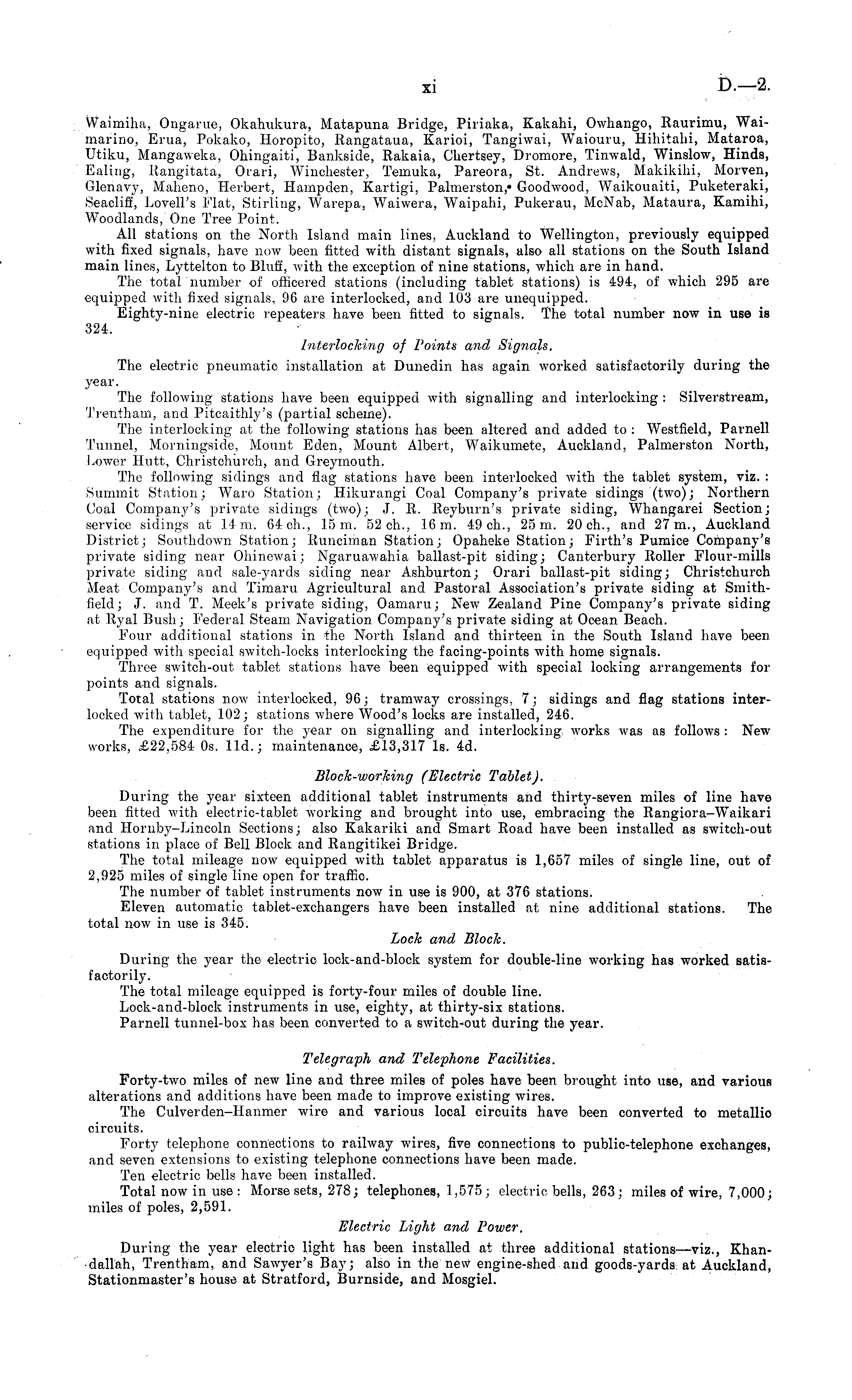 Waimiha, Ongarue, Okahukura, Matapuna Bridge, Piriaka, Kakahi, Owhango, Raurimu, Waimarino, Erua, Pokako, Horopito, Rangataua, Karioi, Tangiwai, W T aiouru, Hihitahi, Mataroa, Utiku, Mangaweka, Ohingaiti, Bankside, Rakaia, Chertsey, Dromore, Tinwald, Winslow, Hinds, Ealing, Rangitata, Orari, Winchester, Temuka, Pareora, St. Andrews, Makikihi, Morven, Glenavy, Maheno, Herbert, Hampden, Kartigi, Palmerston,- Goodwood, Waikouaiti, Puketeraki, Seacliff, Lovell's Flat, Stirling, Warepa, Waiwera, Waipahi, Pukerau, McNab, Mataura, Kamihi, Woodlands, One Tree Point. All stations on the North Island main lines, Auckland to Wellington, previously equipped with fixed signals, have now been fitted with distant signals, also all stations on the South Island main lines, Lyttelton to Bluff, with the exception of nine stations, which are in hand. The total number of officered stations (including tablet stations) is 494, of which 295 are equipped with fixed signals, 96 are interlocked, and 103 are unequipped. Eighty-nine electric repeaters have been fitted to signals. The total number now in use is 324. Interlocking of Points and Signals. The electric pneumatic installation at Dunedin has again worked, satisfactorily during the year. The following stations have been equipped with signalling and interlocking : Silverstream, Trentham, and Pitcaithly's (partial scheme). The interlocking at the following stations has been altered and added to : Westfield, Parnell Tunnel, Morningside, Mount Eden, Mount Albert, Waikumete, Auckland, Palmerston North, Lower ffiutt, Christchurch, and Greymouth. The following sidings and flag stations have been interlocked with the tablet system, viz. : Summit Station; Waro Station; Hikurangi Coal Company's private sidings (two); Northern Coal Company's private sidings (two); J. R. Reyburn's private siding, Whangarei Section; service sidings at 14 m. 64 eh., 15 m. 52 eh., 16 m. 49 eh., 25 m. 20 eh., and 27 m., Auckland District; Southdown Station; Runciman Station; Opaheke Station; Firth's Pumice Company's private siding near Ohinewai; Ngaruawahia ballast-pit siding; Canterbury Roller Flour-mills private siding and sale-yards siding near Ashburton; Orari ballast-pit siding; Christchurch Meat Company's and Timaru Agricultural and Pastoral Association's private siding at Smithfield; J. and T. Meek's private siding, Oamaru; New Zealand Pine Company's private siding at Ryal Bush; Federal Steam Navigation Company's private siding at Ocean Beach. Four additional stations in the North Island and thirteen in the South Island have been equipped with special switch-locks interlocking the facing-points with home signals. Three switch-out tablet stations have been equipped with special locking arrangements for points and signals. Total stations now interlocked, 96; tramway crossings, 7; sidings and flag stations interlocked with tablet, 102; stations where Wood's locks are installed, 246. The expenditure for the year on signalling and interlocking works was as follows : New works, £22,584 os. lid.; maintenance, £13,317 Is. 4d. Block-working (Electric Tablet). During the year sixteen additional tablet instruments and thirty-seven miles of line have been fitted with electric-tablet working and brought into use, embracing the Rangiora-Waikari and Hornby-Lincoln Sections; also Kakariki and Smart Road have been installed as switch-out stations in place of Bell Block and Rangitikei Bridge. The total mileage now equipped with tablet apparatus is 1,657 miles of single line, out of 2,925 miles of single line open for traffic. The number of tablet instruments now in use is 900, at 376 stations. Eleven automatic tablet-exchangers have been installed at nine additional stations. The total now in use is 345. Lock and Block. During the year the electric lock-and-block system for double-line working has worked satisfactorily. The total mileage equipped is forty-four miles of double line. Lock-and-block instruments in use, eighty, at thirty-six stations. Parnell tunnel-box has been converted to a switch-out during the year. Telegraph and Telephone Facilities. Forty-two miles of new line and three miles of poles have been brought into use, and various alterations and additions have been made to improve existing wires. The Culverden-Hanmer wire and various local circuits have been converted to metallic circuits. Forty telephone connections to railway wires, five connections to public-telephone exchanges, and seven extensions to existing telephone connections have been made. Ten electric bells have been installed. Total now in use : Morse sets, 278; telephones, 1,575; electric bells, 263; miles of wire, 7,000; miles of poles, 2,591. Electric Light and Power. During the year electrio light has been installed at three additional stations—viz., Khan■dallah, Trentham, and Sawyer's Bay; also in the new engine-shed and goods-yards, at Auckland, Stationmaster's house at Stratford, Burnside, and Mosgiel.