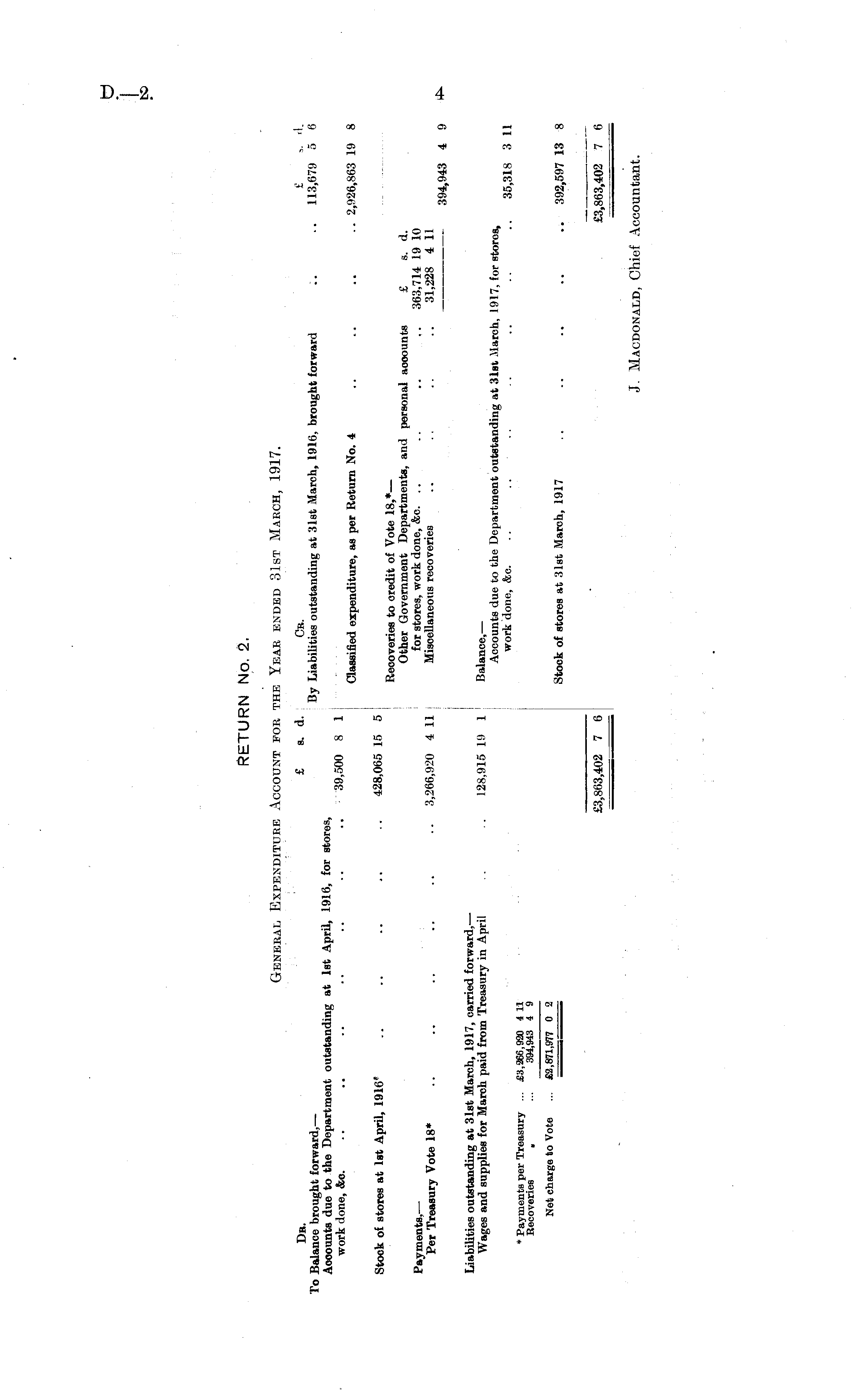 Return No. i. General Expenditure Account for the Year ended 31st March, 1917. Db. £ s. d. Cb. £ i. 'i. To Balance brought forward,— By Liabilities outstanding at 31st March, 1916, brought forward ;. .. 113,679 5 6 Aooounts due to the Department outstanding at Ist April, 1916, for stores, work done, &o. .. .. .. •• .. •■ •• 39,500 8 1 Classified expenditure, as per Return No. 4 .. ~ .. .. 2,926,863 19 8 Stock of stores at Ist April, 1916' .. .. .. .. .. 428,065 15 5 ..,___ Reooveries to oredit of Vote 18,*— Other Government Departments, and personal aooounts £ s. d. Payments,— for stores, work done, &c. .. .. .. ~ 363,714 19 10 Per Treasury Vote 18* .. .. .. .. .. •• 3,266,920 411 Miscellaneous recoveries .. .. .. .. 31,228 411 394,943 4 9 Liabilities outstanding at 31st March, 1917, carried forward,— Wages and supplies for March paid from Treasury in April ~ .. 128,915 19 1 Balance,— Accounts due to the Department outstanding at 31st March, 1917, for storos, work done, &c. .. .. .. .. .. .. .. 35,318 311 * Payments per Treasury ... £3,266,920 4 11 Recoveries » ... 394,943 4 9 Net charge to Vote ... £2,871,977 0 2 - Stock of stores at 31st March, 1917 .. .. .. .. .. 392,597 13 8 £3,863,402 7 6 £3,863,402 7 6 J. Macdonald, Chief Accountant.