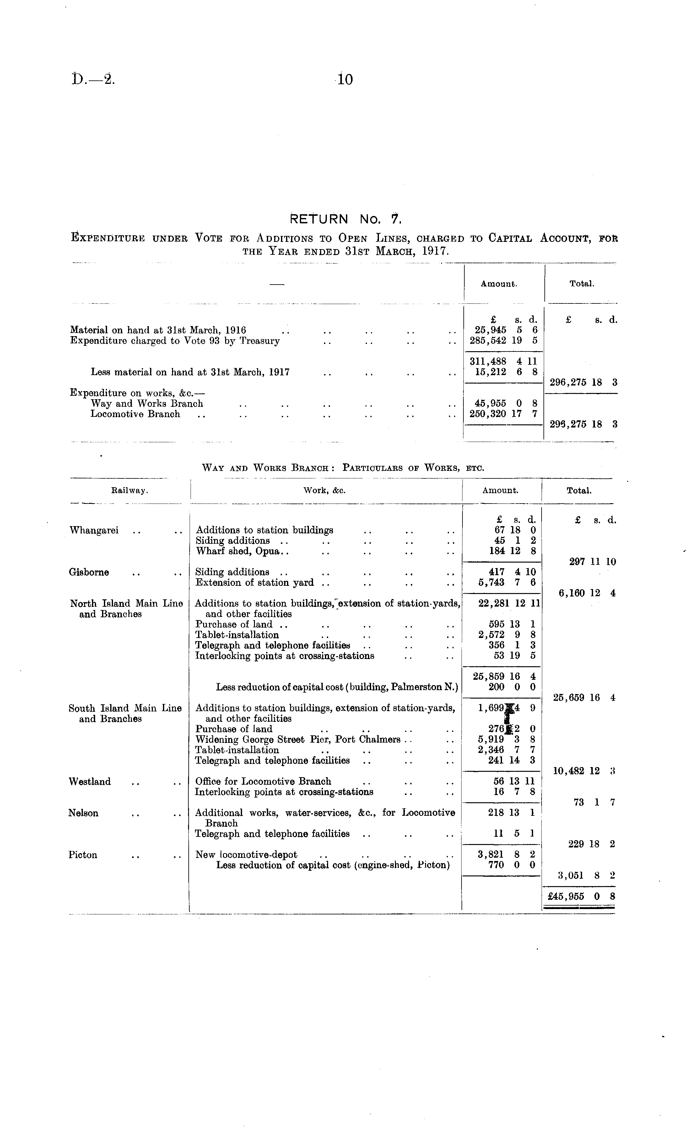 RETURN No. 7. Expenditure under Vote for Additions to Open Lines, charged to Capital Account, for the Year ended 31st March, 1917.