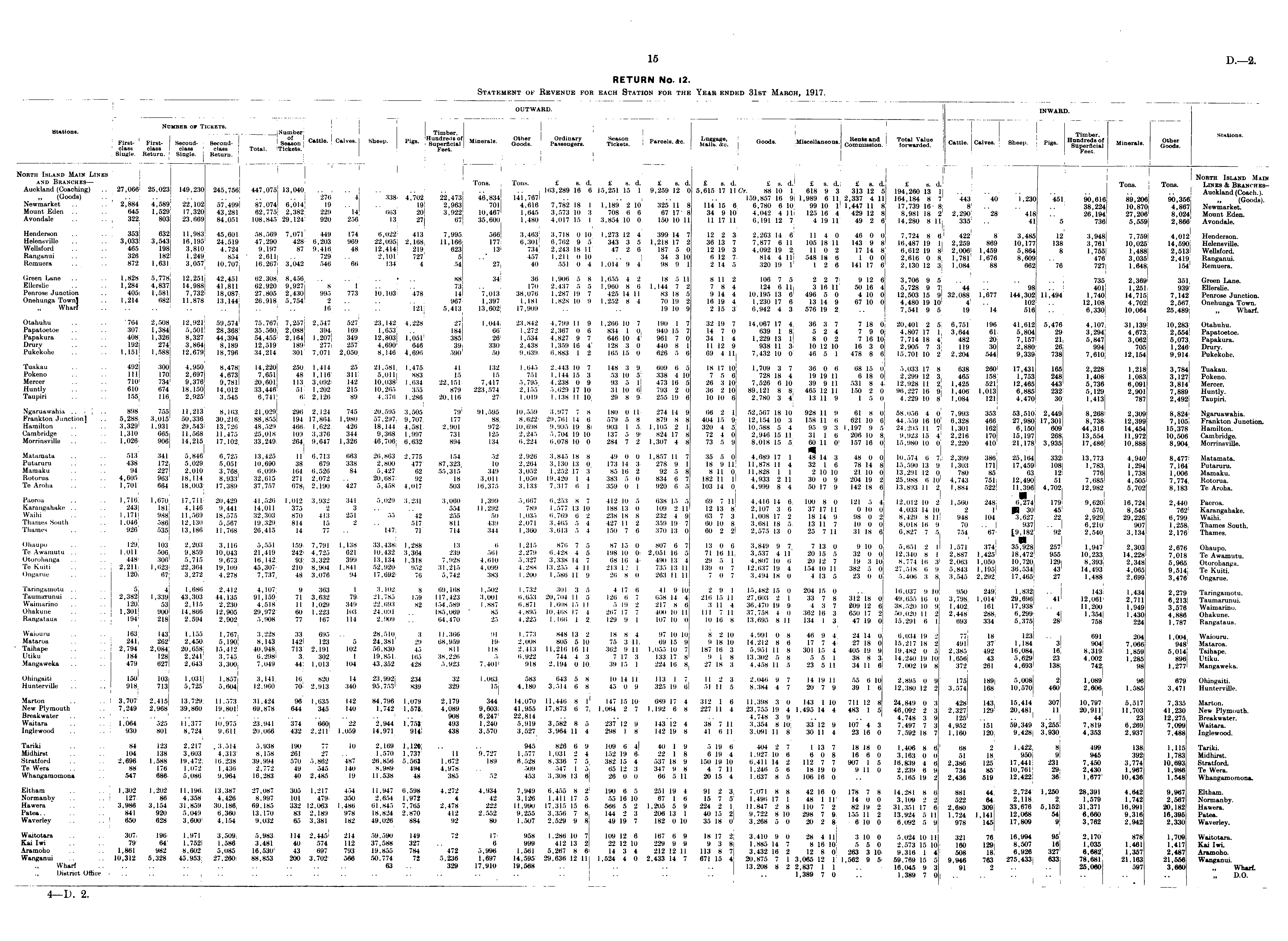 OUTWARD. INWARD. Ncmbek of Tickets. Stations. , Number Timber, Timber, Stations. First- First- Second- Second- j Season Cattle " Calves ' Shee P- Pi « 8 ' "uperfliiaf Minerals. Other p° r s d 6^g a e r r y s- T®cke°ts. Parcels. <frc. |e, Goods Miscellaneous. c^?s a f 0 * : forwarded' 6 Cattle - Calves - shee l>- pi S B - Minerals. class class class class Total. Tickets. Feet. ' Single. Return. Single. Return. North Island Main Lines North IslanJ) Mad , and Branches— Tons. Tons. £ s. d. £ s. d. £ s. d. £ s. d. £ s. d. £ s. d. £ s. d. £ s. d. Tons. Tons. Lines & Branch esAuckland (Coaching) .. 27,066 25,023 149,230 245,756 447,075 13,040 .. .. .. .. .. .. .. 163,289 16 6 15,251 15 1 9,259 12 0 5,615 17 11 Cr. 88 10 1 618 9 3 313 12 5 194,260 13 1 .. .. .. .. .. .. Auckland (Coach.). „ (Goods) .. .. .. .. .. 270 4 338 4,702 22,473 46,834 141,767 .. .. .. .. 159,857 16 9 1,989 6 11 2,337 4 11 164,184 8 7 443 40 1,230 451 90,616 89,206 90,356 „ (Goods) Newmarket 2,884 4,589 22,102 57,499 87,074 6,014 19 19 2,963 701 4,616 7,782 18 1 1,189 2 10 325 11 8 114 15 6 6,780 6 10 99 10 1 1,447 11 8 17,739 16 8 8 . 38 224 10 870 4 867 Newmarket Mount Eden .. 645 1,529 17,320 43,281 62,775 2,382 229 14 663 20 3,922 10,467 1,645 3,573 10 3 708 6 6 67 17' 8 34 9 10 4,042 4 11 125 16 4 429 12 8 8,981 18 2 2,290 28 418 26'l94 27 206 8 024 Mount Eden Avondale 322 803 23,669 84,051 108,845 29,124 920 256 13 27 67 35,600 1,480 4,017 15 1 3,854 10 0 150 10 11 11 17 11 6,191 12 7 4 19 11 49 2 6 14,280 8 11 335 .. 41 5 '736 5,'559 2,'866 Avondale. Henderson 353 632 11,983 45,601 58,5691 7,071 449 174 6,022 413 7,995 566 3,463 3,718 0 10 1,273 12 4 399 14 7 12 2 3 2,263 14 6 11 4 0 46 0 0 7,724 8 6 422 8 3,485 12 3 948 7 759 4 012 Henderson Helens ville .. 3,033 3,543 16,195 24,519 47,290 428 6,203 969 22,095 2,168 11,166 177 6,301 6,762 9 5 343 3 5 1,218 17 2 36 13 7 7,877 6 11 105 18 11 143 9 8 16,487 19 1 2,259 869 10,177 138 3,'761 10,'025 14*590 HelensviUe. Wellsford 465 198 3,810 4,724 9,197 87 9,416 48 12,414 219 623 13 734 2,243 18 11 47 2 6 187 5 0 12 19 3 4,092 19 2 11 0 2 17 14 8 6,612 19 8 2,006 1,459 5,864 8 1 755 1 488 2*513 Wellsford Ranganui .. 326 182 1,249 854 ' 2,611 729 .. 2,101 727 5 457 1,211 0 10 .. 34 3 10 6 12 7 814 4 11 548 18 6 1 0 0 2,616 0 8 1,781 1,676 8,609 .. 476 3,035 2,419 Ranganui. Remuera .. 872 1,631 3,057 10,707 16,267 3,042 j 546 66 134 4 54 27 40 551 0 4 1,014 9 4 98 9 1 2 14 5 320 19 1 1 2 6 141 17 6 2,130 12 3 1,084 88 662 76 727 1,648 154 Remuera. Green Lane .. 1,828 5,778 12,251 42,451 62,308. 8,456 .. .. 88 34 36 1,906 5 8 1,655 4 2 18 5 11 8 11 2 106 7 5 2 2 7 9 12 6 3,706 9 5 .. .. .. .. ! 735 2 369 351 Green Lane Ellerslie .. 1,284 4,837 14,988 41,811 62,920 9,927 8 1 .. 73 170 2,437 5 5 1,960 8 6 1,144 7 2 7 8 4 124 6 11 3 16 11 50 16 4 5,728 9 7 44 98 401 1 251 939 Ellerslie Penrose Junotion .. 405 1,581 7,732 18,087 27,805 2,430 995 773 10,103 478 14 7,013 38,076 1,287 19 7 425 14 11 83 18 5 9 14 4 10,195 13 6 496 5 0 4 10 0 12,503 15 9 32,088 1,677 144,302 11,494' 1,740 14 715 7 142 Penrose Junction Onehunga Town] .. 1,214 682 11,878 13,144 26,918 5,754 2 .. 967 1,397 1,181 1,828 10 9 1,252 8 4 70 19 2 16 19 4 1,230 17 6 13 14 9 67 10 0 4,480 19 10 4 102 12,108 4,702 2,567 Onehunga Town. Wharf .. .. .. .. .. .. .. 16; .. 121 5,413 13,602 17,909 .. .. 19 10 9 2 15 3 6,942 4 3 576 19 2 .. 7,541 9 5 19 14 516 .. 6,330 10,064! 25,489 „ Wharf. Otahuhu .. .. 764 2,508 12,921 59,574 75,767 7,257 2,547 527 23,142 4,228 27 1,044 23,842 4,799 11 9 1,266 10 7 190 1 7 32 19 7 14,067 17 4 36 3 7 7 18 0 20,401 2 5 6,751 196 41,612 5,476 4,107 31,139 10,283 Otahuhu. Papatoetoe .. 307 1,384 5,501 28,368 35,560 2,088 394 169 1,653 .. 184 66 1,272 2,367 0 6 834 1 0 940 15 7 14 7 0 639 18 524 790 4,807 17 1 3,644 61 5,804 29 3,294 4,673 2,554 Papatoetoe. Papakura 408 1,326 8,327 44,394 54,455 2,164 1,207 349 12,803 1,051 385 26 1,534 4,827 9 7 646 10 4 961 7 0 34 1 4 1,229 13 1 8 0 2 7 16 10 7,714 18 4 482 20 7,157 21 5,847 3,062 5,073 Papakura. Drury .. 192 274 3,864 8,189 12,519 189 277 257 4,690 646 39 330 2,438 1,359 16 4 128 3 0 440 8 1 11 12 9 938 11 3 10 12 10 16 3 0 2,905 7 3 119 30 2,880 26 994 705 1 246 Drury. Pukekohe .. .. 1,151 1,588 12,679 18,796 34,214 301 7,071 2,050 8,146 4,690 590 50 9,639 6,883 1 2 165 15 0 626 5 6 69 4 11 7,432 10 0 46 5 1 478 8 6 15,701 10 2 2,204 544 9,339 738 7,610 12,154 9,914 Pukekohe. Tuakau 492 300 4,950 8,478 14,220 250j 1,414 25 21,581 1,475 41 132 1,645 2,443 10 7 148 3 9 609 6 5 18 17 10 1,709 3 7 36 0 6 68 15 0 5,033 17 8' 638 260 17,431 165 2,228 1 218 3 784 Tuakau Pokeno 111 170 2,697 4,673 7,651 48 1,116 311 5,011 883 15 15 751 1,144 15 3 53 10 5 338 4 10 7 5 6 728 18 4 19 19 11 6 18 0 2,299 12 3 465 158 1,753 248 1,408! 1,083 3,127 Pokeno. Mercer .. 710 734 9,376 9,781 20,601 113 3,092 142 10,038 1,634 22,151 7,417 5,795 4.238 0 9 93 5 1 473 16 5 26 3 10 7,526 6 10 39 9 11 531 8 4 12,928 11 2 1,425 521 12,465 443 5,736! 6 091 3 814 Mercer. Huntly 610, 674 18,150 14,012 33,446 51 1,202 215 10,265 355 879 223,574 2,155 5,629 17 10 31 10 6 793 2 0 36 2 10 89,121 8 8 465 12 11 150 2 0 96,227 16 9 1,406 1,013 6,885 232 5 129 2 901 7 889 Huntlv Taupiri 155 116 2,925 3,545 6,741 6 2,126 89 4,376 1,286 20,116 27 1,019 1,138 11 10 29 8 9 255 19 6 10 10 6 2,780 3 4 13 11 9 1 5 0 4,229 10 8 1,084 121 4,470 30 1,413 '787 2,'492 Taupiri. Ngaruawahia .. I i .. 898 755 11,213 8,163 21,029 296 2,124 745 20,595 3,505 79 91,595 10,559 3,977 7 8 180 0 11 274 14 9 66 2 1 52,567 18 10 928 11 9 61 8 0 58,056 4 0 7,993 353 53,510 2,449 8,268 2 309 8 824 Ngaruawahia Frankton Junction] .. 5,288 3,015 50,336 30,216 88,855 194 17,864 1,980 57,297 9,707 177 88 8,622 29,761 14 6 579 5 8 879 8 8 404 15 9 12,154 10 3 158 11 6 621 10 6 44,559 16 10 6,328 466 27,980 17,301 8,738 12 399 7 105 Frankton Junotion Hamilton .. 3,329 1,931 29,543 13,726 48,529 466 1,622 426 18,144 4,581 2,901 972 10,698 9,995 19 8 903 1 5 1,105 2 1 320 4 5 10,588 5