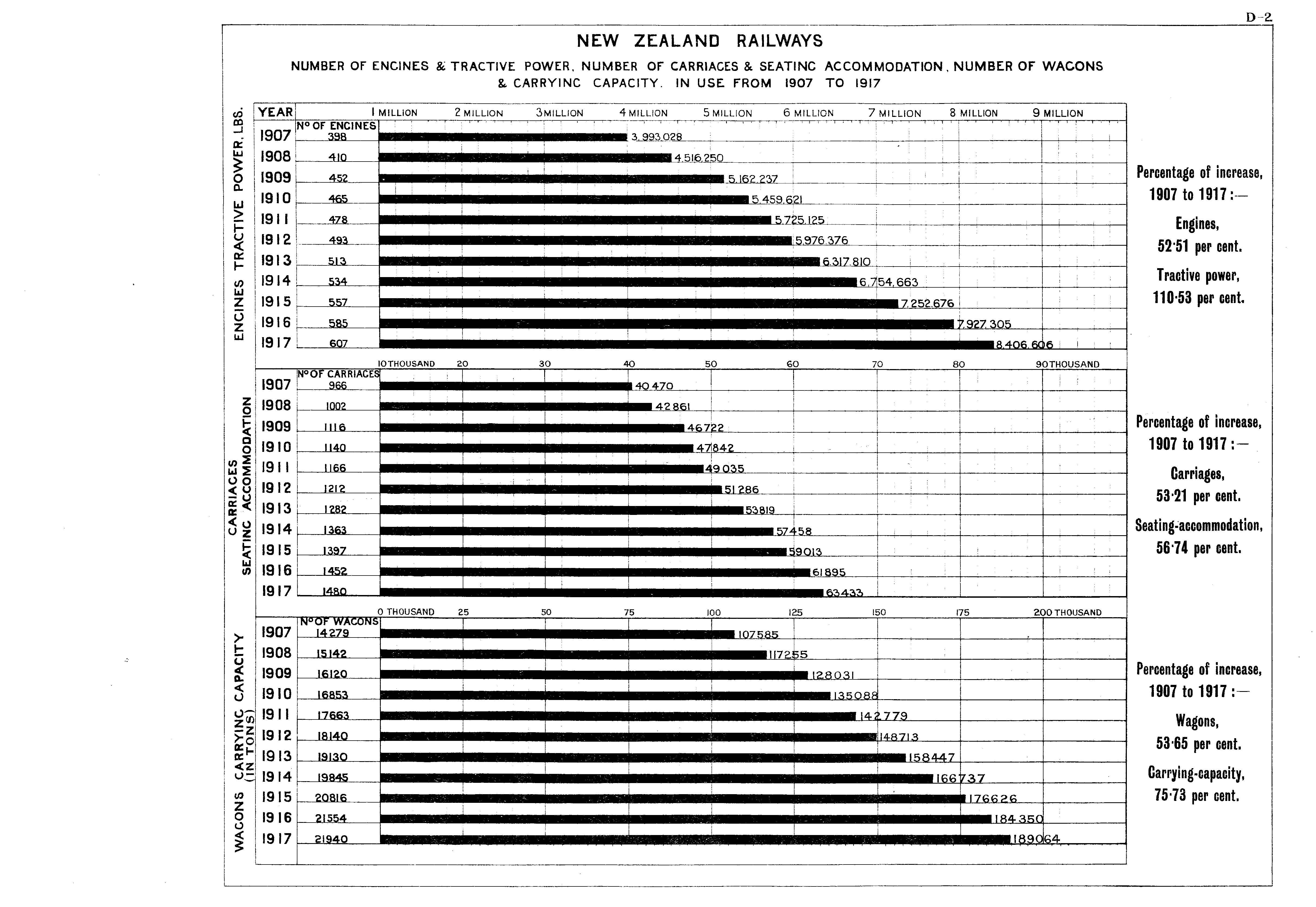 NEW ZEALAND RAILWAYS NUMBER OF ENCINES & TRACTIVE POWER, NUMBER OF CARRIAGES & SEATINC ACCOMMODATION, NUMBER OF WAGONS & CARRYINC CAPACITY, IN USE FROM 1907 TO 1917