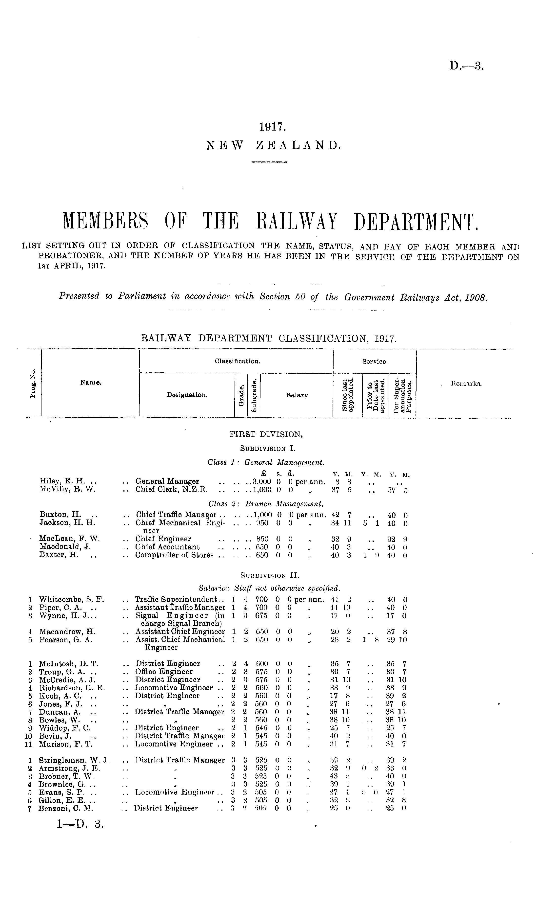 MEMBERS OF THE RAILWAY DEPARTMENT. LIST SETTING OUT IN ORDER OF CLASSIFICATION THE NAME, STATUS, AND PAY OF EACH MEMBER AND PROBATIONER, AND THE NUMBER OF YEARS HE HAS BEEN IN THE SERVICE OF THE DEPARTMENT ON 1st APRIL, 1917.