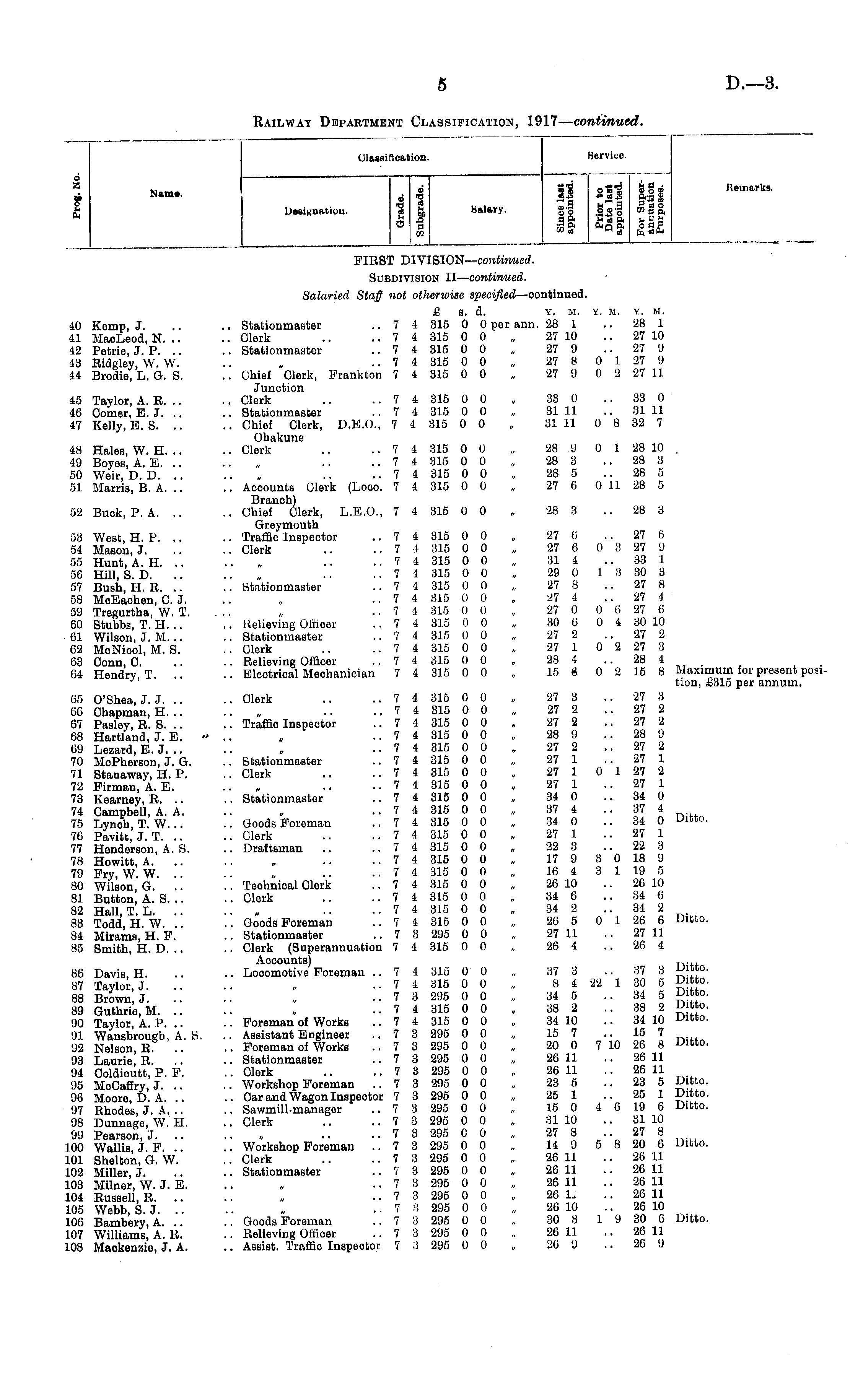 Classification. Bervioe. 6 K i Mam*. ]>«.Hi;:nal,n,ii I S I ! X 1-9 VJ . So .2 S 8 ! a p< Stsa i< a I S..S S p3 to a a, 8 Sj Remarks. Salary. FIRST DIVISION— continued. Subdivision II— continued. 40 Kemp, J. 41 MaoLeod, N. .. 42 Petrie, J. P. 43 Ridgley, W. W. 44 Brodie, L. G. S. 45 Taylor, A. R. .. 46 Comer, E.J. 47 Kelly, E. S. 48 Hales, W. H. .. 49 Boyes, A. E. 50 Weir, D. D. 51 Harris, B. A. .. 52 Buok, P. A. 53 West, H. P. .. 54 Mason, J. 55 Hunt, A. H. .. 56 Hill, S. D. 57 BuBh, H. R. .. 58 MoEaohen, C. J. 59 Tregurtha, W. T, 60 Stubbs, T. H... 61 Wilson, J. M. .. 62 McNiool, M. S. 63 Conn, C. 64 Hendry, T. .. Salaried Staff not otherwise specified — oontinued. £ s. d. y. m. y. H. y. m. .. Stationmaster .. 7 4 315 0 0 per ann. 28 1 .. 28 1 .. Clerk .. .. 7 4 315 0 0 „ 27 10 .. 27 10 .. Stationmaster .. 7 4 315 0 0 „ 27 9 .. 27 9 .. 7 4 315 0 0 27 8 0 1 27 9 ..' Chief Clerk, Prankton 7 4 315 0 0 „ 27 9 0 2 27 11 Junction .. Clerk .. .. 7 4 315 0 0 , 33 0 .. 33 0 .. Stationmaster .. 7 4 315 0 0 „ 31 11 .. 31 11 .. Chief Clerk, D.E.O., 7 4 315 0 0, 31 11 0 8 32 7 Ohakune .. Clerk .. .. 7 4 315 0 0 „ '28 9 0 1 28 10 . ..7 4 315 0 0 „ 28 3 28 3 .. 7 4 315 0 0 „ 28 5 .. 28 5 .. Aooounts Clerk (Looo. 7 4 315 0 0 , 27 0 0 11 28 5 Branoh) .. Chief Clerk, L.E.O., 7 4 315 0 0 „ 28 3 28 3 Greymouth .. Traffic Inspector .. 7 4 315 0 0 , 27 6 .. 27 6 . Clerk .. .. 7 4 315 0 0 „ 27 6 0 3 27 9 .. 7 4 315 0 0 „ 31 4 .. 33 1 ..74 315 00 „ 29 0 1 3 30 3 .. Stationmaster .. 7 4 315 0 0 , 27 8 .. 27 8 ..7 4 315 0 0 „ 27 4 27 4 .. 7 4 315 0 0 „ 27 0 0 G 27 6 .. Relieving Offioer ..74 315 00 „ 30 G 0 4 30 10 .. Stationrnaeter .. 7 4 315 0 0 „ 27 2 .. 27 2 .. Clerk .. .. 7 4 315 0 0 „ 27 1 0 2 27 3 .. Relieving Officer .. 7 4 315 0 0 , 28 4 .. 28 4 .. Eleetrioal Mechanician 7 4 315 0 0 „ 15 « 0 2 15 8 Maximum for present posi tion, £315 per annum. 65 O'Shea, J. J. 66 Chapman, H. .. 67 Pasley, K. S. 68 Hartland, J. E. 69 Lezard, E.J... 70 MoPherson, J. G. 71 Stanaway, H. P. 72 Firman, A. E. 73 Kearney, R. .. 74 Campbell, A. A. 75 Lynoh, T. W. .. 76 Pavitt, J. T. 77 Henderson, A. S. 78 Howitt, A. 79 Pry, W. W. 80 Wilson, G. .. 81 Button, A. S. .. 82 Hall, T. L. .. 83 Todd, H. W. 84 Mirams, H. P. 85 Smith, H. D. .. 86 Davis, H. 87 Taylor, J. 88 Brown, J. 89 Guthrie, M. .. 90 Taylor, A. P. 91 Wansbrougb, A. S. 92 Nelson, R. .. 93 Laurie, R. 94 Coldioutt, P. P. 95 MoCafiry, J. .. 96 Moore, D. A. 97 Rhodes, J. A. .. 98 Dunnage, W. H. 99 Pearson, J. 100 Wallis, J. P. 101 Shelton, G. W. 102 Miller, J. 103 Milner, W. J. E. 104 Russell, R. .. 105 Webb, S. J. 106 Bambery, A. .. 107 Williams, A. R. 108 Maokenzio, J. A. . Clerk .. .. 7 i 315 0 0 „ 27 3 .. 27 3 .. 7 4 315 0 0 „ 27 2 .. 27 2 .. Traffio Inspector .. 7 4 315 0 0 . 27 2 .. 27 2 .. 7 4 315 0 0 „ 28 9 .. 28 9 .. 7 4 315 0 0 „ 27 2 .. 27 2 .. Stationmaster .. 7 4 315 0 0 „ 27 1 .. 27 1 Clerk .. .. 7 4 315 0 0 „ 27 1 0 1 27 2 .. 7 4 315 0 0 , 27 1 27 1 .. Stationmaster .. 7 4 315 0 0 „ 34 0 .. 34 0 .. 7 4 315 0 0 „ 37 4 .. 37 4 .. Goods Foreman .. 7 4 315 0 0 „ 34 0 .. 34 0 Ditto. .. Clerk .. .. 7 i 315 0 0 „ 27 1 .. 27 1 .. Draftsman .. .. 7 4 315 0 0 „ 22 3 .. 22 3 .. 7 4 315 0 0 „ 17 9 3 0 18 9 .. 7 4 315 0 0 , 16 4 3 1 19 6 .. Teohnioal Clerk .. 7 4 315 0 0 „ 26 10 .. 26 10 .. Clerk .. .. 7 4 315 0 0 „ 34 6 .. 34 6 .. 7 4 315 0 0 „ 34 2 34 2 .. Goods Foreman .. 7 i 315 0 0 „ 26 5 0 1 26 6 Ditto. .. Stationmaster .. 7 3 295 0 0 „ 27 11 .. 27 11 .. Clerk (Superannuation 7 4 315 0 0 „ 26 4 26 4 Acoounts) ...,, .. Looomotive Foreman .. 7 4 315 0 0 , 37 3 .. 37 3 UiUo. 7 4 315 0 0 „ 8 4 22 1 30 5 Ditto. .. 7 3 295 0 0 „ 34 5 .. 34 5 Ditto. .. 7 4 315 0 0 38 2 .. 38 2 Ditto. .. Foreman of Works .. 7 4 315 0 0 „ 34 10 .. 34 10 Ditto. .. Assistant Engineer .. 7 3 295 0 0 „ 15 7 .. 15 7 .. Foreman of Works .. 7 3 295 0 0 , 20 0 7 10 26 8 Ditto. Stationmaster .. 7 3 295 0 0 „ 26 11 .. 26 11 .. Clerk .. .. 7 3 295 0 0 „ 26 11 .. 26 11 . Workshop Foreman .. 7 3 295 0 0 „ 23 5 .. 23 5 Ditto. Car and Wagon Inspector 7 3 295 0 0 „ 25 1 25 1 Ditto. .. Sawmill-manager ..7 3 295 0 0 , 15 0 4 6 19 6 Ditto. .. Clerk .. .. 7 3 295 0 0 „ 31 10 .. 31 10 .. 7 3 295 0 0 „ 27 8 27 8 Workshop Foreman .. 7 3 295 0 0 „ 14 9 5 8 20 6 Ditto. .. Clerk .. .. 7 3 295 0 0 „ 26 11 .. 26 11 .. Stationmaster .. 7 3 295 0 0 , 26 11 .. 26 11 .. 7 3 295 0 0 26 11 26 11 .. 7 8 295 0 0 „ 26 li .. 26 11 .. 7 S5 295 0 0 „ 26 10 .. 26 10 Goods Foreman .. 7 3 295 0 0 „ 30 3 1 9 30 6 Ditto. .. Relieving Officer ..73 295 00 , 26 11 .. 26 11 .. Assist. Traffic Inspector 7 3 295 0 0 „ 20 9 .. 20 9