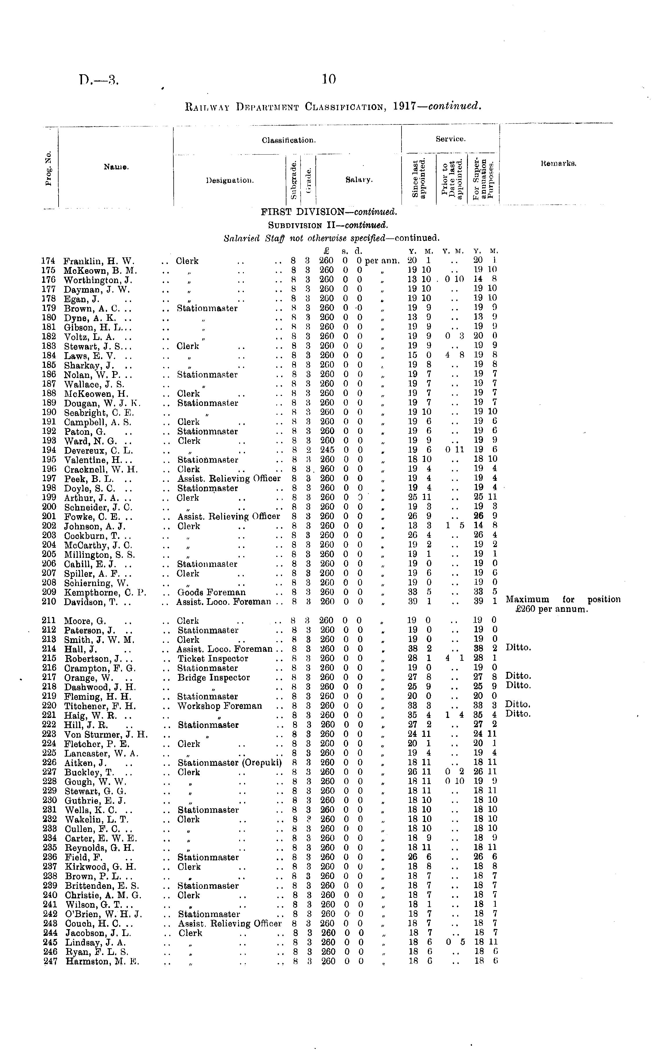 6 A Name. 2 Q s Classification. Service. 6 S'So'S'gSo'" Remarks. Designation. ft 3 Salary, g p s oara a: $ §, FIRST DIVISION— continued. SunDivisiON II— continued. 174 Franklin, H. W. 175 MoKeown, B. M. 176 Worthington, J. 177 Dayman, J. W. 178 Egan, J. 179 Brown, A. C. .. 180 Dyne, A. K. .. 181 Gibson, H. L... 182 Voltz, L. A. 183 Stewart, J. S... 184 Laws, E. V. 185 Sharkay, J. .. 186 Nolan, W. P. .. 187 Wallace, J. S. 188 McKeowen, H. 189 Dougan, W. J. K. 190 Seabright, C. E. 191 Campbell, A. S. 192 Paton, G. 193 Ward, N. G. 194 Devereux, C. L. 195 Valentine, H. .. 196 Craoknell, W. H. 197 Peek, B. L. 198 Doyle, S. C. 199 Arthur, J. A. .. 200 Schneider, J. C. 201 Fowke, 0. E. 202 Johnson, A. J. 203 Oookburn, T. .. 204 McCarthy, J. C. 205 Millington, S. S. 206 Cahill, E. J. .. 207 Spiller, A. P. 208 Sohierning, W. 209 Kempthorne, C. P. 210 Davidson, T. .. Salaried Staff not otherwise specified —continued. £ s. d. y. m, Y. M, y. H. .. Clerk .. .. 8 3 260 0 0 per ann. 20 1 .. 20 1 .. 8 3 260 0 0 „ 19 10 .. 19 10 .. 8 3 200 0 0 „ 13 10 . 0 10 14 8 .. 8 3 260 0 0 „ 19 10 .. 19 10 .. 8 3 260 0 0 . 19 10 ..19 10 .. Rtationmaster .. 8 3 260 0 -0 „ 19 9 .. 19 9 .. 8 8 260 0 0 13 9 ..13 'J .. 8 I! 260 0 0 „ 19 9 .. 19 '.I .. 8 3 260 0 0 „ 19 9 0 3 20 0 Clerk .. ..8 3 260 0 0 „ 19 9 19 9 .. „ ..8 3 260 0 0 „ 15 0 i 8 19 8 .. „ ..83 260 00 ,. 19 8 19 8 .. Stationmaster .. 8 3 260 0 0 „ 19 7 .. 19 7 .. 8 8 260 0 0 19 7 .. 19 7 .. Clerk .. .. 8 3 260 0 0 „ 19 7 .. 19 7 .. Stationmaster .. 8 3 260 0 0 „ 19 7 .. 19 7 .. 8 8 260 0 0 „ .1.9 10 19 1.0 .. Clerk .. .. 8 3 200 0 0 „ 19 6 .. 19 6 .. Stationnuister .. 8 3 260 0 0 „ 19 6 .. 19 6 .. Clerk .. .. 8 3 260 0 0 „ 19 9 .. 19 9 .. 8 2 245 0 0 , 19 6 0 11 19 6 .. Stationmaeter .. 8 3 260 0 0 „ 18 10 .. 18 10 .. Clerk .. .. 8 3 260 0 0 „ 19 4 .. 19 4 .. Assist. Relieving Officer 8 3 260 0 0 „ 19 4 .. 19 4 .. Stationmaster .. 8 3 260 0 0 , 19 4 .. 19 4 .. Clerk .. . . 8 3 260 0 3 » 25 11 .. 25 11 .. 8 3 200 0 0 , 19 3 19 3 .. Assist. Relieving Officer 8 3 260 0 0 „ 26 9 26 9 .. Clerk .. .. 8 3 260 0 0 „ 13 3 1 5 14 8 .. 8 3 260 0 0 „ 20 4 26 4 .. 8 3 260 0 0 , 19 2 .. 19 2 .. „ .. .. 8 3 260 0 0 „ 19 1 19 1 .. Stationmaster .. 8 3 200 0 0 „ 19 0 .. 19 0 .. Clerk .. .. 8 3 200 0 0 „ 19 6 .. 19 G „ .. ..83 260 00 „ 19 0 19 0 .. Goods Foreman .. 8 3 200 0 0 „ 33 5 .. 33 5 .. Assist. Loco. Foreman ..83 260 0 0 » 39 1 39 1 Maximum for positior £260 per annum. 211 Moore, G. 212 Paterson, J. .. 213 Smith, J. W. M. 214 Hall, J. 215 Robertson, J. .. 216 Crampton, F. G. 217 Orange, W. .. 218 Dashwood, J. H. 219 Fleming, H. H. 220 Titohener, F. H. 221 Haig, W. E. 222 Hill, J. R. 223 Von Sturmer, J. H. 224 Fletcher, P. E. 225 Lancaster, W. A. 226 Aitken.J. 227 Buckley, T. .. 228 Gough, W. W. 229 Stewart, G. G. 230 Guthrie, E. J. 231 Wells, K. C. .. 232 Wakelin, L. T. 233 Cullen, F. C. 234 Carter, E. W. E. 235 Reynolds, G. H. 236 Field, F. 237 Kirkwood, G. H. 238 Brown, P. L. .. 239 Brittenden, E. S. 240 Christie, A. M. G. 241 Wilson, G. T. .. 242 O'Brien, W. H. J. 243 Couoh, H. C. 244 Jacobson, J. L. 245 Lindsay, J. A. 246 Eyan, F. L. S. 247 Harmston, M. E. .. Clerk .. .. 8 3 260 0 0 » 19 0 .. 19 0 .. Stationmaster .. 8 3 260 0 0 , 19 0 .. 19 0 .. Clerk .. .. 8 3 260 0 0 „ 19 0 .. 19 0 .. Assist. Loco. Foreman .. 8 3 260 0 0 „ 38 2 .. 38 2 Ditto. .. Ticket Inspector .. 8 3 200 0 0 „ 28 1 4 1 28 1 .. Stationmaster .. 8 3 260 0 0 „ 19 0 .. 19 0 .. Bridge Inspector .. 8 3 260 0 0 „ 27 8 .. 27 8 Ditto. .. 8 8 260 0 0 25 9 ..25 9 Ditto. .. Stationmaster .. 8 3 260 0 0 „ 20 0 .. 20 0 .. Workshop Foreman ..83 260 00 „ 33 3 33 3 Ditto. ..83 260 00 „ 35 4 1 4 35 4 Ditto. .. Stationmaster .. 8 3 260 0 0 „ 27 2 .. 27 2 .. 8 3 260 0 0 „ 24 11 ..24 11 .. Clerk .. .. 8 3 260 0 0 „ 20 1 .. 20 1 .. „ .. .. 8 3 260 0 0 „ 19 4 19 4 .. Stationmaster (Orepuki) 8 3 260 0 0 „ 18 11 .. 18 11 .. Clerk .. ..8 3 260 0 0 „ 20 11 0 2 26 11 .. 8 3 260 0 0 „ 18 11 0 JO 19 !.) .. 8 3 260 0 0 „ 18 11 .. 18 11 ..83 260 0 0 „ 18 10 .. 18 10 .. Stationmaster ..83 260 0 0 „ 18 10 .. 18 10 .. Clerk .. .. 8 ? 260 0 0 „ 18 10 18 10 .. „ .. ..83 260 0 0 „ 18 10 .. 18 10 .. „ .. ..83 260 00 „ 189 18 !> .. 8 3 260 0 0 „ 18 11 .. 18 11 .. Stationmaster .. 8 3 260 0 0 „ 26 6 .. 26 6 .. Clerk .. .. 8 3 200 0 0 „ 18 8 .. 18 8 .. 8 3 260 0 0 „ 18 7 18 7 .. Stationmaster .. 8 3 260 0 0 „ 18 7 .. 18 7 .. Clerk .. .. 8 3 260 0 0 „ 18 7 .. 18 7 .. 8 3 260 0 0 „ 18 1 .. 18 1 .. Stationmaster ..83 260 00 „ 187 .. 18 7 .. Assist. Relieving Officer 8 3 260 0 0 „ 18 7 18 7 .. Clerk .. .. 8 3 260 0 0 „ 18 7 .. 18 7 .. 8 3 260 0 0 „ 18 6 0 5 18 11 .. 8 3 260 0 0 „ 18 6 18 0 .. 8 3 260 0 0 „ 18 6 18 t!