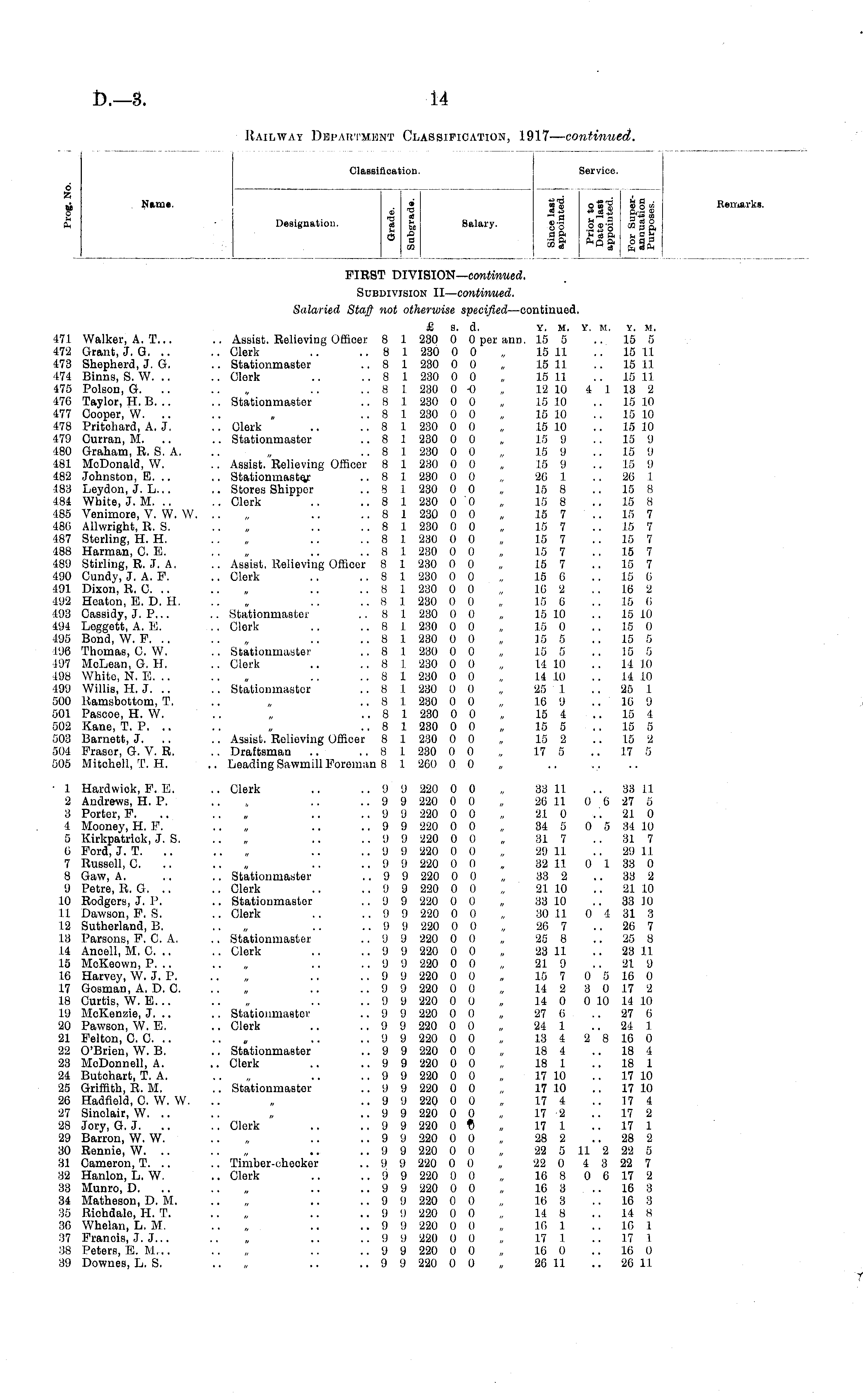 6 ,i Name. s Cm i Classification. Service. Designation. 1 jj, Salary. g| g*-3 <gf| 0 ! II J3f 111 Service. Remark! FIRST DIVISION— continued. Subdivision II— continued. 471 Walker, A. T... 472 Grant, J. G. 473 Shepherd, J. G. 474 Binns, S. W. .. 475 Poison, G. .. 470 Taylor, H. B. .. 477 Cooper, W. .. 478 Pritchard, A.J. 479 Curran, M. 480 Graham, B. S. A. 481 McDonald, W. 482 Johnston, E. .. 183 Leydon, J. L... 484 White, J. M. .. 485 Venimore, V. W. W. 486 Allwright, K. S. 487 Sterling, H. H. ■188 Harman, C. E. 489 Stirling, R. 3. A. 490 Cundy, J. A. F. 491 Dixon, K. C. .. 492 Heaton, E. D. H. 493 Gassidy, J. P... 494 Leggett, A. B. 495 Bond, W. P. .. 196 Thomas, G. W. 497 McLean, G. H. 498 White, N. E. .. 499 Willis, H. J. 500 Ramsbottoni, T. 501 Pascoe, H. W. 502 Kane, T. P. 503 Barnett, J. 304 Prasor, G. V. R. 505 Mitohell, T. H. Salaried Staff not otherwise specified —continued. £ s. d. y. M. Y. m. y. m. .. Assist. Relieving Officer 8 1 230 0 0 per ann. 15 5 ..15 5 .. Clerk .. .. 8 1 230 0 0 „ 15 11 .. 15 11 .. Stationmaster .. 8 1 230 0 0 „ 15 11 .. 15 11 .. Clerk .. .. 8 1 230 0 0 „ 15 11 .. 15 11 .. 8 1 280 0 O „ 12 10 4 1 13 2 .. Statioumaetor .. 8 1 230 0 0 „ 15 10 .. 15 10 .. 8 1 230 0 0 „ 15 10 15 10 .. Clerk .. .. 8 1 230 0 0 „ 15 10 .. 15 10 .. Stationmaster .. 8 1 230 0 0 „ 15 9 ..15 9 .. 8 1 230 0 0 „ 15 9 ..15 !) . . Assist. Relieving Officer 8 1 230 0 0 „ 15 9 .. 1.5 9 .. Stationinastej: .. 8 1 230 0 0 „ 26 1 26 1 .. Stores Shipper ,. 8 1 230 0 0 „ 15 8 .. 15 H .. Clerk .. .. 8 1 230 0 0 „ 15 8 .. 15 H .. 8 .1. 230 0 0 „ 15 7 .. 15 7 .. 8 1 230 0 0 „ 15 7 .. 15 7 .. 8 1 230 0 0 „ 15 7 .. 15 7 .. 8 1 230 0 0 „ 15 7 15 7 .. Assist. Relieving Offloer 8 1 230 0 0 „ 15 7 .. 15 7 .. Clerk .. .. 8 1 230 0 0 „ 16 6 .. 15 6 „ .. .. 8 1 230 0 0 „ 16 2 16 2 .. 8 1 230 0 0 „ 15 6 .. 15 6 .. Stationmaster .. 8 1 230 0 0 „ 15 10 .. 15 10 .. Clerk .. .. 8 1 230 0 0 „ 15 0 15 0 .. 8 1 230 0 0 „ 15 5 .. 15 5 .. Stationmastor ..8 1 230 0 0 „ 15 5 .. 15 5 .. Clerk .. .. 8 1 230 0 0 „ 14 10 .. 14 10 .. 8 1 230 0 0 „ 14 10 .. 14 10 .. Stationmaatcr .. 8 1 280 0 0 „ 25 1 .. 25 1 .. 8 1 230 0 0 „ 16 9 .. 16 9 .. 8 1 230 0 0 „ 15 4 15 4 .. 8 1 230 0 0 „ 15 5 15 5 .. Assist. Relieving Officer 8 1 230 0 0 „ 15 2 .. 15 2 .. Draftsman .. .. 8 1 230 0 0 „ 17 5 .. 17 5 .. Leading Sawmill Foreman 8 1 260 0 0 „ ■ 1 Hardwiok, P. E. 2 Andrews, H. P. 8 Porter, F. 4 Mooney, H. F. 5 Kirkpatrick, J. S. 0 Ford, J. T. 7 Russell, G. 8 Gaw, A. 9 Potre, R. G. .. 10 Rodgers, J. P. 11 Dawson, P. S. 12 Sutherland, B. 13 Parsons, P. C. A. 14 Anoell, M. C. 15 McKeown, P. .. 16 Harvey, W. J. P. 17 Gosman, A. D. C. 18 Curtis, W.E... 19 MoKonzie, J. .. 20 Pawson, W. E. 21 Pelton, O. C. 22 O'Brien, W. B. 23 MoDonnell, A. 24 Butohart, T. A. 25 Griffith, R. M. 26 Hadfleld, C. W. W. 27 Sinclair, W. .. 28 Jory, G. J. 29 Barron, W. W. 30 Rennie, W. .. 31 Cameron, T. .. 32 Hanlon, L. W. 33 Munro, D. 34 Matheson, D. M. 35 Riohdale, H. T. 36 Whelan, L. M. 37 Franois, J. J... 38 Peters, E. M... 39 Downes, L. S. .. Clerk .. ..9 9 220 0 0 „ 33 11 .. 33 11 .. 9 9 220 0 0 „ 26 11 0 6 27 5 .. „ .. ..99 220 0 0 „ 21 0 .. 21 0 .. 9 9 220 0 0 „ 34 5 0 5 34 10 .. „ .. .. <J 9 220 0 0 „ 31 7 31 7 .. 9 9 220 0 0 „ 29 11 . . 29 11 .. „ .. ..99 220 0 0 „ 32 11 0 1 33 0 .. Statiournaster .. 9 9 220 0 0 „ 33 2 .. 33 2 .. Clerk .. .. 9 9 220 0 0 „ 21 10 .. 21 10 .. Statioumaetor ..9 9 220 0 0 „ 33 10 .. 33 .10 .. Clerk .. .. 9 9 220 0 0 „ 30 11 0 4 31 3 .. „ .. .. 9 9 220 0 0 „ 26 7 26 7 .. Slationmastor .. 9 9 220 0 0 „ 25 8 .. 25 8 .. Clerk .. .. 9 9 220 0 0 „ 23 11 .. 23 11 .. 9 9 220 0 0 „ 21 9 .. 21 9 .. 9 9 220 0 0 „ 15 7 0 5 16 0 .. 9 9 220 0 0 „ 14 2 3 0 17 2 ..9 9 220 0 0 „ 14 0 0 10 14 10 .. Stationmaeter .. 9 9 220 0 0 „ 27 0 .. 27 6 .. Clerk .. .. 9 9 220 0 0 „ 24 1 .. 24 1 .. 9 9 220 0 0 „ 18 4 2 8 16 0 .. Stationmaeter .. 9 9 220 0 0 „ 18 4 .. 18 4 .. Clerk .. .. 9 9 220 0 0 „ 18 1 18 1 .. 9 9 220 0 0 „ 17 10 17 10 .. Stationmaster .. 9 9 220 0 0 „ 17 10 .. 17 10 .. 9 9 220 0 0 „ 17 4 17 4 .. 9 9 220 0 0 „ 17 2 17 2 .. Clerk .. .. 9 9 220 0 t> „ 17 1 .. 17 1 .. 9 9 220 0 0 „ 28 2 ..28 2 .. 9 9 220 0 0 „ 22 5 11 2 22 5 .. Timber-checker .. 9 9 220 0 0 „ 22 0 4 3 22 7 .. Clerk .. ..9 9 220 0 0 „ 10 8 0 6 17 2 .. 9 9 220 0 0 „ 16 3 16 3 .. 9 9 220 0 0 „ 16 3 .. 16 3 ..99 220 00 „ 14 8 .. .14 H ..99 220 0 0 „ 16 1 .. 16 1 ..9 9 220 0 0 „ 17 1 .. 17 I .. 9 9 220 0 0 „ 16 0 16 0 .. 9 9 220 0 0 „ 26 11 ..26 11