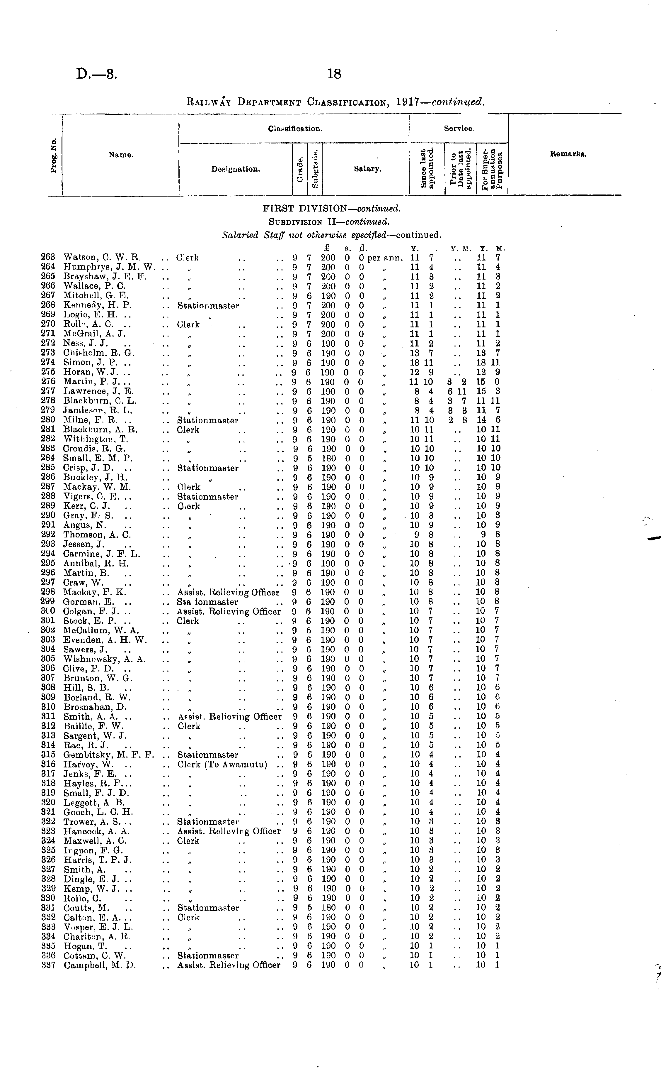Classification. Service. 6 'A eft Name. Designation. Cβ 0 1! « CX 11 ■~" a S3 •I! .2S'o P^g, Koumrlm. Salary. FIRST DIVISION— continued. Subdivision II— continued. Salaried Staff not otherwise specified —continued. £ s. d. T. 263 Watson, 0. W. R. .. Clerk .. .. 9 7 200 0 0 per nrni. 11 7 264 HiraiphryR, J. M. W. .. „ .. .. 9 7 200 0 0 „ 11 4 265 Brayshaw, J. E. F. .. „ .. ..9 7 200 0 0,, 11 3 266 Wallace, P. C. .. „ .. .. 9 7 200 0 0 „ 11 2 267 Mitchell, G. E. .. „ .. .. 9 6 190 0 0 „ 11 2 268 Kennedy, H. P. .. Stationmaster .. 9 7 200 0 0 „ 11 1 269 Logie, E. H. .. .. , .. 9 7 200 0 0 „ 11 1 270 Eolln, A. O. .. .. Clerk .. .. 9 7 200 0 0 „ 11 1 271 MoO-rail, A. J. .. „ .. .. 9 7 200 0 0 „ 11 1 272 Ness, J. J. .. .. „ .. .. 9 0 190 0 0 , 11 2 273 Chisholm, R. G. .. „ .. .. 9 6 190 0 0 „ 13 7 274 Simon, J. P. .. .. „ .. .. 9 6 190 0 0 „ 18 11 275 Horan.W.J. .. .. „ .. .. 9 6 190 0 0 „ 12 9 276 Manin, P. J. .. .. „ .. .. 9 6 190 0 0 „ 1110 277 Lawrence, J. E. .. „ .. .. 9 6 190 0 0 „ 8 4 278 Blackburn, 0. L. .. „ .. .. 9 6 190 0 0 „ 8 4 279 Jamieson, R. L. .. „ .. .. 9 6 190 0 0 „ 8 4 280 Milne, F. R. .. .. Stationmaster ..96 190 00,, 11 10 281 Blackburn, A. R. .. Clerk .. .. 9 6 190 0 0 „ 10 11 282 Withington, T. .. , .. .. 9 6 190 0 0 „ 10 11 283 Croudis; R. G. .. , .. .. 9 6 190 0 0 „ 10 10 284 Small, E. M. P. .. „ .. .. 9 5 180 0 0 „ 10 10 285 Crisp, J. D. .. .. Stationmaster .. 9 6 190 0 0 „ 10 10 286 Buckley, J. H. .. „ .. 9 6 190 0 0 10 9 287 Mackay, W. M. .. Clerk .. .. 9 6 190 0 0 „ 10 9 288 Vigers,' O. E. .. .. Stationmaster .. 9 6 190 0 0 ,, 10 9 289 Kerr, C. J. .. .. Cherk .. .. 9 6 190 0 0 „ 10 9 290 Gray, F. S. .. .. , ■ .. .. 9 C 190 0 0 „ 10 3 291 Angus, N. .. .. , .. .. 9 6 190 0 0 „ 10 9 292 Thomson, A. C. .. „ .. .. 9 6 190 0 0 „ 9 8 293 Jessen, J. .. .. „ .. .. 9 6 190 0 0 „ 10 8 294 Carmine, J. F. L. .. „ .. .. 9 6 190 0 0 „ 10 8 295 Annibal, R. H. .. , .. .. -9 6 190 0 0 „ 10 8 296 Martin, B. .. .. „ .. .. 9 6 190 0 0 „ 10 8 297 Craw, W. .. .. „ .. .. 9 6 190 0 0 „ 10 8 298 Mackay, F. K. .. Assist. Relieving Officer 9 6 190 0 0 „ 10 8 299 Gorman, E. .. .. Sta ionmaster .. 9 6 190 0 0 „ 10 8 3C0 Colgan, F. J. .. .. Assist. Relieving Officer 9 6 190 0 0 „ 10 7 301 Stock, E. P. .. .. Clerk .. .. 9 6 190 0 0 „ 10 7 302 McCallum, W. A. .. „ .. .. 9 6 190 0 0 „ 10 7 303 Evenden, A. H. W. .. „ .. .. 9 6 190 0 0 „ 10 7 304 Sawers, J. .. „ .. .. 9 6 190 0 0 „ 10 7 305 Wishnowsky, A. A. .. , . , .. 9 6 190 0 0 „ 10 7 306 Olive, P. D. .. .. „ .. .. 9 6 190 0 0 „ 10 7 307 Brunton, W. G. .. „ .. .. 9 6 190 0 0 „ 10 7 308 Hill, S. B. .. „ .. .. 9 6 190 0 0 „ 10 6 309 Borland, R. W. .. „ .. .. 9 6 190 0 0 „ 10 6 310 Brosnahan, l>. .. „ .. .. 9 6 190 0 0 „ 10 6 311 Smith, A. A. .. .. Afsist. Relieving Officer 9 6 190 0 0 „ 10 5 312 Baillie, F. W. .. Clerk .. .. 9 6 190 0 0 . 10 5 313 Sargent, W. J. .. „ .. .. 9 6 190 0 0 „ 10 5 314 Rae, R. J. .. .. „ .. .. 9 6 190 0 0 „ 10 5 315 Gembitsky, M. F. F. .. Stationmaster .. 9 6 190 0 0 „ 10 4 316 Harvey, W. .. .. Clerk (Te Awamutu) .. 9 G 190 0 0 „ 10 4 317 Jenks, F. E. .. .. „ .. .. 9 6 190 0 0 „ 10 4 318 Hayles, R. F... .. , .. .. 9 6 190 0 0 „ 10 4 319 Small, F. J. V. .. „ .. .. 9 6 190 0 0 „ 10 4 320 Leggett, A B. .. „ .. .. 9 6 190 0 0 „ 10 4 321 Gooch, L. C. H. .. „ .. ... 9 6 190 0 0 „ 10 4 322 Trower, A. S. .. .. Stationmaster .. 9 6 190 0 0 „ 10 3 323 Hancock, A. A. .. Assist. Relioving Officer 9 6 190 0 0,, 10 3 324 Maxwell, A. C. .. Clerk .. .. 9 6 190 0 0 „ 10 3 325 Ingpen, F. G. .. „ .. .. 9 6 190 0 0 „ 10 3 326 Harris, T. P. J. .. „ .. .. 9 6 190 0 0 „ 10 3 327 Smith, A. .. .. „ .. .. 9 6 190 0 0 „ 10 2 328 Dingle, E. J. .. .. , .. .. 9 6 190 0 0 „ 10 2 329 Kemp, W.J... .. „ .. .. 9 6 190 0 0 „ 10 2 330 Rollo, C. .. .. „ .. .. 9 6 190 0 0 „ 10 2 831 Coutts, M. .. .. Stationmaster .. 9 5 180 0 0 „ 10 2 332 Caltnn, E. A. .. .. Clerk .. .. 9 6 190 0 0 „ 10 2 333 Vosper, E. J. L. .. „ .. .. 9 6 190 0 0 „ 10 2 334 Charlton, A. R .. „ .. .. 9 6 190 0 0 „ 10 2 335 Hogan, T. .. .. „ .. .. 9 6 190 0 0 „ 10 1 386 Cotcam, C. W. .. Stationmaster .. 9 6 190 0 0 „ 10 1 337 Campbell, M. IX ., Assist. Relieving Officer 9 6 190 0 0 „ 10 1 Y. M. Y. M. .. 11 7 11 4 .. 11 3 11 2 .. 11 2 11 1 .. 11 1 .. 11 1 .. 11 1 .. 11 2 .. 13 7 18 11 12 9 3 2 15 0 6 11 15 3 3 7 11 11 3 3 11 7 2 8 14 6 10 11 10 11 .. 10 10 .. 10 10 10 10 10 9 10 9 10 9 10 9 .. 10 3 .. 10 9 9 8 10 8 .. 10 8 10 8 10 8 10 8 .. 10 8 10 8 10 7 10 7 .. 10 7 .. 10 7 .. 10 7 .. 10 7 .. 10 7 .. 10 7 .. 10 6 10 6 .. 10 (i .. 10 5 10 5 10 5 .. 10 5 10 4 10 4 10 4 10 4 10 4 10 4 10 4 10 3 10 3 10 3 .. 10 3 10 3 10 2 .. 10 2 10 2 10 2 10 2 10 2 10 2 .. 10 2 10 1 10 1 .. 10 1
