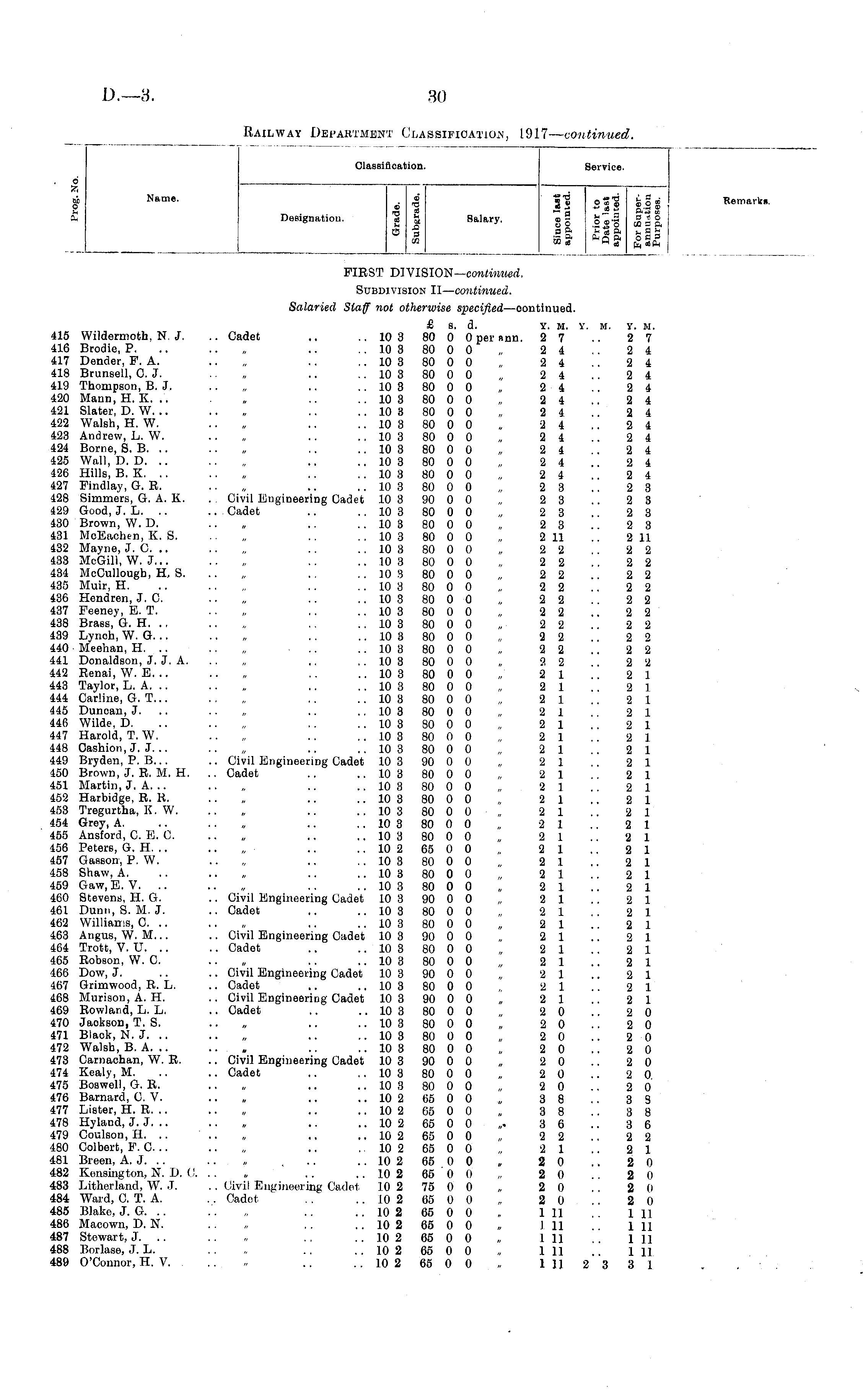 Classification. Service. d Z p Name. Designation. _ at - § CO Salary. |1 Sfg HI _ ° fc~.| B * O So .2 50 CO 3 ft ffi __* * q ft o b P ™ a w * Cq 8ft Remarks. FIRST DIVISION— emtimmd. Subdivision II— continued. Salaried Staff not otherwise specified —oontinued. £ s. d. Y. M. Y. M. 415 Wildermoth, N. J. .. Cadet .. ..103 80 0 Opernnn. 27 416 Brodie, P. .. .. „ .. .. 10 3 80 0 0 „ 2 4 417 Dender, F. A. .. „ .. .. 10 3 80 0 0 „ 2 4 418 Brunsell, C.J. „ .. .. 10 3 80 0 0 „ 2 4 419 Thompson, B. J. .. „ .. .. 10 3 80 0 0 „ 2 4 420 Mann, H. K. .. „ .. .. 10 3 80 0 0 „ 2 4 421 Slater, D. W. .. .. „ .. .. 10 3 80 0 0 „ 2 4 422 Walsh, H. W. .. , .. .. 10 3 80 0 0 „ 2 4 423 Andrew, L. W. .. „ .. .. 10 3 80 0 0 „ 2 4 424 Borne, S. B. .. .. „ .. .. 10 3 80 0 0 „ 2 4 425 Wall, D. D. .. .. „ .. .. 10 3 80 0 0 „ 2 4 426 Hills, B. K. .. .. „ .. .. 10 3 80 0 0 „ 2 4 427 Findlay, G. R. .. „ .. .. 10 3 80 0 0 „ 2 3 428 Simmers, G. A. K. . , Civil Engineering Cadet 10 3 90 0 0 „ 2 3 429 Good, J. L. .. .. Cadet .. .. 10 3 80 0 0 „ 2 3 430 Brown, W. D. .. „ .. .. 10 3 80 0 0 „ 2 3 431 McEachen, K. S .. .. 10 3 80 0 0 „ 2 11 432 Mayne, J. C. .. .. „ .. .. 10 3 80 0 0 „ 2 2 433 McGill, W. J... .. „ .. .. 10 3 80 0 0 „ 2 2 434 McCullougb, H, S. .. „ .. .. 10 3 80 0 0 „ 2 2 435 Muir, H. .. .. „ .. .. 10 3 80 0 0 „ 2 2 436 Hendren, J. C. .. „ .. .. 10 3 80 0 0 „ 2 2 437 Feeney, E. T. .. „ .. .. 10 3 80 0 0 „ 2 2 438 Brass, G. H. .. .. „ .. 10 3 80 0 0 „ 2 2 439 Lynch, W. G. .. .. „ .. .. 10 3 80 0 0 „ 2 2 440 Meehan, H .. .. „ ... .. 10 3 80 0 0 „ 2 2 441 Donaldson, J. J. A. .. „ ,. .. 10 3 80 0 0 „ 2 2 442 Renai, W. E. .. .. „ .. .. 10 3 80 0 0 „ 2 1 443 Taylor, L. A. .. .. „ .. .. 10 3 80 0 0 „ 2 1 444 Carline, G. T... ., „ .. .. 10 3 80 0 0 „ 2 1 445 Duncan, J. .. .. „ .. .. 10 3 80 0 0 „ 2 1 446 Wilde, D. .. .. „ .. .. 10 3 80 0 0 „ 2 1 447 Harold, T. W. .. „ .. .. 10 3 80 0 0 „ 2 1 448 Cashion, J. J. .. .. „ .. .. 10 3 80 0 0 „ 2 1 449 Bryden, P. B... .. Civil Engineering Cadet 10 3 90 0 0 „ 2 1 450 Brown, J. R. M. H. .. Cadet .. .. 10 3 80 0 0 „ 2 1 451 Martin, J. A. .. .. „ .. .. 10 3 80 0 0 „ 2 1 452 Harbidge, R. R. .. „ .. .. 10 3 80 0 0 „ 2 1 453 Tregurtha, K. W. .. „ .. .. 10 3 80 0 0 „ 2 1 454 Grey, A. .. .. „ .. .. 10 3 80 0 0 „ 2 1 455 Ansford, C. E. C. .. „ .. .. 10 3 80 0 0 „ 2 1 456 Peters, G. H. .. .. „ .. .. 10 2 65 0 0 „ 2 1 457 Gasson, P. W. .. „ .. .. 10 3 80 0 0 „ 2 1 458 Shaw, A. .. .. „ .. .. 10 3 80 0 0 „ 2 1 459 Gaw, E. V. .. .. „ .. .. 10 3 80 0 0 „ 2 1 460 Stevens, H. G. .. Civil Engineering Cadet 10 3 90 0 0 „ 2 1 461 Dunn, S. M. J. .. Cadet .. .. 10 3 80 0 0 „ 2 1 462 Williams, O. .. .. „ .. .. 10 3 80 0 0 „ 2 1 463 Angus, W. M... .. Civil Engineering Cadet 10 3 90 0 0 , 2 1 464 Trott, V. U. .. .. Cadet .. .. 10 3 80 0 0 „ 2 1 465 Robson, W. C .. „ .. .. 10 3 80 0 0 „ 2 1 466 Dow, J. .. .. Civil Engineering Cadet 10 3 90 0 0 „ 2 1 467 Grimwood, R. L. .. Cadet .. .. 10 3 80 0 0 „ 2 1 468 Murisou, A. H. .. Civil Engineering Cadet 10 3 90 0 0 „ 2 1 469 Rowland, L. L. .. Cadet .. .. 10 3 80 0 0 „ 2 0 470 Jaokson, T. S. .. „ .. .. 10 3 80 0 0 "„ 2 0 471 Black, N.J... .. „ .. .. 10 3 80 0 0 „ 2 0 472 Walsh, B. A... .. „ .. .. 10 3 80 0 0 „ 2 0 473 Carnachan, W. R. .. Civil Engineering Cadet 10 3 90 0 0 „ 2 0 474 Kealy, M. .. .. Cadet .. .. 10 3 80 0 0 „ 2 0 475 Boswell, G. R. .. „ .. .. 10 3 80 0 0 „ 2 0 476 Barnard, O. V. .. „ .. .. 10 2 65 0 0 „ 3 8 477 Lister, H. R. .. .. , .. .. 10 2 65 0 0 „ 3 8 478 Hyland, J.J... .. , .. .. 10 2 65 0 0 „. 3 6 479 Coulson, H. .. .. „ .. .. 10 2 65 0 0 „ 2 2 480 Colbert, P. O. .. .. „ .. .. 10 2 65 0 0 „ 2 1 481 Breen, A. J. .. .. „ . .. .. 10 2 65 0 0 . 2 0 482 Kensington, N. D. C. . . „ .. .. 10 2 66 0 II „ 2 0 483 Litherland, W. J. .. Civil Engineering Cadet 1.0 2 75 0 0 „ 2 0 484 Ward, C. T. A. . . Cadet . . .. 10 2 65 0 0 ,. 2 0 485 Blake, J. G. .. .. „ .. .. 10 2 65 0 0 „ 1 11 486 Macown, D. N. .. „ . . .. 10 2 65 0 0 „ 111 487 Stowart, J. .. „ . . .. 10 2 65 0 0 „ 111 488 Borlase, J. L. . . „ .. .. 10 2 65 0 0 „ 111 489 O'Connor, H. V. ,, .. .. 10 2 65 0 0 , 11)23 Y. If. 2 7 2 4 2 4 2 4 2 4 2 4 2 4 2 4 2 4 2 4 2 4 2 4 2 3 2 3 2 3 2 3 2 11 2 2 2 2 2 2 2 2 2 2 2 2 2 2 2 2 2 2 2 2 2 1 2 1 2 1 2 1 2 1 2 1 2 1 2 1 2 1 2 1 2 1 2 1 2 1 2 1 2 1 2 1 2 1 2 1 2 1 2 1 2 1 2 1 2 1 2 1 2 1 2 1 2 1 2 0 2 0 2 0 2 0 2 0 2 0 2 0 3 8 3 8 3 6 2 2 2 1 2 0 2 0 2 0 2 0 1 11 1 11 1 11 1 11 3 1