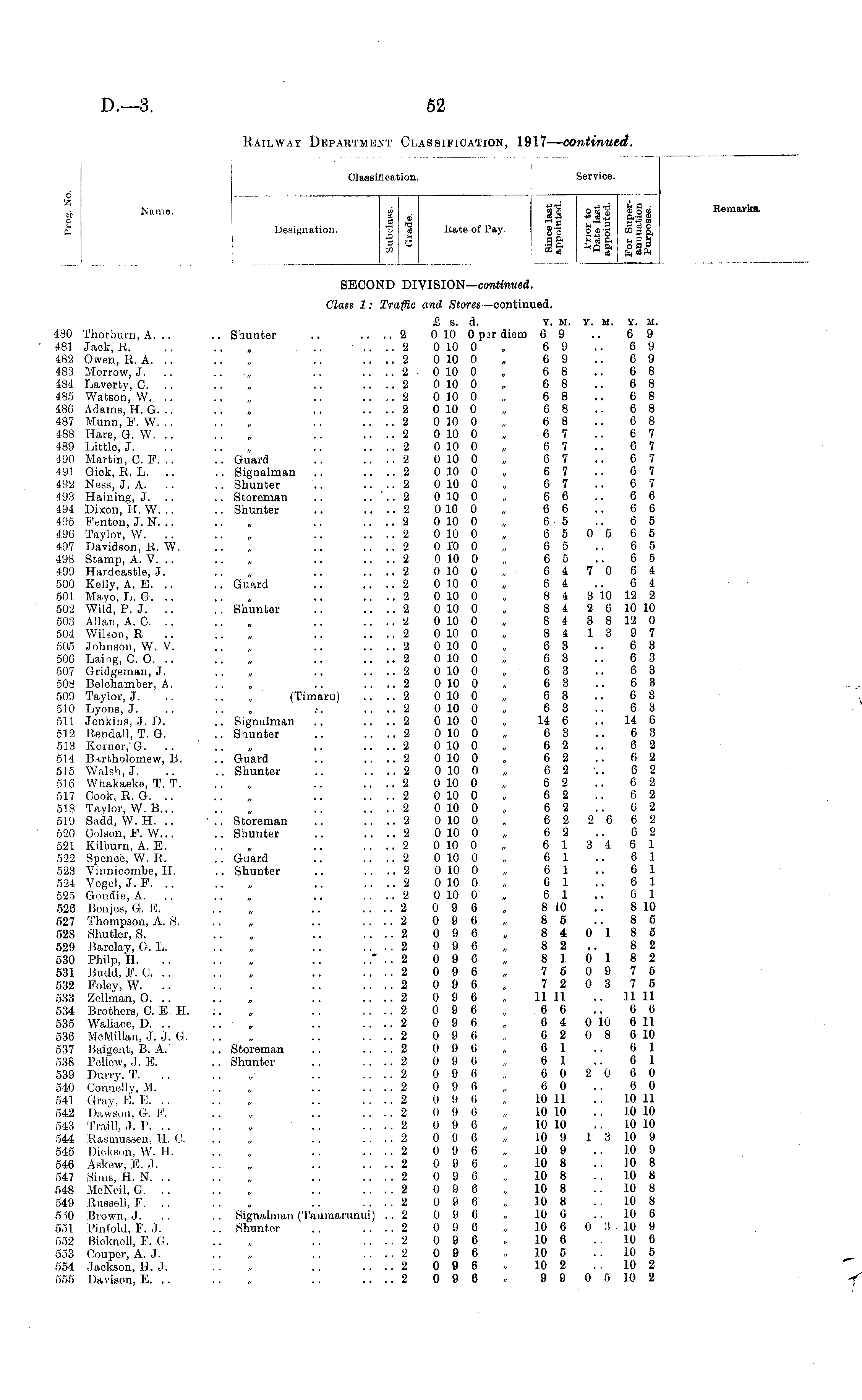 o 65 .'c Name. o ft Classification. Service. _ _, — ti — a • 3 . J» o«j ;o; s 2 iSS „•* BS _ Designation. "o 1 itate of Pay. g-g *ffi-f —' _ a o _! 9 a ?*ft-2Si m & & ft Q ft ° S ? u - u * - H „ ft, «Sft Classification. Service. Remarks. liate of Pay. _ in — ti — a • — -— — _ ._ ft-_ 9 "a „- a s_g So sg'3 -gi, aft .Kd_ -2S _ & ft Q a o a s a - - H „ £ e_ft SECOND DIVISION-contfaM.-. Class 1: Traffic and Stores —continued. 480 Thorburn, A. .. 481 Jaok, R. 482 Owen, R. A. .. 483 Morrow, J. .. 484 Laverty, 0. 4S5 Watson, W. .. 486 Adams, H. G. .. 487 Munn, F. W. , . 488 Hare, G. W. 489 Little, J. 490 Martin, 0. F. .. 491 Gick, R. L. .. 492 Ness, J. A. 493 Haining, J. 494 Dixon, H. W. .. 495 Fenton, J. N. .. 496 Taylor, W. .. 497 Davidson, R, W. 498 Stamp, A. V. .. 499 Hardcastle, J. 500 Kelly, A. E. 501 Mayo, L. G. 502 Wild, P. J. 503 Allan, A. 0. .. 504 Wilson, R 505 Johnson, W. V. 506 Laing, CO. .. 507 Gridgeman, J. 508 Belchamber, A. 509 Taylor, J. 510 Lyons, J. 511 Jenkins, J. D. 512 Rendall, T. G. 513 Korner.'G. .. 514 Bartholomew, B. 515 Walsh, J. 516 Whakaeko, T. T. 517 Cook, R. G. 518 Taylor, W. B... 519 Sadd, W. H. .. 520 Oolson, F. W... 521 Kilburn, A. E. 522 Spence, W. R. 523 Vinnicombe, H. 524 Vogel.J. F. .. 525 Goudio, A. 526 Benjes, G. E. 527 Thompson, A. S. 528 Slmtler, S. 529 Barclay, G. L. 530 Philp, H. 531 Budd, F. C. .. 532 Foley, W. .. 533 Zollman, O. .. 534 Brothers, 0. E. H, 535 Wallace, D. .. 536 McMillan, J. J. G. 537 Baigent, B. A. 538 Pellew, J. E. 539 Dmi-y. T. 540 Connelly, M. 541 Gray, E. E. . . 542 Dawson, G. W. 543 Traill, J. P. 544 Rasmussen, H. C, 545 Dickson, W. II. 546 Askew, E. J. 547 Sims, H. N. . . 548 McNeil, C. 549 Russell, F. .. 5 >0 Brown, J. 551 Pinfold, F. J. 552 Bicknell, F. G. 553 Couper, A. J. 554 Jackson, H. J. 555 Davison, E. .. £ s. d. Y. M. Y. M. Y. M. .. Shunter .. .... 2 0 10 0 psr diam 6 9 .. 6 9 .. .... 2 0 10 0 „ 69 .. 69 .... 2 0 10 0 „ 6 9 .. 6 9 .. .. .... 2 0 10 0 „ 6 8 .. 6 8 .... 2 0 10 0 „ 6 8 .. 6 8 .... 2 0 10 0 „ 6 8 .. 6 8 .... 2 0 10 0 „ 68 .. 68 .... 2 0 10 0 „ 6 8 .. 6 8 .... 2 0 10 0 „ 67 .. 67 .... 2 0 10 0 „ 07 .. 67 .. Guard .. .... 2 0 10 0 „ 6 7 .. 6 7 .. Signalman .. .... 2 0 10 0 „ 6 7 .. 6 7 .. Shunter .. .... 2 0 10 0 , 67 .. 67 .. Storeman .. .... 2 0 10 0 , 6 6 .. 6 6 .. Shunter .. .... 2 0 10 0 , 66 .. 66 .... '2 0 10 0 „ 6 5 .. 6 5 .... 2 0 10 0 „ 6 5 0 5 6 5 .... 2 0 10 0 „ 6 5 .. 6 5 .... 2 0 10 0 „ 6 5 .. 6 5 .... 2 0 10 0 „ 6 4 7 0 6 4 .. Guard .. .... 2 0 10 0 , 6 4 .. 6 4 .... 2 0 10 0 „ 8 4 3 10 12 2 .. Shunter .. .... 2 0 10 0 „ 8 4 2 6 10 10 .... 2 0 10 0 , 8 4 3 8 12 0 .... 2 0 10 0 „ 841397 .... 2 0 10 0 „ 63 .. 63 .... 2 0 10 0 „ 6 3 .. 6 3 .... 2 0 10 0 „ 63 .. 68 .... 2 0 10 0 „ 63 .. 63 (Timaru) .... 2 0 10 0 „ 63 .. 63 .-. ' .... 2 0 10 0 „ 6 3 .. 6 3 .. Signalman .. .... 2 0 10 0 „ 14 6 .. 14 6 .. Shunter .. .... 2 0 10 0 „ 6 8 .. 6 3 .... 2 0 10 0 „ 62 .. 62 .. Guard .. .... 2 0 10 0 „ 62 .. 62 .. Shunter .. .... 2 0 10 0 „ 62 .. 62 .... 2 0 10 0 „ 62 .. 62 .... 2 0 10 0 „ 62 .. 62 .... 2 0 10 0 „ 62 .. 62 ■ .. Storeman .. ....2 0100 „ 622662 .. Shunter .. .... 2 0 10 0 „ 62 .. 62 .... 2 0 10 0 „ 613461 .. Guard .. .... 2 0 10 0 , 6 1 .. 6 1 .. Shunter .. .... 2 0 10 0 „ 61 .. 61 .... 2 0 10 0 „ 61 .. 61 .... 2 0 10 0 „ 61 .. 61 .... 2 096 , 8 10 .. 8 10 .... 2 096 „ 85 .. 85 .... 2 096 „ 840185 .... 2 0 9 6 „ 8 2.. 8 2 . .* . . 2 0 9 0 „ 8 10 18 2 .... 2 096 „ 750975 .... 2 096 , 720 3 75 .... 2 0 9 6 „ 11 11 11 11 .... 2 096 „ .66 .. 66 .... 2 0 9 6 , 6 4 0 10 6 11 .... 2 090 „ 6 2 0 8 6 10 .. Storeman .. .... 2 0 9 0 „ 6 1 .. 6 1 .. Shunter .. .... 2 096 „ 61 .. 61 .... 2 096 „ 602060 .... 2 096 „ 60 .. 60 .... 2 096 „ 10 11 10 11 .... 2 090 „ 10 10 10 10 .... 2 096 „ 10 10 10 10 ....2096,, 10 9 1 3 10 9 .... 2 096 „ 10 9 10 9 .... 2 0 9 6 „ 10 8 .10 8 .... 2 096 „ 10 8 10 8 .... 2 096 „ 10 8 10 8 .... 2 096 „ 10 8 . . 10 8 .. Signalman (Taumarunui) ..2 0 9 6 ,, 10 6 .. 10 6 .. Shunter .. .... 2 0 9 6 „ 10 6 0 3 10 9 .... 2 0 9 6 „ 10 6 . . 10 6 .... 2 096 „ 10 5 10 5 .... 2 0 9 6 ,, 10 2 10 2 .... 2 0 9 6 . 9 9 0 5 10 2