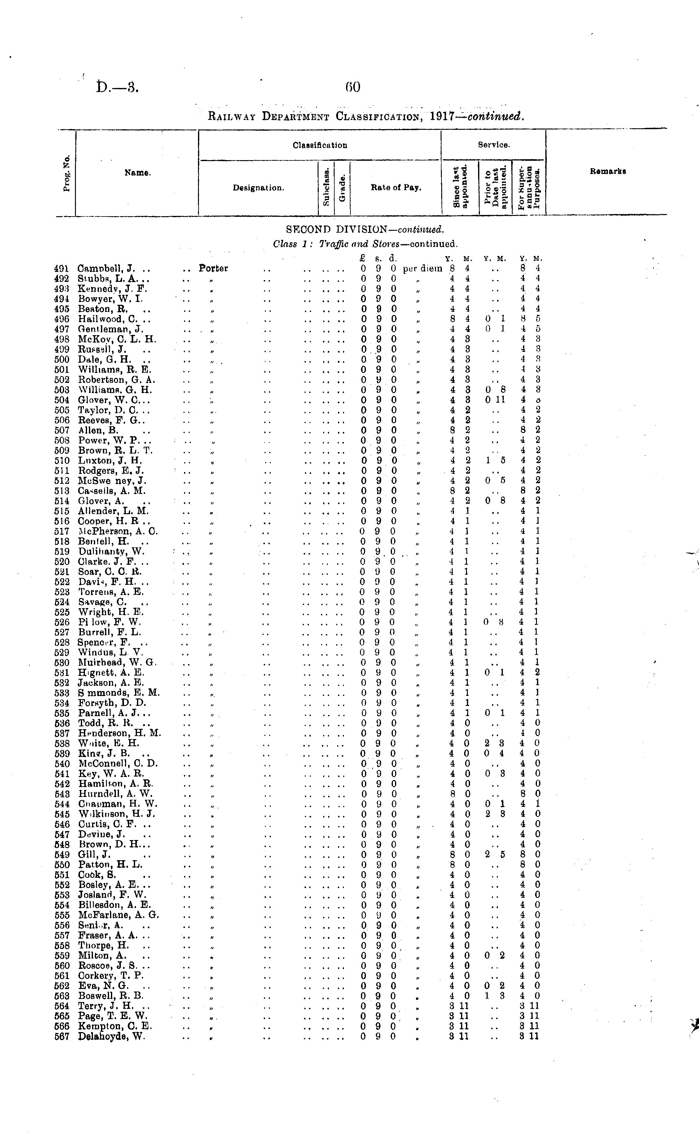 Cla-sificntion Service. 6 V. 6_ o Name. IB CO 3 v 3 0. d a -1 _ z. || Ho a -£ _ _■ !•§_ 3 r O f. 3 _U >- C t o a 3 Ram ark « Designation. Rate of Pay. SECOND DIVISION— continued. Class 1 : Traffic and Stores —continued. 491 Camnbell, J. .. 492 Stubbs, L. A. .. 493 Kennedy, J. F. 494 Bowyer, W. I. 495 Beaton, R. 496 Hailwood, C .. 497 Gentleman, J. 49S McKov, 0. L. H. 499 Russ.il, J. 500 Dale, G. H. .. 501 Williams, R. E. 502 Robertson, G. A. 503 Williams. G. H. 504 Glover, W. C .. 505 Taylor, D. C .. 506 Reeves, F. G.. 507 Allen, B. 508 Power, W. P. .. 509 Brown, R. L. T. 510 Luxton, J. H. 511 Rodgers, E. J. 512 MeSwe ney, J. 513 Ca-sells, A. M. 514 Glover, A. 515 Allender, L. M. 516 Cooper, H. R .. 517 McPherson, A. 0. 518 Benlell, H. .. 519 Dulibantv, W. 520 Clarke. J. F. .. 521 Soar, 0. C. R. 522 Davi<, F. H. .. 523 Torreus, A. E. 524 Savage, C. 525 Wright, H. E. 526 Pi low, F. W. 527 Burrell, F. L. 528 Spenc-r, F. .. 529 Windus, L. V. 530 Muirhead, W. G. 531 Hignett, A. E. 532 Jackson, A. E. 533 S mmonds, E. M. 534 Forsyth, D. D. 535 Parnell, A. J. .. 536 Todd, R. R. .. 537 Henderson, H. M. 538 Woite, _. H. 539 Kine, J. B. .. 540 McConnell, 0. D. 541 Key, W. A. R. 542 Hamilton, A. R. 543 Hurndell, A. W. 544 Chapman, H, W. 545 Wilkinson, H. J. 546 Curtis, C F. 547 Divine, J. 548 Brown, D. H... 549 Gill, J. 550 Patton, H. L. 551 Cook, S. 552 Bosley, A. E. .. 553 Josland, F. W. 554 Billesdon, A. E. 555 MoFarlane, A. G. 556 Seni-r, A. 557 Fraser, A. A. .. 558 Thorpe, H. .. 559 Milton, A. 560 Roscoe, J. S. .. 561 Corkery, T. P. 562 Eva, N. G. 563 Boswell, R. B. 564 Terry, J. H. .. 565 Page, T. E. W. 666 Kempton, C. E. 567 Delahoyde, W. .. Porter £ S. d, Y. M. 0 9 0 per diem 8 4 0 9 0 ,. 4 4 0 9 0 „ 4 4 0 9 0 „ 4 4 0 9 0 „ 4 4 0 9 0 „ 8 4 0 9 0 „ 4 4 0 9 0 „ 4 3 0 9 0 „ 4 3 0 9 0 „ 4 3 0 9 0 „ 4 3 0 9 0 „ 4 3 0 9 0 „ 4 3 0 9 0 „ 4 3 0 9 0 „ 4 2 0 9 0 „ 4 2 0 9 0 „ 8 2 0 9 0 „ 4 2 0 9 0 „ 4 2 0 9 0 „ 4 2 0 9 0 „ 4 2 0 9 0 „ 4 2 0 9 0 „ 8 2 0 9 0 „ 4 2 0 9 0 „ 11 0 9 0 „ 4 1 0 9 0 „ 4 1 0 9 0 „ 4 1 0 9 0 „ 4 1 0 9 0 „ 11 0 9 0 „ 4 1 0 9 0 „ 4 1 0 9 0 „ 4 1 0 9 0 „ 4 1 0 9 0 „ 4 1 0 9 0 „ 4 1 0 9 0 „ 4 1 0 9 0 „ 4 1 0 9 0 „ 4 1 0 9 0 „ 4 1 0 9 0 „ 4 1 0 9 0 „ 4 1 0 9 0 „ 4 1 0 9 0 , 4 1 0 9 0 „ 4 1 0 9 0 „ 4 0 0 9 0 „ 4 0 0 9 0 „ 4 0 0 9 0 „ 4 0 0 9 0 „ 4 0 0 9 0 „ 4 0 0 9 0 „ 4 0 0 9 0 „ 8 0 0 9 0 „ 4 0 0 9 0 „ 4 0 0 9 0 „ . 4 0 0 9 0 „ 4 0 0 9 0 „ 4 0 0 9 0 „ 8 0 0 9 0 „ 8 0 0 9 0 „ 4 0 0 9 0 . 4 0 0 9 0 » 4 0 0 9 0 , 4 0 0 9 0 » 4 0 0 9 0 „ 4 0 0 9 0 » 4 0 0 9 0 „ 4 0 0 9 0 „ 4 0 0 9 0 „ 4 0 0 9 0 „ 4 0 0 9 0 . 4 0 090 . 40 0 9 0 . 3 11 0 9 0 „ 8 11 0 9 0 . 3 11 0 9 0 . 3 11 Y. M. 0 1 0 1 o"s 0 11 1 5 o"« o"s o"s 0 1 0 1 _"8 0 4 0 3 o"i 2 3 2"5 0"2 0 2 1 3 Y. M. 8 4 4 4 4 4 4 4 4 4 8 5 4 5 4 3 4 3 4 3 4 3 4 3 4 3 4 o 4 2 4 2 8 2 4 2 4 2 4 2 4 2 4 2 8 2 4 2 4 1 4 1 4 1 4 1 4 1 4 1 4 1 4 1 4 I 4 1 4 1 4 1 4 1 4 1 4 1 4 1 4 2 4 1 4 1 4 1 4 1 4 0 4 0 4 0 4 0 4 0 4 0 4 0 8 0 4 1 4 0 4 0 4 0 4 0 8 0 8 0 4 0 4 0 4 0 4 0 4 0 4 0 4 0 4 0 4 0 4 0 4 0 4 0 4 0 3 11 3 11 3 11 8 11