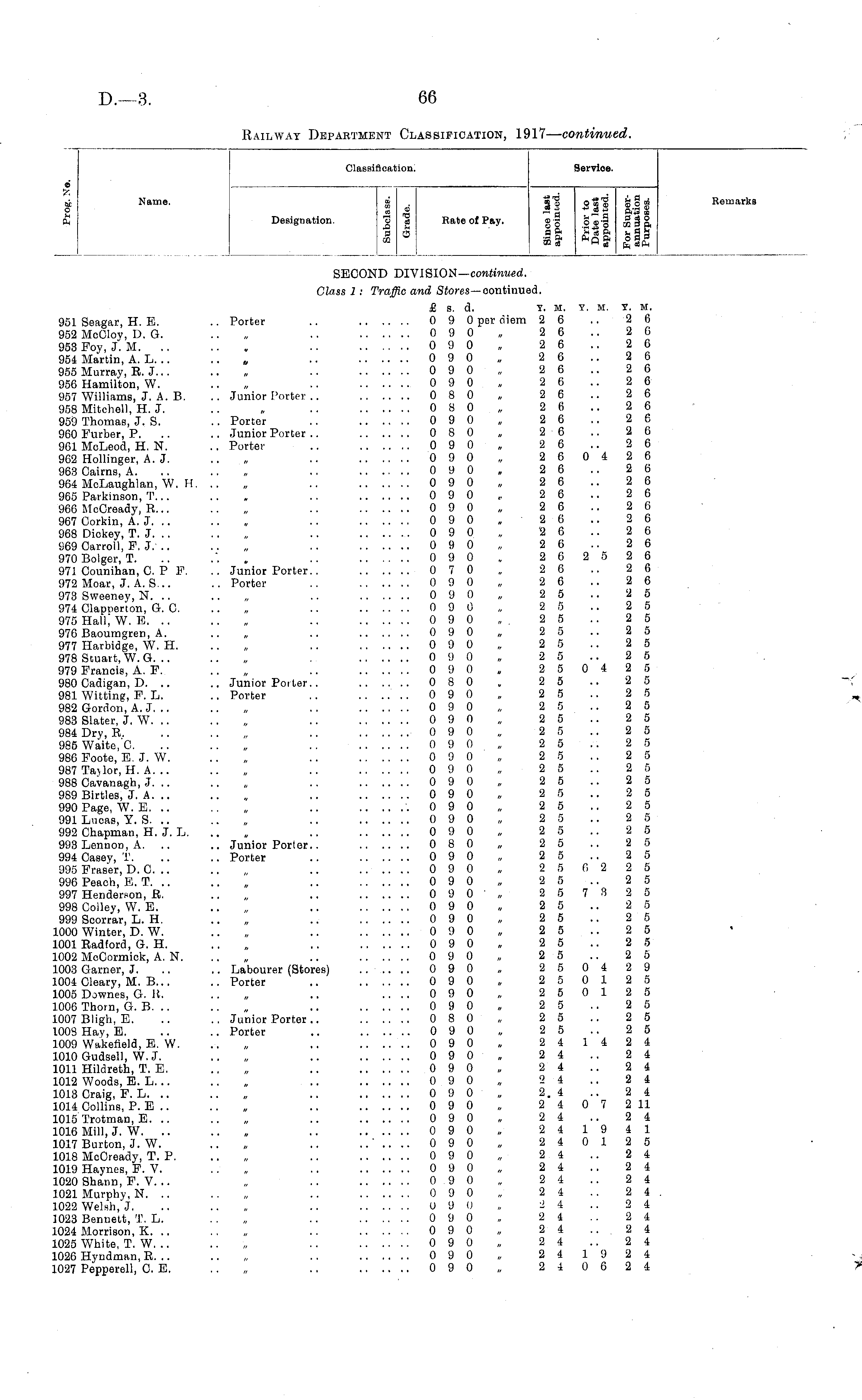 Classification. Service. i Name - i . II *ii ill © % _c o — * i r— fO £ t 11 - a 81 eg „. „ +» _i U 8 ,A - _ 2 II | ,2 __ o co 9 a U _I Qj _ fl M W d fr-j «PH Remark (_! Designation. o a Rate of Pay, ®-g o ,-g o_ § a a. u IS __• fifi B JB Bj? Kate of Pay, UJ EO d " o3 £ _P-f SECOND DIVISION— continued. Class 1 : Traffic and Stores—continued. £ s. d. Y. M. Y. M. Y. M, 951 Seagar, H. E. .. Porter .. 0 9 0 per diem 2 6 .. 2 6 952 McCloy, D. G. .. „ .. 0 9 0 „ 2 6 .. 2 6 953 Foy, J. M , 090 „ 26 .. 26 954 Martin, A. L... .. „ .. 0 9 0 „ 2 6 .. 2 6 955 Murray, R.J... .. „ .. 0 9 0 „ 2 6 .. 2 6 956 Hamilton, W. .. „ . . 0 9 0 „ 2 6 .. 2 6 957 Williams, J. A. B. .. Junior Porter .. 0 8 0 „ 2 6 .. 2 6 958 Mitchell, H. J. .. „ .. 0 8 0 „ 2 6 .. 2 6 959 Thomas, J. S. .. Porter .. 0 9 0 „ 2 6 .. 2 6 960 Furber, P. .. .. Junior Porter .. 080 „ 26 .. 26 961 McLeod, H. N. .. Porter .. 0 9 0 „ 2 6 .. 2 6 962 Hollinger, A. J. .. „ .. 0 9 0 „ 2 6 0 4 2 6 963 Cairns, A. .. .. „ .. 0 9 0 . 2 6 .. 2 6 964 McLaughlan, W. H. .. „ .. 0 9 0 „ 2 6 .. 2 6 965 Parkinson, T... .. . .. 090 ,. 26 .. 26 966 McCready, R... .. „ .. 0 9 0 , 2 6 .. 2 6 967 Corkin, A. J. .. .. „ .. 0 9 0 „ 2 6 .. 2 6 968 Dickey, T. J. .. .. „ .. 0 9 0 „ 2 6 .. 2 6 969 Carroll, F. J. .. .. „ .. 0 9 0 „ 2 6 .. 2 6 970Bolgor, T. .. .*. „ .. 0 9 0 . 2 6 2 5 2 6 971 Counihan, C. P F. .. Junior Porter.. 0 70 . 26 .. 26 972 Moar, J. A. S... .. Porter .. 0 9 0 „ 2 6 .. 2 6 973 Sweeney, N. .. .. „ .. 0 9 0 „ 2 5 .. 2 5 974 Clapnerton, G. C. .. „ .. 0 9 0 „ 2 5 .. 2 5 975Hali;W. E 0 9 0 „. 2 5 .. 2 5 976 Baouragren, A. .. „ .. 0 9 0 „ 2 5 .. 2 5 977 Harbidge, W. H. .. „ .. 0 9 0 „ 2 5 .. 2 5 978 Stuart, W. G. .. .. „ . 0 9 0 „ 2 5 .. 2 5 979 Francis, A. F. .. „ .. 0 9 0 » 2 5 0 4 2 5 980 Cadigan, D. .. .. Junior Porter.. 0 8 0 ,, 2 5 .. 2 5 981 Witting, F. L. .. Porter .. 0 9 0 „ 2 5 .. 2 5 982 Gordon, A. J. .. .. „ .. 0 9 0 „ 2 5 .. 2 5 983 Slater, J. W. .. .. „ .. 0 9 0 „ 2 5 .. 2 5 984 Dry, R. .. .. „ .. 0 9 0 „ 2 5 .. 2 5 985Waite,C. .. .. „ .. 0 9 0 „ 2 5 .. 2 5 986 Foote, E. J. W. .. „ .. 0 9 0 „ 2 5 .. 2 5 987 Taylor, H. A. .. .. „ .. 0 9 0 „ 2 5 .. 2 5 988 Cavanagb, J. .. .. „ .. 0 9 0 „ 2 5 .. 2 5 989Birtles, J. A. .. .. „ .. 0 9 0 „ 2 5 .. 2 5 990 Page, W. E. .. .. „ .. .090 „ 25 .. 25 991 Lucas, Y. S. .. .. „ .. 0 9 0 „ 2 5 .. 2 5 992 Chapman, H. J. L. .. „ .. 0 9 0 „ 2 5 .. 2 5 993Lennon, A. .. .. Junior Porter.. 0 8 0 „ 2 5 .. 2 5 994 Casey, T. .. .. Porter .. 0 9 0 „ 2 5 .. 2 5 995 Fraser, D. C. .. .. „ .. 0 9 0 „ 2 5 0 2 2 5 990 Poach, E. T. .. .. , .. 0 9 0 „ 2 5 .. 2 5 997 Henderson, R. .. „ .. 0 9 0',, 257325 998 Colley, W. E. .. „ .. 0 9 0 „ 2 5 .. 2 5 999 Scorrar, L. H. .. „ .. 0 9 0 „ 2 5 .. 2 5 1000 Winter, D. W. .. „ .. 0 9 0 „ 2 5 .. 2 5 1001 Radford, G. H. .. „ .. 0 9 0 „ 2 5 .. 2 5 1002 McCormick, A. N. .. „ .. 0 9 0 „ 2 5 .. 2 5 1003 Garner, J. .. .. Labourer (Stores) 0 9 0 „ 2 5 0 4 2 9 1004 Cleary, M. B... .. Porter .. 0 9 0 ,, 2 5 0 1 2 5 1005 Downes, G. It. ... .. ....090,, 250125 1.006 Thorn, G. B. .. .. „ .. 0 9 0 „ 2 5 .. 2 5 1007 Bligh, E. .. .. Junior Porter.. 0 8 0 „ 2 5 .. 2 5 1008 Hay, E. .. .. Porter .. 0 9 0 „ 2 5 .. 2 5 1009 Wakefield, E. W. .. „ .. 0 9 0 „ 2 4 14 2 4 1010 Gudsell, W.J. .. „ .. 0 9 0 „ 2 4 .. 2 4 1011 Hildreth, T. E. .. „ .. 0 9 0 „ 2 4 .. 2 4 1012 Woods, E. L... .. „ .. 0 9 0 „ 2 4 .. 2 4 1013 Craig, F. L. .. .. „ .. 0 9 0 „ 2.4 .. 2 4 1014 Collins, P. E .. .. „ .. 0 9 0 „ 2 4 0 7 2 11 1015 Trotman, E. .. .. „ .. 0 9 0 „ 2 4 .. 2 4 1016 Mill, J. W. .. .. „ .. 0 9 0 „ 2 4 19 4 1. 1017 Burton, J. W. .. „ .. ...... 0 9 0 „ 2 4 0 12 5 1018 MoCready, T. P. .. „ .. 0 9 0 „ 2 4 .. 2 4 1019 Haynes, F. V. .. „ .. 0 9 0 „ 2 4 .. 2 4 1020Shann, F. V. .. „ .. 0 9 0 „ 2 4 .. 2 4 1021 Murphy, N. .. .. „ .. 0 9 0 „ 2 4 .. 2 4 1022 Welsh,'J. .. .. „ .. 0 9 0 „ 2 4 .. 2 4 1023 Bennett, T. L. .. „ .. 0 9 0 ,, 2 4 .. 2 4 L024 Morrison, K. .. .. „ .. 0 9 0 „ 2 4 .. 2 4 1025 White, T. W. .. .. „ .. 0 9 0 „ 2 4 .. 2 4 1026 Hyndman, R. .. .. „ .. 0 9 0 „ 2 4 19 2 4 1027 Pepperell, 0. E. .. „ .. 0 9 0 „ 2 4 0 6 2 4