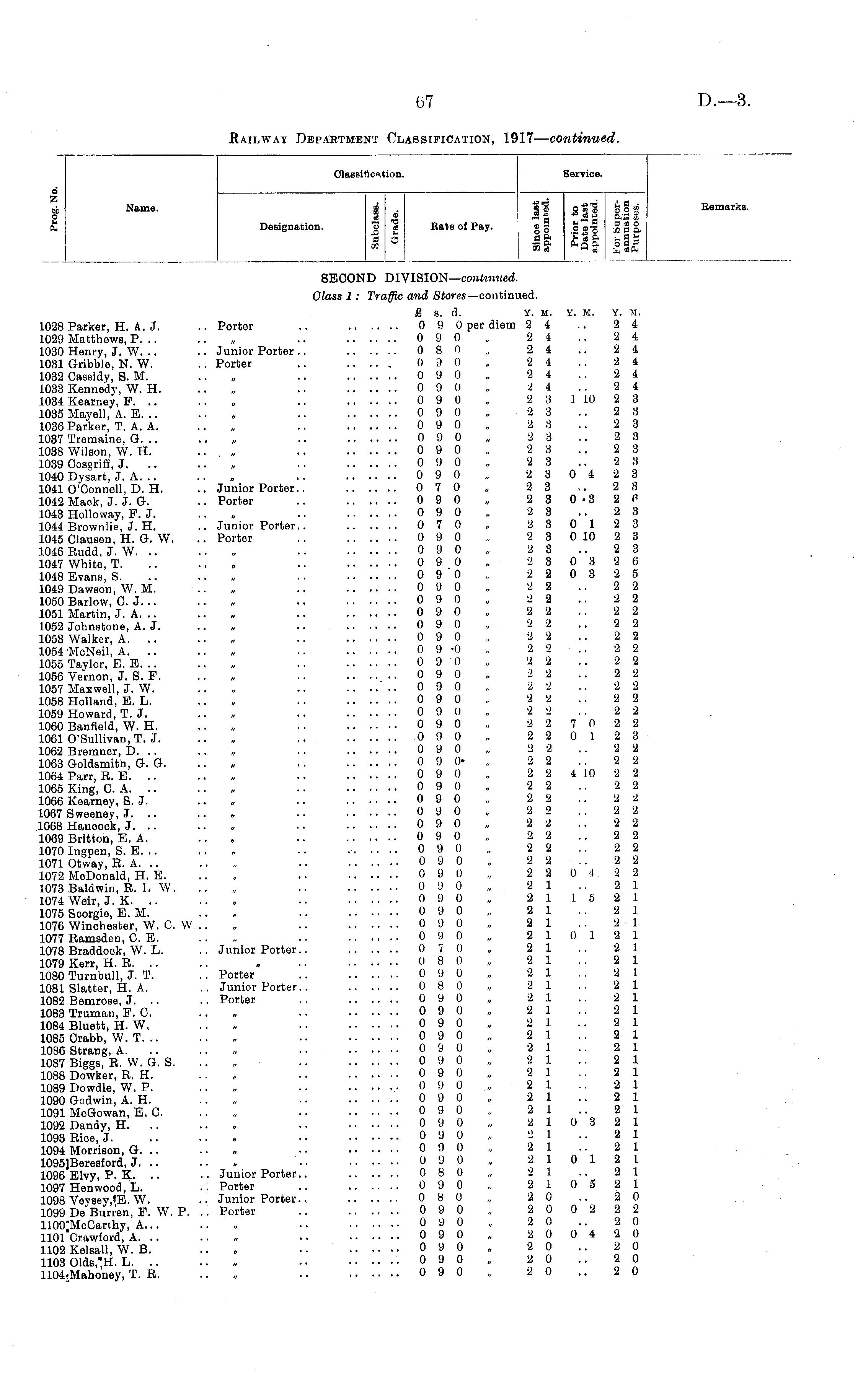 Classification. Service. 6 s s Name. f 2 P 6 3 c O Rate of Pay. II it CO «3 sis g,.ss b™ S 3 » o HI ill Kemarks. Designation. SECOND DIVISION— continued. Class 1 : Traffic and Stores— continued. 1028 Parker, H. A. J. .. Porter 1029 Matthews, P. .. 1030 Henry, J. W. .. .. Junior Porter .. 1031 Gribble, N. W. .. Porter 1032 Cassidy, 8. M. 1088 Kennedy, W. H. 1084 Kearney, P. .. 1085Mayell, A. B. .. 1036 Parkor, T. A. A. ... 1037 Tremaine, G. .. 1038 Wilson, W. H. .. . „ 1039 Oosgrifl, J. 1040 Dysart, J. A. .. 1041 O'Connell, D. H. .. Junior Porter.. 1042 Mack, J. J. G. .. Porter 1043 Holloway, P. J. 1044 Brownlie, J. H. .. Junior Porter.. 1045 Clausen, H. G. W. .. Porter 1046 Rudd, J. W. .. 1047 White, T. .. » 1048 Evans, S. .. ... 1049 Dawson, W. M. 1050 Barlow, 0. J. .. .. 1051 Martin, J. A. .. 1052 Johnstone, A. J. .. „ 1053 Walker, A. .. .. 1054 McNeil, A. .. 1055 Taylor, E. E. .. 1056 Vernon, J. S. F. .. 1057 Maxwell, J. W. 1058 Holland, B. L. ... 1059 Howard, T. J. ., 1060 Banfield, W. H. .. 1061 O'Sullivan.T. J. , 1062 Bremner, D. .. 1063 Goldsmith, G. G. .. 1064 Parr, R. E. .. 1065 King, C. A. .. 1066 Kearney, S. J. 1067 Sweeney, J. .. .. 1068 Hanoook, J. .. 1069 Britton, E. A. 1070 Ingpen, S. E. .. 1071 Otway, R. A. .. 1072 MoDonald, H. E. 1073 Baldwin, R. Ii W. 1074 Weir, J. K. .. .. 1075 Soorgie, E. M. 1076 Winohester, W. C. W .. 1077 Ramsden, C. B. 1078 Braddock, W. L. .. Junior Porter.. 1079 Kerr, H. R. .. 1080 Turnbull, J. T. .. Porter 1081 Slatter, H. A. .. Junior Porter.. 1082 Bemrose, J. .. .. Porter 1083 Truman, P. G. 1084 Bluett, H. W. 1085 Crabb, W. T. .. 1086 Strang, A. 1087 Biggs, R. VV. G. S. 1088 Dowker, R. H. 1089 Dowdle, W. P. 1090 Godwin, A. H. 1091 MoGowan, E. C. 1092 Dandy, H. .. 1093 Rice, J. .. 1094 Morrison, G. .. .. 1095jBeresford, J. .. 1096 Elvy, P. K. .. .. Junior Porter.. 1097 Henwood, L. . • Porter 1098 Veysey,?E. W. .. Junior Porter.. 1099 Dβ Burr'en, P. W. P. .. Porter 1100;McCanhy, A... 1101 Crawford, A. .. 1102 Kelsall, W. B. .. . . 1103 Olds,"H. Ij. .. .. 1104tMahoney, T. R. £ s. d. Y. M. 0 9 0 per diem 2 4 0 9 0 „ 2 4 0 8 0 „ 2 4 .... 090 „ 24 0 9 0 „ 2 4 0 9 0 „ 2 4 0 9 0 „ 2 8 0 9 0 , 2 3 0 9 0 „ 2 3 0 9 0 „ 2 3 0 9 0 „ 2 3 0 9 0 „ 2 8 0 9 0 ., 2 3 0 7 0 „ 2 3 0 9 0 „ 2 3 0 9 0 . 2 3 0 7 0 „ 2 3 0 9 0 „ 2 3 0 9 0 „ 2 3 0 9 0 , 2 3 0 9 ' 0 „ 2 2 0 9 0 „ 2 2 0 9 0 „ 2 2 0 9 0 „ 2 2 0 9 0 „ 2 2 0 9 0 „ 2 2 0 9-0 .. 2 2 0 9 0 „ 2 2 0 9 0 „ 2 2 ...... 0 9 0 „ 2 2 0 9 0 ,, 2 '2 0 9 0 „ 2 2 0 9 0 , 2 2 0 9 0 „ 2 2 0 9 0 „ 2 2 .... 09 0- „ 2 2 0 9 0 „ 2 2 0 9 0 ,, 2 2 0 9 0 „ 2 2 0 9 0 . 2 2 0 9 0 „ 2 2 .... 090 „ 22 0 9 0 „ 2 2 0 9 0 „ 2 2 0 9 0 „ 2 2 0 'J 0 „ 2 1 0 9 0 „ 2 1 0 9 0 „ 2 1 0 9 0 „ 2 1 0 9 0 „ 2 1 0 7 (I „ 2 1 0 8 0 „ 2 1 0 9 0 „ 2 1 0H0 „ 21 0 9 0 „ 2 1 0 0 0 „ 2 1 0 9 0 . 2 1 0 9 0 „ 2 1 0 9 0 „ 2 1 0 9 0 „ 2 1 0 9 0 „ 2 ] 0 9 0 „ 2 1 0 9 0 „ 2 1 0 9 0 „ 2 1 0 9 0 „ 2 1 0 9 0 „ '-! 1 0 9 0 ., 2 1 0 9 0 „ 2 1 0 8 0 „ 2 1 0 9 0 „ 2 J 0 8 0 „ 2 0 0 9 0 „ 2 0 0 9 0 „ 2 0 0 9 0 „ 2 0 0 9 0 , 2 0 0 9 0 „ 2 0 0 9 0 „ 2 0 Y. M. 1 10 0 4 0 3 0 1 0 10 0 3 0 3 7 n o i 4 10 0 i 1 ,') 0 1 0 8 0 1 0 5 0 2 0 i Y. M. 2 4 2 4 2 4 2 4 2 4 2 4 2 3 2 3 2 3 2 3 2 8 2 8 2 3 2 3 2 r> 2 3 2 8 2 3 2 3 2 6 2 5 2 2 2 2 2 2 2 2 2 2 2 2 2 2 2 2 2 2 2 2 2 2 2 2 2 3 2 2 2 2 2 2 2 2 2 2 2 2 2 2 2 2 2 2 2 2 2 2 2 1 2 1 2 J 2 1 2 1 2 1 2 1 2 1 2 1 2 1 2 1 2 1 2 1 2 1 2 1 2 1 2 1 2 1 2 1 2 1 2 1 2 1 2 1 2 1 2 1 2 0 2 2 2 0 2 0 2 0 2 0 2 0