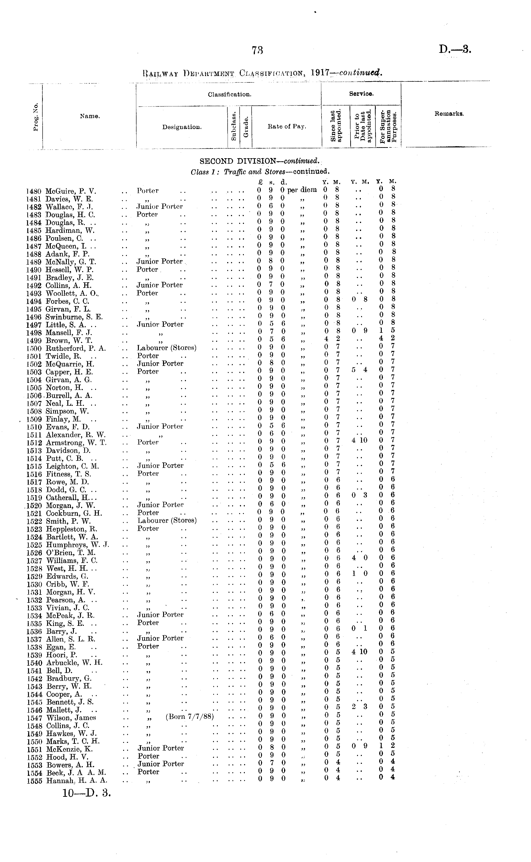 Classification. Service. 6 t On Name. Dosiguatioa. 2 5 i i 5 a Kate of Pay, 4B rQ II Sl1 Hi o ® o co p a 2 "S i-i j .flu Remarks. SECOND DIVISION— continued. Clans 1: Traffic and Stores —continued. 1480 McGuire, P. V. 1481 Davies, W. E. 1482 Wallaoe, P. J. 1 483 Douglas, H. C. 1484 Douglas, "R. . . 1485 Hardiman, W. 1486 Poulsen, C. .. 1487 McQueen, I. . . 1488 Adank, F. P. 1489 McNally, G. T. 1490 Hessell, W. P. 1.491 Bradley, J. E. 1492 Collins, A. H. 1493 Woollett, A. 0,. 1494 Forbes, 0. 0. 1495 Girvan, F. L. 1496 Swinburne, 8. E. 1497 Little, S. A. 1498 Manscll, F. J. 1.499 Brown, W. T. 1500 Rutherford, P. A. 1501 Twidle, R. .. 1502 MoQuarrie, H. 1503 Capper, H. E. 1504 Girvan, A. G. 1.505 Norton, H. .. 1506-Burrell, A. A. 1.507 Neal, L. H. 1508 Simpson, W. 1509 Finlay, M. .. 1510 Evans, F. D. 1511 Alexander, R. W. J 512 Armstrong, W. T. 1.513 Davidson, D. 1514 Putt, C. B. 1515 Leighton, C. M. 1516 Fitness, T. S. 1517 Rowe, M. D. 1518 Dodd, G. C. 1519 Oatherall, H... 1520 Moraan, J. W. 1521 Cockburn, G. H. 1522 Smith, P. W. 1523 Heppleston, R. 1524 Bartlett, W. A. 1.525 Humphreys, W. J. 1526 O'Brien, T. M. 1527 Williams, F. C. 1528 West, H. H. 1529 Edwards. G. 1530 Cribb, W. F. 1 581 Morgan, H. V. 1532 Pearson, A. .. 1533 Vivian, J. C. 1.534 MePeak, J. R. 1.535 King, S. E. . . 1536 Barry, J. 1537 Allen, S. L. R. 1.538 Egan, E, 1539 Hoori, P. 1540 Arbueklo, W. H. 1541 Bell, D. 1542 Bradbury, G. 1543 Berry, W. H. 1544 Cooper, A. . . 1545 Bennett, J. S. 1546 Mallett, J. .. 1547 Wilson, James 1548 Collins, J. C. 1549 Hawkes, W. J. 1550 Marks, T. C. H. 1551 McKenzie, K. 1552 Hood, H. V. 1.553 Bowers, A. H. 1554 Beck, J. A A. M. 1555 Hannah; H. A. A. £ h. d. Y. M, .. Porter .. 0 9 0 per diem 0 8 0 9 0 „ 0 8 . . .junior Porter 0 6 0 „ 0 8 .. Porter .. 0 9 0 „ 0 8 . . 0 9 0 „ 0 8 0 9 0 „ 0 8 090 „ 08 0 9 0 „ 0 8 0 9 0 „ 0 8 .. Junior Porter 0 8 0 „ 0 8 .. Porter . . 0 9 0 „ 0 8 0 9 0 „ 0 8 .. Junior Porter 070 „ 08 .. Porter .. 0 9 0 „ 0 8 0 9 0 „ 0 8 0 9 0 „ 0 8 " 0 9 0 „ 0 8 . . Junior Porter 0 5 6 „ 0 8 0 7 0 „ 0 8 0 5 6 „ 4 2 .. Labourer (Stores) 0 9 0 „ 0 7 .. Porter ' 0 9 0 „ 0 7 .. Junior Porter 0 8 0 „ 0 7 .. Porter .. 0 9 0 „ 0 7 0 9 0 „ 0 7 0 9 0 „ 0 7 0 9 0 „ 0 7 0 9 0 „ 0 7 0 9 0 „ 0 7 0 9 0 „ 0 7 . . Junior Porter 0 5 6 „ 0 7 0 6 0 „ 0 7 . . Porter .. 0 9 0 „ 0 7 0 9 0 „ 0 7 0 9 0 „ 0 7 .. Junior Porter 0 5 6 „ 0 7 .. Porter .. 0 9 0 „ 0 7 0 9 0 „ 0 6 0 9 0 „ 0 6 0 9 0 „ 0 6 .. Junior Porter 0 6 0 „ Oβ .. Porter .. 0 9 0 „ 0 6 .. Labourer (Stores) 0 9 0 „ 0 6 . . Porter ' . . 0 9 0 „ 0 6 0 9 0 „ 0 6 0 9 0 „ 0 6 0 9 0 „ 0 6 0 9 0,, 06 0 9 0,, 06 0 9 0 „ 0 6 0 9 0 „ 0 6 090 „ 06 090 , 06 0 9 0 „ 0 6 . . Junior Porter 0 6 0 „ 0 6 .. Porter 0 9 0 „ 0 6 0 9 0 „ 0 6 .. Junior Porter 0 6 0 „ 0 6 .. Porter .. 0 9 0 „ 0 6 0 9 0 „ 0 5 0 9 0 „ 0 5 0 9 0 „ 0 5 .... 090 „ 05 0 9 0 „ 0 5 0 9 0 „ 0 5 0 9 0 „ 0 5 0 9 0 „ 0 5 ., (Born 7/7/88) .... 090 „ 05 0 9 0 „ 0 5 0 9 0 „ 0 5 0 9 0 „ 0 5 . . Junior Porter 0 8 0 „ 0 5 . . Porter . . 0 9 0 „ 0 5 . . Junior Porter 0 7 0 „ 0 4 .. Porter .. 090 „ 04 090 , 04 Y. M. Y. M. 0 8 0 8 0 8 0 8 0 8 0 8 0 8 0 8 0 8 0 8 0 8 0 8 0 8 0 8 0 8 0 8 0 8 0 8 0 8 0 9 1 5 4 2 0 7 0 7 0 7 5 4 0 7 0 7 0 7 0 7 0 7 0 7 0 7 0 7 0 7 4 10 0 7 0 7 0 7 0 7 0 7 0 6 0 6 0 3 0 6 0 6 0 6 0 6 0 6 0 6 0 6 0 6 4 0 0 6 0 6 10 0 6 0 6 0 6 0 6 0 6 0 6 0 6 0 1 0 6 0 6 0 6 4 10 0 5 0 5 0 5 0 5 0 5 0 5 0 5 2 3 0 5 0 5 0 5 0 5 0 5 0 0 12 0 5 0 4 0 4 0 4
