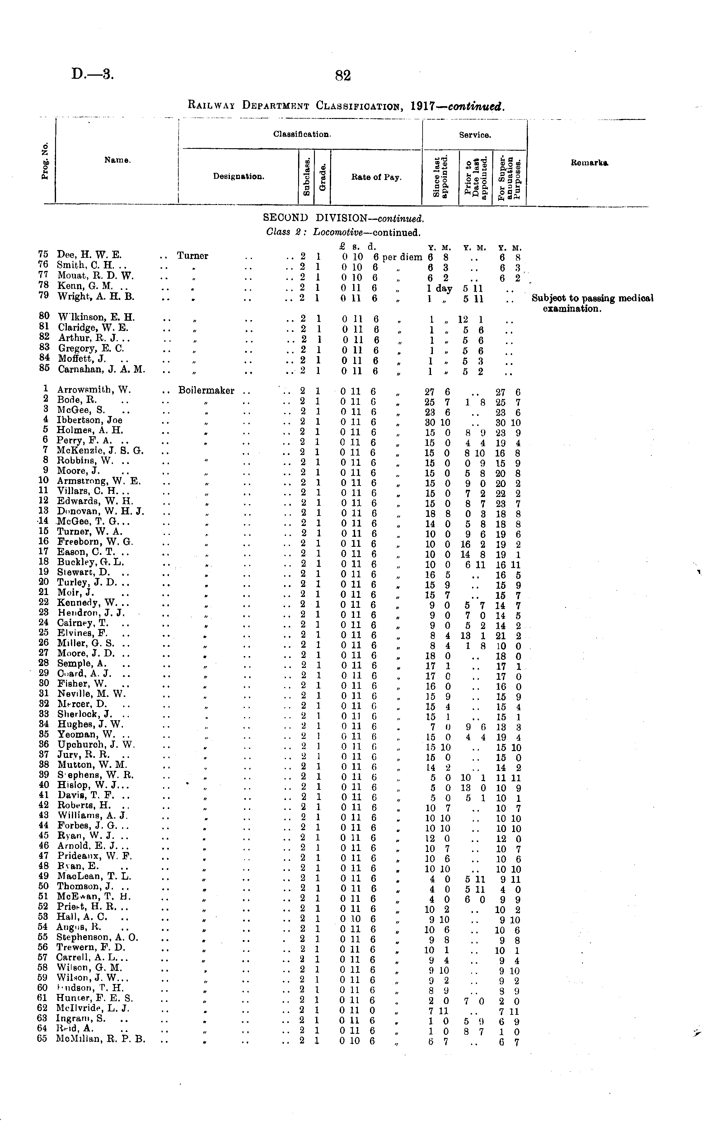 Classification. Service. 6 Z Name. SO 1 111 if ill £ a . ® o * Q,.-3 ID si! Ill Rotuarke. Designation. i Rate of Pay. SECOND DIVISION— continued. Class 2 : Locomotive —continued. 75 Dee, H. W. E. 76 Smith, C. H. .. 77 Mouat, R. D. W. 78 Kenn, G. M. 79 Wright, A. H. B. 80 W lkinson, E. H. 81 Claridge, W. E. 82 Arthur, R. J. .. 83 Gregory, E. C. 84 Moffett, J. .. 85 Carnahan, J. A. M. .. Turner £ s. d. y. m. y. m. y. m. ..21 0 10 6 per diem 68 .. 68 ••2 1 0 10 6 „ 6 3 .. 6 3 ••2 1 0 10 6 „ 6 2 .. 6 2 • •2 1 0 11 6 „ 1 day 5 11 ..21 0116 „ 1,, 511 .. Subjeot to passing medical examination. • ■2 1 0 11 6 „ 1 „ 12 1 ••2 1 0 11 6 „ 1 „ 5 6 -.2 1 0 11 6 „ 1 „ 5 6 ..2 1 0 11 6 „ 1 „ 5 6 ..2 1 0 11 6 „ 1 „ 5 3 ..21 0116 „ 1 „ 5 2 1 Arrowsmith, W. 2 Bode, R. 3 McGee, S. 4 Ibbertson, Joe 5 HolmeR, A. H. 6 Perry, F. A. .. 7 McKenzie, J. S. G. 8 Robbins, W. .. 9 Moore, J. 10 Armstrong, W. E. 11 Villars, C. H. .. 12 Edwards, W. H. 13 Donovan, W. H. J. 14 McGee, T. G... 15 Turner, W. A. 16 Preeborn, W. G. 17 Eason, C. T. 18 Buekley, G. L. 19 Siewart, D. .. 20 Turley, J. D. .. 21 Moir, J. 22 Kennedy, W. .. 23 Hendron, J. J. 24 Cairney, T. .. 25 Klvines, F. 26 Miller, G. S. .. 27 Moore, J. D. 28 Semple, A. 29 Card, A. J. .. 30 Fieher, W. .. 31 Neville, M. W. 32 Mercer, D. .. 33 Sherlock, J. .. 34 Hughes, J. W. 35 Yeoman, W. .. 36 Upohuroh, J. W. 37 Jury, R. R. 38 Mutton, W. M. 39 S ephens, W. R. 40 Hislop, W. J. .. 41 Davie, T. F. 42 Roberts, H. ., 43 Williams, A. J. 44 Forbes, J. G. .. 45 Ryan, W. J. .. 46 Arnold, E. J. .. 47 Prideaux, W. F. 48 B\an, E. 49 MaoLean, T. L. 50 Thomson, J. .. 51 McEwan, T. H. 52 Priest, H. R. .. 53 Hall, A. C. .. 54 Angus, H. 55 Stephenson, A. O. 56 Trewern, F. D. 57 Carrell, A. L... 58 Wilson, G. M. 59 Wilson, J. W... 60 I'udson, T. H. 61 Hunter, F. E. S. 62 Mellvride, L. J. 63 Ingram, S. 64 A. 65 MoMillan, R. P. B. .. Boilermaker .. • ■ H « . • ■2 1 0 11 6 „ 27 6 .. 27 6 • •2 1 0 11 6 „ 25 7 1 8 25 7 • •2 1 0 11 6 „ 23 6 .. 23 6 • ■21 0 11 6 „ 30 10 .. 30 10 ■ •21 0 11 6 „ 15 0 8 1) 23 9 • •2 1 0 11 6 „ 15 0 4 4 19 4 • •2 1 0 11 6 „ 15 0 8 10 16 8 ..2 1 0 11 6 „ 15 0 0 9 15 9 ..21 0 11 6 „ 15 0 5 8 20 8 ..2 1 0 11 6 „ 15 0 9 0 20 2 • •2 1 0 11 6 „ 15 0 7 2 22 2 • •21 0 11 6 „ 15 0 8 7 23 7 • 2 1 0 11 6 „ 18 8 0 3 18 8 -.2 1 0 11 6 „ 14 0 5 8 18 8 ■ •2 1 0 11 6 „ 10 0 9 6 19 6 ■ 2 1 0 11 6 „ 10 0 16 2 19 2 • •21 0 11 6 „ 10 0 14 8 19 1 ■ •21 0 11 6 „ 10 0 6 11 16 11 •■2 1 0 11 6 „ 16 5 .. 16 5 • ■2 1 0 11 6 „ 15 9 .. 15 9 • •2 1 0 11 6 „ 15 7 .. 15 7 • •21 0 116 „ 90 57 14 7 ■ •21 0 116 „ 90 70 14 5 • •21 0116 „ 90 52 14 2 • ■2 1 0 11 6 „ 8 4 13 1 21 2 • •21 0 116 „ 84 18 10 0 • •2 1 0 11 6 „ 18 0 .. 18 0 ••2 1 0 11 6 „ 17 1 .. 17 1 • •2 1 0 11 6 „ 17 0 .. 17 0 • •21 0 11 6 „ 16 0 .. 16 0 ••21 0116 „ 15 9 .. 15 9 • • 2 1 0 11 r< ., 15 4 .. 15 4 •■21 011C „ 15 1 .. 15 1 ■ ■'21 0 11 6 . 7 0 9 6 13 3 • ■21 0 11 6 „ 15 0 4 4 19 4 •■2 1 0 110 „ 15 10 .. 15 10 • ■21 0 11 G „ 15 0 .. 15 0 -.2 1 0 11 6 „ 14 2 .. 14 2 • 2 1 0 11 6 „ 5 0 10 1 11 11 • ■2 1 0 11 6 „ 5 0 13 0 10 9 • •2 1 0 11 G „ 5 0 5 1 10 1 ■ ■2 1 0 11 6 „ 10 7 .. 10 7 ••2 1 0 11 6 „ 10 10 .. 10 10 ••2 1 0 11 6 „ 10 10 .. 10 10 • •2 1 0 11 6 „ 12 0 .. 12 0 • •21 0 11 6 „ 10 7 .. 10 7 •■2 1 0 11 G „ 10 6 .. 10 6 ••2 1 0 11 6 „ 10 10 .. 10 10 • •2 1 0 11 6 . 4 0 5 11 9 11 • •21 0 116 „ 40 5 11 40 -.21 0 116 „ 406099 ..21 0116 „ 10 2 .. 10 2 -.2 1 0 10 6 „ 9 10 .. 9 10 ■•2 1 0 11 6 „ 10 6 .. 10 6 • 21 0 116 . 98 .. 98 ••2 1 0 11 6 » 10 1 10 1 • ■21 0 116 „ <J 4 .. 94 • •21 0 11 G „ 9 10 .. 9 10 ••2 1 0 11 G „ 9 2 .. 9 2 •■2 1 0 11 G „ 8 9 .. 3 9 ■ •21 0110 „ 20 70 20 ••2 1 0 11 0 „ 7 11 .. 7 11 ■ •21 0 116 . 10 5 9 69 • •21 0 116 „ 10 87 10 ••21 0 10 6 „ 67 .. 67