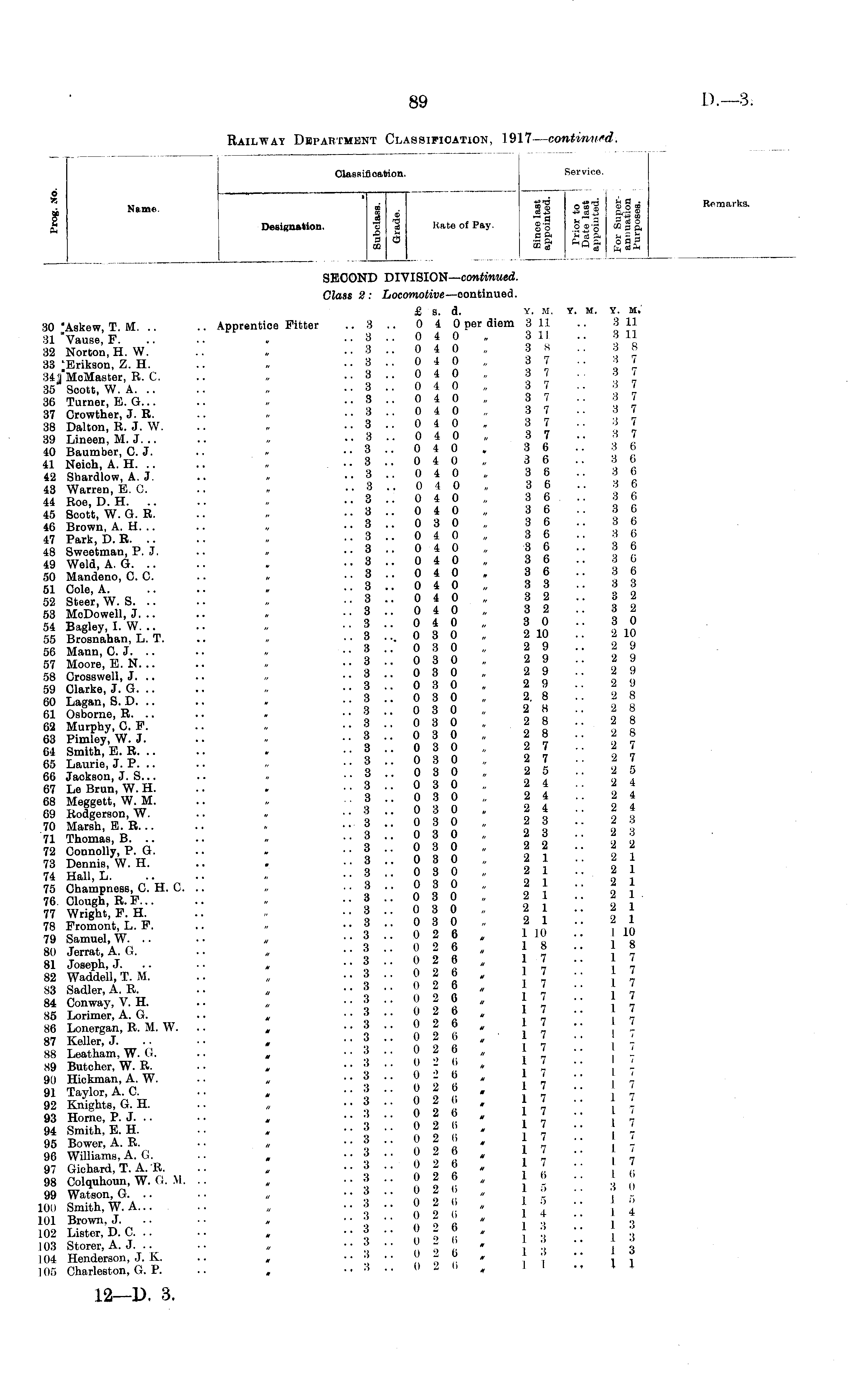 Classifi nation. Service. Name. £ DesiKnation 6 7, i NfllTlO 3 2 * a 1. | 1 Rate of Pay. g-g •§ - -2 a co co 3 32 -32 &.2S g'S §»-§ III II S5a o IOS — cd ._ ft..2 2 3 "aft ft a ft o a a M aj dft Remarks. Designation. I . SECOND DIVISION— continued. Class 2 : Locomotive— oontinued. 30 \Askew, T. M. .. .. Apprentice Fitter 81 "Vause, F. .. 32 Norton, H. W. 33 ;Erikson, Z. H. 84J MoMaster, R. C. 35 Scott, W. A. .. 36 Turner, E.G... 37 Crowther, J. R. 38 Dalton, R. J. W. 39 Lineen, M. J. .. 40 Baumber, C.J. 41 Neioh, A. H. .. 42 Shardlow, A. J. 48 Warren, EC. 44 Roe, D. H. .. 45 Soott, W. G. R. 46 Brown, A. H. .. 47 Park, D. R. .. 48 Sweetman, P. J. 49 Weld, A. G. .. 50 Mandeno, 0. C. 51 Cole, A. 52 Steer, W. S. .. 53 MoDowell, J. .. 54 Bagley, I. W. .. 55 Brosnahan, L. T. 56 Mann, C.J. .. 57 Moore, E.N. .. 58 Crosswell, J. .. 59 Clarke, J. G. .. 60 Lagan, S. D. .. 61 Osborne, R. .. 62 Murphy, O. F. 63 Pimley, W. J. 64 Smith, E. R. .. 65 Laurie, J. P. .. 66 Jackson, J. S... 67 Le Brun, W. H. 68 Meggett, W. M. 69 Rodgerson, W. 70 Marsh, E. R. .. 71 Thomas, B. .. 72 Connolly, P. G. 73 Dennis, W. H. 74 Hall, L. 75 Champness, C. H. C. 76. Clough, R.F... 77 Wright, F. H. 78 Fromont, L. F. 79 Samuel, W. .. 80 Jerrat, A. G. .. „ 81 Joseph, J. 82 Waddell, T. M. 83 Sadler, A. R. 84 Conway, V. H. 85 Lorimer, A. G. .. „ 86 Lonergan, R. M. W. .. 87 Keller, J. 88 Leatham, W. G. .. „ 89 Butcher, W. R. 90 Hickman, A. W. 91 Taylor, A. C. 92 Knights, G. H. 93 Home, P. J. .. 94 Smith, E. H. 95 Bower, A. R. .. „ 96 Williams, A. G. .. , 97 Gichard, T. A. R. .. 98 Colquhoun, W. G. M. .. 99 Watson, G. .. 100 Smith, W. A... 101 Brown, J. 102 Lister, D. C. .. 103 Storer, A. J. .. 104 Henderson, J. K. .. „ 105 Charleston, G. P. £ s. d. Y. M. .. 3 .. 0 4 0 per diem 3 11 .. 3 .. 0 4 0 . 3 11 .. 3 .. 0 4 0 „ 3 S .. 3 .. 0 4 0 „ 3 7 .. 3 .. 0 4 0 „ 3 7 .. 3 .. 0 4 0 „ 3 7 .. 3 .. 0 4 0 „ 3 7 .. 3 .. 0 4 0 „ 3 7 .. 3 .. 0 4 0 . 3 7 .. 3 .. 0 4 0 „ 3 7 .. 3 .. 0 4 0 . 3 6 .. 3 .. 0 4 0 „ 3 6 .. 3 .. 0 4 0 „ 3 6 .. 3 .. 0 4 0 „ 3 6 ..3.. 040 „ 36. .. 3 .. 0 4 0 „ 3 6 .. 3 .. 0 3 0 „ 3 6 .. 3 .. 0 4 0 „ 3 6 .. 3 .. 0 4 0 „ 8 6 .. 3 .. 0 4 0 „ 3 6 .. 3 .. 0 4 0 . 3 6 .. 3 .. 0 4 0 „ 3 3 .. 3 .. 0 4 0 „ 3 2 .. 3 .. 0 4 0 „ 3 2 .. 3 .. 0 4 0 „ 3 0 .. 3 .. 0 3 0 „ 2 10 .. 3 ..' 0 3 0 „ 2 9 .. 3 .. 0 3 0 „ 2 9 .. 3 .. 0 3 0 „ 2 9 .. 3 .. 0 3 0 . 2 9 .. 3 .. 0 3 0 „ 2. 8 .. 8 .. 0 3 0 „ 2 8 .. 3 .. 0 3 0 „ 2 8 .. 3 .. 0 3 0 „ 2 8 .. 3 .. 0 3 0 „ 2 7 .. 3 .. 0 3 0 „ 2 7 .. 3 .. 0 3 0 „ 2 5 .. 3 .. 0 3 0 „ 2 4 . . 3 .. 0 3 0 „ 2 4 .. 3 .. 0 3 0 . 2 4 ... 3 .. 0 3 0 „ 2 3 .. 3 .. 0 3 0 „ 2 3 .. 3 .. 0 3 0 „ 2 2 .. 3 .. 0 3 0 „ 2 1 .. 3 .. 0 3 0 „ 2 1 .. 3 .. 0 3 0 „ 2 1 .. 3 .. 0 3 0 „ 2 1 .. 3 .. 0 3 0 „ 2 1 .. 3 .. 0 3 0 „ 2 1 .. 3 .. 0 2 6 , 1 10 .. 3 .. 0 2 6 , 18 .. 3 .. 0 2 6 „ 17 .. 3 .. 0 2 6 , 17 .. 3 .. 0 2 6 „ 17 .. 3 .. 0 2 0 „ 17 .. 3 .. 0 2 6 „ 17 .. 3 .. 0 2 6 , 17 .. 3 .. 0 2 6 _ ' 17 .. 3 .. 0 2 6 „ 17 .. 3 .. 0 2 6 „ 17 .. 3 .. 0 2 6 , 17 .. 3 ■".. 0 2 6 , 17 .. 3 .. 0 2 6 , 17 .. 3 .. 0 2 6 , 17 .. 3 .. 0 2 6 17 .. 3 .. 0 2 6 , 17 .. 3 .. 0 2 6 17 .. 3 .. 0 2 6 , 17 .. 3 .. 0 2 6 „ 16 .. 3 .. 0 2 6 „ 1 5 .. 3 .. 0 2 6 „ 15 .. 3 .. 0 2 (i > 14 .. 3 .. 0 2 6 , 13 .. 3 .. 0 2 6 , 13 .. 3 '.. 0 2 6 , 13 .. 3 . . 0 2 6 „ II Y. M. Y. M. 8 11 8 11 3 8 3 7 3 7 3 7 3 7 3 7 3 7 3 7 3 6 3 6 3 6 a 6 3 6 3 6 3 6 3 6 3 6 3 6 3 6 3 3 3 2 3 2 3 0 2 10 2 9 2 9 2 9 2 9 2 8 2 8 2 8 2 8 2 7 2 7 2 5 2 4 2 4 2 4 2 3 2 3 2 2 2 1 2 1 ..2 1 2 1 2 1 2 1 I 10 18 1 7 17 17 17 1 7 17 IT 17 17 17 17 17 17 17 17 17 17 16 3 0 I 5 14 13 1 3 13 1 1