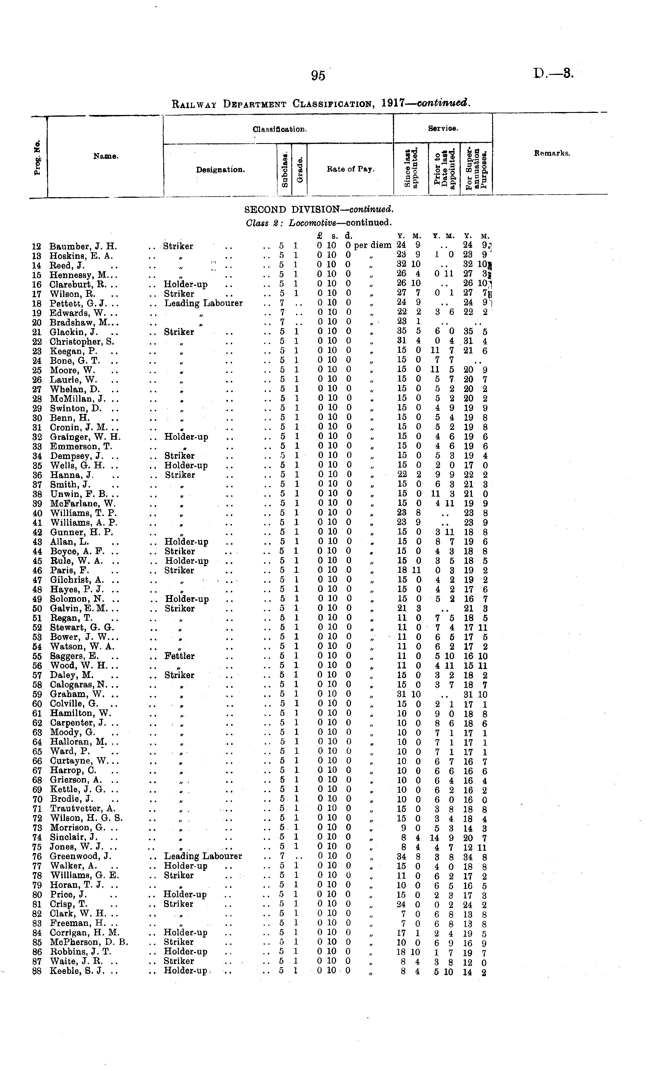 Classification. Service. m jj Name. s 2 e Name. Designation. i 6 it nf Ut i. -3 1 Bate of ray. ••§ g «,.| w g g, 1 5 II jjll III B. Remarks. tomark IB. Designation. SECOND DIVISION— continued. Class 2 : Locomotive —continued. 12 Baumber, J. H. 13 Hoskins, E. A. 14 Reed, J. 15 Hennessy, M... 16 Clareburt, R. .. 17 Wilson, R. 18 Pettett, G. J. 19 Edwards, W. .. 20 Bradshaw, M... 21 Glaokin, J. .. 22 Christopher, S. 23 Keegan, P. 24 Bone, G. T. 25 Moore, W. 26 Laurie, W. 27 Whelan, D. .. 28 McMillan, J. .. 29 Swinton.D. .. 30 Benn, H. 31 Cronin, J. M. .. 32 Grainger, W. H. 33 Emmerson, T. 34 Dempsey, J. .. 35 Wells, G. H. 36 Hanna, J. 37 Smith, J. 38 Unwin, P. B. .. 39 MoFarlane, W. 40 Williams, T. P. 41 Williams, A. P. 42 Gunner, H. P. 43 Allan, L. 44 Boyee, A. P. 45 Rule, W. A. 46 Paris, F. 47 Gilohrisfc, A. .. 48 Hayes, P. J. 49 Solomon, N. .. 50 Galvin, E. M. .. 51 Regan, T. 52 Stewart, G. G. 53 Bower, J. W... 54 Watson, W. A. 55 Saggers, E. .. 56 Wood, W. H. .. 57 Daley, M. 58 Galogaras, N. .. 59 Graham, W. 60 Colville, G. .. 61 Hamilton, W. 62 Carpenter, J. .. 63 Moody, G. 64 Halloran, M. .. 65 Ward, P. ' .. 66 Curtayne, W. .. 67 Harrop, C. 68 Grierson, A. 69 Kettle, J. G. 70 Brodie, J. 71 Trautvetter, A. 72 Wilson, H. G. S. 73 Morrison, G. .. 74 Sinclair, J. 75 Jones, W. J. 76 Greenwood, J. 77 Walker, A. 78 Williams, G. E. 79 Horan, T. J. 80 Price, J. 81 Crisp, T. 82 Clark, W. H. .. 83 Freeman, H. .. 84 Corrigan, H. M. 85 McPherson, D. B. 86 Robbins, J. T. 87 Waite, J. R. 88 Keeble, S. J. .. Striker .. Ho!der-up .. Striker .. Leading Labourer .. Striker .. Holder-up .. Striker .. Holder-up .. Striker .. Holder-up .. Striker .. Holder-up .. Striker .. Holder-up .. Striker .. Pettier .. Striker ... . • H ■ • • • n • • .. Leading Labourer .. Holder-up .. Striker .. Holder-up .. Striker .. Holder-up .. Striker .. Holder-up .. Striker ... ; ., Holder-up. £ S. d. Y. M. Y. M. Y. M. ..51 0 10 0 per diem 24 9 .. 24 9.i ..51 0 10 0 „ 23 9 1 0 23 9 ' ..51 0 10 0 „ 32 10 .. 32 10l ..51 0 10 0 , 26 4 0 11 27 3| ..51 0 10 0 „ 26 10 .. 26 10 '} ..51 0 10 0 , 27 7 0 1 27 7g .. 7 .. 0 10 0 , 24 9 .. 24 9 i .. 7 .. 0 10 0 , 22 2 3 6 22 2 .. 7 .. 0 10 0 „ 23 1 ..5 1 0 10 0 , 35 5 6 0 35 5 ..51 0 10 0 , 31 4 0 4 31 4 ..5 1 0 10 0 „ 15 0 11 7 21 6 ..5 1 0 10 0 „ 15 0 7 7 ..51 0 10 0 „ 15 0 11 5 20 9 ..5 1 0 10 0 „ 15 0 5 7 20 7 ..5 1 0 10 0 , 15 0 5 2 20 2 ..5 1 0 10 0 , 15 0 5 2 20 2 ..51 0 10 0 „ 15 0 4 9 19 9 ..51 0 10 0 „ 15 0 5 4 19 8 ..51 0 10 0 „ 15 0 5 2 19 8 ..5 1 0 10 0 „ 15 0 4 6 19 6 ..5 1 0 10 0 „ 15 0 4 6 19 6 ..5 1 0 10 0 „ 15 0 5 3 19 4 ..51 0 10 0 „ 15 0 2 0 17 0 ..51 0 10 0 „ 22 2 9 9 22 2 ..5 1 0 10 0 „ 15 0 6 3 21 3 ..5 1 0 10 0 „ 15 0 11 3 21 0 ..5 1 0 10 0 „ 15 0 4 11 19 9 ..5 1 0 10 0 „ 23 8 .. 23 8 ..5 1 0 10 0 „ 23 9 .. 23 9 ..51 0 10 0 , 15 0 3 11 18 8 ..5 1 0 10 0 , 15 0 8 7 19 6 ..5 1 0 10 0 „ 15 0 4 3 18 8 ..51 0 10 0 „ 15 0 3 5 18 5 ..5 1 0 10 0 „ 18 11 0 3 19 2 ..5 1 0 10 0 „ 15 0 4 2 19 2 ..51 0 10 0 , 15 0 4 2 17 6 ..5 1 0 10 0 , 15 0 5 2 16 7 ..51 0 10 0 „ 21 3 .. 21 3 ..51 0 10 0 „ 11 0 7 5 18 5 ..51 0 10 0 „ 11 0 7 4 17 11 ..5 1 0 10 0 , 11 0 6 5 17 5 ..51 0 10 0 „ 11 0 6 2 17 2 ..5 1 0 10 0 „ 11 0 5 10 16 10 ..5 1 0 10 0 „ 11 0 4 11 15 11 ..5 1 0 10 0 „ 15 0 3 2 18 2 ..51 0 10 0 „ 15 0 3 7 18 7 ..5 1 0 10 0 „ 31 10 .. 31 10 ..5 1 0 10 0 „ 15 0 2 1 17 1 ..51 0 10 0 „ 10 0 9 0 18 8 ..51 0 10 0 „ 10 0 8 6 18 6 ..51 0 10 0 , 10 0 7 1 17 1 • ■SI 0 10 0 , 10 0 7 1 17 1 ..51 0 10 0 , 10 0 7 1 17 1 ..51 0 10 0 „ 10 0 6 7 16 7 ..5 1 0 10 0 „ 10 0 6 6 16 6 ..5 1 0 10 0 „ 10 0 6 4 16 4 ..5 1 0 10 0 „ 10 0 6 2 16 2 ..51 0 10 0 , 10 0 6 0 16 0 ..5 1 0 10 0 „ 15 0 3 8 18 8 ..5 1 0 10 0 „ 15 0 3 4 18 4 ..51 0 10 0 „ 9 0 5 3 14 3 ..51 0 10 0 , 8 4 14 9 20 7 -.51 0 10 0 „ 8 4 4 7 12 11 .. 7 .. 0 10 0 , 34 8 3 8 34 8 -.51 0 10 0 , 15 0 4 0 18 8 ..5 1 0 10 0 , 11 0 6 2 17 2 ..51 0 10 0 „ 10 0 6 5 16 5 ..5 1 0 10 0 , 15 0 2 3 17 3 ..51 0 10 0 „ 24 0 0 2 24 2 ..5 1 0 10 0 „ 7 0 6 8 13 8 • •51 0 10 0 „ 7 0 0 8 13 8 ..5 1 0 10 0 „ 17 1 2 4 19 5 ..51 0 10 0 , 10 0 6 9 16 9 ..51 0 10 0 „ 18 10 1 7 19 7 i ..51 0 10 0 „ 8 4 3 8 12 0 ..51 0 10 0 „ 84 5 10 14 2
