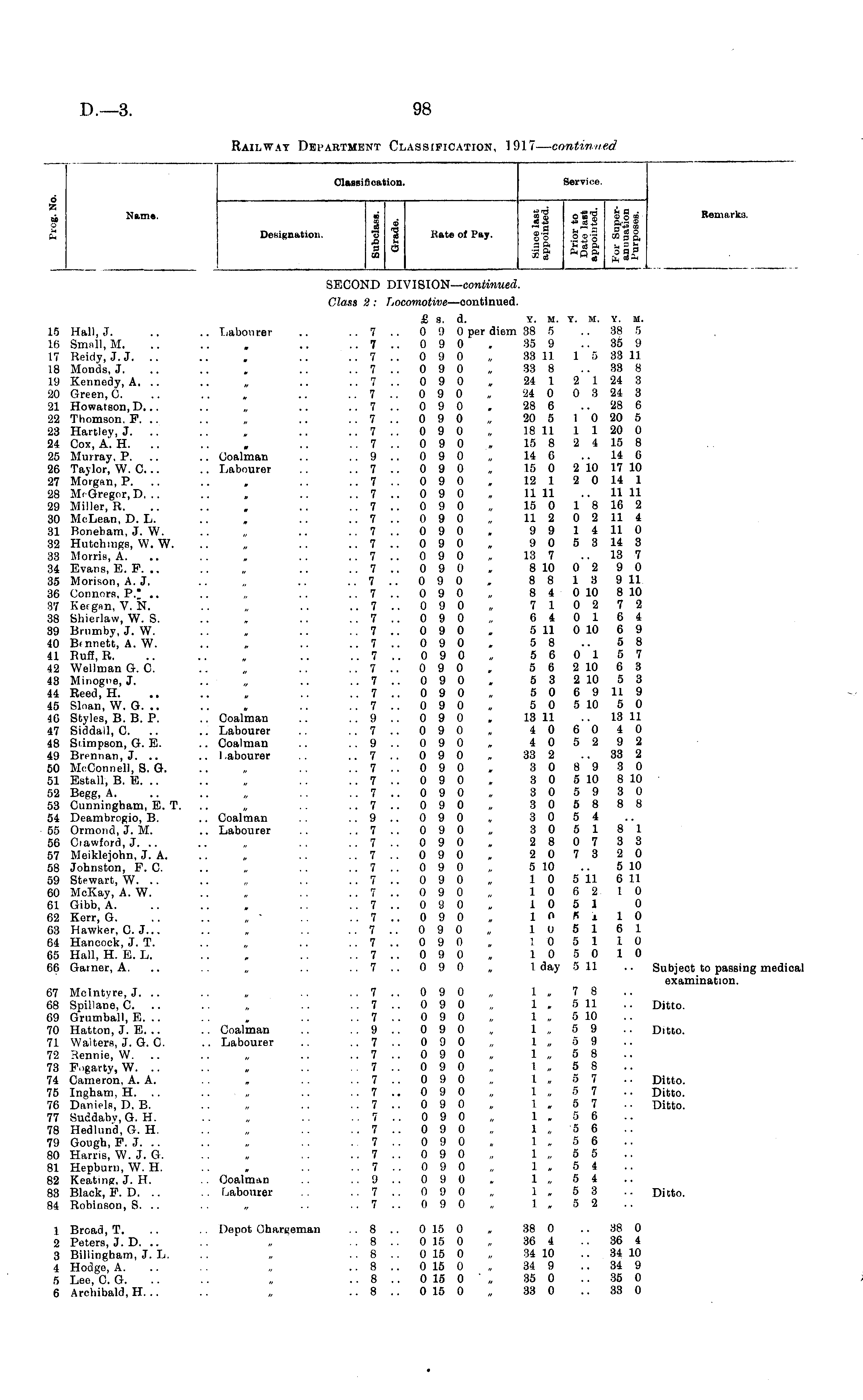 Classification. Service. Name. p 6 'A p c Name. Designation. « S'goS'gSgi Remarks. ■3 « Kate of Pay. «■§ g „ -3 SS° 35S3l| ° S'S i* a - S.2S CO 3 a III De»ignation. 9 1 Kate of Pay. WHLKDUiVlUll. i s il H ill SECOND DIVISION— continued. Class 2 : T,ocomotive —oontinued. 15 Hall, J. 16 Small, M. 17 Reidy, J.J. .. 18 Monds, J. 19 Kennedy, A. .. 20 Green, 0. 21 Howat6on,D... 22 Thomson. P. .. 23 Hartley, J. 24 Cox, A. H. 25 Murray, P. 26 Taylor, W. C... 27 Morgan, P. 28 McGregor,D. .. 29 Miller, R. 30 McLean, D. L. 31 Konebam, J. W. 32 Hutchmgs, W. W. 33 Morris, A. Si Evans, E. P. .. 35 Morison, A. J. 36 Connors, P.; .. 37 Kefgnn, V. N. 38 Shierlaw, W. S. 39 Brumby, J. W. 40 Bfnnett, A. W. 41 Ruff, R. 42 Weilman G. 0. 43 Minogne, J. 44 Reed, H. 45 Sloan, W. G. .. 46 Styles, B. B. P. 47 Siddall, 0. 48 Stimpson, G. E. 49 Brennan, J. .. 50 McConnell, 8. G. 51 Estall, B. E. .. 52 Begg, A. 53 Cunningham, E. T. 54 Deambrogio, B. 55 Ormond, J. M. 56 Crawford, J. .. 57 Meiklejohn, J. A. 58 Johnston, P. C. 59 Stewart, W. .. 60 McKay, A. W. 61 Gibb, A. 62 Kerr, G. 63 Hawker, C. J... 64 Hancock, J. T. 65 Hall, H. E. L. 66 Garner, A. .. Labourer .. Coalman .. Labourer .. Coalman .. Labourer .. Coalman .. I abourer .. Coalman .. Labourer £ s. d. Y. m. Y. m. y. m. .. 7 .. 0 9 0 per diem 38 5 .. 38 5 .. 7 .. 0 9 0. 35 9 .. 35 9 .. 7 .. 0 9 0 „ 33 11 1 5 33 11 .. 7 .. 0 9 0 „ 33 8 .. 33 8 .. 7 .. 0 9 0 » 24 1 2 1 24 3 .. 7 .. 0 9 0 „ 24 0 0 3 24 3 .. 7 .. 0 9 0 . 28 6 .. 28 6 .. 7 .. 0 9 0 „ 20 5 1 0 20 5 .. 7 .. 0 9 0 „ 18 11 1 1 20 0 ..7.. 090 » 15 8 24 15 8 9 .. 0 9 0 „ 14 6 .. 14 6 .. 7 .. 0 9 0 „ 15 0 2 10 17 10 7.. 090 , 12 1 20 14 1 .. 7 .. 0 9 0 . 11 11 .. 11 11 .. 7 .. 0 9 0 , 15 0 1 8 16 2 .. 7 .. 0 9 0 „ 11 2 0 2 11 i 7.. 090 » 99 14 11 0 ..7.. 090 „ 90 53 14 3 .. 7 .. 0 9 0 , 13 7 .. 13 7 7.. 090 . 8 10 02 90 ..7.. 090 , 88 13 9 11 .. 7 .. 0 9 0 „ 8 4 0 10 8 10 ..7.. 090 „ 71 02 72 ..7.. 090 „ 64 01 64 ..7.. 090 „ 5 11 010 69 .. 7 .. 0 9 0 . 5 8 .. 5 8 . 7.. 090 „ 560157 ..7.. 090 . 56 2 10 63 ..7.. 090 . 53 2 10 53 7.. 090 „ 50 69 11 9 ..7.. 090 „ 50 5 10 50 .. 9 .. 0 9 0 . 13 11 .. 13 11 ..7.. 090 „ 40 60 40 ..9.. 090 , 40 52 92 .. 7 .. 0 9 0 „ 33 2 .. 33 2 .. 7 .. 090 , 30 89 3 0 ..7.. 090 » 30 5 10 8 10 ..7.. 090 „ 305930 ..7.. 090 , 305888 ..9.. 090 , 30 54 ..7.. 090 » 305181 ..7.. 090 „ 280733 .. 7 .. 090 , 20 73 20 .. 7 .. 0 9 0 „ 5 10 .. 5 10 .. 7 .. 0 9 0 „ 10 5 11 6 11 .. 7 .. 0 9 0 „ 10 62 10 ..7.. 090 , 1051 0 ..7.. 090 , 10 Hi 10 7 .. 0 9 0 „ 10 5 16 1 ..7.. 090 „ 105110 .. 7 .. 0 9 0 „ 10 5 0 10 .. 7 .. 0 9 0 „ 1 day 5 11 .. Subject to passing medical examination. 67 Mclntyre, J. .. 68 Spiliane, C. .. 69 Grumball, E. .. 70 Hatton, J. E. .. 71 Walters, J. G. C. 72 Hennie, W. 73 F.igarty, W. .. 74 Cameron, A. A. 75 Ingham, H. 76 Daniels, D. B. 77 Suddaby, G. H. 78 Hedlund, G. H. 79 Gough, P. J. 80 Harris, W. J. G. 81 Hepburn, W. H. 82 Keating, J. H. 83 Black, P. D. .. 84 Robinson, S. .. .. Coalman .. Labourer .. Coalman . . Labourer . . 7 .. 0 9 0 „ 1 „ 7 8 .. 7 .. 0 9 0 „ 1 . 5 11 .. Ditto. .. 7 .. 0 9 0 „ 1 „ 5 10 . . 9 .. 0 9 0 „ 1 „ 5 9 .. Ditto. .. 7 .. 0 9 0 „ 1 „ 5 9 .. 7 .. 0 9 0 „ 1 „ 5 8 ,. 7 .. 0 9 0 , 1 „ 5 8 .. 7 .. 0 9 0 „ 1 » 5 7 .. Ditto. .. 7 .. 0 9 0 „ 1 „ 5 7 .. Ditto. .. 7 .. 0 9 0 „ 1 , 5 7 .. Ditto. .. 7 .. 0 9 0 „ 1 „ 5 6 .. 7 .. 0 9 0 „ 1 „ 5 6 . 7.. 090 , 1,5 6 .. 7 .. 0 9 0 „ 1 „ 5 5 . . 7 .. 0 9 0 „ 1 » 5 4 .. 9 .. 0 9 0 . 1 , 5 4 .. 7 .. 0 9 0 „ 1 , 5 3 .. Ditto. .. 7 .. 0 9 0 „ 1 , 5 2 1 Broad, T. 2 Peters, J. D. .. 3 Billingham, J. L. 4 Hodge, A. 5 Lee, C. G. 6 Archibald, H. .. .. Depot OharKeman . . 8 .. 0 15 0 , 38 0 .. 38 0 .. 8 .. 0 15 0 „ 36 4 .. 36 4 .. 8 .. 0 15 0 , 34 10 .. 34 10 .. 8 .. 0 15 0 „ 34 9 .. 34 9 .. 8 .. 0 15 0 ' „ 35 0 .. 35 0 .. 8 .. 0 15 0 „ 33 0 .. 33 0