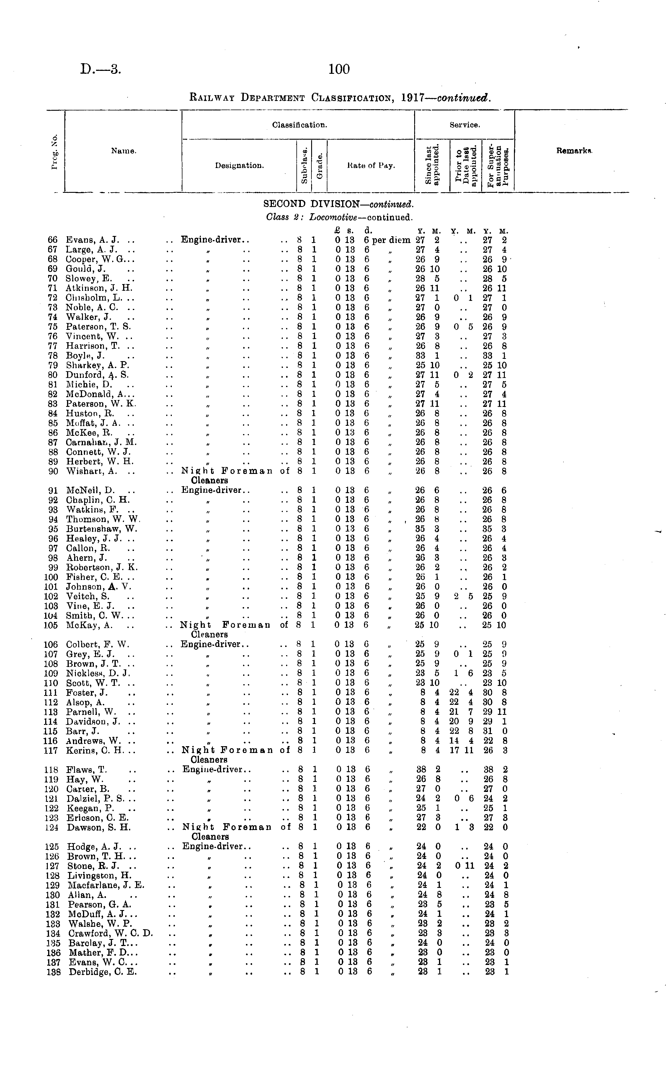 Classi cation. Service. d CD Name. Designation. DO I £ Kato of Pay. si sit if ill it OS? Remarks. SECOND DIVISION— continued. Class 2: Locomotive —continued. 66 Evans, A. J. 67 Large, A. J. 68 Cooper, W.G... 69 Gould, J. 70 Slowey, K. 71 Atkinson, J. H. 72 Olnsbolm, L. .. 73 Noble, A. 0. .. 74 Walker, J. 75 Paterson, T. S. 76 Vincent, W. .. 77 Harrison, T. .. 78 BoylH, J. 79 Sharkey, A. P. 80 Dunford, A. S. 81 Miohie, D. 82 McDonald, A... 83 PatersoD, W. K. 84 Huston, R. .. 85 Mnftat, J. A. .. 86 McKee, R. 87 Carnahati, J. M. 88 Connett, W. J. 89 Herbert, W. H. 90 Wishan, A. .. 91 McNeil, D. .. 92 Chaplin, C. H. 93 Watkins, P. .. 94 Thomson, W. W. 95 Burtanshaw, W. 96 Healey, J. J. 97 Gallon, R. 98 Ahern, J. 99 Robertson, J. K. 100 Fisher, C. B. 101 Johnson, A. V. 102 Veitch, S. 103 Vine, B. J. .. 104 Smith, C. W. .. 105 MoKay, A. .. 106 Colbert, P. W. 107 Grey, E. J. .. 108 Brown, J. T. 109 NicklesH, D. J. 110 Scott, W. T. .. 111 Poster, J. 112 Alsop, A. 113 Parnell, W. .. 114 Davidson, J. .. 115 Barr, J. 116 Andrews, W. .. 117 Kerins, C. H. .. US Flaws, T. 119 Hay, W. 120 Carter, B. 12). Dalziel, P. S. .. 122 Keegan, P. 123 Bricson, C. E. 1.24 Dawson, S. H. 125 Hodge, A. J. 126 Brown, T. H. .. J 27 Stone, R. J. .. 1.28 Livingston, H. 129 Macfarlane, J. E. 130 Allan, A. 131 Pearson, G. A. 132 McDuff, A. J. .. 133 Walshe, W. P. 134 Crawford, W. C. D. 135 Barclay, J. T... 136 Mather, P. D... 137 Evans, W. C. .. 138 Derbidge, C. E. £ s. d. y. m. Y. m. y. m. .. Engine-driver.. ..8 1 0 13 6 per diem 27 2 .. 27 2 ..81 0 13 6 „ 27 4 .. 27 4 ..81 0 18 6 „ 26 9 26 9 ■ ..81 0 13 6 „ 26 10 26 10 ..81 0 13 6 , 28 5 .. 28 5 ..8 1 0 13 6 „ 26 11 .. 26 11 .,8 1 0 13 6 „ 27 1 0 1 27 1 ..81 0 13 6 „ 27 0 27 0 ..81 0136 „ 26 9 26 9 ..81 0 13 6 „ 26 9 0 5 26 9 ..81 0 13 6 „ 27 3 27 3 ..81 0 13 6 „ 26 8 26 8 ..8 1 0 13 6 „ 33 1 33 1 ..81 0 13 6 „ 25 10 25 10 ..8 1 0 13 6 „ 27 11 0 2 27 11 ..8 1 0 13 6 . 27 5 .. 27 5 ..8 1 0 13 6 „ 27 4 27 4 ..81 0 13 6 „ 27 11 .. 27 11 ..81 0 13 6 „ 26 8 26 8 ..8 1 0 13 6 „ 26 8 26 8 ..81 0 13 6 „ 26 8 26 8 ..81 0 13 6 „ 26 8 26 8 ..81 0 13 6 „ 26 8 .. 26 8 ..81 0136 „ 26 8 26 8 .. Night Foreman of 8 1 0 13 6 „ 26 8 26 8 Cleaners .. Engine-driver.. ..8 1 0 13 6 „ 26 6 .. 26 6 ..81 0 13 6 „ 26 8 26 8 ..8 1 0 13 6 „ 26 8 26 8 ..81 0 13 6 „ , 26 8 26 8 ..81 0136 „ 35 3 35 3 ..81 0 13 6 „ 26 4 26 4 ..81 0 13 6 „ 26 4 .. 26 4 ..81 0 13 6 „ 26 3 26 3 ..81 0 13 6 „ 26 2 26 2 ..81 0 13 6 „ 26 1 26 1 ..81 0 13 6 „ 26 0 26 0 ..8 1 0 13 6 „ 25 9 2 5 25 9 ..81 0 13 6 , 26 0 26 0 ..81 0 13 6 „ 26 0 .. 26 0 .. Night Foreman of 8 1 0 13 6 „ 25 10 .. 25 10 Cleaners .. Engine-driver.. ..8 1 0 13 0 „ 25 9 .. 25 9 ..81 0 13 6 „ 25 9 0 1 25 0 ..81 0 13 6 , 25 9 25 9 ..8 1 0 13 6 „ 23 5 1 6 23 5 ..81 0 13 6 „ 23 10 .. 23 10 ..81 0 13 6 „ 8 4 22 4 30 8 ..81 0 13 6 „ 8 4 22 4 30 8 ..81 013 6 , 8 4 21 7 29 11 ..8 1 0 13 6 „ 8 4 20 9 29 1 ..8 1 0 13 6 „ 8 4 22 8 31 0 ..8 1 0 13 6 „ 8 4 14 4 22 8 .. Night Foreman of 8 1 0 13 6 „ 8 4 17 11 26 3 Cleaners .. Engine-driver.. ..8 1 0 13 6 „ 38 2 .. 38 2 ..8 1 0 13 6 „ 26 8 26 8 ..8 1 0 13 6 „ 27 0 27 0 ..81. 0 13 6 „ 24 2 0 6 24 2 ..8 1 0 13 6 „ 25 1 25 1 ..8 1 0 13 6 „ 27 3 27 3 .. Night Foreman of 8 1 0 13 6 „ 22 0 1 3 22 0 Cleaners .. Engine-driver.. ..8 1 0 13 6 „ 24 0 .. 24 0 ..81 0 13 6 „ 24 0 24 0 ..81 013 6 , 24 2 0 11 24 2 ..8 1 0 13 6 „ 24 0 .. 24 0 ..8 1 0 13 6 , 24 1 24 1 ..81 0 13 6 „ 24 8 .. 24 8 ..8 1 0 13 6 „ 23 5 23 5 ..8 1 0 13 6 , 24 1 24 1 -.81 0136 „ 232 23 2 ..8 1 0 13 6 , 23 3 .. 23 3 ..8 1 0 13 6 „ 24 0 24 0 ..81 0 13 6 , 23 0 23 0 ..81 0 13 6 „ 23 1 .. 23 1 ..8 1 0 13 6 , 23 1 .. 23 1