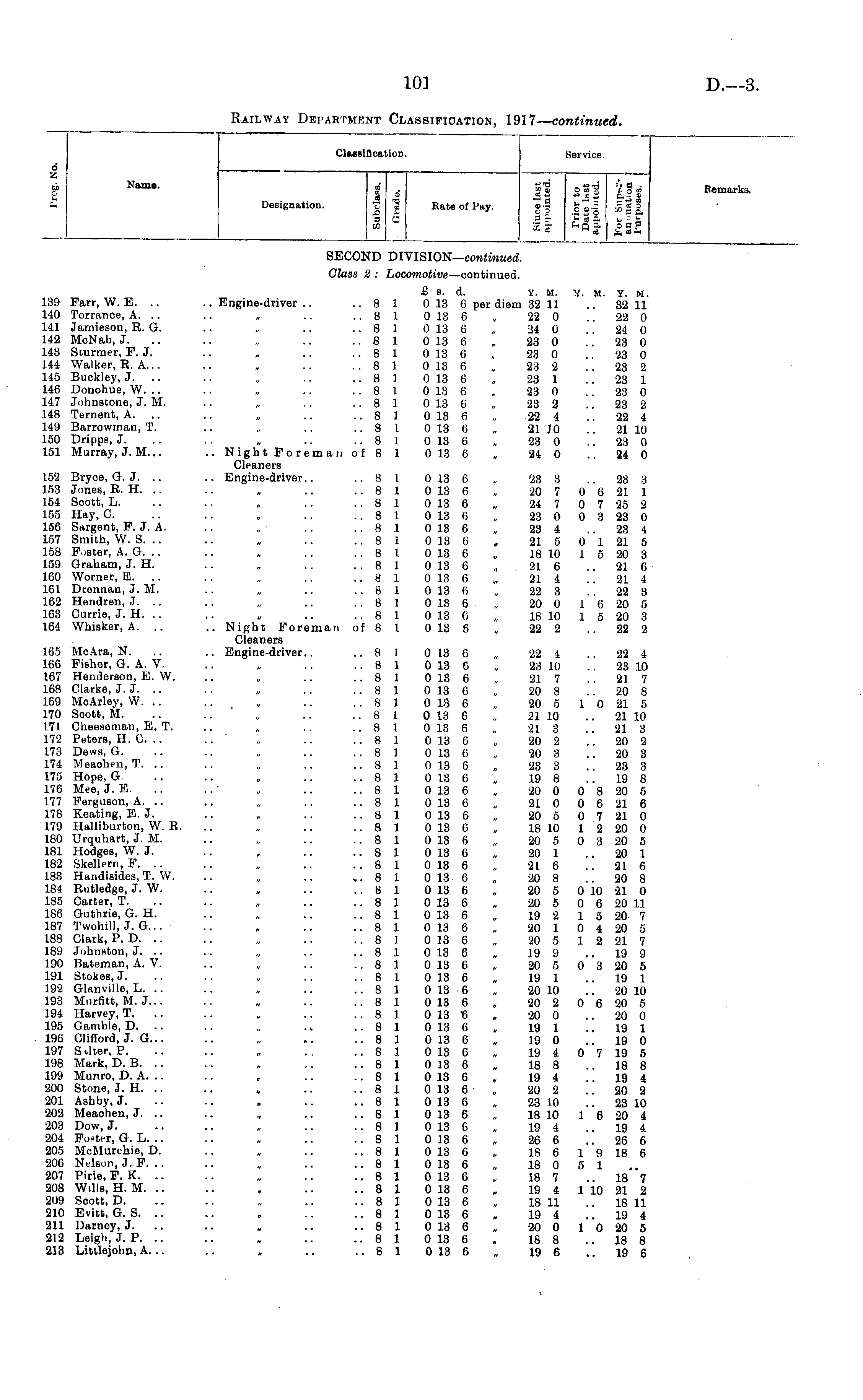 Classiflcation. Service. 6 i Name. i £ a CO a> 5 Kate of Pay. Is stt &N §'I .2 25 M = | 5-z Remark:). Designation. SECOND DIVISION— continued. Class 2 : Locomotive —continued. 139 Parr, W. E. 140 Torrance, A. .. 141 Jamieson, R. G. 142 MoNab, J. 143 Sturmer, P. J. 144 Walker, R. A... 145 Buckley, J. .. 146 Donohue, W. .. 147 Johnetone, J. M. 148 Ternent, A. .. 149 Barrowrnan, T. 150 Dripps, J. 151 Murray, J. M... 152 Bryoe, G. J. 153 Jones, R. H. 154 Scott, L. 155 Hay, C. 156 Sargent, P. J. A. 157 Smith, W. S. .. 158 Poster, A. G. .. 159 Graham, J. H. 160 Worner, E. .. 161 Drennan, J. M. 162 Hendren, J. .. 163 Ourrie, J. H. 164 Whisker, A. .. 165 McAra, N. 166 Fisher, G. A. V. 167 Henderson, E. W. 168 Clarke, J.J. .. 169 MoArley, W. .. 170 Soott, M. 171 Oheeseman, E. T. 172 Peters, H. 0. .. 173 Dews, G. 174 Meaohen, T. .. 175 Hope, G. 176 Mee, J. E. 177 Ferguson, A. .. 178 Keating, E. J. 179 Halliburton, W. R. 180 Urquhart, J. M. 181 Hodges, W. J. 182 Skellern.F. .. 183 Handisides, T. W. 184 Rutledge, J. W. 185 Carter, T. 186 Guthrie, G. H. 187 Twohill, J. G... 188 Clark, P. D. 189 Johnson, J. .. 190 Bateman, A. V. 191 Stokes, J. 192 Glanville, L. .. 193 MnrfUt, M. J... 194 Harvey, T. 195 Gamble, D. .. 196 Clifford, J. G... 197 SUter, P. 198 Mark, D. B. 199 Munro, D. A. .. 200 Stone, J. H. .. 201 Ashby, J. 202 Meaohen, J. .. 203 Dow, J. 204 Poster, G. L. .. 205 McMurehie, D. 206 Nelson, J. F. 207 Pirie, P. K. 208 Wills, H. M. .. 209 Scott, D. 210 Evitt, G. S. .. 211 Darney, J. 212 Leigh, J. P. .. 213 Littlejohn, A... £ s. d. y. m. .. Engine-driver .. ..81 0 13 6 per diem 32 11 ..8 1 0 13 6 „ 22 0 ..81 0 13 6 „ 24 0 ..81 0 13 6 . 23 0 ..81 0 13 6 , 23 0 ..8 1 0 13 6 „ 23 2 ..81 0136 „ 23 1 ..81 0 13 6 » 23 0 ..81 0 18 6 „ 23 2 ..81 0136 „ 22 4 ..8 1 0 13 6 „ 21 JO ..81 0136 „ 23 0 .. Nigbt Foreman of 8 1 0 13 6 „ 24 0 Cleaners .. Engine-driver.. ..8 1 0 13 6 „ 'A3 8 ..81 0 13 6 „ -20 7 ..81 0 13 6 „ 24 7 ..81 0 13 6 „ 23 0 ..81 0 13 6 , 23 4 ..81 0 13 (J , 21 5 ..81 0 13 t> .. 18 10 ..81 0 13 6 „ 21 6 ..8 1 0 13 6 „ 21 4 ..81 0 13 l> „ 22 3 ..81 0 13 6 „ 20 0 ..8 1 0 13 (; „ 18 10 .. Night Foreman of 8 1 0 13 f> „ 22 2 Cleaners .. Engine-driver.. ..8 1 0 13 6 „ 22 4 ..8 1 0 13 6 „ 23 10 ..8 1 0 13 6 „ 21 7 ..81 0 13 6 „ 20 8 ... . •. ..81 0 IS 6 „ 20 5 ..81 0 13 6 „ 21 10 ..81 0 13 6 , 21 3 ■ • ' ,, .. ..81 0 13 6 „ 20 2 ..81 0 13 6 „ 20 3 ..81 0 13 6 „ 23 3 ..81 0 13 6 „ 19 8 ..81 0 13 6 „ 20 0 ..8 1 0 13 6 „ 21 0 ..81 0 13 6 „ 20 5 ..81 0 13 6 , 18 10 -.81 0 13 6 „ 20 5 ..81 0 13 6 „ 20 1 ..8 1 0 13 6 „ 21 6 ,.8 1 0 13 6 „ 20 8 ..8 1 0 13 6 „ 20 5 ..81 0 13 6 „ 20 5 ..81 0 13 6 „ 19 2 ..81 0 13 6 „ 20 1 ..81 0 13 6 „ 20 5 ..81 0 13 6 „ 19 9 ..81 0 13 6 , 20 5 .. 6 1 .0 18 6 „ 19 1 ..81 0 13 6 „ 20 10 ..81 0 13 6 , 20 2 ..81 013 S „ 20 0 ..81 0136 . 19 1 ..81 0136 „ 19 0 ..81 0 13 0 „ 19 4 ..8 1 0 13 0 „ 18 8 ..81 0 13 6 „ 19 4 ..81 013 6 , 20 2 ..81 0 13 6 „ 23 10 ..81 0 13 6 „ 18 10 ..81 0 13 6 „ 19 4 ..8 1 0 13 6 „ 26 6 ..8 1 0 13 6 „ 18 6 ..8 1 0 13 6 „ 18 0 ..8 1 0 13 6 „ 18 7 ..81 0 13 6 „ 19 4 ..8 1 0 13 6 „ 18 11 ..81 0 13 6 . 19 4 ..8 1 0 13 6 , 20 0 ..8 1 0 13 6 . 18 8 ..81 0136 „ 19 6 V. M. Y. M. .. 32 11 .. 22 0 24 0 .. 23 0 23 0 .. 23 2 .. 23 1 .. 23 0 .. 23 2 22 4 21 10 23 0 .. 24 0 .. 23 3 0 6 21 1 0 7 25 2 0 3 23 0 .. 23 4 0 1 21 5 1 5 20 3 .. 21 6 21 4 22 3 1 6 20 5 1 5 20 3 22 2 .. 22 4 23 10 21 7 .. 20 8 I 0 21 5 .. 21 10 .. 213 .. 20 2 20 3 .. 23 3 .. 19 8 0 8 20 5 0 6 21 6 0 7 21 0 1 2 20 0 0 8 20 5 .. 20 1 21 6 20 8 0 10 21 0 0 6 20 11 1 5 20 7 0 4 20 5 1 2 21 7 19 9 0 3 20 5 .. 19 1 20 10 0 6 20 5 20 0 19 1 .. 19 0 0 7 19 5 .. 18 8 .. 19 4 .. 20 2 .. 23 10 1 6 20 4 .. 19 4 .. 26 6 1 9 18 6 5 1 .. 18 7 1 10 21 2 .. 18 11 .. 19 4 1 0 20 5 .. 18 8 .. 19 6