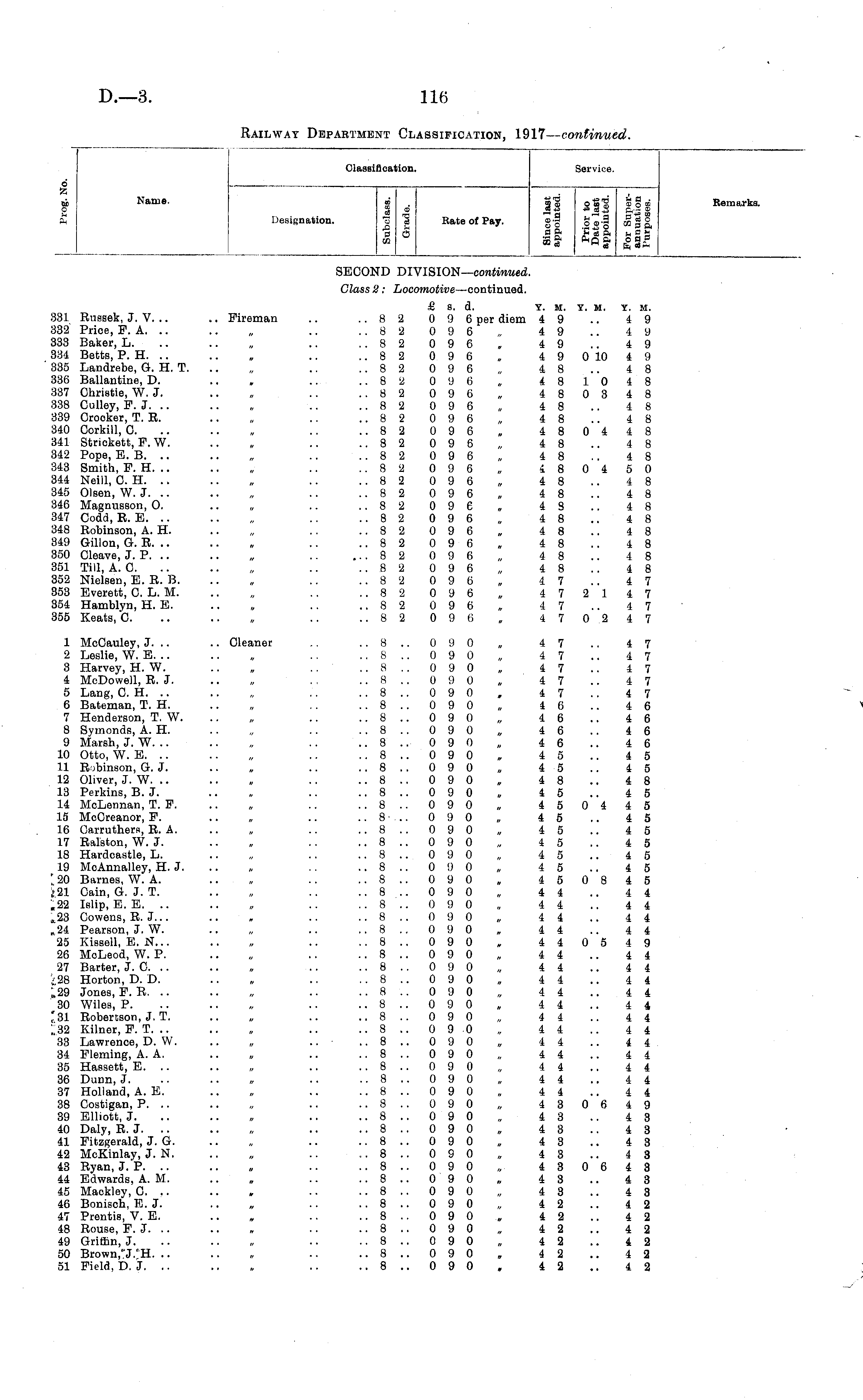 Classil I cation. Service. 6 % ab p Name. Designation. CO s 3 00 f. of. Sgg So 2-3 3 aft a $ & *%% _5& Phq& oop m _ *—' o_ __j «-£h Rein arks. _ _5 Hate of Pay. SECOND DIVISION— continued. Class 2: Locomotive —continued. 331 Russek, J. V. .. 332 Price, F. A. 333 Baker, L. 334 Betts, P. H. 335 Landrebe, G. H. T. 336 Ballantine, D. 337 Christie, W. J. 338 Culley, F. J. 339 Crocker, T. R. 340 Go-kill, 0. 341 Striokett, F. W. 342 Pope, E. B. .. 343 Smith, F. H. .. 344 Neill, 0. H. 345 Olsen, W. J. 346 Magnusson, 0. 347 Codd, R. E. 348 Robinson, A. H. 349 Gillon, G. R. 350 Cleave, J. P. 351 Till, A. 0. 352 Nielsen, E. R. B. 353 Everett, 0. L. M. 354 Hamblyn, H. E. 355 Keats, 0. .. Fireman £ s. d. Y. M. Y. M. ..82 0 9 6 per diem 49 ..82 096 „ 49 ..82 096 . 49 ..8 2 0 9 6 „ 4 9 0 10 ..8 2 0 9 6 „ 4 8 ..8 2 0 9 6 „ 4 8 10 ..82 09 6 „ 48 03 ..82 096 „ 48 ..8 2 0 9 6 „ 4 8 ..82 096 „ 48 04 ..8 2 0 9 6 „ 4 8 ..82 096 „ 48 ..82 096 „ 48 04 ..82 096 „ 48 ..82 096 „ 48 ..8 2 0 9 6 „ 4 8 ..8 2 0 9 6 „ 4 8 -.8 2 0 9 6 „ 4 8 ..82 096 „ 48 ... 8 2 096 „ 48 ..8 2 0 9 6 „ 4 8 ..8 2 096 „ 47 ..8 2 0 9 6 „ 4 7 2 1 ..82 096 „ 47 ..82 09 6 „ 47 02 Y. M. 4 9 4 9 4 9 4 9 4 8 4 8 4 8 4 8 4 8 4 8 4 8 4 8 5 0 4 8 4 8 4 8 4 8 4 8 4 8 4 8 4 8 4 7 4 7 4 7 4 7 1 McCauley, J. .. 2 Leslie, W. E. .. 3 Harvey, H. W. 4 McDowell, R. J. 5 Lang, 0. H. 6 Bateman, T. H. 7 Henderson, T. W. 8 Symonds, A. H. 9 Mitrsh, J. W. .. 10 Otto, W. E. 11 Robinson, G. J. 12 Oliver, J. W. .. 13 Perkins, B. J. 14 McLennan, T. F. 15 MoCreanor, F. 16 Carruthers, R. A. 17 Ralston, W. J. 18 Hardcastle, L. 19 McAnnalley, H. J. [ 20 Barnes, W. A. .►21 Cain, G. J. T. .22 Islip, E. E. .. »23 Cowens, R. J... .24 Pearson, J. W. 25 Kissell, E. N... 26 McLeod, W. P. 27 Barter, J. 0. .. i28 Horton, D. D. :29 Jones, F. R. .. 30 Wiles, P. Robertson, J. T. ;,32 Kilner, F. T. .. 33 Lawrence, D. W. 34 Fleming, A. A. 35 Hassett, E. .. 36 Dunn, J. 37 Holland, A. E. 38 Costigan, P. .. 39 Elliott, J. 40 Daly, R. J. 41 Fitzgerald, J. G. 42 MeKinlay, J. N. 43 Ryan, J. P. 44 Edwards, A. M. 45 Maokley, 0. .. 46 Bonisch, E. J. 47 Prentis, V. E. 48 Rouse, F. J. 49 Griffin, J. 50 Brown,"J.'H. .. 51 Field, D.J. .. .. Cleaner ..8.. 090 „ 47 .. 8 .. 0 9 0 „ 4 7 .. 8 .. 0 9 0 „ 4 7 .. 8 . . 0 0 0 „ 4 7 .. 8 .. 0 9 0 , 4 7 .. 8 .. 0 9 0 „ 4 6 ..8.. 090 „ 46 .. 8 .. 0 9 0 „ 4 6 .. 8 .. 0 9 0 „ 4 6 ..8.. 090 „ 45 .. 8 .. 0 9 0 „ 4 5 ..8.. 090 . 48 .. 8 .. 0 9 0 „ 4 5 .. 8 .. 0 9 0 „ 4 5 0 4 ..8.. 090 „ 45 .. 8 .. 0 9 0 „ 4 5 .. 8 .. 0 9 0 „ 4 5 .. 8 .. 0 9 0 „ 4 5 .. 8 .. 0 9 0 „ 4 5 .. 8 .. 0 9 0 „ 4 5 0 8 .. 8 .. 0 9 0 „ 4 4 .. 8 .. 0 9 0 „ 4 4 .. 8 .. 0 9 0 „ 4 4 ..8.. 090 . 44 .. 8 .. 09 0 , 44 05 ..8.. 090 „ 44 .. 8 .. 0 9 0 „ 4 4 .. 8 .. 0 9 0 „ 4 4 .. 8 .. 0 9 0 „ 4 4 ..8.. 090 . 44 ..8.. 090 „ 44 .. 8 .. 0 9 0 „ 4 4 .. 8 .. 0 9 0 „ 4 4 .. 8 .. 0 9 0 „ 4 4 .. 8 .. 0 9 0 „ 4 4 ..8.. 090 „ 44 .. 8 .. 0 9 0 „ 4 4 .. 8 .. 0 9 0 „ 4 3 0 6 ..8.. 090 „ 43 ..8.. 090 „ 43 .. 8 .. 0 9 0 „ 4 3 .. 8 .. 0 9 0 „ 4 3 ..8.. 090 „ 43 06 ..8.. 090 „ 43 .. 8 .. 0 9 0 „ 4 3 ..8.. 090 „ 42 .. 8 .. 0 9 0 „ 4 2 ..8.. 090 „ 42 ..8.. 090 „ 42 .. 8 .. 0 9 0 „ 4 2 .. 8 .. 0 9 0 . 4 2 4 7 4 7 4 7 4 7 4 7 4 6 4 6 4 6 4 6 4 5 4 5 4 8 4 5 4 5 4 5 4 5 4 5 4 5 4 5 4 5 4 4 4 4 4 4 4 4 4 9 4 4 4 4 4 4 4 4 4 4 4 4 4 4 4 4 4 4 4 4 4 4 4 4 4 9 4 3 4 3 4 3 4 3 4 3 4 3 4 3 4 2 4 2 4 2 4 2 4 2 4 2