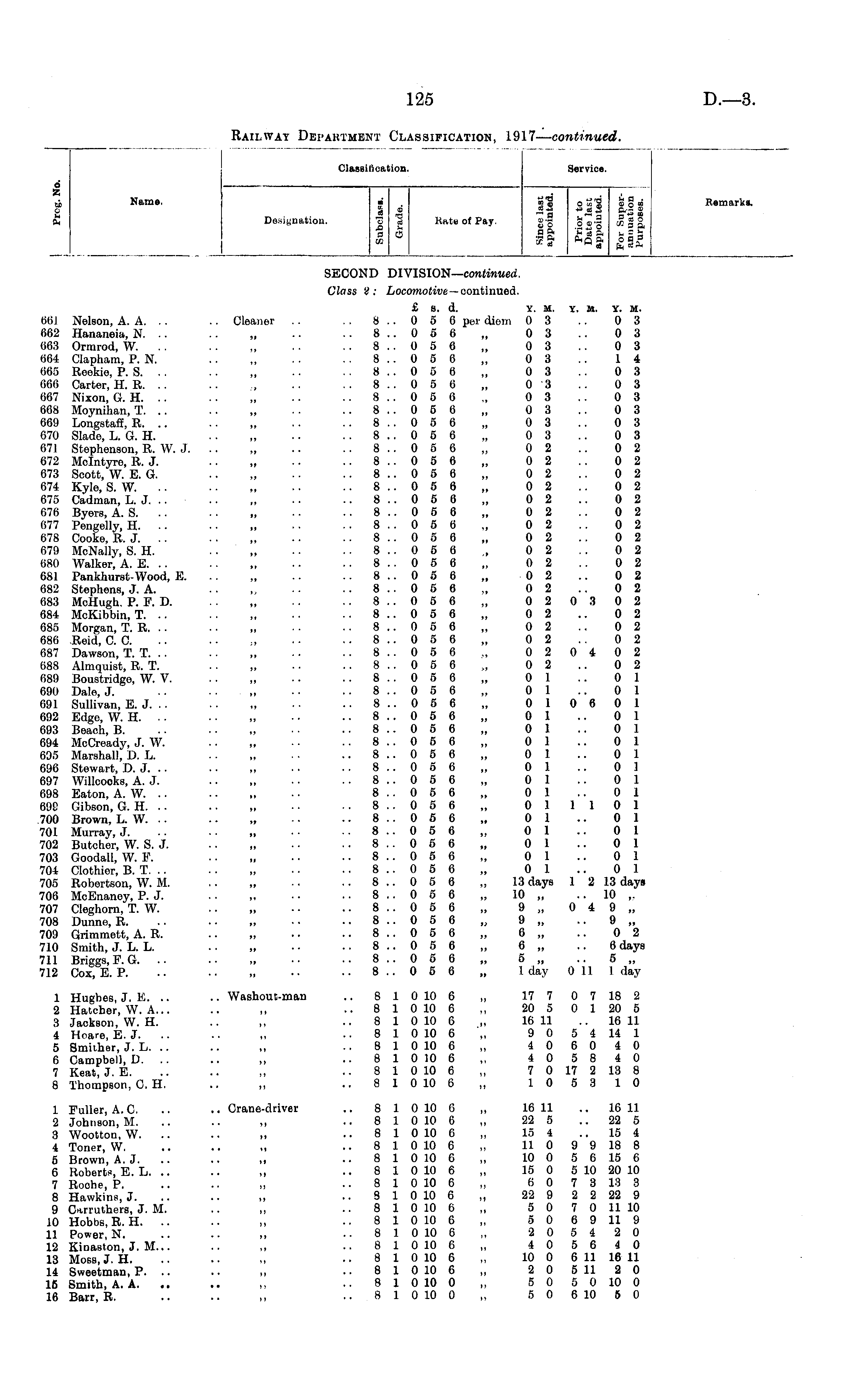 I ji Name. i £ 3* Classification. Service. • . •j'SoK'geo" Defoliation. Knt« of Pay. »•§ g o,.3 % g ° 1 e II 2|| HI Classification. ■ ■5 -a a as ■j. Kate of Pay. Service. u a ■ CO? En • * Remarks. Remark*. SECOND DIVISION— continued. Class 'i ; Locomotive — continued. 661 Nelson, A. A. 662 Hananeia, N. .. 663 Ormrod, W. 664 Clapham, P. N. 665 Reekie, P. S. 666 Carter, H. R. 667 Nixon, G. H. 668 Moynihan, T. .. 669 Longstaff, R. .. 670 Slade, L. G. H. 671 Stephenson, R. W. J. 672 Mclntyre, R. J. 673 Scott, W. E. G. 674 Kyle, S. W. 675 Cadtnan, L. J. 676 Byers, A. S. 677 Pengelly, H. • - 678 Cooke, R. J. . . 679 McNally, S. H. 680 Walker, A. E. 681 Pankhurst-Wood, E. 682 Stephens, J. A. 683 MoHugh. P. F. D. 684 McKibbin, T. .. 685 Morgan, T. R. 686 Reid, C. C. 687 Dawson, T. T. 688 Almquist, R. T. 689 Boustridgo, W. V. 690 Dale, J. 691 Sullivan, E. J. . . 692 Edge, W. H. 683 Beach, B. 694 McCready, J. W. 695 Marshall, D. h. 696 Stewart, D. J. 697 Willcooks, A. J. 698 Eaton, A. W. .. 69G Gibson, G. H. 700 Brown, L. W. 701 Murray, J. 702 Butchor, W. S. J. 703 Goodall, W. F. 704 Clothier, B. T. 705 Robertson, W. M. 706 McEnanoy, P. J. 707 Cleghorn, T. W. 708 Dunne, R. 709 Grimmett, A. R. 710 Smith, J. L. L. 711 Briggs, P. G. .. 712 Cox, E. P. £ s. d. y. M. y. M. Y. M. . . Cleaner . . .. 8 .. 0 5 6 per diom 0 3 .. 0 3 .. 8..056 „ 03 .. 03 .. 8..056 „ 03 .. 03 .. 8..056 „ 03 .. 14 .. 8..056 „ 03 .. 03 .. 8 .. 0 5 t> „ 03 .. 03 .. 8..056 „ 03 .. 03 .. 8..056 „ 03 .. 03 .. 8..056 „ 03 .. 03 .. 8..056 „ 03 .. 03 .. 8..056 „ 02 .. 02 .. 8..056 „ 02 .. 02 .. 8..056 „ 02 .. 02 .. 8..056 „ 02 .. 02 .. 8..056 „ 02 .. 02 .. 8..056 „ 02 .. 02 .. 8..056 ., 02 .. 02 .. 8..056 „ 02 .. 02 .. 8..056 , 02 .. 02 .. 8..056 „ 02 .. 02 .. 8..056 „ 02 .. 02 .. 8..056 „ 02 .. 02 .. 8..056 „ 020 3 02 .. 8..056 „ 02 .. 02 .. 8..056 „ 02 .. 02 .. 8..056 „ 02 .. 02 .. 8..056 „ 020402 .. 8..056 , 02 .. 02 .. 8 .. 0 5 6 „ 0 1 .. 0 1 .. 8 .. 0 5 6 „ 0 1 .. 0 1 .. 8..056 „ 010601 .. 8 .. 0 5 6 „ 0 1 .. 0 1 .. 8 .. 0 5 6 „ 0 1 .. 0 1 .. 8..056 „ 01 .. 01 8 .. 0 5 6 „ 0 1 .. 0 1 .. 8 .. 0 5 6 „ 0 1 .. 0 1 .. 8 .. 0 5 6 „ 0 1 .. 0 1 8 .. 0 5 6 „ 0 1 .. 0 1 .. 8..056 „ 011101 .. 8 .. 0 5 6 „ 0 1 .. 0 1 .. 8..056 „ 01 .. 01 8 .. 0 5 6 „ 0 1 .. 0 1 .. 8..056 „ 01 .. 01 .. 8..056 „ 01 .. 01 .. 8 .. 0 5 6 „ 13 days 1 2 13 days .. 8 .. 0 5 6 „ 10 „ .. 10 ,. 8 .. 0 5 6 „ 9 „ 0 4 9,, 8 .. 0 5 6 „ 9 „ .. 9 „ .. 8 .. 0 5 6 „ 6 „ .. 0 2 „ .. .. 8 .. 0 5 6 „ 6 „ .. 6 days .. 8 .. 0 5 6 „ 5 „ .. 5 „ 8 .. 0 5 6 „ 1 day 0 11 I day 1 Hughes, J. E. .. 2 Hatcher, W. A... 3 Jackson, W. H. 4 Hoare, E. J. 5 Smiiher, J. L. .. 6 Campbell, D. .. 7 Keat, J. E. 8 Thompson, C. H. .. Washout-man .. 8 1 0 10 6 „ 17 7 0 7 18 2 .. 8 1 0 10 6 ,, 20 5 0 1 20 5 .. 8 1 0 10 6 „ 16 11 .. 16 11 .. 8 1 0 10 6 "„ 9 0 5 4 14 1 ..810 10 6,, 406040 ..810 10 6 ,, 405840 „ S 1 010 t „ 7 0 17 2 13 8 8 1 0 10 6 „ 10 5 3 10 1 Fuller, A. C. 2 Johnson, M. 3 WoottoQ, W. 4 Toner, W. 5 Brown, A.J. 6 Roberts, E. L. .. 7 Roohe, P. 8 Hawkins, J. 9 Carruthers, J. M. 10 Hobbs, R. H. 11 Power, N. 12 Kinaston, J. M... 13 Moss, J. H. 14 Sweetman, P. .. 16 Smith, A. A. .. 16 Barr, B. .. Crane-driver .. 8 1 0 10 G ,, 16 11 .. 16 11 8 1 0 10 6 ,, 22 5 .. 22 5 „ 8 1 0 10 6 „ 15 4 15 4 .. 8 1 0 10 6 „ 11 0 9 9 18 8 „ .. 8 1 0 10 6 „ 10 0 5 6 15 6 .. 8 1 0 10 6 „ 15 0 5 10 20 10 8 1 0 10 6 „ 6 0 7 3 13 3 .. 9 1 0 10 6 ,, 22 9 2 2 22 9 8 1 0 10 6 „ 5 0 7 0 11 10 ,, .. 8 1 0 10 6 „ S 0 6 9 11 9 8 10 10 6 „ 205420 ..810 10 6,, 405640 8 1 0 10 6 ,, 10 0 6 11 16 11 „ .. 8 1 0 10 6 „ 2 0 5 11 2 0 8 1 0 10 0 5 0 5 0 10 0 8 1 0 10 0 ,, 5 0 6 10 5 0