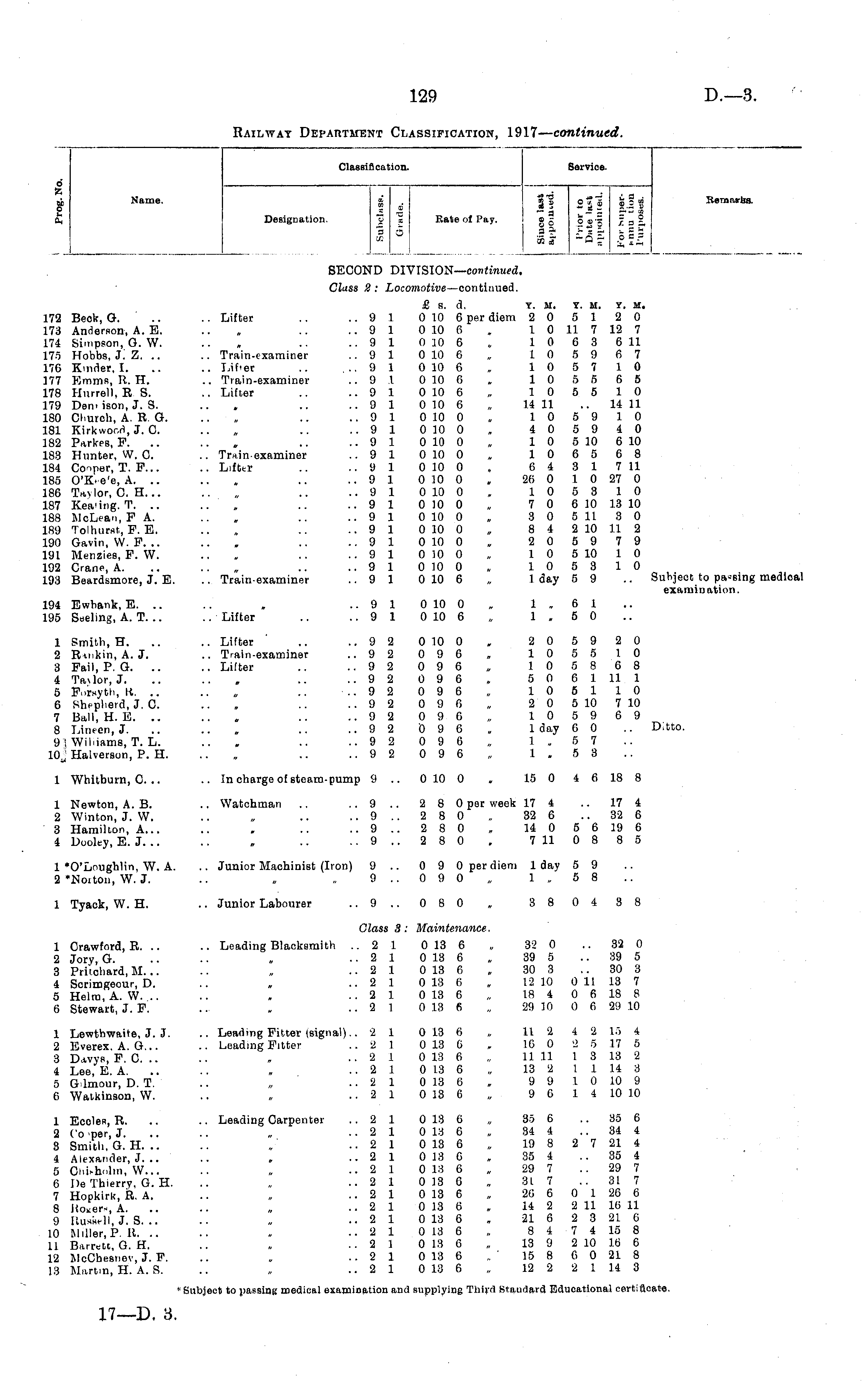 Classification. Service. £ £ Name. I'sSj'ie-ii Bemiurha. o< Designation. "S ; Kate of Pay. «j la , ? !p* Classification. Service. sfi Hi — ~ ~ o 2 5 '5 r. a z* — n — o - .- Hβ™ fur ha. SECOND DIVISION— continued. Class H : Locomotive—continued. £ a. d. Y. M. y. M. y. m. 172 Beok, G. .. .. Lifter .. ..91 0 10 6 per diem 20 51 20 173 Anderson, A. E. .. , .. ..9 1 0 10 6 , 1 0 11 7 12 7 174 Simpson, O. W. .. , .. ..9 1 0 10 6 » 1 0 G 3 6 11 175 Hobbs, J! Z. .. .. Train-examiner ..9 1 0 10 6 „ 10 5 9 6 7 176 Kinder, I. .. .. Lifier .. ..9 1 0 10 6 . 10 57 10 177 Emms, It. H. .. Train-examiner ..9 1 0 10 6 , 10 55 65 178 Hurrell, E. S. .. Lifter .. ..91 0 10 6 „ 1055 10 179 Deruison, J. S. .. . .. ..9 1 0 10 6 „ 14 11 ..14 11 180 Ourch, A. R. G. .. , .. ..91 0 10 0 , 105910 181 Kirkwocri, J. C. , .. .'. 9 1 0 10 0 4 0 5 9 4 0 182 Parkes, P. .. .. . .. ..9 1 0 10 0 , 1 0 5 10 6 10 183 Hunter, W. 0. .. Train examiner ..9 1 0 10 0 , 10 6 5 6 8 184 Cooper, T. F... .. Lifttr .. ..9 1 0 10 0 » 6 4 3 1 7 11 185 O'K.e'e, A. .. .. „ .. ..9 1 0 10 0 , 26 0 1 0 27 0 186 Tavlor, G. H... .. „ .. ..91 0 10 0 „ 105310 187 Kea'ing. T. .. ... .. ..9 1 0 10 0 „ 7 0 6 10 18 10 188 McLean, P A. .. . .. ..9 1 0 10 0 „ 3 0 5 11 3 0 L89 Tolhurst, F. E. .. , .. ..9 1 0 10 0 „ 8 4 2 10 11 2 190 Gavin, W. P... .. , .. ..91 0 10 0 , 2 05979 191 Menzies, F. W. .. . .. ..9 1 0 10 0 „ 1 0 5 10 1 0 192 Crane, A. .. .. „ .. ..91 0 10 0 , 105310 L93 Beardsmore, J. E. .. Train-examiner ..91 0 10 6 „ 1 day 5 9 .. Subject to parsing medical examination. L94 Ewbank, E. .. .. . .. 9 1 0 10 0 1.61.. L95 Seeling, A. T. .. .. Lifter .. ..91 0 10 6 „ 1.50 1 Smith, H. .. .. Lifter .. ..9 2 0 10 0 . 2 0 5 9 2 0 2 Ru.kin, A. J. .. Train-examiner ..9 2 0 9 6 , 10 5 5 10 3 Fail, P. G. .. .. Lifter .. ..9 2 0 9 6 , 10 5 8 6 8 4 Ta\lor, J. .. .. „ .. ..9 2 0 9 6 , 5 0 6 1 11 1 5 Fowy.th, K. .. .. „ .. ..9 2 0 9 6 „ 10 5 110 6 Shepherd, J. C. .. , .. ..9 2 0 9 0 „ 2 0 5 10 7 10 7 Ball, H. E. .. .. . .. ..9 2 0 9 6 „ 10 5 9 6 9 8 Lineen, J. .. .. . .. ..9 2 0 9 6 , 1 day 6 0 .. Ditto. 9 J Williams, T. L. .. . .. ..92 090 „ 1,57 10 ; Halverson, P. H. .. „ .. ..9 2 0 9 6 „ 1.58 1 Whitburn, C. .. .. In charge of steam-pump 9 .. 0 10 0 , 15 0 4 6 18 8 1 Newton, A. B. .. Watchman .. .. 9 .. 2 8 0 per week 17 4 .. 17 4 2 Winton, J. W. .. „ .. .. 9 .. 2 8 0 ,. 32 6 .. 32 6 3 Hamilton, A... .. . .. .. 9 .. 2 8 0 , 14 0 5 6 19 6 4 Dooley, E. J. .. .. . .. .. 9 .. 2 8 0 . 7 110 8 8 5 1 "O'Loughlin, W. A. .. Junior Machinist (Iron) 9 .. 0 9 0 per diem 1 day 5 9 2 •Hoitoii, W. J. .. . . 9 .. 0 9 0 , , 1.58.. 1 Tyack, W. H. .. Junior Labourer ..9.. 080 . 380438 Glass 3: Maintenance,. 1 Crawford, R. .. .. Leading Blacksmith ..2 1 0 13 6 „ 32 0 .. 32 0 2 Jory,G. .. .. , .. 2 1 0 18 6 39 5 .. 39 5 3 Priioliard, M. .. .. » ..2 1 0 13 6 , 30 3 .. 30 3 4 Scrimgeour, D. .. . .. 2 1 0 18 6 12 10 0 11 18 7 5 Helm, A. W... .. . .. 2 1 0 18 6 18 4 0 6 18 8 6 Stewart, J. F. ... . ..2 1 0 18 6 29 10 0 6 29 10 1 Lewthwaite, J. J. .. Leading Fitter (signal).. 2 1 0 1.3 6 „ 11 2 i 2 1") 4 2 Everex. A. G... .. Leading Fitter ..-21 0 13 6 . 16 0 2 5 17 5 8 Davys, P. C. .. .. . .. 2 1 0 18 6 11 11 1 3 13 2 4 Lee E A .. .. , .. 2 1 0 18 6 13 '2 1 1 14 3 5 Glmour, D. T. .. „ .. 2 1 0 18 6 9 9 1 .0 10 9 6 Watkinson, W. .. „ .. 2 1 0 18 6 9 6 1 4 10 10 1 EccleR, R. .. .. Leading Carpenter ..2 1 0 13 6 „ 85 6 .. 35 6 2 Co per, J. .. „ .. 2 1 0 IS 6 34 4 .. 34 4 3 Smith, G. H , .. 2 1 0 13 6 „ 19 8 2 7 21 4 4 Alexander, J... .. . .. 2 1 0 18 0 , 35 4 .. 35 4 5 Oi.Uh.ilin, VV „ ..2 1 0 13 6 „ 29 7 .. 29 7 6 He Thierry, G. H. .. „ .. 2 1 0 18 6 , . 31.7 31 7 7 Hopkirk, R. A. .. . .. 2 1 013 6 „ 2G 6 0 1 26 6 8 J<o,Ter-, A „ .. 2 1 0 13 6 . 14 2 2 11 16 11 9 RuR&ell J. S. .. .. . .. 2 1 0 18 6 21 6 2 3 21 6 10 Miller, P. K. .. .. . .. 2 1 0 13 6 „ 8 4 7 4 15 8 11 Barrett, G. H. .. „ ..2 1 0 13 6 „ 13 9 2 10 16 6 12 McChesney, J. F. .. . ..2 1 0 13 6 . " 15 8 6 0 21 8 13 Martin, H. A. S. .. „ .. 2 1 0 13 6 12 2 2 1 14 3 1 Subject to Massing medical examination and supplying Third Btaudard Educational certificate.