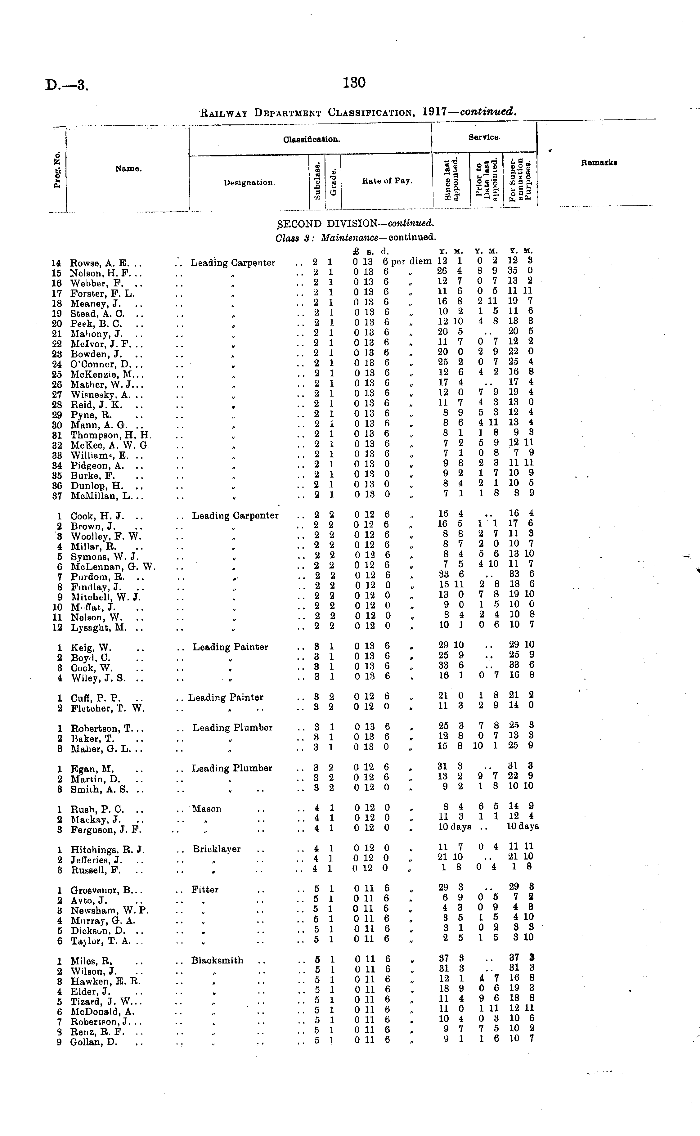 Classification. Service. _T I -r I _-_- . _-— — — 1 1 . z B ft 0 - . —i n —- 5 Name ' 3 l l], _j Designation. « *§ Rate of Pay. g3 .2 5*3 ao p & _ ° j It -fl. gSft Remarks SECOND DIVISION—cor-.'n__. C_ss 3: Jfaintenonce—continued. £ B. d. Y. M. Y. M. Y. M. 14 Rowse, A. E. .. .". Leading Carpenter ..2 1 0 13 6 per diem 12 1 0 2 12 3 15 Nelson, H. F „ ..21 0 13 6 . 26 4 8 9 35 0 16 Webber, F. .. .. , .. 2 1 0 13 6 „ 12 7 0 7 13 2 17 Forster, F. L. .. „ .. 2 1 0 13 6 „ 11 6 0 5 11 11 18 Meaney, J „ .. 2 1 0 13 6 „ 16 8 2 11 19 7 19 Stead, A. C „ .. 2 1 0 13 6 „ 10 2 1 5 11 6 20 Peek, B. C . .. 2 1 018 6 » 12 10 4 8 13 3 21 Mahony, J. .. .. „ .. 2 1 0 18 6 20 5 .. 20 5 22 Mclvor.J.F . .. 2 1 0 18 6 11 7 0 7 12 2 23 Bowden.J „ .. 2 1 0 13 6 20 0 2 9 22 0 24 O'Connor, D. .. .. . .. 2 1 013 6 „ 25 2 0 7 25 4 25 McKenzie, M „ .. 2 1 0 13 6 „ 12 6 4 2 16 8 26 Mather, W.J „ ..2 1 0 13 6 „ 17 4 .. 17 4 27 Wisneskv, A. .. .. „ ..21 0 13 6 . 12 0 7 9 19 4 28 Reid, J.'K , .. 2 1 0 13 6 „ 11 7 4 3 13 0 29 Pyne, R „ .. 2 1 0 13 6 „ 8 9 5 3 12 4 30 Mann, A. G „ .. 2 1 0 13 6 . 8 6 4 11 13 4 31 Thompson, H. H. .. „ .. 2 1 0 13 6 „ 8 118 9 3 32 McKee, A. W. G. .. „ .. 2 1 0 13 6 „ 7 2 5 9 12 11 33 Williams E „ .. 2 1 0 18 6 „ 7 10 8 7 9 34 Pidgeon.A . .. 2 1 0 13 0 9 8 2 3 11 11 35 Burke, F „ .. 2 1 0 18 0 . 9 2 1 7 10 9 36 Dunlop, H „ ..210130,, 8 4 2 1 10 5 37 McMillan, L „ .. 2 1 0 13 0 „ 7 118 8 9 1 Cook, H. J. .. .. Leading Carpenter ..22 0 12 6 „ 16 4 .. 16 4 2 Brown, J „ .. 2 2 0 12 6 „ 16 5 1 1 17 6 '3 Woolley, F. W. .. „ .. 2 2 012 6 „ 8 8 2 7 11 3 4 Millar/R „ .. 2 2 0 12 6 „ 8 7 2 0 10 7 5 Symons, W. J. .. „ .. 2 2 0 12 6 „ 8 4 5 6 13 10 6 McLennan, G. W. .. . .. 2 2 012 6 . 7 5 4 10 11 7 7 Pordom.R . .. 2 2 0 12 6 „ 33 6 .. 33 6 8 F.ndlay.J .. 2 2 0 12 0 „ 15 11 2 8 18 6 9 Mitchell, W.J. .. „ .. 2 2 012 0 „ 13 0 7 8 19 10 10 Mi.flat, J „ •• 2 2 0 12 0 9 0 1 5 10 0 11 Nelson, W „ .. 2 2 012 0 „ 8 4 2 4 10 8 12 Lysaght, M . .. 2 2 0 12 0 10 1 0 6 10 7 1 Keig, W Leading Painter ..31 0136 . 29 10 .. 29 10 2 Boyd, O , •• 3 1 0 13 6 . 25 9 .. 25 9 3 Cook, W . .. 8 1 0 18 6 . 33 6 .. 33 6 4 Wiley, J. S .. .. . .. 8 1 0 18 6 . 16 1 0 7 16 8 1 Cuff, P. P Leading Painter ..32 0 12 6 . 21 0 1 8 21 2 2 Fletcher, T. W. .. 3 2 0 12 0 . 11 3 2 9 14 0 1 Robertson, T... .. Leading Plumber ..3 1 0 13 6 . 25 3 7 8 25 3 2 Baker T .. .. . .. 3 1 0 13 6 „ 12 8 0 7 13 3 3 Maher, G. L „ .. 3 1 0 13 0 „ 15 8 10 1 25 9 1 Egan, M. .. .. Leading Plumber ..32 0 12 6 . 31 3 ..313 2 Martin, D . .. 3 2 012 6 „ 13 2 9 7 22 9 8 Smith, A. S 3 2 0 12 0 . 9 2 1 8 10 10 1 Rush, P. C. .. .. Mason .. ..41 0 12 0 . 84 65 14 9 2 Mackay.J .. .. 4 1 012 0 „ 11 8 1 1 12 4 3 Ferguson, J. F. .. .. .. 4 1 0 12 0 „ 10days .. todays 1 Hitcbings, R. J. .. Bricklayer .. ..4 1 0 12 0 , 11 7 0 4 11 11 2 JefferiesTj ' .. ..4 1 0 12 0 „ 2110 ..2110 3 Russell, F • • .. 4 1 0 12 0 „ 1 8 0 4 1 8 1 Grosvenor.B Fitter .. .. 5 1 0 11 6 „ 29 3 .. 29 3 2 Avto.J. .. .. 5 1 0 11 6 „ 6 9 0 5 7 2 3 Newsham, W. P. .. „ .. ..5 1 0 11 6 „ 4 3 0 9 4 3 4 Murray, G. A. .. „ .. ..5 1 0 11 6 . 3 5 1 5 4 10 5 Dickson, D ,. .. 5 1 0 11 6 . 3 10 2 3 3 6 Tajlor, T. A „ .. ..5 1 0 11 6 „ 2 5 1 5 3 10 1 Miles, R. .. .. Blacksmith .. ..51 0 11 6 , 87 3 37 3 2 Wilson, J •• .. 5 1 011 6 „ 81 3 .. 81 3 3 Hawken, E.R. .. „ .. .. 5 1 0 11 6 . 12 1 4 7 16 8 4 Elder, J. .. ..51 0 11 6 . 18 9 0 6 19 3 5 Tizard, J. W .. .. 5 1 011 6 „ 11 4 96 18 8 6 McDonald, A. .. „ .. ..5 1 0 11 6 „ 11 0 1 11 12 11 7 Robertson,J .. ..5 1 0 11 6 , 10 4 0 8 10 6 3 Bens, R. F ., ..51 0116 . 9 7 7 5 10 2 9 Gollan, D ., ,.5 1 0 11 6 , 9 1 1 6 10 7