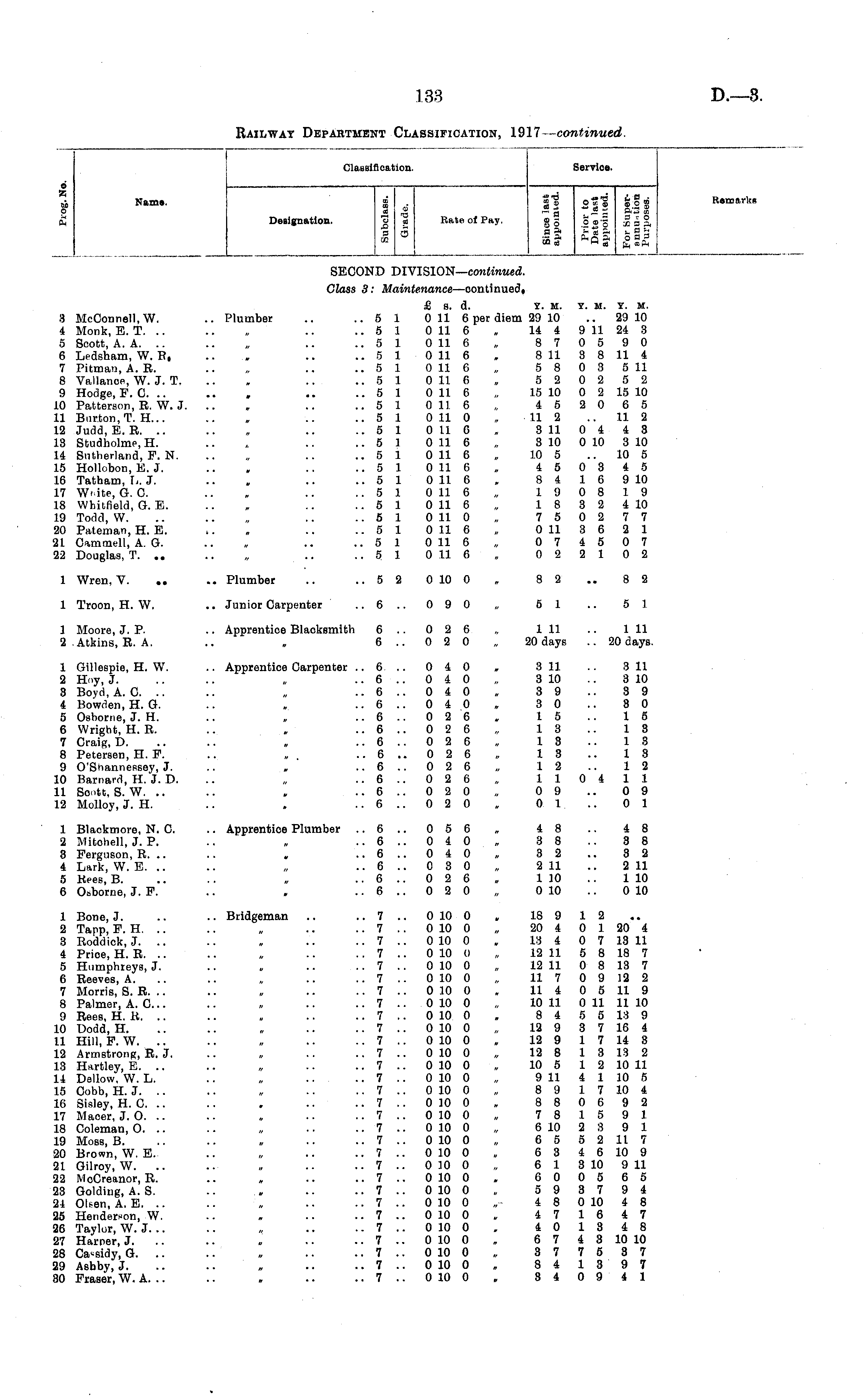 Classification, Service. i Name. 3 02 5 Rate of X?ay. — a .2 3'3 Hi S r O X3P, £»? Remarks Designation. SECOND DIVISION— continued. Class 3: Maintenance —continued. 3 McConnell.W. 4 Monk, E. T. .. 5 Scott, A. A. 6 Ledsham, W. B, 7 Pitman, A. R. 8 Vallanoe, W. J. T. 9 Hodge, F. C. .. 10 Patterson, R. W. J. 11 Burton, T. H... 12 Judd, B. R. .. 13 Studholme, H. 14 Sutherland, P. N. 15 Hollobon, E. J. 16 Tatham, Ij. J. 17 White, G. 0. 18 Whitfield, G. E. 19 Todd, W. 20 Paternan, H. E. 21 Oammell, A. G. 22 Douglas, T. .. £ s. d. y. m. .. Plumber .. ..51 0 11 6 per diem 29 10 ..5 1 0 11 6 , 14 4 ..5 1 0 11 6 „ 8 7 ..5 1 0 11 6 , 8 11 ..5 1 0 11 6 „ 5 8 ..8 1 0 11 6 , 5 2 .. 5 1 0 11 6 15 10 ..5 1 0 11 6 „ 4 5 ..5 1 0 11 0 . 11 2 .. 5 1 0 U G 8 11 ..51 0 11 6 „ 3 10 ..51 0 11 6 „ 10 5 .. 5 1 0 11 6 4 5 .. 5 1 0 11 6 8 4 ..5 1 0 11 6 „ 19 ..51 0 11 6 „ 18 ..51 0 11 0 , 75 ..51 0 11 6 „ 0 11 ..5 1 0 11 6 , 0 7 ..5 1 0 11 6 „ 0 2 Y. M. Y. M. 29 10 9 11 24 3 0 5 9 0 3 8 11 4 0 3 5 11 0 2 5 2 0 2 15 10 2 0 6 5 .. 11 2 0 4 4 8 0 10 3 10 .. 10 5 0 3 4 5 16 9 10 0 8 19 3 2 4 10 0 2 7 7 3 6 2 1 4 5 0 7 2 10 2 1 Wren, V. .. Plumber .. ..5 2 0 10 0 , 8 2 8 2 1 Troon, H. W. .. Junior Carpenter ..6.. 090 „ 81 5 1 1 Moore, J. P. 2 .Atkins, R. A. .. Apprentice Blacksmith 6 .. 0 2 6 „ 1 11 6 .. 0 2 0 „ 20 days 1 11 .. 20 days. 1 Gillespie, H. W. 2 Hny, J. 8 Boyd, A. 0. .. 4 Bowden, H. G. 5 Oeborne, J. H. 6 Wright, H. R. 7 Craig, D. 8 Petersen, H. F. 9 O'Shannessey, J. 10 Barnard, H. J. D. 11 Soott, S. W. .. 12 Molloy, J. H. .. Apprentice Carpenter .. 6. .. 0 4 0 , 8 11 .. „ .. 6 .. 0 4 0 3 10 .. 6 .. 0 & 0 39 .. 6 .. 0 i ,0 3 0 .. 6 .. 0 2 6 15 ..6.. 026,, 13 ..6.. 026,, 13 .. 6 .. 0 2 6 13 ..6.. 026,, 12 .. 6 .. 0 2 6 „ 11 ..6.. 020,, 09 .. 6 .. 0 2 0 0 1 3 11 3 10 3 9 8 0 15 IS IS IS 12 0 4 11 0 9 0 1 1 Blackmore, N. C. 2 Mitchell, J. P. 3 Ferguson, R. .. i Lark, W. E. .. 5 Rees, B. 6 Osborne, J. F. .. Apprentice Plumber .. 6 0 5 6 „ 4 8 .. 6 .. 0 4 0 3 8 ..6.. 040,, 32 .. 6 .. 0 3 0 2 11 .. 6 .. 0 2. 6 110 .. 6 .. 0 2 0 „ 0 10 4 8 8 8 3 2 2 11 1 10 0 10 1 Bone, J. 2 Tapp, F. H. 3 Roddick, J. .. 4 Prioe, H. R. .. 5 Humphreys, J. 6 Reeves, A. 7 Morris, S. R. 8 Palmer, A. C... 9 Rees, H. K. .. 10 Dodd, H. 11 Hill, F. W. .. 12 Armstrong, R. 3. 13 Hartley, E. .. 11 Dellow, W. L. 15 Cobb, H. J. .. 16 Sisley, H. 0. .. 17 Macer, J. O. 18 Coleman, 0. .. 19 Moss, B. 20 Brown, W. E. 21 Gilroy, W. .. 22 McCreanor, R. 23 Golding, A. S. 24 OUen, A. E. .. 25 Henderson, W. 26 Taylor, W. J. .. 27 Harper, J. 28 G. .. 29 Ashby, J. 30 Fraser, W. A. .. .. Briageman .. .. 7 .. 0 10 0 „ 18 9 .. 7 .. 0 10 0 „ 20 4 .. 7 .. 0 10 0 , 13 4 .. 7 .. 0 10 0 „ 12 11 .. 7 .. 0 10 0 „ 12 11 .. 7 .. 0 10 0 „ 11 7 .. 7 .. 0 10 0 , 114 .. 7 .. 0 10 0 „ 10 11 .. 7 .. 0 10 0 , 8 4 .. 7 .. 0 10 0 „ 12 9 .. 7 .. 0 10 0 » 12 9 .. 7 .. 0 10 0 „ 12 8 .. 7 .. 0 10 0 „ 10 5 .. .. 7 .. 0 10 0 „ 9 11 .. 7 .. 0 10 0 „ 8 9 ..7..0100 , 88 .. 7 .. 0 10 0 „ 7 8 .. 7 .. 0 10 0 , 6 10 .. 7 .. 0 10 0 „ 6 5 .. 7 .. 0 10 0 „ 6 3 .. 7 .. 0 10 0 „ 6 1 ..7.. 0100 . 60 .. 7 .. 0 10 0 „ 5 9 .. 7 .. 0 10 0 „ 4 8 ..7..0100 , 47 .. 7 .. 0 10 0 » 4 0 .. 7 .. 0 10 0 „ 6 7 .. 7 .. 0 10 0 „ 3 7 .. 7 .. 0 10 0 „ 8 4 ..7.. 0100 . 34 12 0 1 20 i 0 7 13 11 5 8 18 7 0 8 13 7 0 9 12 2 0 5 11 9 0 11 11 10 5 5 18 9 3 7 16 4 1 7 14 3 1 3 13 2 1 2 10 11 4 1 10 5 1 7 10 4 0 6 9 2 15 9 1 2 3 9 1 5 2 11 7 4 6 10 9 3 10 9 11 0 5 6 5 3 7 9 4 0 10 4 8 16 4 7 18 4 8 4 3 10 10 7 5 3 7 13 9 7 0 9 4 1