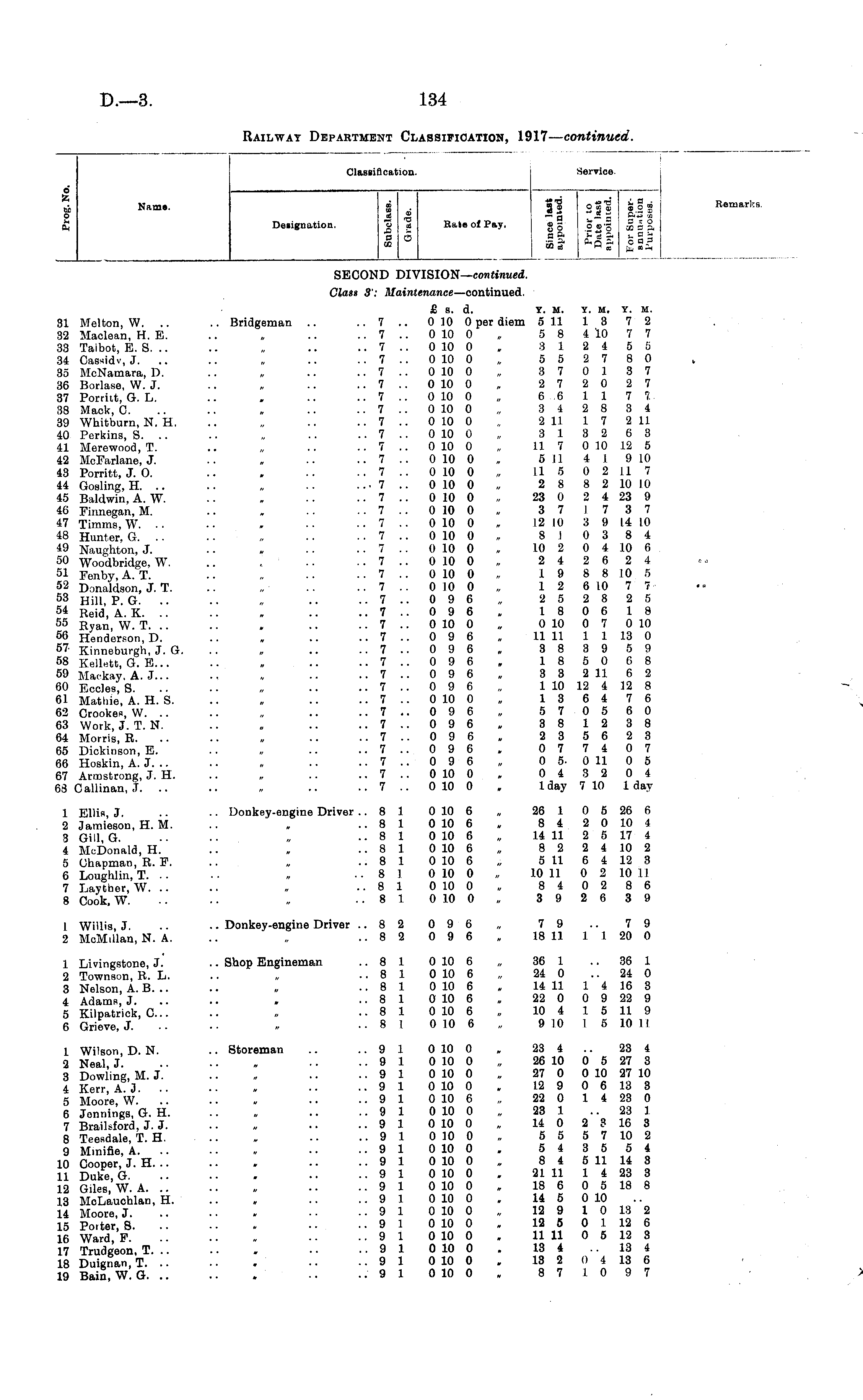 Classification. Service. o S5 „•„ Name, o Ei ft 6 z lib o u ft Name. i 3_ OS'S go" Remarks. 2 _ ™ 3 Z — - ft" ™ Designation. o g Rate of Pay. gg .*_'S a. a ft 8 ° _- p -nft =25 i, SB 'u B 3 te Designation. o ._ 5 SECOND DIVISION— continued. Class 3': Maintenance —continued. 31 Melton, W. .. 32 Maclean, H. E. 33 Talbot, E. S. .. 34 Cassidv, J. 35 McNamara, D. 36 Borlase, W. J. 37 Porritt, G. L. 38 Mack, 0. 39 Whitburn, N. H. 40 Perkins, S. 41 Merewood, T. 42 McFarlane, J. 43 Porritt, J. 0. 44 Gosling, H. .. 45 Baldwin, A. W. 46 Finnegan, M. 47 Timms,W. .. 48 Hunter, G. .. 49 Naughton, J. 50 Woodbridge. W. 31 Fenby, A. T. 52 Donaldson, J. T. 53 Hill, P. G. .. 54 Reid, A. K. .. 55 Ryan, W. T. .. &® Henderson, D. 67* Kinneburgh, J. G. 58 Kellett, G. E... 59 Maekay. A. J... 60 Eccles, S. 61 Mathie, A. H. S. 62 Crookes, W. .. 63 Work, J. T. N. 64 Morris, R. 65 Dickinson, E. 66 Hoskin, A. J. .. 67 Armstrong, J. H. 63 Callinan, J. .. £ S. d. Y. M. Y. M. Y. M. .. Bridgeman .. .. 7 .. 0 10 0 per diem 5 11 13 7 2 .. 7 .. 0 10 0 „ 5 8 4 10 7 7 .. 7 .. 0 10 0 , 8-124.55 .. 7 .. 0 10 0 „ 5 5 2 7 8 0 .. 7 .. 0 10 0 „ 3 7 0 1 8 7 ..7..0100 „ 272027 .. 7 .. 0 10 0 „ 6 ,6 1 1 7 7 ..7.. 0100 „ 342834 .. 7 .. 0 10 0 „ 2 11 1 7 2 11 .. 7 .. 0 10 0 „ 3 13 2 6 3 .. 7 .. 0 10 0 „ 1.1 7 0 10 12 5 .,.,,' 0 10 0 , 5 11 4 I 9 10 .. 7 .. 0 10 0 „ 11 5 0 2 11 7 ... 7 .. 0 10 0 „ 2 8 8 2 10 10 .. 7 .. 0 10 0 „ 23 0 2 4 23 9 ..7.. 0100,, 371737 .. 7 .. 0 10 0 12 10 3 9 14 10 . . 7 .. 0 10 0, 810384 .. 7 .. 0 10 0 . 10 2 0 4 10 6 ..7.. 0100 . 242624 .. 7 .. 0 10 0 „ 19 8 8 10 5 .. 7 .. 0 10 0 „ 1 2 6 10 7 7 ..7.. 096 „ 252825 .. 7 .. 0 9 6 18 0 6 18 .. 7 .. 0 10 0 „ 0 10 0 7 0 10 .. 7 .. 0 9 6 „ 11 11 1 1 13 0 ..7.. 096 „ 883959 ..7.. 096 , 185068 .. 7 .. 0 9 6 „ 8 3 2 11 6 2 .. 7 .. 0 9 6 „ 1 10 12 4 12 8 .. 7 .. 0 10 0 „ 13 6 4 7 6 ..7.. 096 „ 570560 ..7.. 096 . 381238 ..7.. 096 . 235623 ..7.. 096 , 077407 .. 7 .. 0 9 6 „ 0 5- 0 11 0 5 ..7.. 0100 » 043204 .. 7 .. 0 10 0 , 1 day 7 10 1 day 1 Ellis, J. 2 Jamieson, H. M. 3 Gill, G. 4 McDonald, H. 5 Chapman, R. F. 6 Loughlin, T. .. 7 Layther, W. .. 8 Cook. W. .. Donkey-engine Driver ..81 0 10 6 „ 26 1 0 5 26 6 ..810 10 6. 8420 10 4 .. 8 1 0 10 6 „ 14 11 2 5 17 4 .. 8 1 0 10 6 8 2 2 4 10 2 .. 8 1 0 10 6 5 11 6 4 12 3 ..81 0 10 0 10 11 0 2 10 II ..81 0 10 0,, 840286 .. 8 1 0 10 0 „ 3 9 2 6 3 9 1 Willis, J. 2 McMillan, N. A. .. Donkey-engine Driver ..82 096 „ 79 .. 79 ..82096. 18 11 1 I 20 0 1 Livingstone, J. 2 Townson, R. L. 3 Nelson, A. B. .. 4 Adams, J. 5 Kilpatrick, C.. 6 Grieve, J. .. Shop Engineman ..81 0 10 6 „ 36 1 .. 36 1 ..81 0 10 6 „ 24 0 24 0 .. 8 1 0 10 6 14 11 1 4 16 3 .. 8 1 0 10 6 22 0 0 9 22 9 .. 8 1 0 10 6 10 4 1 5 11 9 .. 8 1 0 10 6 „ 9 10 1 6 10 II 1 Wilson, D. N. 2 Neal, J. 3 Dowling, M. J. 4 Kerr, A. 3. 5 Moore, W. 6 Jennings, G. H. 7 Brailsford, J. J. 8 Teesdale, T. H. 9 Minifie, A. 10 Cooper, J. H. .. 11 Duke, G. 12 Giles, W. A. 13 MoLauchlan, H. 14 Moore, J. 15 Porter, S. 16 Ward, F. 17 Trudgeon, T. .. 18 Duignan.T. .. 19 Bain, W. G. .. .. Storeman .. ..91 0 10 0 , 23 4 .. 23 4 ..91 0 10 0 „ 26 10 0 5 27 3 ..91 0 10 0 , 27 0 0 10 27 10 ..91 0 10 0 . 12 9 0 6 13 3 ..9 1 0 10 6 „ 22 0 1 4 23 0 ..91 0 10 0 , 23 1 .. 23 1 ..91 0 10 0 „ 14 0 2 3 16 3 .. . .. ..9 1 0 10 0 „ 5 5 5 7 10 2 ..91 0 10 0 . 543554 ..91 0 10 0 » 8 4 5 11 14 8 ..9 1 0 10 0 . 21 11 1 4 23 3 ..91 0 10 0 , 18 6 0 5 18 8 ..91 0 10 0 . 14 5 0 10 ..91 0 10 0 „ 12 9 1 0 13 2 ..91 0 10 0 , 12 5 0 1 12 6 ..91 0 10 0 . 11 11 0 5 12 3 ..91 0 10 0 . 13 4 13 4 ..91 0 10 0 . 13 2 0 4 13 6 ..91 0 10 0 » 87 1097