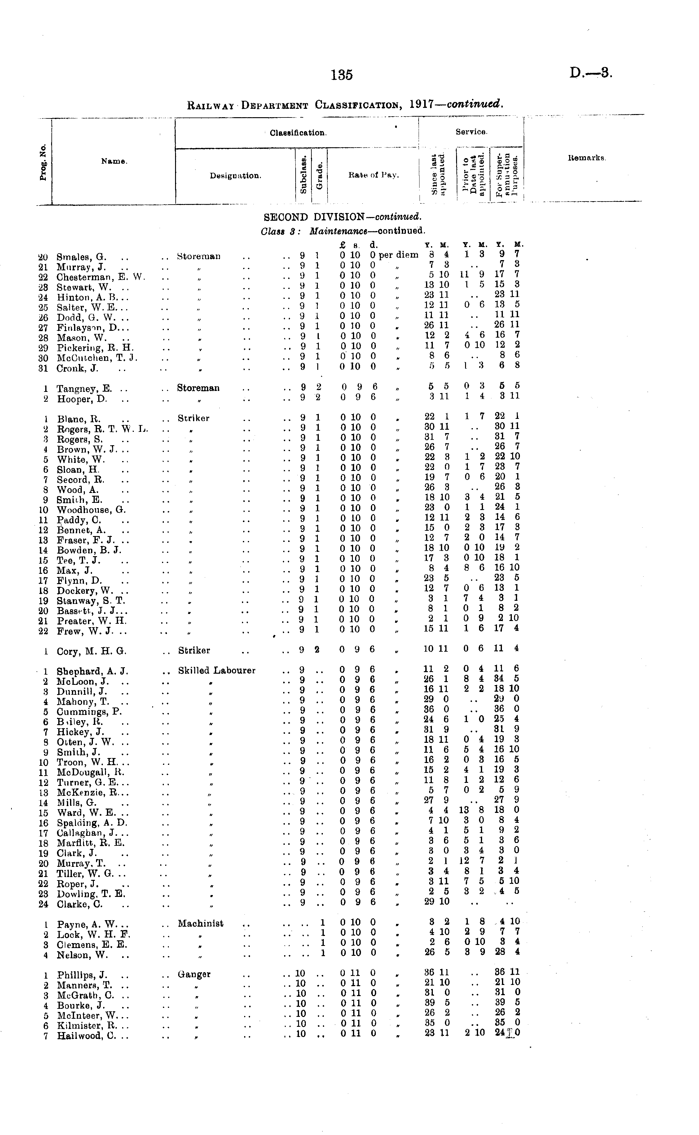 ~: — ." • "~ \ 6 a Name. I Designation. Classification. Service. i • ii -it Hi Kate ol Pay. a> g o α-g xiz. offl a a ? * ~ ~ g i Classification. Heinarks. 6 Z I Name. SECOND DIVISION— continued. Glass 3: Maintenance— oontinued. ■20 Smales, G. 21 Murray, J. 22 Chesterman, E. W. 23 Stewart, W. .. '24 Hinton, A. B. .. 25 Salter, W.E. .. 26 Dodd, Q. W. .. 27 Finlaysnn, D... 28 Mason, W. 29 Pickering, R. H. 30 MoOutohen, T. 3. 31 Cronk, J. .. Storeman £ h d. y. M. y. m. y. M. ..91 0 10 0 per diem 84 13 97 ..91 0 10 0 „ 73 .. 73 9 1 0 10 0 „ 5 10 U 9 17 7 .,91 0 10 0 „ 13 10 1 5 15 3 ..9 1 0 10 0 „ 23 11 .. 23 11 ..91 0 10 0 , 12 1] 0 6 18 5 ..9 1 0 10 0 „ 11 11 .. 11 11 ..9 1 0 10 0 , 26 11 .. 26 11 9 1 0 10 0 , 12 2 4 6 16 7 ..9 1 0 10 0 „ 11 7 0 10 12 2 ..91 0 10 0 » 86 .. 86 ..9 1 0 10 0 . 5 6 13 6 8 1 Tangney, E. .. 2 Hooper, D. . . Storeman ..92 096 „ 580365 .. 9 2 0 9 6 „ 8 11 14 3 11 1 Blanc, R. 2 Rogers, R. T. W. L. 8 Rogers, S. 4 Brown, W. J. .. 5 White, W. .. 6 Sloan, H. 7 Seoord, R. 8 Wood, A. 9 Smith, E. 10 Woodhonse, G. 11 Paddy, 0. 12 Bennet, A. 13 Praser, F. J. 14 Bowden, B. J. 15 Tee, T. J. 16 Max, J. 17 Flynn, D. 18 Dockery, W. .. 19 Stanway, S. T. 20 Basei'tt, J. J... 21 Preater, W. H. 22 Frew, W. J. .. Striker . . v • • 9 1 0 10 0 . 22 1 1 7 22 1 ..91 0 10 0 „ 30 11 .. 30 11 ..91 0 10 0 „ 31 7 .. 31 7 9 1 0 10 0 „ 26 7 26 7 9 1 0 10 0 , 22 3 1 2 22 10 ..9 1 0 10 0 „ 22 0 1 7 23 7 ..91 0 10 0 „ 19 7 0 6 20 1 9 1 0 10 0 „ 26 3 26 3 9 1 0 10 0 , 18 10 3 4 21 5 ..91 0 10 0 „ 23 0 1 1 24 1 9 1 0 10 0 , 12 11 2 3 14 6 ..91 0 10 0 , 15 0 2 3 17 3 ..9 1 0 10 0 „ 12 7 2 0 14 7 .91 0 10 0 , 18 10 0 10 19 2 9 1 0 10 0 „ 17 3 0 10 18 1 ..9 1 0 10 0 „ 8 4 8 6 16 10 9 1 0 10 0 , 23 5 23 5 ..9 1 0 10 0 » 12 7 0 6 13 1 ..91 0 10 0 „ 3174 31 ..91 0 10 0 , 810182 ..9 1 0 10 0 , 2 1 0 9 2 10 . 9 1 0 10 0 „ 15 11 1 6 17 4 1 Cory, M. H. G. .. Striker ..92 096 „ 10 11 0 6 11 4 1 Shephard, A. J. 2 MoLoon, J. 8 Diinnill.J. 4 Mahony, T. .. 5 Cummings, P. 6 B.iley, R. 7 Hickey, J. 8 Otten, J. W. .. 9 Smith, J. 10 Troon, W. H. .. 11 MoDougall, R. 12 Turner, G. E. .. 1.3 MoKenzie, R... 14 Mills, G. 15 Ward, W. E. .. 16 Spalciing, A. D. 17 Callaghan, J. .. 18 Marflitt, R. E. 19 Clark, J. 20 Murray, T. .. 21 Tiller, W. G. .. 22 Roper, J. 23 Dowling, T. E. 24 Clarke, C. .. Skilled Labourer • ■ H • • U • • H .9.. 096 . 11 2 04 11 6 9 .. 0 9 6 „ 26 1 8 4 34 5 .. 9 .. 0 9 6 „ 16 11 2 2 18 10 . 9 .. 0 9 6 . 29 0 .. 29 0 .. 9 .. 0 9 6 , 36 0 .. 36 0 .. 9 .. 0 9 6 „ 24 6 1 0 25 4 .. 9 .. 0 9 6 . 31 9 .. 31 9 9 .. 0 9 6 „ 18 11 0 4 19 3 .. 9 .. 0 9 6 „ 11 6 5 4 16 10 .. 9 .. 0 9 6 , 16 2 0 3 16 5 9 .. 0 9 6 „ 15 2 4 1 19 3 .. 9 .. 0 9 6 „ 11 8 1 2 12 6 .., 9 ,. 096 „ 57 02 59 .. 9 .. 0 9 6 „ 27 9 .. 27 9 ..9.. 096 , 44 13 8 18 0 ..9.. 096 „ 7 10 30 84 ..9.. 096 „ 41 51 92 . 9.. 096 „ 36 5136 ..9.. 096 „ 30 34 30 .. 9 .. 0 9 6 „ 2 112 7 2 1 9.. 096 „ 34 8134 ..9.. 096 , 3 11 75 5 10 ..9.. 096 „ 25 3245 .. 9 .. 0 9 6 , 29 10 1 Payne, A. W. .. 2 Lock, W. H. F. 3 Clemens, E. E. 4 Nelson, W. .. .. Machinist ....1 0 10 0 , 32 184 10 .... 1 0 10 0 , 4 10 2 9 7 7 ...10100 , 260 10 84 .... 1 0 10 0 . 26 5 3 9 28 4 1 Phillips, J. .. 2 Manners, T. .. 3 McGrath,C. .. 4 Bourke, J. 5 Mclnteer, W. .. 6 Kilmister, R. .. 7 Hailwood, C. .. .. Ganger .. 10 .. 0 11 0 , 36 11 .. 36 11 . 10 .. 0 11 0 , 21 10 .. 21 10 .. 10 .. 0 11 0 . 31 0 .. 31 0 .. 10 .. 0 110 » 39 5 .. 39 5 .. 10 .. 0 11 0 , 26 2 .. 26 2 .. 10 .. 0 11 0 , 35 0 .. 35 0 ,. 10 ., 0 11 0 , 23 11 2 10 24] 0