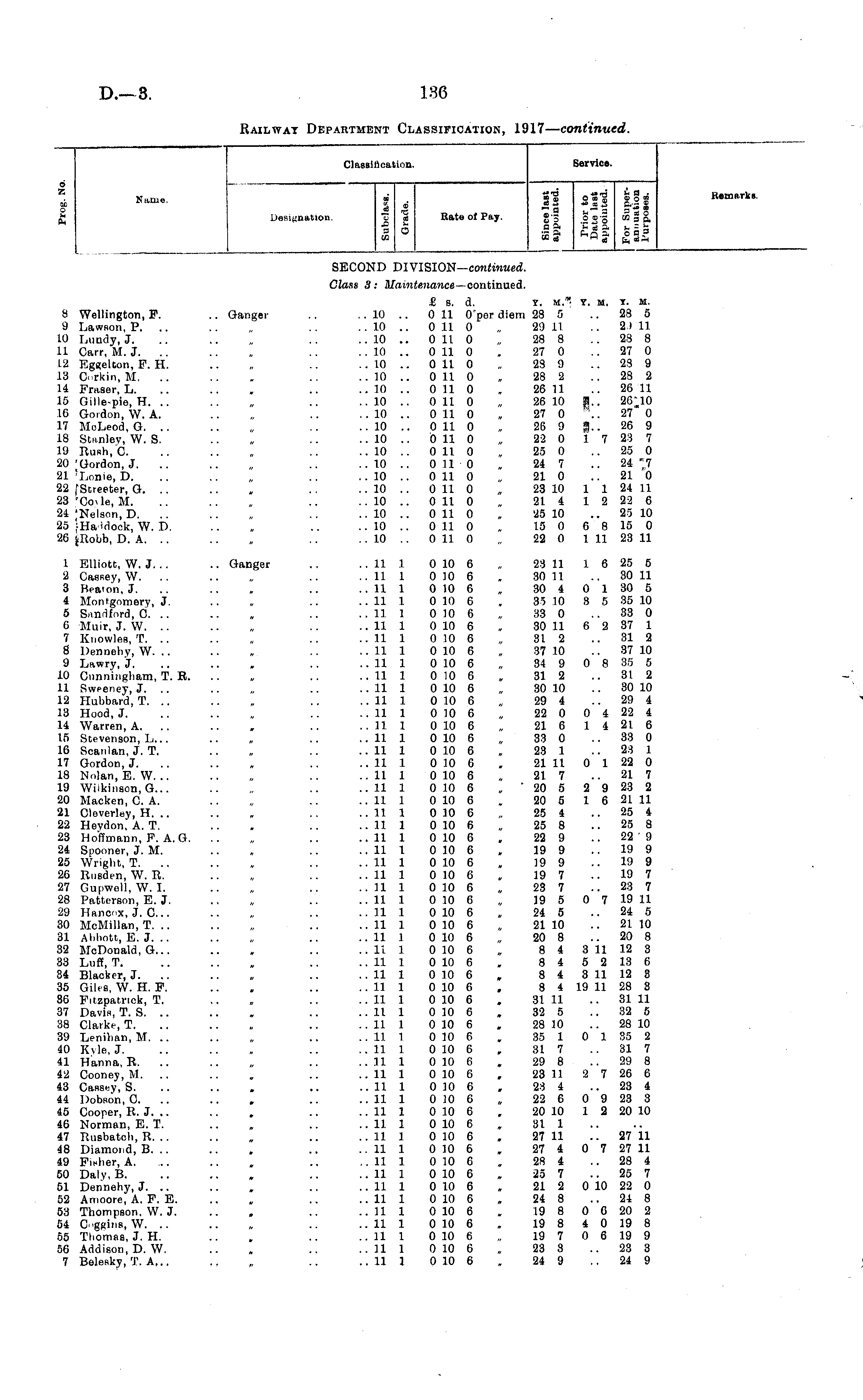 Classification. Service. 6 Name. DE i J a o Bate ol Pay. A I! Ill o a S Kemarts Designation. SECOND DIVISION— continued. Class 3 : Maintenance— continued. 8 Wellington, F. 9 Lawson, P. 10 Lundy, J. 11 Carr, M. J. .. 12 Eggelton, P. H. 13 Cnrkin, M. 14 Fraser, L. 15 Gille-pie, H. .. 16 Gordon, W. A. 17 MoLeod, G. .. 18 Stanley, W. S. 19 Rush, C. 20 Gordon, J. 21 ! Lnnie, D. 22 fStreeter, G. .. 23 'CoUe, M. 24 'Nelson, D. 25 ;Ha irlock, W. D. 26 jRobb, D. A. .. Ganger ■ • u £ s. d. y. M.'". v. m. I. M. .. 10 .. 0 11 O'per diem 28 S .. 28 5 .. 10 .. 0 11 0 „ 29 11 .. 2.1 11 .. 10 .. 0 11 0 „ 28 8 .. 28 8 .. 10 .. 0 11 0 . 27 0 .. 27 0 .. 10 .. 0 11 0 „ 28 9 .. 23 9 .. 10 .. 0 11 0 , 28 2 .. 28 2 .. 10 .. 0 11 0 , 26 11 .. 26 11 .. 10 .. 0 11 0 „ 26 10 B.. 26" 10 .. 10 .. 0 11 0 „ 27 0 '.. 27 0 .. 10 .. 0 11 0 „ 26 9 S.. 26 9 .. 10 .. 0 11 0 „ 22 0 17 23 7 .. 10 .. 0 11 0 „ 25 0 .. 25 0 .. 10 .. 0 11 0 , 24 7 .. 24 ";7 .. 10 .. 0 11 0 , 21 0 .. 21 0 .. 10 .. 0 11 0 „ 23 10 1 1 24 11 .. 10 .. 0 11 0 „ 21 4 1 2 22 6 .. 10 .. 0 11 0 , 25 10 .. 25 10 .. 10 .. 0 11 0 , 15 0 6 8 15 0 .. 10 .. 0 11 0 „ 22 0 1 11 23 11 1 Elliott, W. J. .. 2 Caasey, W. .. 3 Beaton, J. 4 Montgomery, J. 5 Sxndfnrd, 0. .. 6 Muir, J. W. .. 7 Knowles, T. .. 8 Dennehy, W. .. 9 Livwry, J. 10 Cunningham, T. R. 11 Sweeney, J. 12 Hubbard, T. .. 13 Hood, J. 14 Warren, A. If) Stevenson, L... 16 Scanlan, J. T. 17 Gordon, J. 18 Nolan, E. W. .. 19 Wilkinson, G... 20 Macken, C. A. 21 Cleverley, H. .. 22 Heydon, A. T. 23 Hoffmann, P. A. G. 24 Spooner, J. M. 25 Wright, T. 26 Rusden, W. R. 27 Gupwell, W. I. 28 Patterson, E. J. 29 Hancnx, J. C... 30 McMillan, T. .. 31 Abbott, E. J. .. 32 McDonald, G... 33 Luff, T. 34 Blacker, J. 35 Giles, W. H. P. 36 Fitzpatrick, T. 37 DaviR, T. S. .. 38 Clarke, T. 39 Lenihan, M. .. 40 Kyle, J. 41 Hanna, R. 42 Cooney, M. 43 Causey, S. 44 Dobson, 0. 45 Cooper, R. J. 46 Norman, E. T. 47 Ruebatch, R. .. 48 Diamond, B. .. 49 Fisher, A. 50 Daly, B. 51 Dennehy, J. .. 52 Amoore, A. P. E. 53 Thompson, W. J. 54 Opsins, W. .. 55 Thomas, J. H. 56 Addison, D. W. 7 Belesky, T. A,.. .. Ganger • ■ m • ■ * ■ • * ' ■ * .. 11 1 0 10 6 „ 23 11 1 6 25 5 .. 11 1 0 10 6 , 30 11 .. 30 11 .. 11 1 0 10 6 , 30 4 0 1 30 5 .. 11 1 0 10 6 , 35 10 3 5 35 10 .. 11 1 0 10 6 „ 33 0 .. 33 0 .. 11 1 0 10 6 , 30 11 6 2 37 1 .. 11 1 0 10 6 „ 81 2 .. 31 2 .. 11 1 0 10 6 , 37 10 .. 37 10 .. 11 1 0 10 6 „ 34 9 0 8 35 5 .. 11 1 0 10 6 , 31 2 .. 31 2 .. 11 1 0 10 6 „ 30 10 .. 30 10 .. 11 1 0 10 6 „ 29 4 .. 29 4 .. 11 1 0 10 6 „ 22 0 0 4 22 4 ..111 0 10 6 „ 21 6 1 4 21 6 .. 11 1 0 10 6 „ 33 0 .. 33 0 .. 11 1 0 10 6 , 23 1 .. 23 1 .. 11 1 0 10 6 » 21 11 0 1 22 0 .. 11 1 0 10 6 „ 21 7 .. 21 7 .. 11 1 0 10 6 , 20 5 2 9 23 2 .. 11 1 0 10 6 , 20 5 1 6 21 11 .. 11 1 0 10 6 , 25 4 .. 25 4 .. 11 1 0 10 6 „ 25 8 .. 25 8 .. 11 1 0 10 6 , 22 9 .. 22 9 .. 11 I 0 10 6 „ 19 9 .. 19 9 .. 11 1 0 10 6 » 19 9 .. 19 9 .. 11 1 0 10 6 . 19 7 .. 19 7 .. 11 1 0 10 6 „ 23 7 .. 23 7 ..HI 0 10 6 „ 19 5 0 7 19 11 ..111 0 10 6 , 24 5 .. 24 5 .. 11 1 0 10 6 , 21 10 .. 21 10 ..111 0 10 6 , 20 8 .. 20 8 .. 11 1 0 10 6 „ 8 4 3 11 12 8 .. 11 1 0 10 6 . 8 4 5 2 13 6 .. 11 1 0 10 6 , 8 4 8 11 12 3 .. 11 1 0 10 6 . 8 4 19 11 28 8 .. 11 1 0 10 6 . 31 11 .. 31 11 .. 11 1 0 10 6 » 32 5 .. 32 5 .. 11 1 0 10 6 . 28 10 .. 28 10 .. 11 1 0 10 6 , 35 1 0 1 35 2 .. 11 1 0 10 6 . 31 7 .. 31 7 .. 11 1 0 10 6 , 29 8 .. 29 8 .. 11 1 0 10 6 . 23 11 2 7 26 6 .. 11 1 0 10 6 . 23 4 .. 23 4 .. 11 1 0 10 6 „ 22 6 0 9 23 3 .. 11 1 0 10 6 . 20 10 1 2 20 10 .. 11 1 0 10 6 , 31 1 .. 11 1 0 10 6 , 27 11 .. 27 11 .. 11 1 0 10 6 . 27 4 0 7 27 11 , ..11 1 0 10 6 , 28 4 .. 28 4 ,,,11 1 0 10 6 , 25 7 .. 25 7 .. 11 1 0 10 6 , 21 2 0 10 22 0 .. 11 1 0 10 6 . 24 8 .. 24 8 ..111 0 10 6 , 19 8 0 6 20 2 .. 11 1 0 10 6 . 19 8 4 0 19 8 .. 11 1 0 10 6 „ 19 7 0 6 19 9 .. 11 1 0 10 6 » 23 3 .. 23 3 .. 11 1 0 10 6 , 24 9 .. 24 9