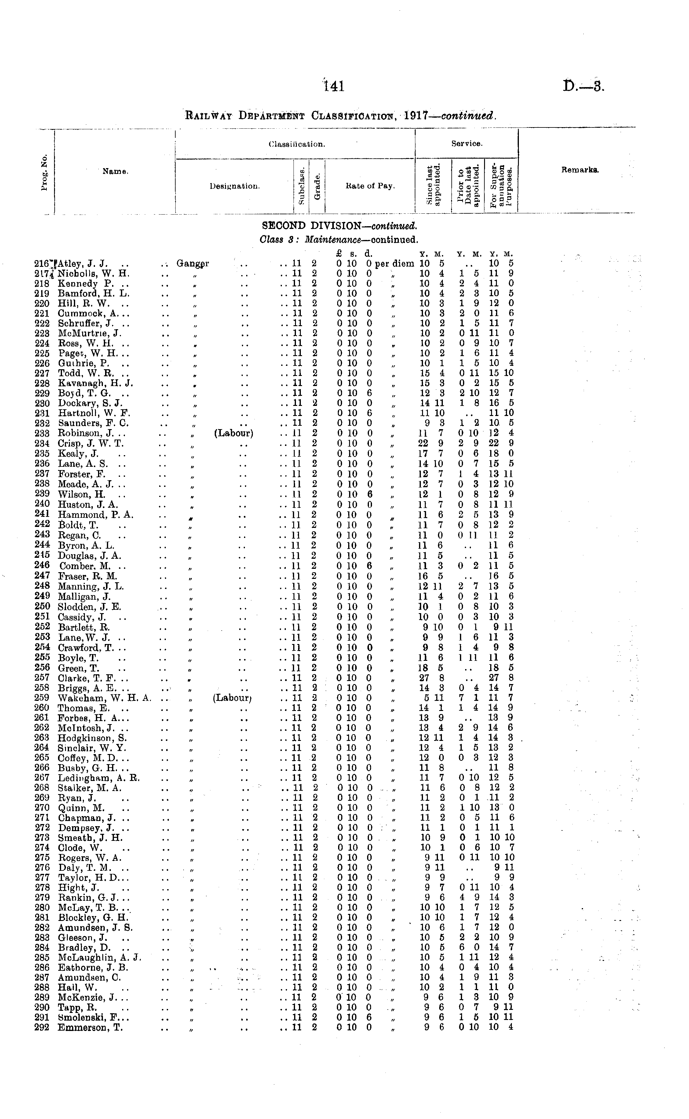 Classification. Service. 0 Sβ 0 ;, Name. d ■X, ] i s it *Ji tit Designation. "2 <a Kate of Pay. g-g oo-g »°p, rr U ■.? ft Q a O H O Remarks. SECOND DIVISION— continued. Class 3 : Maintenance —continued. !16"fAtley, J. J. .. H7iNioholls, W. H. !18 Kennedy P. .. !19 Bamford, H. L. !20 Hill, R. W. .. !21 Cummock, A. .. 222 Schrufier, J. .. 223 MoMurtrie, J. 224 Ross, W. H. .. 225 Pagec, W. H. .. !26 Guihrie, P. .. !27 Todd, W. R. .. !28 Kavanagh, H. J. 229 Bojd, T. G. .. 230 Dockary, S. J. 181 Hartnoll, W. F. 232 Saunders, F. C. !88 Robinson, J. .. !34 Crisp, J. W. T. !35 Kealy, J. !36 Lane, A. S. .. 237 Forster, F. .. !38 Meade, A. J. .. 239 Wilson, H. .. HO Huston, J. A. !41 Hammond, P. A. !42 Boldt, T. !43 Regan, C. !44 Byron, A. L. !15 Douglas, J. A. !46 Comber, M. .. !47 Fraser, R. M. !48 Manning, J. L. !49 Malligan, J. !50 Slodden, J. B. !51 Cassidy, J. .. !52 Bartlett, R. !53 Lane, W.J. •• !54 Crawford, T. .. 555 Boyle, T. i56 Green, T. !57 Clarke, T. F. .. !58 Briggs, A. E. .. !59 Wakaham, W. H. A. !60 Thomas, E. .. !61 Forbes, H. A... 162 Mclntosh.J. .. !63 Hodgkiuson, S. !64 Sinclair, W. Y. !65 Coffey, M. D. .. 266 Busby, G. H. .. !67 Ledingham, A. R. !68 Stalker, M. A. !69 Ryan, J. !70 Quinn, M. i71 Chapmaa, J. .. 272 Dempsey, J. .. 273 Smeatb, J. H. 274 Clode, W. 275 Rogers, W. A. 276 Daly, T. M. .. 277 Taylor, H.D... 278 Hight, J. 279 Rankin, G. J. .. !80 McLay, T. B. .. !81 Blockley, G. H. 282 Amundsen, J. 8. 283 Gieeson, J. 284 Bradley, D. .. 285 MoLaughlin, A. J. 286 Eathorne, J. B. !87 Amundsen, C. !88 Hall, W. !89 MoKenzie, J. .. !90 Tapp, R. 291 Hmolenski, F... !92 Emmerson, T. . •. Ganger ■ • « £ s. d. y. m. y. M, y. m. I '.:.. .. 11 2 0 10 0 per diem 10 5 .. 10 5 .. 11 2 0 10 0 „ 10 4 1 5 11 9 .. 11 2 0 10 0 „ 10 4 2 4 11 0 .. 11 2 0 10 0 „ 10 4 2 3 10 5 .. 11 2 0 10 0 ; 10 3 1 9 12 0 .. 11 2 0 10 0 „ 10 3 2 0 11 6 .. 11 2 0 10 0 „ 10 2 1 5 11 7 .. 11 2 0 10 0 „ 10 2 0 11 11 0 .. 11 2 0 10 0 » 10 2 0 9 10 7 .. 11 2 0 10 0 „ 10 2 1 6 11 4 .. 11 2 0 10 0 „ 10 1 1 5 10 4 ..112 0100 „ 15 4 0 11 15 10 .. 11 2 0 10 0 „ 15 3 0 2 15 5 .. 11 2 0 10 6 „ 12 3 2 10 12 7 .. 11 2 0 10 0 „ 14 11 1 8 16 5 .. 11 2 0 10 6 „ 11 10 .. 11 10 .. 11 2 0 10 0 „ 9 3 1 2 10 5 (Labour) .. 11 2 0 10 0 „ 117 0 10 12 4 .. 11 2 0 10 0 „ 22 9 2 9 22 9 .. II 2 0 10 0 „ 17 7 0 6 18 0 .. 11 2 0 10 0 „ 14 10 0 7 15 5 .. 11 2 0 10 0 „ 12 7 I 4 13 11 ..112 0 10 0 „ 12 7 0 3 12 10 .. 11 2 0 10 6 „ 12 1 0 8 12 9 .. 11 2 0 10 0 ; 11 7 0 8 11 11 .. 11 2 0 10 0 , 11 6 2 5 13 9 .. 11 2 0 10 0 , 11 7 0 8 12 2 .. 11 2 0 10 0 „ 11 0 0 11 II 2 .. 11 2 0 10 0 , 11 6 .. 11 6 .. 11 2 0 10 0 , 11 5 .. 11 5 .. 11 2 0 10 6 „ 11 3 0 2 11 5 .. 11 2 0 10 0 „ 16 5 .. 16 5 .. 11 2 0 10 0 „ 12 11 2 7 13 5 .. 11 2 0 10 0 „ 11 4 0 2 11 6 ..112 0 10 0 „ 10 1 0 8 10 3 .. .. 11 2 0 10 0 „ 10 0 0 3 10 3 .. 11 2 0 10 0 „ 9 10 0 1 9 11 .. 11 2 0 10 0 „ 9 9 I 6 1.1 3 .. 11 2 0 10 0 „ 9 8 14 9 8 .. 11 2 0 10 0 „ 11 6 I 11 11 6 .. II 2 0 10 0 „ 18 5 .. 18 5 .. 11 2 0 10 0 „ 27 8 .. 27 8 .. 11 2 0 10 0 „ 14 3 0 4 14 7 (Labour; .. 11 2 0 10 0 „ 5 11 7 1 11 7 .. 11 2 0 10 0 „ 14 1 1 4 14 9 ..112 0 10 0 „ 13 9 .. 13 9 .. 11 2 0 10 0 „ 13 4 2 9 14 6 .. 11 2 0 10 0 „ 12 11 1 4 14 3 . .. 11 2 0 10 0 „ 12 4 1 5 13 2 .. 11 2 0 10 0 „ 12 0 0 3 12 3 .. 11 2 0 10 0 , 11 8 .. 11 8 .. 11 2 0 10 0 „ 11 7 0 10 12 5 .. : .. 11 2 0 10 0 . „ 11 6 0 8 12 2 .. 11 2 0 10 0 , 11 2 0 1 11 2 .. 11 2 0 10 0 „ 11 2 1 10 13 0 .. 11 2 0 10 0 „ 11 2 0 5 11 6 .. 11 2 0 10 0 . „ 11 1 0 1111 .. 11 2 0 10 0 , , 10 9 0 1 10 10 .. 11 2 0 10 0 „ 10 1 0 6 10 7 .. .. 11 2 0 10 0 „ 9 11 0 11 10 10 .. 11 2 0 10 0 , 9 11 .. 9 11 .. 11 2 0 10 0 „ 9 9 .. 9 9 .. 11 2 0 10 0 „ 9 7 0 11 10 4 .. 11 2 0 10 0 9 6 4 9 14 3 .. 11 2 0 10 0 „ 10 10 1 7 12 5 .. 11 2 0 10 0 „ 10 10 1 7 12 4 ..112 0 10 0 „" 10 6 1 7 12 0 .. 11 2 0 10 0 . . 10 5 2 2 10 9 ... .. 11 2 0 10 0 , 10 5 6 0 14 7 .. 11 2 0 10 0 „ 10 5 1 11 12 4 !*. .. .. 11 2 0 10 0 . „ 10 4 0 4 10 4 ... ..112 0 10 0 „ 10 4 1 9 11 3 .: . ... . .. 11 2 0 10 0 .... „ 10 2 1 1 11 0 .. 11 2 0 10 0 „ 9 6 1 3 10 9 .. 11 2 0 10 0 9 6 0 7 9 11 .. 11 2 0 10 6 „ 9 6 1 5 10 11 .. 11 2 0 10 0 „ 9 6 0 10 10 4