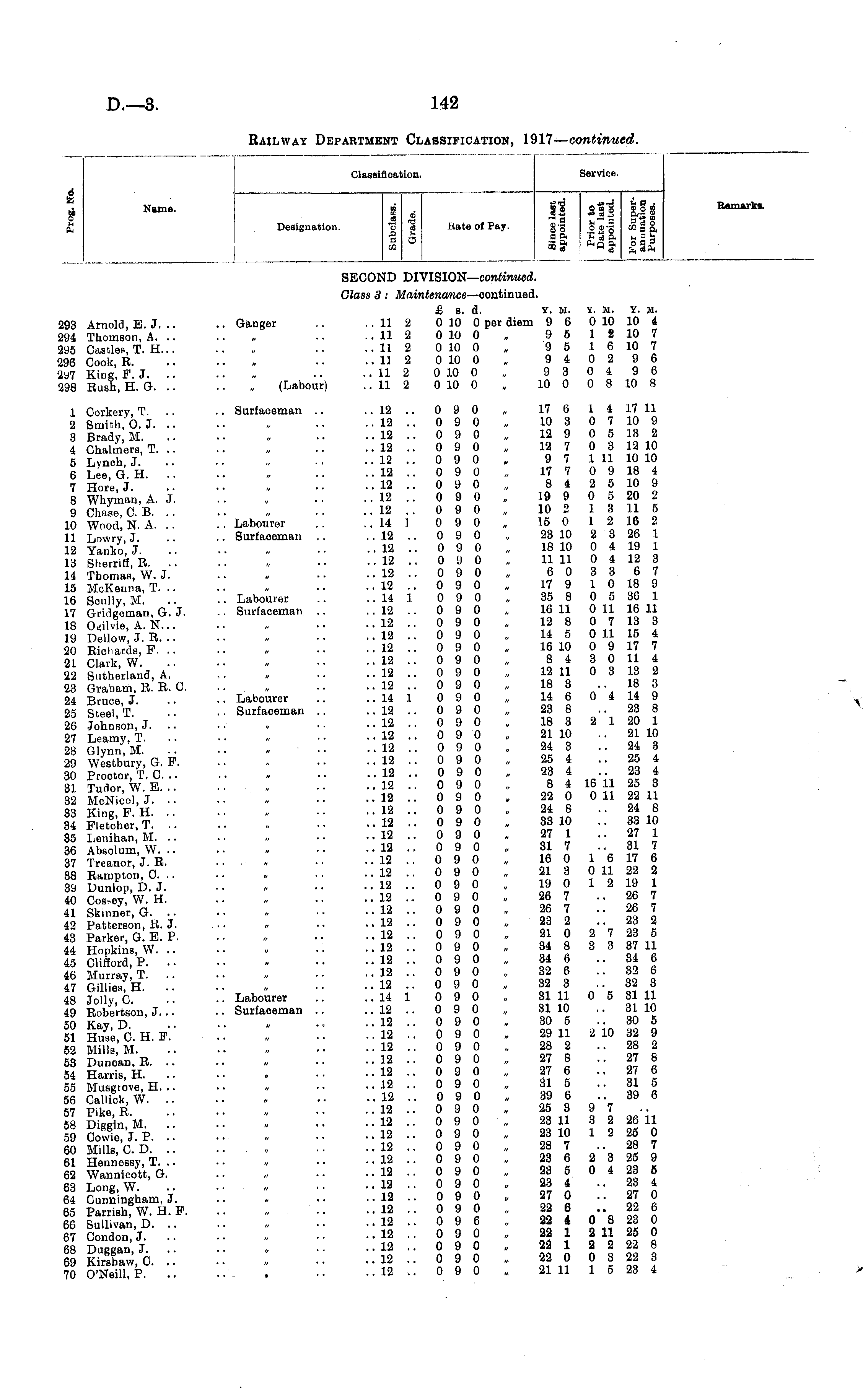 Classification. Service. 6 7, A I ft Name. 0Q & is o 03 o g a O oo. Kate of Pay. it s$t si |_i a a B g S if 8 ._ o o _ ft-- o 5ao CO o a °§l h aft Iteraarka. Designation. SECOND DIVISION— continued. .93 Arnold, E. J. .. !94 Thomson, A. .. !95 Castles, T. H... !96 Cook, R. !y7 Kiug, F. J. .98 Rush, H. G. .. Ganger (Labour) Class 3 i Maintenance —oontinued. £ S. d. Y. M. Y. M. Y. M. .. 11 2 0 10 0 per diem 9 6 0 10 10 4 .. 11 2 0 10 0 , 9 5 1 2 10 7 .. 11 2 0 10 0 . 9 5 1 6 10 7 .. 11 2 0 10 0 „ 9 4 0 2 9 6 .. 11 2 0 10 0 „ 9 3 0 4 9 6 .. 11 2 0 10 0 „ 10 0 0 8 10 8 1 Gorkery, T. .. 2 Smith, O.J. .. 8 Brady, M. 4 Chalmers, T. .. 6 Lynch, J. 6 Lee, G. H. .. 7 Hore, J. 8 Whyman, A. J. 9 Chase, C. B. 10 Wood, N. A. 11 Lowry, J. 12 Yanko, J. 13 Sherrifi, R. .. 14 Thomas, W. J. 15 McKenna, T. .. 16 Scully, M. 17 Gridgeman, G. 3. 18 A. N... 19 Dellow, J. R. .. 20 Richards, F. .. 21 Clark, W. 22 Sutherland, A. 23 Graham, R. R. 0. 24 Bruce, J. 25 Steel, T. 26 Johnson, J. 27 Leamy, T. 28 Glynn, M. 29 Westbury, G. F. 30 Proctor, T. 0. .. 31 Tudor, W. E. .. 32 McNicol, J. .. 33 King, F. H. 34 Fletcher, T. .. 35 Lenihan, M. .. 36 Absolum, W. .. 37 Treanor, J. R. 38 Rampton, 0. .. 39 Dunlop, D. J. 40 Cos-ey, W. H. 41 Skinner, G. 42 Patterson, R. J. 43 Parker, G. E. P. 44 Hopkins, W. .. 45 Clifford, P. .. 46 Murray, T. .. 47 Gillies, H. 48 Jolly, 0. 49 Robertson, J. .. 50 Kay, D. 51 Huse, O. H. F. 52 Mills, M. 53 Duncan, R. .. 54 Harris, H. 55 Musgrove, H. .. 56 Calliok, W. .. 57 Pike, R. 58 Diggin, M. .. 59 Cowie, J. P. 60 Mills, CD. 61 Hennessy, T. .. 62 Wannieott, G. 63 Long, W. 64 Cunningham, J. 65 Parrish, W. H. F. 66 Sullivan, D. .. 67 Condon, J. 68 Duggan, J. 69 Kirshaw, 0. .. 70 O'Neill, P. .. Surfaceman .. . . Labourer .. Surfaoeman .. Labourer .. Surfaceman .. .. Labourer .. Surfaceman .. .. Labourer .. Surfaoeman .. .. 12 .. 0 9 0 „ 17 6 1 4 17 11 .. 12 .. 0 9 0 „ 10 3 0 7 10 9 .. 12 .. 0 9 0 „ 12 9 0 5 13 2 .. 12 .. 0 9 0 „ 12 7 0 3 12 10 .. 12 .. 0 9 0 „ 9 7 1 11 10 10 .. 12 .. 0 9 0 „ 17 7 0 9 18 4 .. 12 .. 0 9 0 „ 8 4 2 5 10 9 .. 12 .. 0 9 0 „ 19 9 0 5 20 2 .. 12 .. 0 9 0 „ 10 2 1 3 11 5 .. 14 I 0 9 0 » 15 0 1 2 16 2 .. 12 .. 0 9 0 „ 23 10 2 3 26 1 .. 12 .. 0 9 0 „ 18 10 0 4 19 1 .. 12 .. 0 9 0 „ 1111 0 4 12 3 ..12.. 090 . 60 33 67 .. 12 .. 0 9 0 „ 17 9 1 0 18 9 .. 14 1 0 9 0 „ 35 8 0 5 36 1 .. 12 .. 0 9 0 „ 16 11 0 11 16 11 .. 12 .. 0 9 0 „ 12 8 0 7 13 3 .. 12 .. 0 9 0 „ 14 5 0 11 15 4 .. 12 .. 0 9 0 „ 16 10 0 9 17 7 .. 12 .. 0 9 0 „ 8 4 3 0 11 4 .. 12 .. 0 9 0 „ 12 11 0 3 13 2 .. 12 .. 0 9 0 „ 18 8 .. 18 3 .. 14 1 0 9 0 „ 14 6 0 4 14 9 .. 12 .. 0 9 0 „ 23 8 .. 23 8 .. 12 .. 0 9 0 „ 18 3 2 1 20 1 .. 12 .. 0 9 0 „ 21 10 .. 21 10 .. 12 .. 0 9 0 „ 24 3 .. 24 3 .. 12 .. 0 9 0 „ 25 4 .. 25 4 .. 12 .. 0 9 0 „ 23 4 .. 23 4 .. 12 .. 0 9 0 „ 8 4 16 11 25 3 .. 12 .. 0 9 0 . 22 0 0 11 22 11 .. 12 .. 0 9 0 „ 24 8 .. 24 8 .. 12 .. 0 9 0 „ 33 10 .. 33 10 .. 12 .. 0 9 0 „ 27 1 .. 27 1 .. 12 .. 0 9 0 . 31 7 .. 31 7 .. 12 .. 0 9 0 „ 16 0 1 6 17 6 .. 12 .. 0 9 0 „ 21 3 0 11 22 2 .. 12 .. 0 9 0 „ 19 0 1 2 19 1 .. 12 .. 0 9 0 „ 26 7 .. 26 7 .. 12 .. 0 9 0 „ 26 7 26 7 .. 12 .. 0 9 0 , 23 2 .. 23 2 .. 12 .. 0 9 0 , 21 0 2 7 23 5 .. 12 .. 0 9 0 „ 34 8 3 3 37 11 .. 12 .. 0 9 0 „ 34 6 .. 34 6 .. 12 .. 0 9 0 „ 82 6 .. 32 6 .. 12 .. 0 9 0 „ 32 3 .. 32 3 .. 14 1 0 9 0 „ 31 11 0 5 31 11 .. 12 .. 0 9 0 „ 31 10 .. 31 10 .. 12 .. 0 9 0 , 30 5 .. 30 5 .. 12 .. 0 9 0 . 29 11 2 10 32 9 .. 12 .. 0 9 0 „ 28 2 .. 28 2 .. 12 .. 0 9 0 „ 27 8 .. 27 8 .. 12 .. 0 9 0 „ 27 6 .. 27 6 .. 12 .. 0 9 0 „ 31 5 .. 31 5 .. 12 .. 0 9 0 . 39 6 .. 39 6 .. 12 .. 0 9 0 „ 25 3 9 7 .. 12 .. 0 9 0 „ 23 11 3 2 26 11 .. 12 .. 0 9 0 , 23 10 1 2 25 0 .. 12 .. 0 9 0 „ 28 7 .. 28 7 .. 12 .. 0 9 0 „ 23 6 2 3 25 9 .. 12 .. 0 9 0 „ 23 5 0 4 23 6 .. 12 .. 0 9 0 „ 23 4 .. 23 4 .. 12 .. 0 9 0 „ 27 0 .. 27 0 .. 12 .. 0 9 0 , 22 6 .. 22 6 .. 12 .. 0 9 6 „ 22 4 0 8 23 0 .. 12 .. 0 9 0 „ 22 1 2 11 25 0 .. 12 .. 0 9 0 „ 22 1 2 2 22 8 .. 12 .. 0 9 0 . 22 0 0 3 22 3 .. 12 .. 0 9 0 , 21 11 1 5 23 4