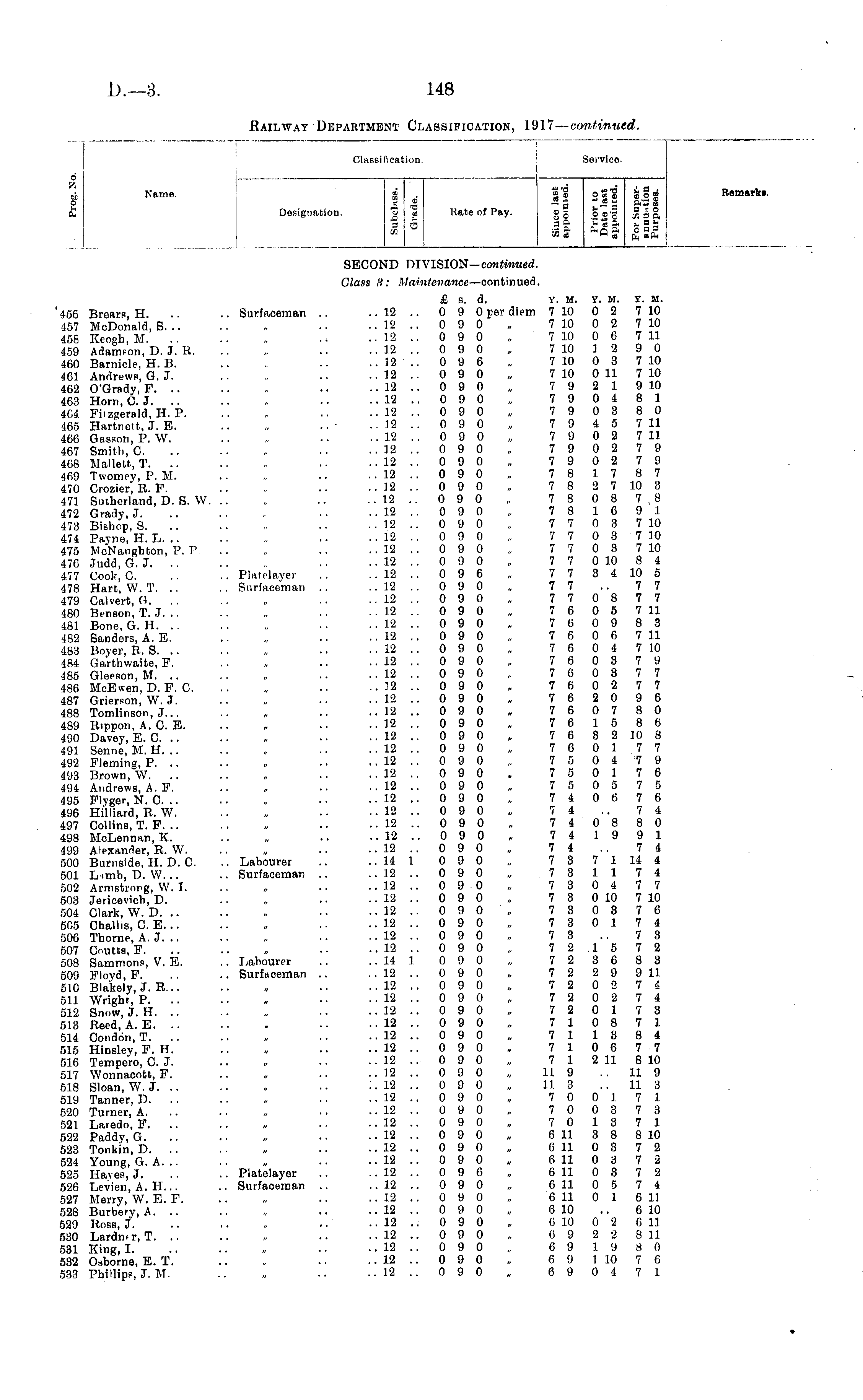 Classification. Service. oc Name, » o ( • £ Designation, o .3 Kate of Pay. 3 5 CO 0 y. SP c ft. c 03 .O £ 5 Kate of Pay. "" a 11 Si 5' ~ a II Si e. .£ 5 &3. k_.a 3 . o o o g -jx o a i.a >. a 6 ft Q a o a 3 H 03 ft »ft off 2 5"o £ p| Remarki SECOND DIVISION— continued. Class 3: Maintenance —continued. £ s. d. 456 Brears, H. .. .. Surfaoeman .. .. 12 .. 0 9 0 per diem 457 McDonald, S. .. .. „ •■ ..12 .. 0 9 0 458 Keogb, M. .. .. „ .. .. 12 .. 0 9 0 459 Adamson, D. J. R .. ...12 .. 0 9 0 400 Barnicle, H. B. .. ,. .. . .12 .. 0 9 6 461 Andrews, G. J. .. „ .. ..12 .. 0 9 0 462 O'Grady, F. .. .. ,, .. ..12 .. 0 9 0 463 Horn, O.J. .. .. ,. .. .. 12 .. 0 9 0 464, Fitzgerald, H. P. .. „ .. ..12 .. 0 9 0 465 Hartnoit, J. E. .. „ ..- ..12 .. 0 9 0 466 Gasson, P. W. .. „ .. .. 12 .. 0 9 0 467 Smith, 0. .. .. , •• .. 12 .. 0 9 0 468 Mallett, T. .. .. „ •• .. 12 .. 0 9 0 469 Twomey, P. M. .. „ .. .. 12 .. 0 9 0 470 Crozier, R. F. .. .. .. ..12 .. 0 9 0 471 Sutherland, D. S. W. .. „ .. ..12 .. 0 9 0 472 Grady, J .. .. 12 .. 0 9 0 473 Bishop, S .. .. 12 .. 0 9 0 474 Payne, H. L. .. .. „ .. .. 12 .. 0 9 0 475 McNanghton, P. P, .. „ .. ..12 .. 0 9 0 476 Judd,G. J. .. .. „ .. .. 12 .. 0 9 0 477 Cook, 0. .. •. Platelayer .. .. 12 .. 0 9 6 478 Hart, W. T. .. .. Surfaceman .. .. 12 .. 0 9 0 479 Calvert, G. .. „ .. . . 12 .. 0 9 0 480 Benson, T. J. .. .. „ .. .. 12 .. 0 9 0 481 Bone, G. H. .. .. „ •■ .. 12 .. 0 9 0 482 Sanders, A. E. .. „ .. . . 12 .. 0 9 0 483 Boyer, R. S .. . . 12 .. 0 9 0 484 Garthwaite, F. .. „ .. .. 12 . . 0 9 0 485 Gloeson, M. .. .. „ .. .. 12 .. 0 9 0 486 McEwen.D. F. C. .. „ ■• ..12 .. 0 9 0 487 Grierson, W. 3. .. „ .. ..12 .. 0 9 0 488 Tomlinson, J... .. „ .. ..12 .. 0 9 0 489 Rippon, A. 0. E. .. „ .. ..12 .. 0 9 0 490 Davey, E. 0. .. .. . ■ • .. 12 .. 0 9 0 491 Senne, M. H. .. .. „ .. .. 12 .. 0 9 0 492 Fleming, P. .. .. „ . • .. 12 .. 0 9 0 493 Brown, W. .. .. „ .. .. 12 .. 0 9 0 494 Andrews, A. F. .. „ .. .. 12 .. 0 9 0 495 Flyger, N. C. .. .. ,, .. ..12 .. 0 9 0 496 Hilliard, R. W. .. „ .. .. 12 .. 0 9 0 497 Collins, T. F. .. .". „ .. .. 12 .. 0 9 0 498 McLonnan, K. .. „ .. ..12 .. 0 9 0 499 Alexander, R. W. .. „ .. .. 12 .. 0 9 0 500 Burnside, II. D. C. .. Labourer .. ..14 1 0 9 0 501 Limb, D. W... .. Surfaceman .. ..12 .. 0 9 0 502 Armstrong, W. I. .. „ .. .. 12 .. 0 9 0 503 Jericevich, D. .. „ .. .. 12 .. 0 9 0 504 Clark, W. D. .. .. „ .. ..12 .. 0 9 0 505 Challis, CE. .. .. „ .. .. 12 .. 0 9 0 506 Thome, A. J •. .. 12 .. 0 9 0 507 Coutts, F. .. .. ,, • • .. 12 .. 0 9 0 508 Sammons, V. E. .. Labourer .. .. 14 1 0 9 0 509 Floyd, F. .. .. Surfaceman .. .. 12 .. 0 9 0 510 Blakely, J. R... .. ,, •• .. 12 .. 0 9 0 511 Wright, P. .. .. . .. .. 12 .. 0 9 0 512 Snow, J. H .. .. 12 .. 0 9 0 513 Reed, A. E. .. .. . •• .. 12 .. 0 9 0 514 Condon, T. .. .. „ .. .. 12 .. 0 9 0 515 Hinsley, F. H. .. „ .. .. 12 .. 0 9 0 516 Tempero, 0. J. .. ,, ■• ..12 .. 0 9 0 517 Wonnacott, F. .. „ .. ..12 .. 0 9 0 518 Sloan, W.J. .. .. „ .. .. .1.2 .. 0 9 0 519 Tanner, D. .. .. -, ■■ ..12 .. 0 9 0 520 Turner, A. .. „ • • .. 12 .. 0 9 0 „ 521 Laredo, F. .. .. „ •• .. 12 .. 0 9 0 522 Paddy, G. .. .. „ • • .. 12 .. 0 9 0 523 Tonkin, D. .. .. ,, .. .. 12 .. 0 9 0 524 Young, G. A. .. .. „ . • .. 12 .. 0 9 0 525 Haves, J. .. .. Platelayer .. .. 12 .. 0 9 6 526 Levien, A. H... .. Surfaoeman .. .. 12 .. 0 9 0 527 Merry, W. E. F .. .. 12 .. 0 9 0 528 Burbery, A. .. .. „ .. .. 12 .. 0 9 0 529 Ross, J. .. .. ,, .. .. 12 .. 0 9 0 „ 530 Lardmr, T. .. .. „ .. ..12 .. 0 9 0 531 King, I .. .. 12 .. 0 9 0 „ 532 Osborne, E. T. .. „ .. .. 12 .. 0 9 0 533 Phillips, J. M. .. „ .. .. 12 .. 0 9 0 „ Y. M. 7 10 7 10 7 10 7 10 7 10 7 10 7 9 7 9 7 9 7 9 7 9 7 9 7 9 7 8 7 8 7 8 7 8 7 7 7 7 7 7 7 7 7 7 7 7 7 7 7 6 7 6 7 6 7 6 7 6 7 6 7 6 7 6 7 6 7 6 7 6 7 6 7 5 7 5 7 5 7 4 7 4 7 4 7 4 7 4 7 3 7 3 7 3 7 3 7 3 7 3 7 3 7 2 7 2 7 2 7 2 7 2 7 2 7 1 7 1 7 1 7 1 11 9 11 3 7 0 7 0 7 0 6 11 6 11 6 11 6 11 6 11 6 11 6 10 (i .1,0 6 9 6 9 6 9 6 9 Y. M. Y. M. 0 2 7 10 0 2 7 10 0 6 7 11 12 9 0 0 3 7 10 0 11 7 10 2 1 9 10 0 4 8 1 0 3 8 0 4 5 7 11 0 2 7 11 0 2 7 9 0 2 7 9 17 8 7 2 7 10 3 0 8 7 8 16 9 1 0 3 7 10 0 3 7 10 0 3 7 10 0 10 8 4 3 4 10 5 7 7 0 8 7 7 0 5 7 11 0 9 8 3 0 6 7 1.1 0 4 7 10 0 8 7 9 0 3 7 7 0 2 7 7 2 0 9 6 0 7 8 0 15 8 6 3 2 10 8 0 1 7 7 0 4 7 9 0 1 7 6 0 5 7 5 0 6 7 6 7 4 0 8 8 0 19 9 1 7 4 7 1 14 4 117 4 0 4 7 7 0 10 7 10 0 3 7 6 0 1 7 4 7 3 .15 7 2 3 6 8 3 2 9 9 11 0 2 7 4 0 2 7 4 0 17 3 0 8 7 1 13 8 4 0 6 7 7 2 11 8 10 .. 11 9 .. 11 3 0 17 1 0 3 7 3 18 7 1 3 8 8 10 0 3 7 2 0 3 7 2 0 3 7 2 0 5 7 4 0 1 6 11 6 10 0 2 0 11 2 2 8 11 19 8 0 1 10 7 6 0 4 7 1 •