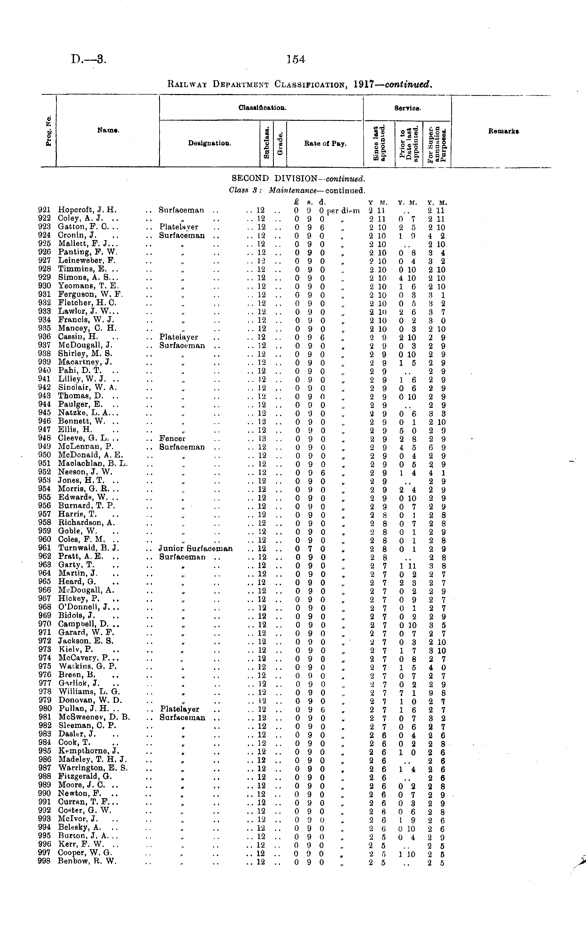 Classification. Service. 6 X, ft Nam*. m a •o g in IS3 00 oS o_lJ * OS S ft. ~ a Be'g J" 3 & tit 00 O S3 O ji a a *. a B gap S «ft Remarks Designation. 0 in oi 5 Rate of Pay. SECOND DIVISION- continued. Class 3: Maintenance— continued. 921 Hoporoft, J. H. 922 Goley, A. J. 923 Gatton, F. 0. .. 924 Cronin.J. 925 Mallet., F.J... 926 Panting, F. W. 927 Leineweber, F. 928 Timmins, E. .. 929 Simons, A. S... 930 Yeomans, T. E. 931 Ferguson, W. F. 932 Fletcher, H. 0. 933 Lawlor, J. W... 934 Francis, W. J. 935 Mancey, 0. H. 936 Cassin, H. 937 McDougall, J. 938 Shirley, M. S. 939 Maoartney, J, 940 Pahi, D. T. 941 Lilley, W, J. .. 942 Sinclair, W. A. 943 Thomas, D. .. 944 Paulger, E. .. 945 Natzke, L. A... 946 Bennett, W. .. 947 Ellis, H. 948 Gleeve, G. L. .. 949 McLennau, P. 950 McDonald, A. E. 951 Maolacblan, B. L. 952 Neeson, J. W. 953 Jones, H. T. 954 Morris, G. R. .. 955 Edwards, W. .. 956 Burnard, T. P. 957 Harris, T. 958 Richardson, A. 959 Goble, W. 960 Coles, F. M. .. 961 Turnwald, B. J. 962 Pratt, A. E. 963 Garty, T. 964 Martin, J. 965 Heard, G. 966 McDougall, A. 967 Hickey, P. .. 968 O'Donnell, J. .. 969 Bidois, J. 970 Camp Dell, D. .. 971 Garard, W. F. 972 Jackson. E. S. 973 Kielv, P. 974 McCavery, P... 975 Walking, G. P. 976 Breen, B. 977 Garliok, J. 978 Williams, L. G. 979 Donovan, W. D. 980 Pullan, J. H. .. 981 McSweenev, D. B. 982 Sleeman, C P. 983 Dasler, J. 984 Cook, T. 985 Kimpthorne, J. 986 Madeley, T. H. J. 987 Warrington, E. S. 988 Fitzgerald, G. 989 Moore, J.C. .. 990 Newton, F. .. 991 Curran, T. F... 992 Coster, G. W. 993 Mclvor, J. 994 Belesky, A. .. 995 Burton, J. A. .. 996 Kerr, F. W. 997 Cooper, W. G. 998 Benbow, R. W. £ s. d. Y M. .. Surfaceman .. . . 12 0 9 0 per diem 2 11 .. 12 .. 0 9 0 „ 2 11 .. Platelayer .. .. 12 .. 0 9 6 „ 2 10 .. Surfaceman .. .. 12 .. 0 9 0 „ 2 10 .. 12 .. 0 9 0 . 2 10 .. 12 .. 0 9 0 , 2 10 .. 12 .. 0 9 0 „ 2 10 .. 12 .. 0 9 0 „ 2 10 .. 12 .. 0 9 0 „ 2 10 .. 12 .. 0 9 0 „ 2 10 .. 12 .. 0 9 0 „ 2 10 .. 12 .. 0 9 0 „ 2 10 .. 12 .. 0 9 0 „ 2 10 .. 12 .. 0 9 0 „ 2 10 .. 12 .. 0 9 0 „ 2 10 .. Platelayer .. .. 12 .. 0 9 6 „ 2 9 .. Surfaceman .. .. 12 .. 0 9 0 , 2 9 .. 12 .. 0 9 0 „ 2 9 .. 12 .. 0 9 0 „ 2 9 12 .. 0 9 0 „ 2 9 .. 12 .. 0 9 0 „ 2 9 . . 12 .. 0 9 0 „ 2 9 .. 12 .. 0 9 0 „ 2 9 .. 12 .. 0 9 0 „ 2 9 .. 12 .. 0 9 0 „ 2 9 .. 12 .. 0 9 0 „ 2 9 .. 12 .. 0 9 0 „ 2 9 .. Fencer .. .. 13 .. 0 9 0 „ 2 9 .. Surfaceman .. .. 12 .. 0 9 0 „ 2 9 ..12 .. 0 9 0 „ 2 9 .. 12 .. 0 9 0 . 2 9 .. 12 .. 0 9 6 „ 2 9 .. 12 .. 0 9 0 „ 2 9 .. 12 .. 0 9 0 „ 2 9 .. 12 .. 0 9 0 „ 2 9 .. 12 .. 0 9 0 , 2 9 .. 12 .. 0 9 0 . 2 8 .. 12 .. 0 9 0 „ 2 8 .. 12 .. 0 9 0 „ 2 8 .. 12 .. 0 9 0 „ 2 8 .. Junior Surfaceman .. 12 .. 0 7 0 „ 2 8 .. Surfaceman .. ..12.. 090 „ 28 .. 12 .. 0 9 0 „ 2 7 .. 12 .. 0 9 0 „ 2 7 .. 12 .. 0 9 0 „ 2 7 .. 12 .. 0 9 0 „ 2 7 .. 12 .. 0 9 0 „ 2 7 .. 12 .. 0 9 0 „ 2 7 ..12.. 090 . 27 .. 12 .. 0 9 0 „ 2 7 .. 12 .. 0 9 0 „ 2 7 .. 12 .. 0 9 0 ..' 2 7 .. 12 .. 0 9 0 , 2 7 .. 12 .. 0 9 0 . 2 7 .. 12 .. 0 9 0 „ 2 7 .. 12 .. 0 9 0 . 2 7 .. 12 .. 0 9 0 „ 2 7 .. 12 .. 0 9 0 „ 2 7 .. 12 .. 0 9 0 „ 2 7 . . Platelayer .. ..12.. 096 „ 27 .. Surfaceman .. .. 12 .. 0 9 0 . 2 7 .. 12 .. 0 9 0 , 2 7 .. 12 .. 0 9 0 „ 2 6 .. 12 .. 0 9 0 „ 2 6 ..12..090 „ 26 .. 12 .. 0 9 0 „ 2 6 .. 12 .. 0 9 0 . 2 6 .. 12 .. 0 9 0 „ 2 6 .. 12 .. 0 9 0 „ 2 6 .. 12 .. 0 9 0 „ 2 6 .. 12 .. 0 9 0 „ 2 6 .. 12 .. 0 9 0 „ 2 6 .. 12 .. 0 9 0 , 2 0 .. 12 .. 0 9 0 „ 2 6 .. 12 .. 0 9 0 „ 2 5 .. 12 .. 0 9 0 „ 2 5 .. 12 .. 0 9 0 . 2 5 .. 12 .. 0 9 0 „ 2 5 Y. M. 0*7 2 5 1 9 0 8 0 4 0 10 4 10 1 6 0 3 0 5 2 6 0 2 0 3 2 10 0 3 0 10 1 5 i"e 0 6 0 10 o'~6 0 1 5 0 2 8 4 5 0 4 0 5 1 4 2"4 0 10 0 7 0 1 0 7 0 1 0 1 0 1 1 11 0 2 2 3 0 2 0 9 0 1 0 2 0 10 0 7 0 3 1 7 0 8 1 5 0 7 0 2 7 1 1 0 1 6 0 7 0 6 0 4 0 2 1 0 l"_ o"2 0 7 0 3 0 6 1 9 0 10 0 4 1 10 Y. M. 2 11 2 11 2 10 4 2 2 10 3 4 3 2 2 10 2 10 2 10 8 1 3 2 8 7 3 0 2 10 2 9 2 9 2 9 2 9 2 9 2 9 2 9 2 9 2 9 3 3 2 10 2 9 2 9 6 9 2 9 2 9 4 1 2 9 2 9 2 9 2 9 2 8 2 8 2 9 2 8 2 9 2 8 3 8 2 7 2 7 2 9 2 7 2 7 2 9 3 5 2 7 2 10 3 10 2 7 4 0 2 7 2 9 9 8 2 7 2 7 3 2 2 7 2 6 2 8 2 6 2 6 2 6 2 6 2 8 2 9 2 9 2 8 2 6 2 6 2 9 2 5 2 5 2 5
