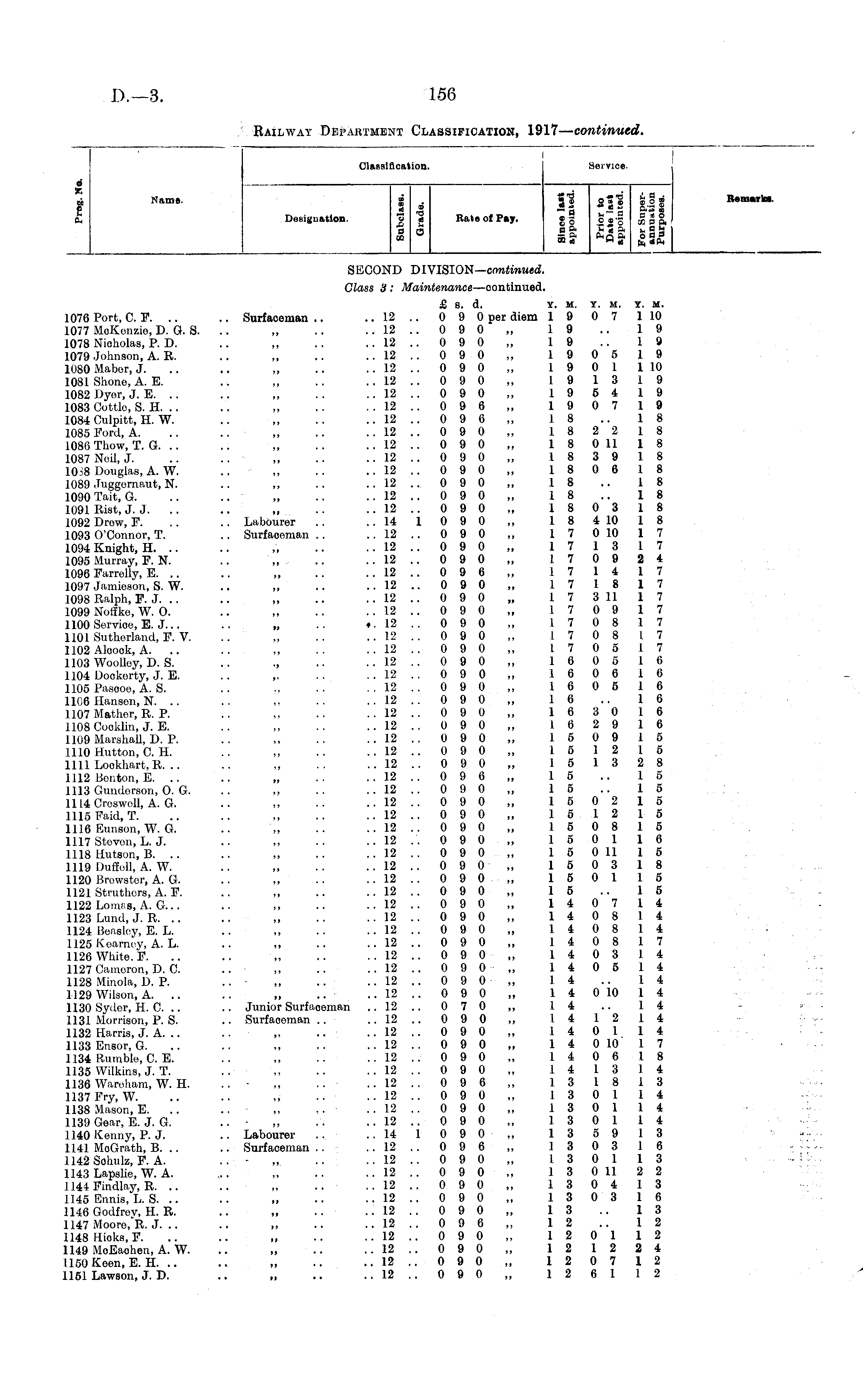Classification. Service. a 'A ft Name. Designationrjo m _ _ P V •a a) 0 Rate ot Pay. --a 52 " n oo ~ «* , a ■2SS a .Sii'o i" * & 1.2 i ft*. B0 0 _ o a; a a o a a „«ft Remark*. SECOND DIVISION—continued. Class 3 : Maintenance —continued. 1076 Port, C... 1077 MoKenzie, D. G. S. 1078 Nicholas, P. D. 1079 Johnson, A. R. 1080 Mabor, J. 1081 Shone, A. E. 1082 Dyor, J. E. 1083 Cottlo, S. H. .. 1084 Culpitt, H. W. 1085 Ford, A. 1086 Thow, T. G. .. 1087 Neil, J. 1038 Douglas, A. W. 1089 Juggernaut, N. 1090 Tait, G. 1091 Rist, J. J. 1092 Drew, F. 1093 O'Connor, T. 1094 Knight, H. .. 1095 Murray, F. N. 1096 Farrolly, E. .. 1097 Jamioson, S. W. 1098 Ralph, F. J. 1099 Nofiko, W. O. 1100 Service, E. J... 1101 Sutherland, F. V. 1102 Aloook, A. .. 1103 Woolley, D. S. 1104 Dockerty, J. E. 1105 Pascoo, A. S. 1106 Hansen, N. .. 1107 Mathor, R. P. IlOSCooklin, J. E. 1109 Marshall, D. P. HIOHutton, C. H, 111.1 Lockhart,R. .. 1112 Benton,E. .. 1113 Gundorson, O. G. 1114 0-eswell, A. G. 1115 Paid, T. 1116 Eunson, W. G. 1117 Stovon, L. J. 1118 Hutson, B. .. 1119 Duffell, A. W. 1120 Brewster, A. G. 1121 Struthers, A. F. 1122 Lomf-, A. G... 1123 Lund, J. R. .. 1124 Beasley, E. L. 1.125 Kearney, A. L. 1126 White, F. 1127 Cameron, D. O. 1128 Minola, I). P. 1129 Wilson, A. .. 1130 Sydor, H. C .. 1131 Morrison, P. S. 1132 Harris, J. A. .. 1133 Ensor, G. 1134 Rumble, C. E. 1135 Wilkins, J. T. 1136 Wareham, W. H. .1137 Fry, W. 1138 Mason, E. 1139 Gear, E. J. G. 1140 Kenny, P. J. 1141 MoGrath, B. .. 114- Sokulz, P. A. 1143 Lapslie, W. A. 1144-indJay, R. .. 1145 Ennis, L. S. .. 1146 Godfrey, H. R. 1147 Moore, R. J. .. 1148 Hicks, F. 1149 MoEaohen, A. W. 1150 Keen, E. H. .. 1151 Lawson, J. D. £ S. d. Y. M. Y. M. Y. M. .. Surfaceman .. .. 12 .. 0 9 0 per diem 19 0 7 1 10 .. 12 .. 0 9 0 19 .. 19 .. 12 .. 0 9 0 ,, 19 .. 19 .. 12 .. 0 9 0 19 0 5 19 .. 12 .. 0 9 0 I 9 0 1 1 10 .. 12 .. 0 9 0 19 13 19 .. 12 .. 0 9 0 19 5 4 19 ,.12 „ 0 9 6 „ 19 0 7 19 .. 12 .. 0 9 6 18 .. 18 .. 12 .. 0 9 0 18 2 2 18 .. 12 .. 0 9 0 „ 1 8 0 11 1 8 .. ,, .. .. 12 .. 0 9 0 18 3 9 18 „ 12 ,,0 90 „ 18 0 6 18 .. 12 .. 0 9 0 18 .. 18 .. 12 .. 0 9 0 18 .. 18 .. 12 .. 0 9 0 18 0 3 18 .. Labourer .. 14 1 0 9 0 1 8 4 10 1 8 .. Surfaoeman .. . . 12 .. 0 9 0 „ 1 7 0 10 1 7 .. 12 .. 0 9 0 17 13 17 „ .. .. 12 .. 0 9 0 „ 17 0 9 2 4 .. 12 .. 0 9 6 „ 17 14 17 .. 12 .. 0 9 0 17 18 17 ,.12 ... 0 9 0 „ I 7 3 11 1 7 ..12.. 090,, 17 09 17 .. 12 .. 0 9 0 ,, 17 0 8 17 .. 12 . . 0 9 0 ,, 17 0 8 I. 7 . . 12 .. 0 9 0 17 0 5 17 . . 12 .. 0 9 0 16 0 5 16 . . 12 . . 0 9 0 16 0 6 16 . . 12 . . 0 9 0 16 0 5 16 . . 12 .. 0 9 0 16 .. 16 .. 12 .. 0 9 0 16 3 0 16 . 12 .. 0 9 0 16 2 9 16 .. 12 .. 0 9 0 15 0 9 15 . 12 .. 0 9 0 15 12 15 .. 12 .. 0 9. 0 „ 15 13 2 8 .. 12 . . 0 9 6 15 .. 15 .. 12 .. 0 9 0 15 .. 15 .. 12 .. 0 9 0 „ 15 0 2 15 .. 12 .. 0 9 0 ,, 15 12 15 .. 12 .. 0 9 0 15 0 8 15 .. 12 .. 0 9 0 „ 15 0 116 .. 12 .. 0 9 0 „ 1 5 0 11 15 .. 12 .. 0 9 0 „ 15 0 3 18 .. 12 .. 0 9 0 „ 15 0 1 15 .. 12 .. 0 9 0 15 .. 15 ..12.. 090,, 1407 14 .. 12 .. 0 9 0 14 0 8 14 .. 12 .. 0 9 0 14 0 8 14 .. 12 .. 0 9 0 14 0 8 17 .. 12 .. 0 9 0 ■ ,, 14 0 3 14 .. ,, .. .. 12 .. 0 9 0- ,, 14 0 5 14 .. „ .. .. 12 .. 0 9 0 ■ „ 14 .. 14 .. 12 .. 0 9 0 ,, 1 4 0 10 1 4 .. Junior Surfaceman .. 12 .. 0 7 0 „ 14 .. 14 .. Surfaoeman .. .. 12 .. 0 9 0 „ 14 12 14 .. 12 .. 0 9 0 „ 14 0 1 14 .. 12 . . 0 9 0 ,, 1 4 0 10 1 7 .. 12 .. 0 9 0 14 0 6 18 .. 12 .. 0 9 0 „ 14 13 14 .. - ,, .. .. 12 .. 0 9 6 ,, 13 18 13 .. 12 .. 0 9 0 13 0 114 .. ,, .. .. 12 .. 0 9 0 „ 13 0 1 14 .. - ,, .. .. 12 .. 0 9 0 ,, 13 0 114 .. Labourer .. ..14 1 090,, 13 59 13 .. Surfaceman .. .. 12 . . 0 9 6 „ 13 0 3 16 .. - „ .. .. 12 .. 0 9 0 „ 13 0 113 .. 12 .. 0 9 0 13 0 11 2 2 .. .. 12 .. 0 9 0 13 0 4 13 .. 12 .. 0 9 0 13 0 3 16 .. 12 .. 0 9 0 13 .. 13 .. 12 .. 0 9 6 12 .. 12 .. 12 .. 0 9 0 12 0 112 .. 12 .. 0 9 0 12 12 2 4 .. 12 .. 0 9 0 „ 12 0 7 12 „ .. .. 12 .. 0 9 0 12 6 112