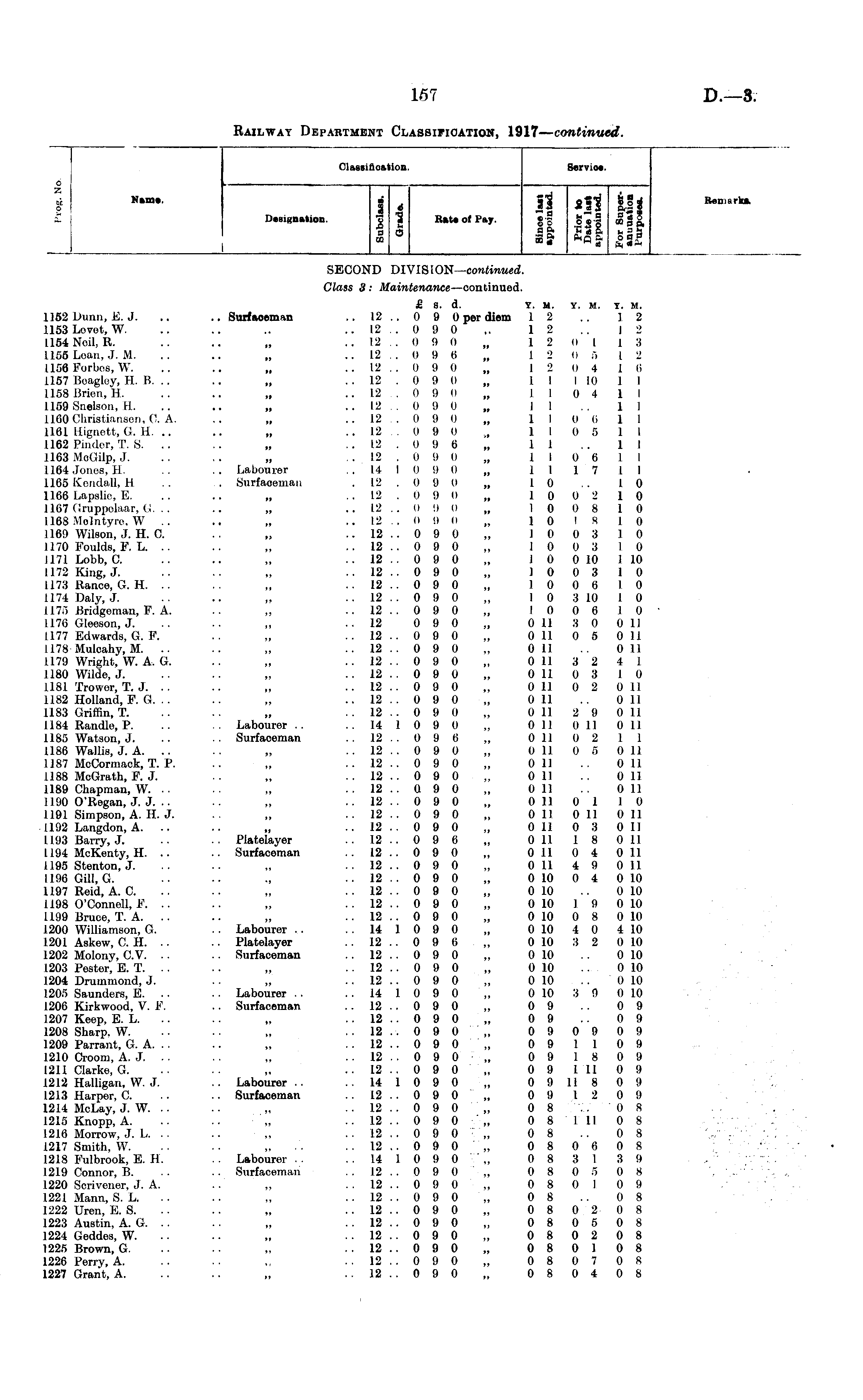 ClaBBiflc&tion. Servioa. z s Mam*. I go I it ft Is! Remark* Designation. Rat* of Pay. SECOND DIVISION- continued. Glass 3 : Maintenance —continued. 1152 Dunn, E. J. 1153 Lovot, W. 1164 Neil, R. 1155 Lean, J. M. [156 Forbes, W. 1157 Boagley, H. B. .. 1158 Brien, H. 1159 Snelson, H. 1160 Christiansen, C. A. 1161 liignett, G. H. 1162 Pinder, T. S. 1163 MoGilp, J. 1164Jonos, H. 1165 Kondall, H 1166 Lapslie, E, 1167 Oruppolaar, Q. .. 1168 Molntyro, W .. 1169 Wilson, J. H. C. 1170 Foulds, F. L. .. 1171 Lobb, C. 1172 King, J. 1173 Ranee, G. H. 1174 Daly, J. 1175 Bridgeman, F. A. 1176 Gleeson, J. 1177 Edwards, G. F. 1178 Mulcahy, M. .. 1179 Wright, W. A, G. 1180 Wilde, J. 1181 Trower, T. J. . . 1182 Holland, F. G. . . 1183 Griffin, T. 1184 Randle, P. 1185 Watson, J. 1186 Wallis, J. A. 1187 McCormaok, T. P. 1188 McGrath, F. J. 1189 Chapman, W. •. 1190 O'Regan, J. J. .. 1191 Simpson, A. H. J. 1192 Langdon, A. 1193 Barry, J. 1194 McKenty, H. .. 1195 Stenton, J. 1196 Gill, G. 1197 Reid, A. C. 1198 O'Connell, F. .. 1199 Bruee, T. A. .. 1200 Williamson, G. 1201 Askew, C. H. 1202 Molony, C.V. .. 1203 Pester, E. T. 1204 Drummond, J. 1205 Saunders, E. .. 1206 Kirkwood, V. F. 1207 Keep, E. L. 1208 Sharp, W. 1209 Parrant, G. A. . . 1210 Croom, A. J. 1211 Clarke, G. 1212 Halligan, W. J. 1213 Harper, C. 1214 McLay, J. W. 1215 Knopp, A. 1216 Morrow, J. L. 1217 Smith, W. 1218 Fulbrook, E. H. 1219 Connor, B. 1220 Scrivener, J. A. 1221 Mann, S. L. 1222 Uren, E. S. 1223 Austin, A. G. 1224 Geddes, W. 1225 Brown, G. 1226 Perry, A. 1227 Grant, A. .. Surfaoeman • • ,, • • f» • ■ ,, • • »» .. Labourer Surfaoeman • • ,» • • ,» • • ,, ■ • ,, • • ,, . . Labourer .. Surfaceman . . Platelayer Surfaceman . . Labourer .. .. Platelayer Surfaceman • • ,, Labourer .. Surfaceman Labourer . ■ .. Surfaceman Labourer •. Surfaceman £ s. d. y. m. y. m. y. m. .. 12 .. 0 9 0 per diem 12 .. 12 .. 12 . . 0 9 0 ,. 12 .. 12 .. 12 .. 0 9 0 „ 1 2 (I 1 13 .. 12 . . 0 9 6 „ 12 0;") [2 .. 12 . . 0 9 0 „ 12 0 4 1 (i .. 12 . 0 9 0 „ 11 I 10 11 .. 12 ., 0 0 0 „ 11 0 4 II .. 12 . . 0 9 0 „ II . . 11 .. 12 .. 0 9 0 „ 11 (t (i 11 .. 12 .. 0 9 0 , 11 0 5 11 .. 12 . 0 9 6 „ 11 .. II . . 12 . 0 9 0 „ 110 6 11 . . 14 I 0 !) 0 „ 1117 11 . 12 . 0 9 0 „ 10 .. 10 .. 12 . 0 9 0 „ 10 0 2 10 .. L2 . . u 9 (I „ 10 0 8 10 .. 12 .. 0 !) (I „ 10 IS 10 .. 12..090 „ 10 03 10 .. 12 . . 0 9 0 „ 10 0 3 10 .. 12 .. 0 9 0 „ 10 0 10 1 10 .. 12..090 „ 10 03 10 .. 12..090 „ 10 06 10 .. 12 .. 0 9 0 „ 10 3 10 10 .. 12 . . 0 9 0 „ 10 0 6 10 ..12 0 9 0 „ 0 11 3 0 0 11 .. 12 .. 0 9 0 „ 0 11 0 5 0 11 .. 12 .. 0 9 0 „ 0 11 .. 0 11 .. 12 . . 0 9 0 „ 0 11 3 2 4 J .. 12 . . 0 9 0 „ 0 11 0 3 10 .. 12 .. 0 9 0 „ 0 11 0 2 0 11 .. 12 .. 0 9 0 „ 0 11 .. 0 11 .. 12 .. 0 9 0 „ 0 11 2 9 0 11 .. 14 1 0 9 0 „ 0 11 0 11 0 11 .. 12 . . 0 9 6 „ 0 11 0 2 11 .. 12 .. 0 9 0 „ 0 11 0 5 0 11 .. 12 .. 0 9 0 „ 0 11 .. 0 11 .. 12 . . 0 9 0 „ 0 11 .. 0 11 .. 12 .. Q 9 0 „ 0 11 .. 0 11 .. 12 .. 0 9 0 „ 0 11 0 1 10 .. 12 .. 0 9 0 „ 0 11 0 11 0 11 .. 12 .. 0 9 0 „ 0 11 0 3 0 11 .. 12 .. 0 9 6 „ 0 11 18 0 11 .. 12 .. 0 9 0 „ 0 11 0 4 0 11 .. 12 .. 0 9 0 „ 0 11 4 9 0 11 .. 12 .. 0 9 0 „ 0 10 0 4 0 10 .. 12 .. 0 9 0 „ 0 10 .. 0 10 . . 12 .. 0 9 0 „ 0 10 1 9 0 10 .. 12 .. 0 9 0 „ 0 10 0 8 0 10 .. 14 1 0 9 0 „ 0 10 4 0 4 10 .. 12 .. 0 9 6 „ 0 10 3 2 0 10 .. 12 .. 0 9 0 „ 0 10 . . 0 10 .. 12 .. 0 9 0 „ 0 10 .. 0 10 .. 12 .. 0 9 0 „ 0 10 .. 0 10 .. 14 1 0 9 0 „ 0 10 3 9 0 10 .. 12.090 „ 09 .. 09 .. 12..090 „ 09 .. 09 .. 12 .. 0 9 0 „ 0 9 0 9 0 9 .. 12 .. 0 9 0 „ 09 11 09 .. 12 .. 0 9 0 • „ 0 9 18 0 9 .. 12 .. 0 9 0 „ 0 9 1 11 0 9 .. 14 1 0 9 0 „ 0 9 11 8 0 9 .. 12 . . 0 9 0 „ 0 9 12 0 9 .. 12 .. 0 9 0 „ 0 8 . . 0 8 .. 12 .. 0 9 0 ' „ 0 8 1 11 0 8 .. 12 .. 0 9 0 "■'„ 0 8 .. 0 8 .. 12.. 090,, 08 06 08 .. 14 1 0 9 0 "■■„ 0 8 3 1 3 9 .. 12 .. 0 9 0 „ 0 8 0 5 0 8 . . 12 .. 0 9 0 „ 0 8 0 1 0 9 .. 12..090 „ 08 .. 08 .. 12..090 „ 08 02 08 .. 12..090 „ 08 05 08 .. 12..090 „ 08 02 08 .. 12..090 „ 08 01 08 .. 12..090 „ 08 07 OS .. 12..090 „ 08 04 08 -
