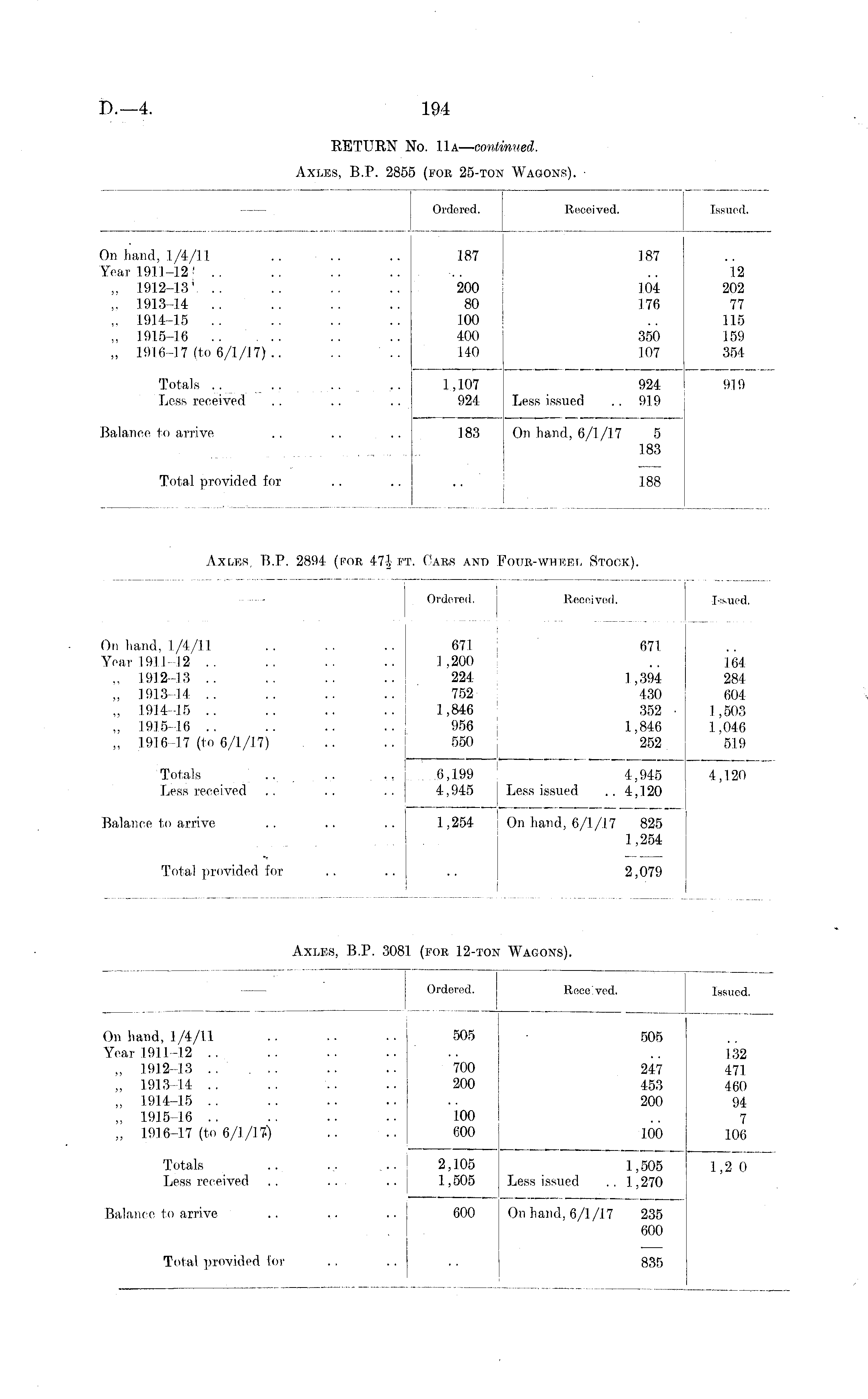 Axles, B.P. 2855 (for 25-ton Wagons). Ordered. Received. Ordered. Received. Issued. On hand, 1/4/11 .... .. 187 187 Year 1911-121 .. „ 1912-13' .. .. .. .. 200 104 ,. 1918-14 .. .. .. .. 80 176 „ 1914-15 .. .. .. .. 100 „ 1915-16 ..... .. .. 400 350 „ 1916-17 (to 6/1/17) .. .... 140 107 187 200 80 100 400 140 187 104 176 12 202 77 115 159 354 350 107 , _____ _ ,. Totals .. .. .... ... 1,107 924 Less received .. .. .. 924 Less issued .. 919 1,107 924 Less issued 924 919 — 919 Balance to arrive .. .. .. 183 On hand, 6/1/17 5 183 Total provided for . . .. .. 188 Axles B.P. 2894 (kor 4-7-1 ft. Cars and Four-wheel Stock). Ordered. Received. Issued, On hand. 1/4/11 .. .. .. 671 671 Year 1911 12 .. .. .. .. 1 ,200 „ .1912-13 .. .. .. .. 224 1,394 „ 1913-14 .. .. .. .. 752 430 „ 191415 .. .. .. .. 1,846 352 ■ „ 1915-16 .. .. .. •• 956 1,846 „ 1916 17 (io 6/1/17) ... .. 550 252 164 284 604 1 ,503 1,046 519 Totals .. ... ., 6,199 4,945 Less received .. .. .. 4,945 Less issued .. 4,120 4,120 Balance to arrive .. .. .. 1,254 On hand, 6/1/17 825 1,254 Total provided for .. .. .. 2,079 I i Axles, B.P. 3081 (for 12-ton Wagons). Ordered. Received. Ordered. Received. Issued. On hand, 1/4/11 .. -- •• 505 505 Year 1911-12 .. „ 1912 13 .. ... .. .. 700 247 „ 1913-14 .. .. .. .. 200 453 „ 1914-15 .. .. .. .. .. 200 „ 1915-16 .. .. .. .. 100 „ 1916 17 (to 6/1/17-') .. .. 600 100 505 700 200 505 247 453 200 132 471 460 94 7 106 100 COO 100 Totals .. ... .... J 2,105 1,505 Less received .. .. . . 1 ,505 Less issued . . 1 ,270 2,105 1 ,505 Less issued 1,505 .. 1,270 1,2 0 Balance to arrive .. .. .. 600 On hand, 6/1/17 235 600 On hand, 6/1/17 235 600 600 Total provided for .. .. .. 835 835