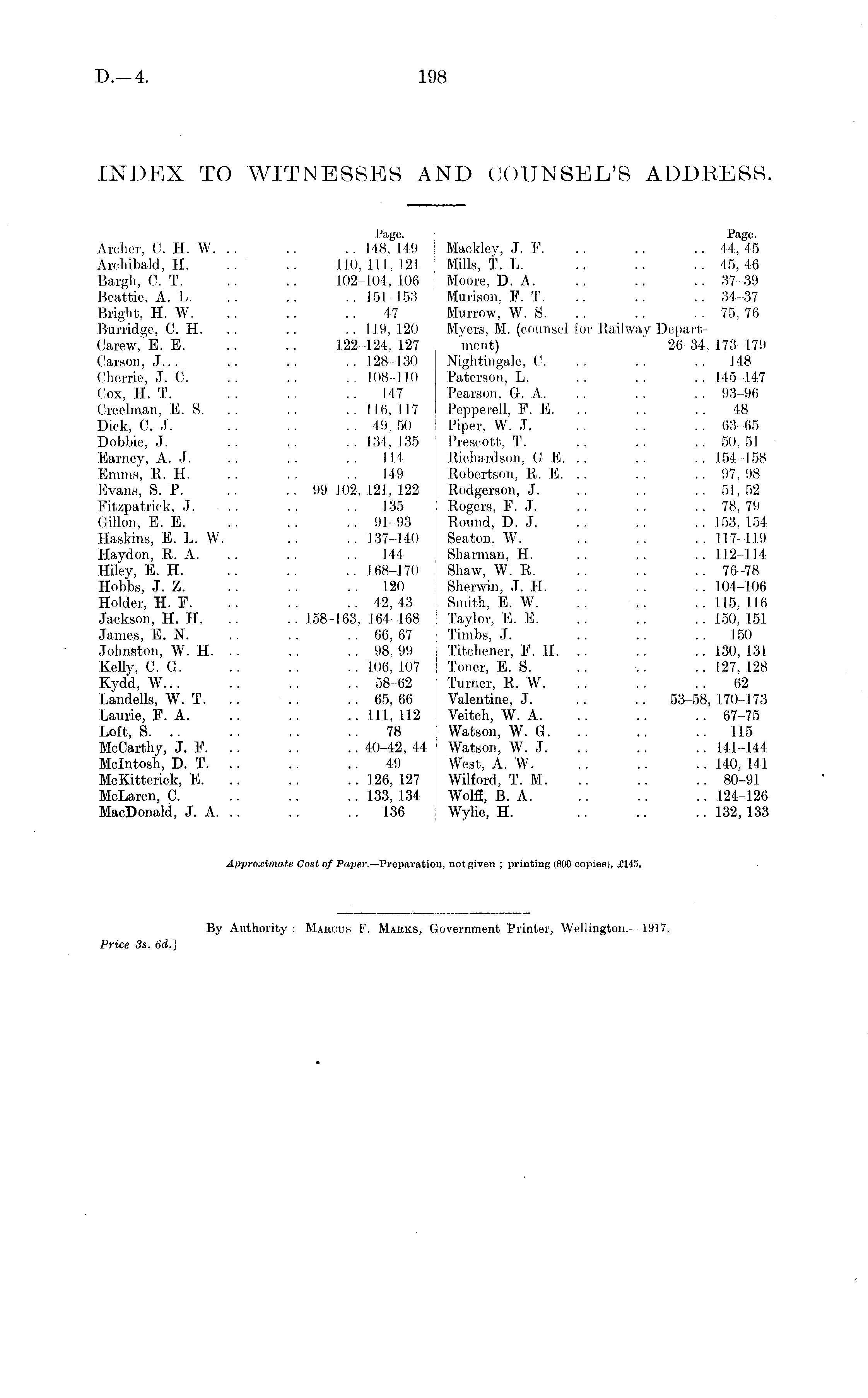 Pago. Mackley, J. F. .. .. .. 44, 45 Mills, T. L. .. .. .. 45, 46 Moore, D. A. .. .. .. 37-39 Murison, F. T. .. .. .. 34-37 Murrow, W. S. .. .. . . 75, 76 Myers, M. (counsel for Railway Department) 26-34, 173-179 Nightingale, C. . . . . 148 Paterson, L. .. .. .. 145-147 Pearson, G. A. .. . . . . 93-96 Peppereil, F. E. . . . . . . 48 Piper, W. J. .. .. .. 63 65 Prescott, T. .. .. .. 50, 51 Richardson, IJ B. ~ .. .. 154-158 Robertson, R. E. .. .. .. 97, 98 Uodgerson, J. .. .. ..51,52 Rogers, F. J. .. . . . . 78, 79 Round, D. J. .. .. .. 153, 154 Seaton. W. .. .. .. 117-119 Sharman, H. .. .. ..112 114 Shaw, W. R. .. .. .. 76-78 Sherwin, J. H. .. . . . . 104-106 Smith, E. W. .. ' .. .. 115, 116 Taylor, E. E. . . .. . . 150, 151 Timbs, J. .. .. .. 150 Titchener, F. H. .. .. .. 130, 131 Toner, E. S. .. .. ..127, 128 Turner, R. W. .. .. .. 62 Valentine, J. . . .. 53-58, 170-173 Veitch, W. A. .. .. .. 67-75 Watson, W. G 115 Watson, W. J. .. .. .. 141-144 West, A. W. . . .. .. 140, 141 Wilford, T. M. .. .. .. 80-91 Wolff, B. A. .. .. .. 124-126 Wylie, H. .. .. .. 132, 133