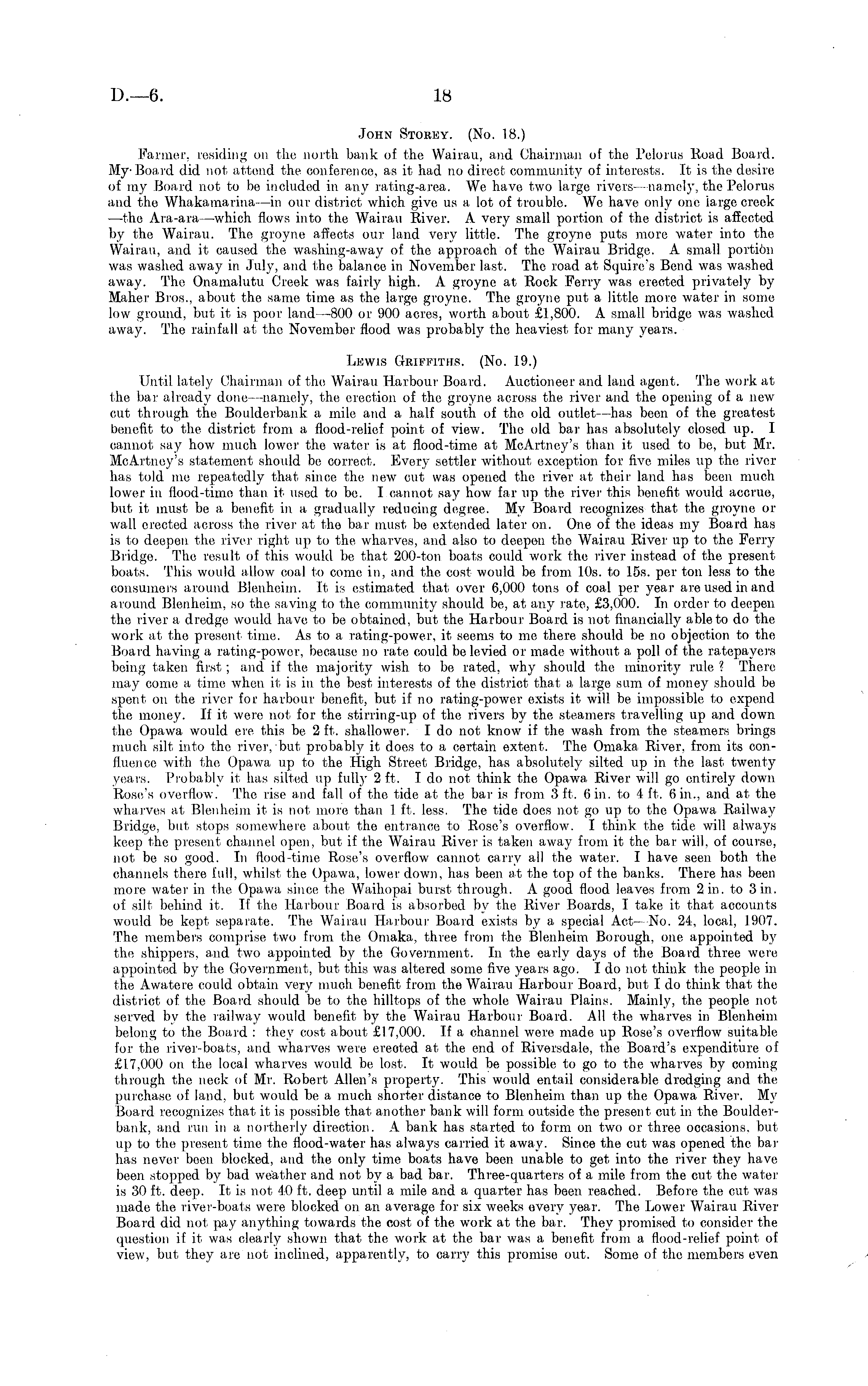 John Storey. (No. 18.) Farmer, residing on the north bank of the Wairau, and Chairman of the Pelorus Road Board. My-Board did not attend the conference, as it had no direct community of interests. It is the desire of my Board not to be included in any rating-area. We have two large rivers—namely, the Pelorus and the Whakamarina —in our district which give us a lot of trouble. We have only one large creek —the Ara-ara—-which flows into the Wairau River. A very small portion of the district is affected by the Wairau. The groyne affects our land very little. The groyne puts more water into the Wairau, and it caused the washing-away of the approach of the Wairau Bridge. A small porti6n was washed away in July, and the balance in November last. The road at Squire's Bend was washed away. The Onamalutu Creek was fairly high. A groyne at Rock Ferry was erected privately by Maher Bros., about the same time as the large groyne. The groyne put a little more water in some low ground, but it is poor land—Boo or 900 acres, worth about £1,800. A small bridge was washed away. The rainfall at the November flood was probably the heaviest for many years. Lewis Griffiths. (No. 19.) Until lately Chairman of the Wairau Harbour Board. Auctioneer and land agent. The work at the bar already done—namely, the erection of the groyne across the river and the opening of a new cut through the Boulderbank a mile and a half south of the old outlet —has been of the greatest benefit to the district from a flood-relief point of view. The old bar has absolutely closed up. I cannot say how much lower the water is at flood-time at McArtncy's than it used to be, but Mr. McArtnoy's statement should be correct. Every settler without exception for five miles up the river has told me repeatedly that since the new cut was opened the river at their land has been much lower in flood-time than it used to bo. I cannot say how far up the river this benefit would accrue, but it must be a benefit in a gradually reducing degree. My Board recognizes that the groyne or wall erected across the river at the bar must be extended later on. One of the ideas my Board has is to deepen the river right up to the wharves, and also to deepen the Wairau River up to the Ferry Bridge. The result of this would be that 200-ton boats could work the river instead of the present boats. This would allow coal to come in, and the cost would be from 10s. to 15s. per ton less to the consumers around Blenheim. It is estimated that over 6,000 tons of coal per year are used in and around Blenheim, so the saving to the community should be, at any rate, £3,000. In order to deepen the river a dredge would have to be obtained, but the Harbour Board is not financially able to do the work at the present time. As to a rating-power, it seems to me there should be no objection to the Board having a rating-power, because no rate could be levied or made without a poll of the ratepayers being taken first; and if the majority wish to be rated, why should the minority rule ? There may come a time when it is in the best interests of the district that a large sum of money should be spent on the river for harbour benefit, but if no rating-power exists it will be impossible to expend the money. If it were not for the stirring-up of the rivers by the steamers travelling up and down the Opawa would ere this be 2 ft. shallower. Ido not know if the wash from the steamers brings much silt into the river, but probably it does to a certain extent. The Omaka River, from its confluence with the Opawa up to the High Street Bridge, has absolutely silted, up in. the last twenty years. Probably it has silted up full)' 2 ft. Ido not think the Opawa. River will go entirely down Rose's overflow. The rise and fall of the tide at the bar is from 3 ft. 6 in. to 4 ft. 6 in., and at the wharves at Blenheim it is not more than 1 ft. less. The tide docs not go up to the Opawa Railway Bridge, but stops somewhere about the entrance to Rose's overflow. I think the tide will always keep the present channel open, but if the Wairau River is taken away from it the bar will, of course, not be so good. In flood-time Rose's overflow cannot carry all the water. I have seen both the channels there full, whilst the Opawa, lower down, has been at the top of the banks. There has been more water in the Opawa since the Waihopai burst through. A good flood leaves from 2 in. to 3 in. of silt behind it. If the Harbour Board is absorbed by the River Boards, I take it that accounts would be kept separate. The Wairau Harbour Board exists by a special Act- No. 24, local, 1907. The members comprise two from the Omaka, three from the Blenheim Borough, one appointed by the shippers, and two appointed by the Government. In the early days of the Board three were appointed by the Government, but this was altered some five years ago. Ido not think the people in the Awatere could obtain very much benefit from the Wairau Harbour Board, but I do think that the district of the Board should be to the hilltops of the whole Wairau Plains. Mainly, the people not served by the railway would benefit by the Wairau Harbour Board. All the wharves in Blenheim belong to the Board : they cost about £17,000. If a channel were made up Rose's overflow suitable for the river-boats, and wharves were erected at the end of Riversdale, the Board's expenditure of £17,000 on the local wharves would be lost. It would be possible to go to the wharves by coming through the neck of Mr. Robert Allen's property. This would entail considerable dredging and the purchase of land, but would be a much shorter distance to Blenheim than up the Opawa River. My Board recognizes that it is possible that another bank will form outside the present cut in the Boulderbank, and run in a northerly direction. A bank has started to form on two or three occasions, but up to the present time the flood-water has always carried it away. Since the cut was opened the bar has 