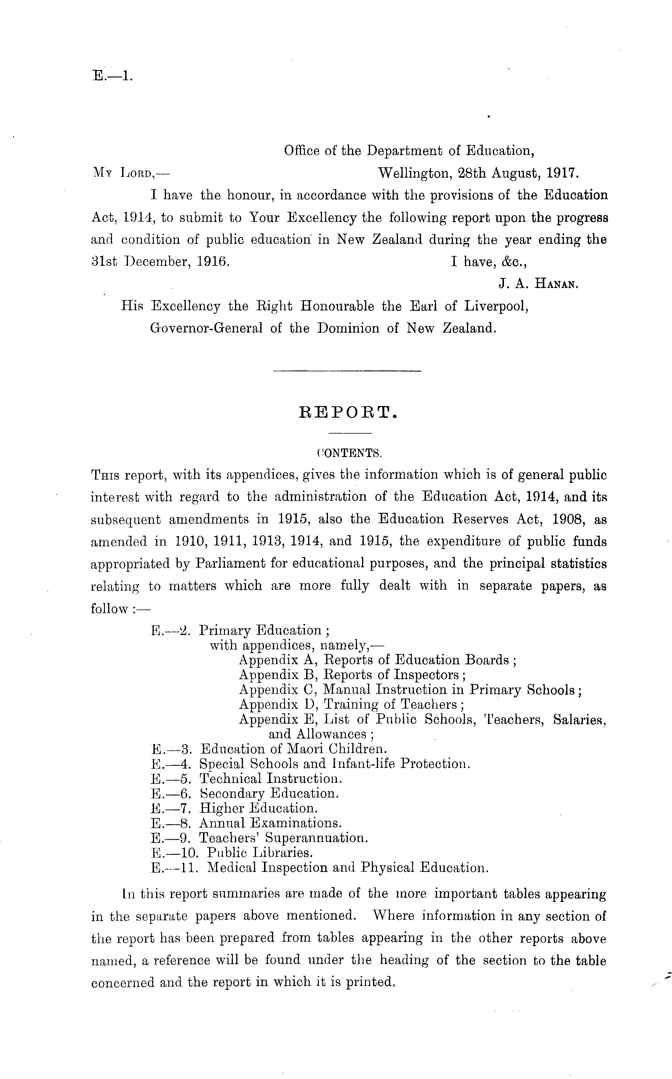 Office of the Department of Education, My Lord,— Wellington, 28th August, 1917. I have the honour, in accordance with the provisions of the Education Act, 1914, to submit to Your Excellency the following report upon the progress and condition of public education' in New Zealand during the year ending the 31st December, 1916. I have, &c, J. A. Hanan. His Excellency the Right Honourable the Earl of Liverpool, Governor-General of the Dominion of New Zealand.