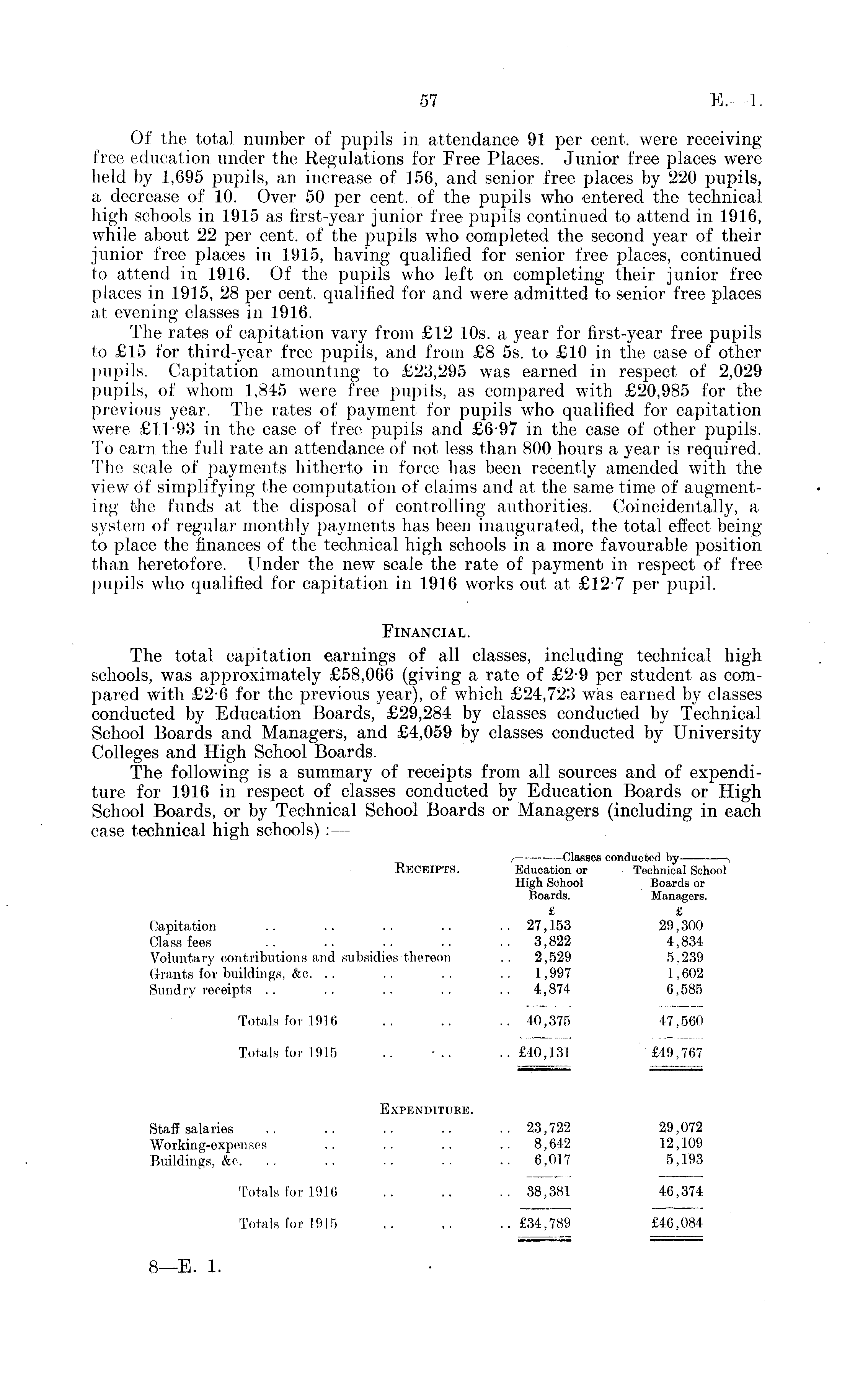 Of the total number of pupils in attendance 91 per cent, were receiving free education under the Regulations for Free Places. Junior free places were held by 1,695 pupils, an increase of 156, and senior free places by 220 pupils, a decrease of 10. Over 50 per cent, of the pupils who entered the technical high schools in 1915 as first-year junior free pupils continued to attend in 1916, while about 22 per cent, of the pupils who completed the second year of their junior free places in 1915, having qualified for senior free places, continued to attend in 1916. Of the pupils who left on completing their junior free places in 1915, 28 per cent, qualified for and were admitted to senior free places at evening classes in 1916. The rates of capitation vary from £12 10s. a year for first-year free pupils to £15 for third-year free pupils, and from £8 ss. to £10 in the case of other pupils. Capitation amounting to £23,295 was earned in respect of 2,029 pupils, of whom 1,845 were free pupils, as compared with £20,985 for the previous year. The rates of payment for pupils who qualified for capitation were £11-93 in the case of free pupils and £6-97 in the case of other pupils. To earn the full rate an attendance of not less than 800 hours a year is required. The scale of payments hitherto in force has been recently amended with the view of simplifying the computation of claims and at the same time of augmenting the funds at the disposal of controlling authorities. Coincidentally, a system of regular monthly payments has been inaugurated, the total effect being to place the finances of the technical high schools in a more favourable position than heretofore. Under the new scale the rate of payment in respect of free pupils who qualified for capitation in 1916 works out at £12-7 per pupil. Financial. The total capitation earnings of all classes, including technical high schools, was approximately £58,066 (giving a rate of £2-9 per student as compared with £2-6 for the previous year), of which £24,723 was earned by classes conducted by Education Boards, £29,284 by classes conducted by Technical School Boards and Managers, and £4,059 by classes conducted by University Colleges and High School Boards. The following is a summary of receipts from all sources and of expenditure for 1916 in respect of classes conducted by Education Boards or High School Boards, or by Technical School Boards or Managers (including in each case technical high schools) : — , Classes conducted by RECEIPTS. Education or Technical School High School Boards or Boards. Managers. £ £ Capitation .. .. .. .. ..27,153 29,300 Class fees .. .. .. .. .. 3,822 4,834 Voluntary contributions and subsidies thereon .. 2,529 5.239 Grants for buildings, &c. .. .. .. ..1,997 1,602 Sundry receipts .. .. .. .. ..4,874 6,585 Totals for 1916 .. .. .. 40,375 47,560 Totals for 1915 .. •.. .. £40,131 £49,767 Expenditure. Staff salaries .. .. .. .. .. 23,722 29,072 Working-expenses .. .. .. ..8,642 12,109 Buildings, &c 6,017 5,193 Totals for 1916 .. .. ..38,381 46,374 Totals for 1915 .. .. ..£34,789 £46,084
