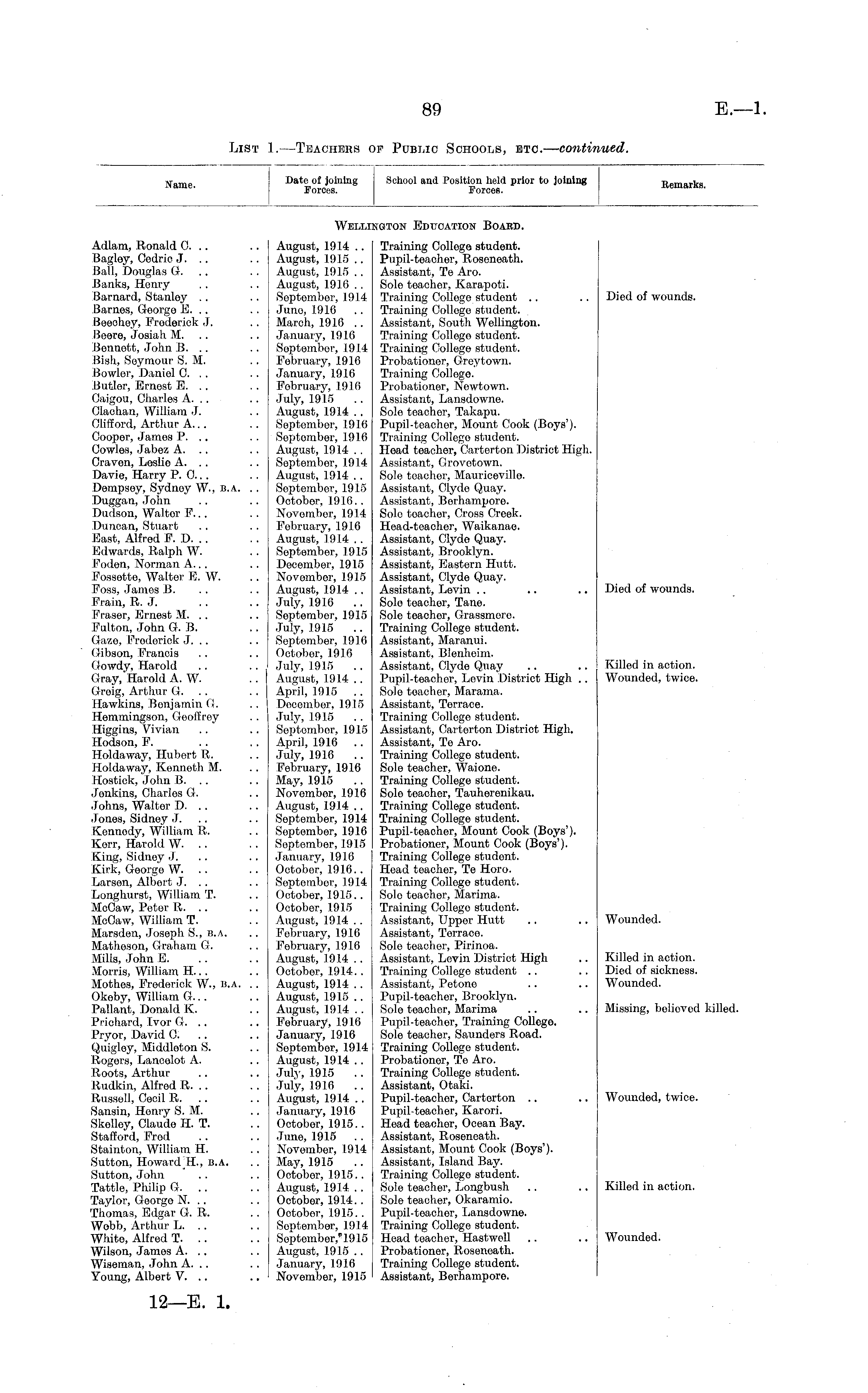 Name. Date of joining Forces. School and Position held prior to joining Forces. Remarks. Wblli rGTON Education Board. Adlam, Ronald 0. .. Bagley, Cedric J. .. Ball, Douglas G. .. Banks, Henry Barnard, Stanley Barnes, George E. .. Beeohoy, Froderick J. Beere, Josiah M. .. Bonnett, John B. .. Bish, Soymour S. M. Bowler, Daniel C. . . Butler, Ernest E. . . Caigou, Charles A. . . Clachan, William J. Clifford, Arthur A... Cooper, James P. .. Cowles, Jabez A. Craven, Leslie A. . . Davie, Harry P. 0... Dompsoy, Sydney W., b.a. Duggan, John Dudson, Waltor F... Duncan, Stuart East, Alfred F. D. .. Edwards, Ralph W. Fodon, Norman A... Fossette, Walter E. W. Foss, James B. Frain, R. J. Eraser, Ernest M. .. Fulton, John G. B. Gaze, Froderick J. .. Gibson, Francis Gowdy, Harold Gray, Harold A. W. Groig, Arthur G. .. Hawkins, Bonjamin G. Hemmingson, Geoffrey Higgins, Vivian Hodson, F. Holdaway, Hubert R. Holdaway, Kenneth M. Hostiek, John B. .. Jenkins, Charles G. Johns, Waltor D. . . Jones, Sidney J. Kennody, William R. Kerr, Harold W. .. King, Sidney J. Kirk, George W. .. Larson, Albert J. . . Longhurst, William T. McOaw, Peter R. .. MoOaw, William T. Marsden, Joseph S., r.a. Mathoson, Graham G. Mills, John E. Morris, William H... Mothes, Frederick W., b.a. .. Okeby, William G... Pallant, Donald K. Priehard, Ivor G. .. Pryor, David 0. .. Quigley, Middleton S. Rogors, Lancelot A. Roots, Arthur Rudkin, Alfred R. .. Russell, Cecil R. .. Sansin, Henry S. M. Skelley, Claude H. T. Stafford, Frod Stainton, William H. Sutton, b.a. Sutton, John Tattle, Philip G. .. Taylor, George N. .. Thomas, Edgar G. R. Wobb, Arthur L. .. White, Alfred T. .. Wilson, James A. .. Wiseman, John A. .. Young, Albert V. .. August, 1914 .. August, 1915 .. August, 19.1.5 .. August, 1916 . . Septomber, 1914 Juno, 1916 .. March, 1916 .. January, 1916 Soptembor, 1914 February, .1916 January, 1916 Fobruary, .1916 July, 1915 .. August, 1914 . . September, 1916 Septomber, 1916 August, 191.4 . . Soptember, 1914 August, 1914 . . September, 1915 October, 1916.. Novombor, 1914 February, 1916 August, 1914 . . September, 19.15 December, 1.91.5 November, 19.15 August, 1914 .. July, 1916 .. September, 1915 July, 1915 .. Soptember, 1916 October, 1916 July, 1915 .. August, 1914 April, 1915 December, 19.15 July, 1915 Septombor, 191.5 April, 1916 .. July, 1916 .. Fobruary, 1916 May, 1.91.5 November, 191.6 August, 1914 .. September, 1914 Septomber, 1916 Septombor, 1915 January, 1916 October, 1916.. September, 1914 October, 1915.. October, 1.915 August, 1914 . . Fobruary, 1916 February, 19.1.6 August, 1914 October, 1.914. . August, 1914 .. August, 1915 .. August, 1914 . . February, 1916 January, 1916 Soptember, 1914 August, 1914 .. July, 191.5 .. July, 1916 . . August, 1914 January, 1916 October, 1915.. June, 1915 . . November, 1914 May, 1915 October, 1915.. August, 1914 October, 1914.. October, 1915.. Soptember, 1914 Soptember,*.1.915 August, 1915 .. January, 1916 November, 1915 Training College student. Pupil-teacher, Rosonoath. Assistant, Te Aro. Sole teacher, Karapoti. Training Colloge student Training Collogo studont. Assistant, South Wellington. Training Colloge student. Training Colloge student. Probationer, Greytown. Training College. Probationer, Nowtown. Assistant, Lansdowne. Sole teacher, Takapu. Pupil-teacher, Mount Cook (Boys'). Training Collego student. Head teacher, Carterton District High. Assistant, Grovotown. Sole teacher, Mauriceville. Assistant, Clyde Quay. Assistant, Berhampore. Solo toachor, Cross Creek. Head-teacher, Waikanao. Assistant, Clyde Quay. Assistant, Brooklyn. Assistant, Eastorn Hutt. Assistant, Clyde Quay. Assistant, Levin Solo toachor, Tane. Solo teacher, Grassmoro. Training Collego student. Assistant, Maranui. Assistant, Blenheim. Assistant, Clydo Quay Pupil-teacher, Levin District High . . Sole teacher, Marama. Assistant, Terrace. Training Colloge student. Assistant, Carterton District High. Assistant, Te Aro. Training College student. Sole teacher, Waione. Training College student. Sole teacher, Tauherenikau. Training Collego student. Training Colloge student. Pupil-teacher, Mount Cook (Boys'). Probationer, Mount Cook (Boys'). Training College studont. Head teacher, Te Horo. Training College studont. Solo toachor, Marima. Training Collego studont. Assistant, Upper Hutt Assistant, Terrace. Sole teacher, Pirinoa. Assistant, Levin District High Training Colloge student Assistant, Potono Pupil-teacher, Brooklyn. Sole teacher, Marima Pupil-teacher, Training College. Solo teacher, Saundors Road. Training College student. Probationer, Te Aro. Training Colloge student. Assistant, Otaki. Pupil-toacher, Cartorton Pupil-toacher, Karori. Head teacher, Ocean Bay. Assistant, Rosenoath. Assistant, Mount Cook (Boys'). Assistant, Island Bay. Training Collogo student. Sole teacher, Longbush Sole teacher, Okaramio. Pupil-teacher, Lansdowne. Training College student. Hoad teachor, Hastwell Probationer, Rosonoath. Training College student. Assistant, Berhampore. Died of wounds. Died of wounds. Killed in action. Wounded, twice. Wounded. Killed in action. Died of sickness. Wounded. Missing, believed killed. Woundod, twice. Killed in action. Wounded.