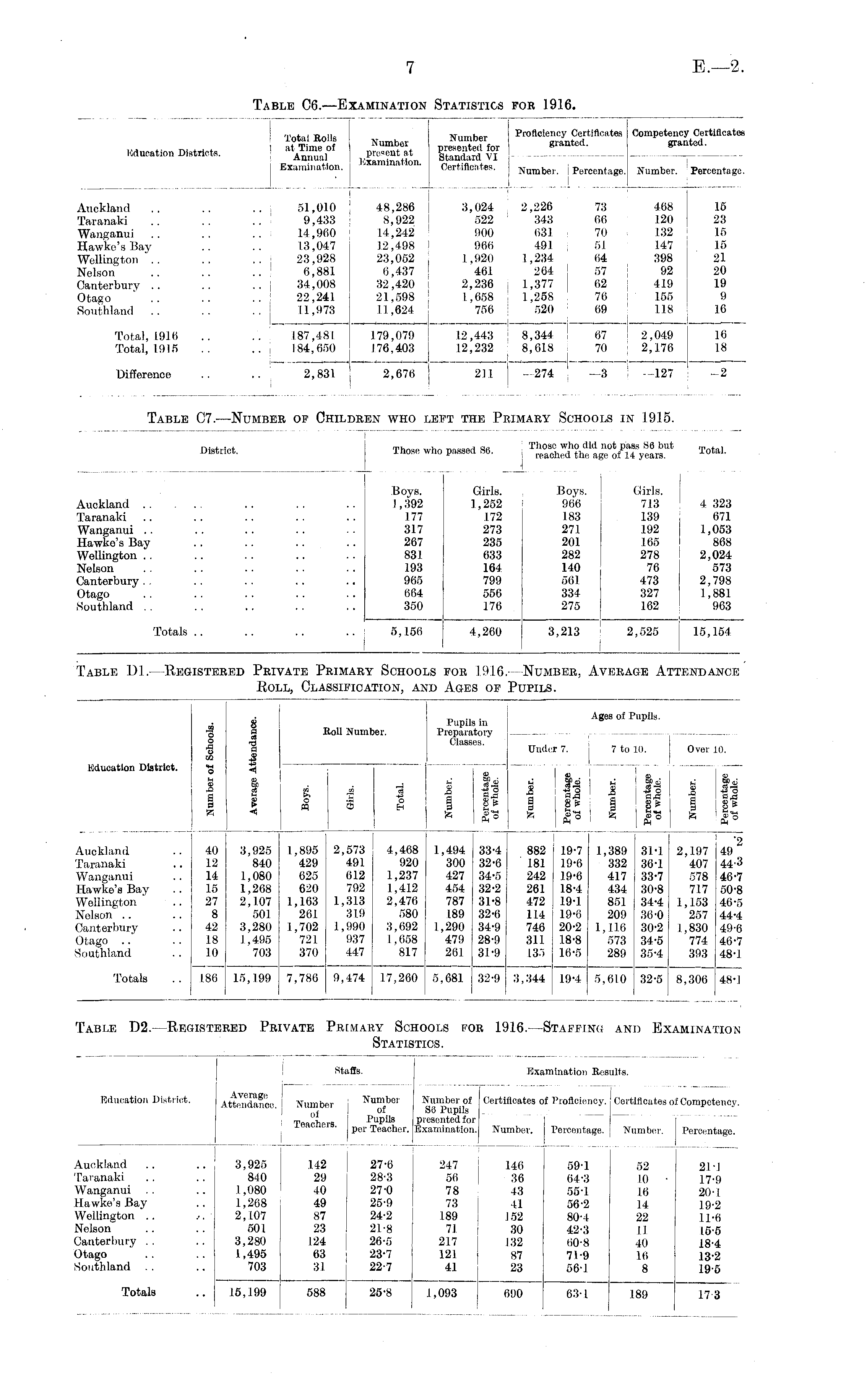 Education Districts. Total Bolls at Time of Annual Examination, j i Number present at ; Examination. Kr.**»h** i Proficiency Certificates Competency p.-e™for ' «™ nted ' «"-» Standard VI ■ Certifleat.es. j Numb er. Percentage. Number. : r Certificate! i ted. Percentage I Auckland Taranaki Wanganui Hawke's Bay Wellington Nelson Canterbury Otago Southland Total, 1916 Total, 1915 Difference I .. i 51,010 ; .. ! 9,433 ; .. ! 14,960 1.3,047 23,928 6,881 34,008 22,241 1.1,973 187,481 .. j 184,650 .. | 2,831 | 48,286 8,922 14,242 12,498 ) 23,052 . 6,437 ! 32,420 21,598 ! 11,624 ! 3,024 2,226 73 468 522 343 66 120 900 631 i 70 132 966 491 51 147 1,920 1,234 64 398 461 264 57 92 2,236 : 1,377 62 419 1,658 ! 1,258 76 155 756 ! 520 69 118 16 23 15 15 21 20 19 9 16 —i—. 1— ,\ 179,079 ! 176,403 | __;__ ;__ j 12,443 8,344 67 ! 2,049 12,232 8,618 70 2,176 211 —274 —3 —127 16 18 . .1 2,676 -2 I I