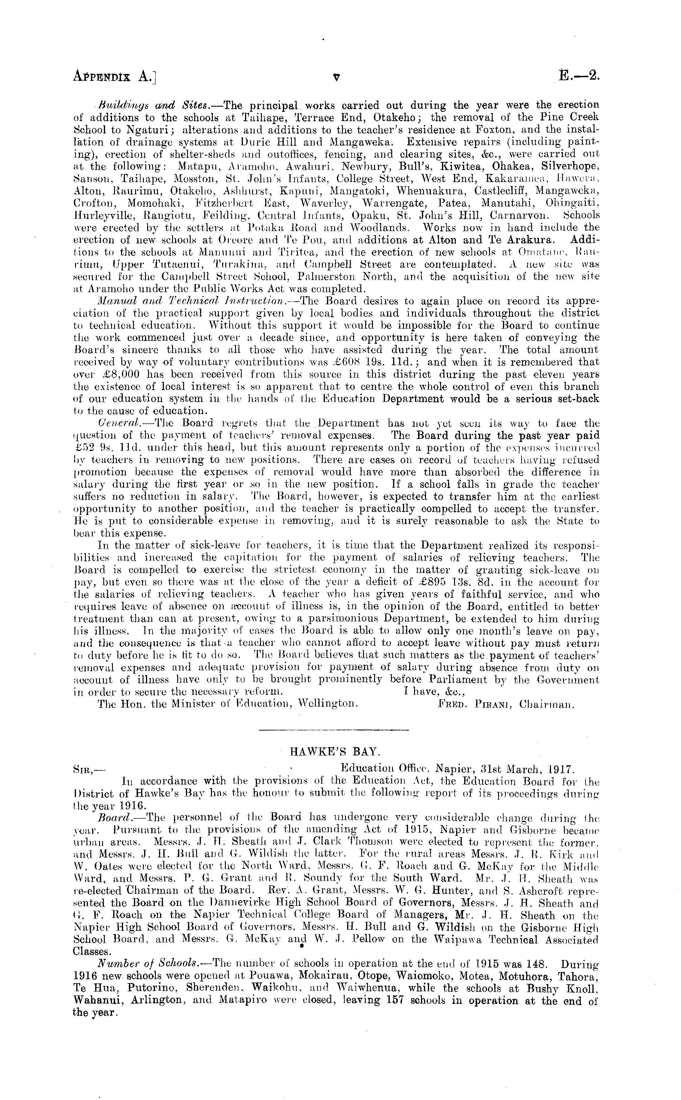 HAWKE'S BAY. Sir, — ■ Education Office, Napier, 31st March, 1917. In accordance with the provisions of the Education Act, the Education Board for the District of Hawke's Bay has the honour to submit the following report of its proceedings during the year 1916. Board. —The personnel of (he Board lias undergone very considerable change during Ihe year. Pursuant to the provisions of the amending Act of 1915, Napier and Gisborne became urban areas. Messrs. -I. 11. Sheath and J. Clark Thomson were elected to represent the former. and Messrs. J. 11. Bull anil G. Wildisli the latter. For the rural areas Messrs. ,!. R. Kirk and VV. Gates were elected for the North Ward. Messrs. (i. E. Roach and G. McKay for Ihe Middle Ward, and Messrs. P. G. Grant and P. Soundy for the South Ward. Mr. J. 11. Sheath was re-elected Chairman of the Board. Rev. A. Grant, Messrs. W. G. Hunter, and S. Ashcroft represented the Board on the Dannevirke High School Board of Governors, Messrs. J. H. Sheath and G. F. Roach on the Napier Technical College Board of Managers, Mr. .1. H, Sheath on the Napier High School Board of Governors. Messrs. H. Bull and G. Wildisli on the Gisborne High School Board, and Messrs. G. McKay and W. J. Pellow on the Waipawa Technical Associated Classes. Number of Schools.—'The number of schools in operation at the end of 1915 was 148. During 1916 new schools were opened at Pouawa, Mokairau, Otope, Waiomoko, Motea, Motuhora. Tahora, Te Hua, Putorino, Sherenden. Waikohu, ami Waiwhenua. while the schools at Bushy Knoll. Wahanui, Arlington, and Matapiro were closed, leaving 157 schools in operation at the end of the year.