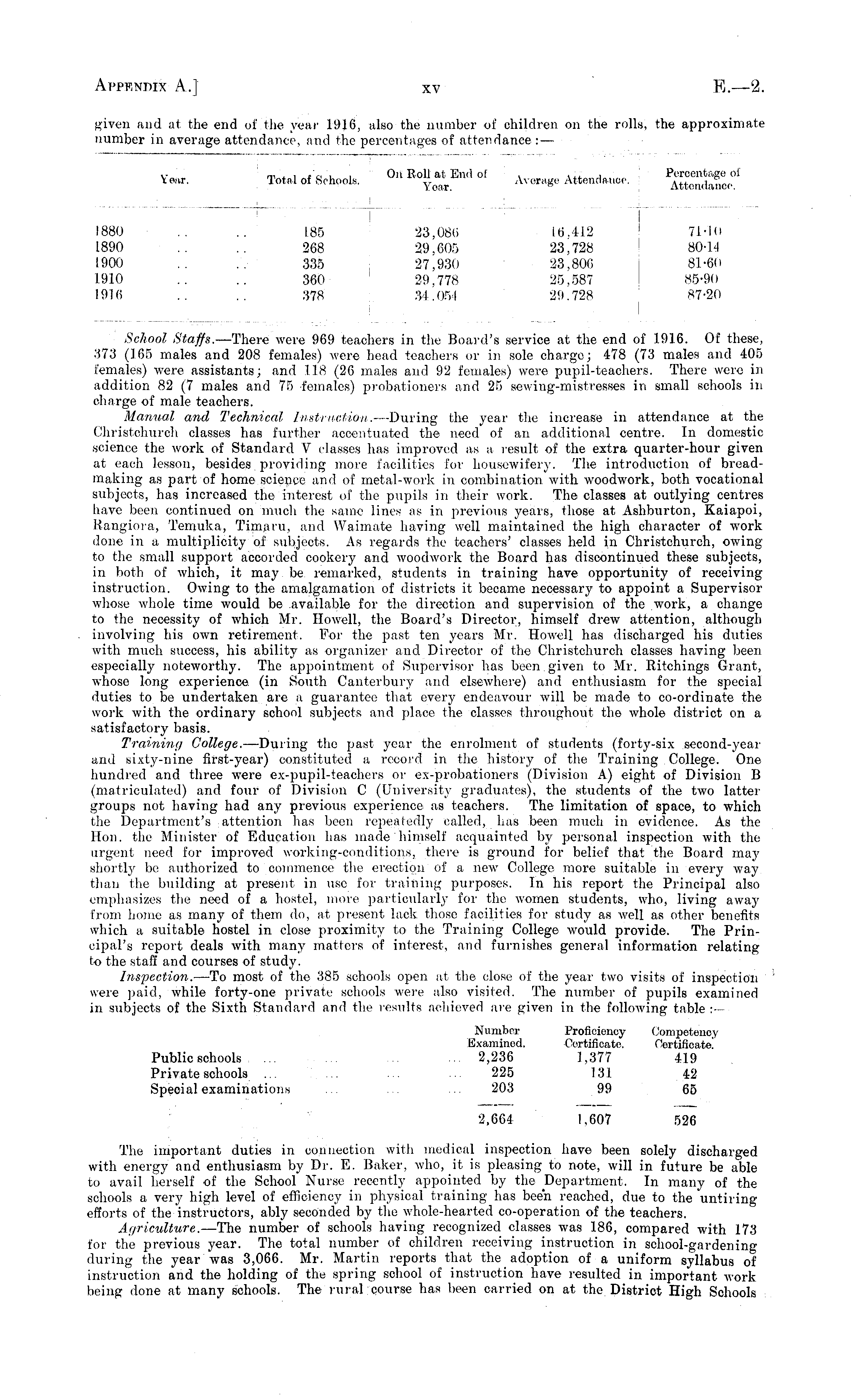 School Staffs. —There were 969 teachers in the Board's service at the end of 1916. Of these, 373 (165 males and 208 females) were head teachers or in sole charge; 478 (73 males and 405 females) were assistants; and 11.8 (26 males and 92 females) were pupil-teachers. There were in addition 82 (7 males and 75 females) probationers and 25 sewing-mistresses in small schools in charge of male teachers. Manual and Technical Instruction. —During the year the increase in attendance at the Christchurch classes has further accentuated the need of an additional centre. In domestic science the work of Standard V classes has improved as a result of the extra quarter-hour given at each lesson, besides providing more facilities for housewifery. The introduction of breadmaking as part of home science and of metal-work in combination with woodwork, both vocational subjects, has increased the interest of the pupils in their work. The classes at outlying centres have been continued on much the same lines as in previous years, those at Ashburton, Kaiapoi, Rangiora, Temuka, Timaru, and Waimate having well maintained the high character of work done in a multiplicity of subjects. As regards the teachers' classes held in Christchurch, owing to the small support accorded cookery and woodwork the Board has discontinued these subjects, in both of which, it may be remarked, students in training have opportunity of receiving instruction. Owing to the amalgamation of districts it became necessary to appoint a Supervisor whose whole time would be available for the direction and supervision of the work, a change to the necessity of which Mr. Howell, the Board's Director, himself drew attention, although involving his own retirement. For the past ten years Mr. Howell has discharged his duties with much success, his ability as organizer and Director of the Christchurch classes having been especially noteworthy. The appointment of Supervisor has been.given to Mr. Ritchings Grant, whose long experience, (in South Canterbury and elsewhere) and enthusiasm for the special duties to be undertaken are a guarantee that every endeavour will be made, to co-ordinate the work with the ordinary school subjects and place the classes throughout the whole district on a satisfactory basis. Training College. —During the past year the enrolment of students (forty-six second-year and sixty-nine first-year) constituted a record in the history of the Training College. One hundred and three were ex-pupil-teachers or ex-probationers (Division A) eight of Division B (matriculated) and four of Division C (University graduates), the students of the two latter groups not having had any previous experience as teachers. The limitation of space, to which the Department's attention has been repeatedly called, has been much in evidence. As the Hon. the Minister of Education has made himself acquainted by personal inspection with the urgent need for improved working-conditions, there is ground for belief that the Board may shortly be authorized to commence the erection of a new College more suitable in every way than the building at present in use for training purposes. In his report the Principal also emphasizes the need of a hostel, more particularly for the women students, who, living away from home as many of them do, at present lack those facilities for study as well as other benefits which a suitable hostel in close proximity to the Training College would provide. The Principal's report deals with many matters of interest, and furnishes general information relating to the staff and courses of study. Inspection. —To most of the 385 schools open at the close of the year two visits of inspection were paid, while forty-one private schools were also visited. The number of pupils examined in subjects of the Sixth Standard and the results achieved are given in the following table :— Number Proficiency Competency Examined. Certificate. Certificate! Public schools ... ... ... 2,236 1,377 419 Private schools ... ... ... 225 131 42 Special examinations ... ... ... 203 99 65 2,664 1,607 526 The important duties in connection with medical inspection have been solely discharged with energy and enthusiasm by Dr. E. Baker, who, it is pleasing to note, will in future be able to avail herself of the School Nurse recently appointed by the Department. In many of the schools a very high level of efficiency in physical training has been reached, due to the untiring efforts of the instructors, ably seconded by the whole-hearted co-operation of the teachers. Agriculture. —The number of schools having recognized classes was 186, compared with 173 for the previous year. The total number of children receiving instruction in school-gardening during the year was 3,066. Mr. Martin reports that the adoption of a uniform syllabus of instruction and the holding of the spring school of instruction have resulted in important work being done at many schools. The rural course has been carried on at the District High Schools