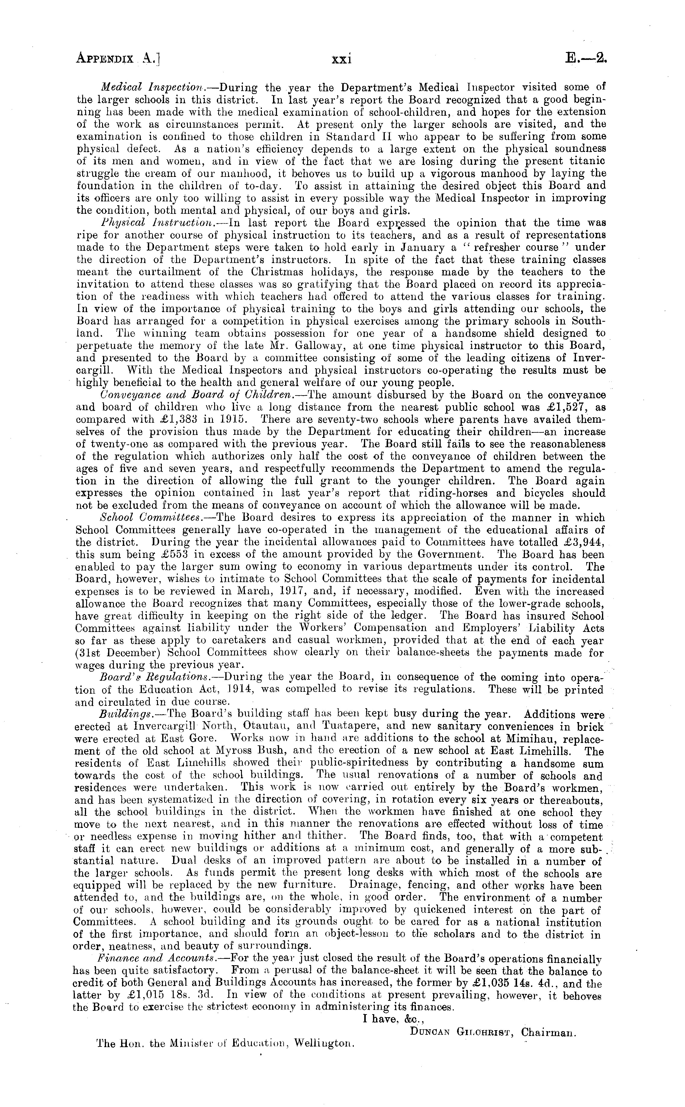 Medical Inspection. —During the year the Department's Medical Inspector visited some of the larger schools in this district. In last year's report the Board recognized that a good beginning has been made with the medical examination of school-children, and hopes for the extension of the work as circumstances permit. At present only the larger schools are visited, and the examination is confined to those children in Standard II who appear to be suffering from some physical defect. As a nation's efficiency depends to a large extent on the physical soundness of its men and women, and in view of the fact that we are losing during the present titanic struggle the cream of our manhood, it behoves us to build up a vigorous manhood by laying the foundation in the children of to-day. To assist in attaining the desired object this Board and its officers are only too willing to assist in every possible way the Medical Inspector in improving the condition, both mental and physical, of our boys and girls. Physical instruction. —ln last report the Board expressed the opinion that the time was ripe for another course of physical instruction to its teachers, and as a result of representations made to the Department steps were taken to hold early in January a " refresher course " under the direction of the Department's instructors. In spite of the fact that these training classes meant the curtailment of the Christmas holidays, the response made by the teachers to the invitation to attend these classes was so gratifying that the Board placed on record its appreciation of the readiness with which teachers had offered to attend the various classes for training. In view of the importance of physical training to the boys and girls attending our schools, the Board has arranged for a competition in physical exercises among the primary schools in Southland. The winning team obtains possession for one year of a handsome shield designed to perpetuate the memory of the late Mr. Galloway, at one time physical instructor to this Board, and presented to the Board by a committee consisting of some of the leading citizens of Invercargill. With the Medical Inspectors and physical instructors co-operating the results must be highly beneficial to the health and general welfare of our young people. Conveyance and Board of Children. —The amount disbursed by the Board on the conveyance and board of children who live a long distance from the nearest public school was £1,527, as compared with £1,383 in 1915. There are seventy-two schools where parents have availed themselves of the provision thus made by the Department for educating their children—an increase of twenty-one as compared with the previous year. The Board still fails to see the reasonableness of the regulation which authorizes only half the cost of the conveyance of children between the ages of five and seven years, and respectfully recommends the Department to amend the regulation in the direction of allowing the full grant to the younger children. The Board again expresses the opinion contained in last year's report that riding-horses and bicycles should not be excluded from the means of conveyance on account of which the allowance will be made. School Committees. —The Board desires to express its appreciation of the manner in which School Committees generally have co-operated in the management of the educational affairs of the district. During the year the incidental allowances paid to Committees have totalled £3,944, this sum being £553 in excess of the amount provided by the Government. The Board has been enabled to pay the larger sum owing to economy in various departments under its control. The Board, however, wishes to intimate to School Committees that the scale of payments for incidental expenses is to be reviewed in March, 1917, and, if necessary, modified. Even with the increased allowance the Board recognizes that many Committees, especially those of the lower-grade schools, have great difficulty in keeping on the right side of the ledger. The Board has insured School Committees against liability under the Workers' Compensation and Employers' Liability Acts so far as these apply to caretakers and casual workmen, provided that at the end of each year (31st December) School Committees show clearly on their balance-sheets the payments made for wages during the previous year. Board's Regulations. —During the year the Board, in consequence of the coming into operation of the Education Act, 1914, was compelled to revise its regulations. These will be printed and circulated in due course. Buildings. —The Board's building staff has been, kept busy during the year. Additions were erected at Invercargill North, Otautau, and Tuatapere, and new sanitary conveniences in brick were erected at East Gore. Works now in hand are additions to the school at Mimihau, replacement of the old school at Myross Bush, and the erection of a new school at East Limehills. The residents of East Limehills showed their public-spiritedness by contributing a handsome sum towards the cost of the school buildings. The usual renovations of a number of schools and residences were undertaken. This work is now carried out entirely by the Board's workmen, and has been systematized in the direction of covering, in rotation every six years or thereabouts, all the school buildings in the district. When the workmen have finished at one school they move to the next nearest, and in this manner the renovations are effected without loss of time or needless expense in moving hither and thither. The Board finds, too, that with a competent staff it can erect new buildings or additions at a minimum cost, and generally of a more substantial nature. Dual desks of an improved pattern are about to be installed in a number of the larger schools. As funds permit the present long desks with which most of the schools are equipped will be replaced by the new furniture. Drainage, fencing, and oth