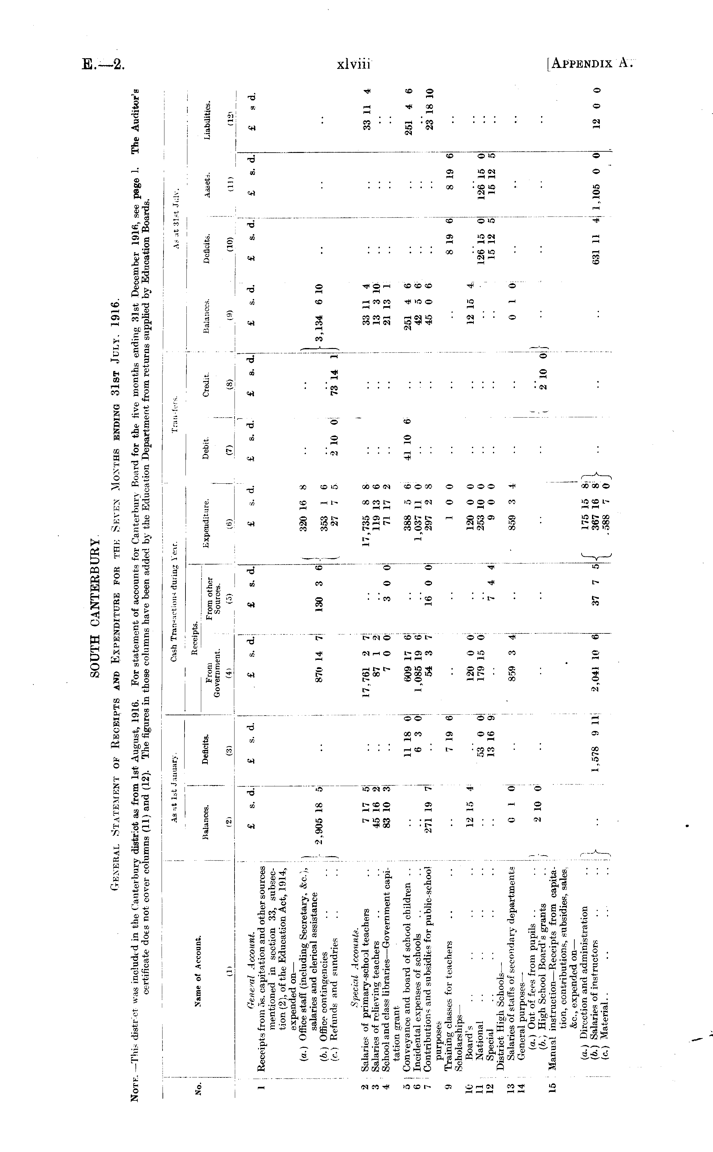 OTF. —' his strict was included in the Canterbury district as from 1st August, 1916. For statement of accounts for Canterbury Board for the five months ending 31st December 1916, see page certificate dots not cover columns (11) and (12). The figures in those columns have been added by the Education Department from returns supplied by Education Boards. Li tor's As --it lit Jai 1 No. Name of Account. Name of Account. As .it 1 5 balances. .As at 1st January. .it J tin umary. nuary. Deficits. Cas) From Government. Cash Tran^ Receipts. Cash Transaction:* during Voar. Receipts. taction* during 1'e; 3 ! ja; ir. ir. Expenditure. Debit, Tranter Trantli-rs. Credit. A.s at 31st July. No. Balances. Deficits. From From other From other Sources. Expenditure. Debit. Credit. Balances. Deficits. Assets. Liabilities. (1) Government. uovernnieni. Sources. sources. (6) (7) (8) (12) J (1) I (2) !2l (3) (3) I (41 (41 i < 3 > _ (5) (?) !__ (7) I (8) I (9) l_ (10) (11) General Account. £ s. d. 1 Receipts from os. capitation and other sources mentioned in section 33, subsection (2), of the Education Act, 1914, expended on — (a.) Office staff (including Secretary, &e.), I salaries and clerical assistance , _„- lc (b.) Office contingencies .. .. f -- 9U01S ° (c.) Refunds and sundries . . .. j Special Accounts. 2 Salaries of primary-school teachers .. 7 17 5 3 Salaries of relieving teachers . . .. 45 16 2 4 School and class libraries —Government capi- 83 10 3 tation grant 5 j Conveyance and board of school children 6 1 Incidental expenses of schools 7 Contributions and subsidies for public-school 271 19 7 purposes 9 Training classes for teachers .. Scholarships — 10 Board's .. .. .. .. 12 15 4 11 National 12 Special District High Schools — 13 ! Salaries of staffs of secondary departments 0 10 14 j General purposes — (a.) Out of fees from pupils . . .. 1 j 1 n n (b.) High School Board's grants .. j ° ° 15 Manual instruction —Receipts from capitation, contributions, subsidies, sales, &c, expended on — (a.) Direction and administration .. ~| (b.) Salaries of instructors .. - • r* (c.) Material.. .. .. • • J £ s. d. 11 18 0 6 3 0 7 19 6 53 0 0 13 16 9 1,578 9 11 £ s. d. 870 14 7 17,761 2 7 87 1 2 7 0 0 609 17 6 1,085 19 6 54 3 7 120 0 0 179 15 0 859 3 4 2,041 10 6 £ s. d. 130 3 6 J 3 0 0 16 0 0 7 4 4 37 7 5<! £ s. d. 320 16 8 353 1 6 27 7 5 17,735 8 8 119 13 6 71 17 2 388 5 6 1,037 11 0 297 2 8 1 0 0 120 0 0 253 10 0 9 0 0 859 3 4 175 15 8i"] 367 16 8 ; y .588 7 0 J 1 £ s. d. 2 10 0 41 10 6 £ s. d. £ s. d. ■ 3,134 6 10 73 14 1 33 11 4 13 3 10 21 13 1 251 4 6 42 5 6 45 0 6 12 15 4 0 10 2 10 0J £ s. d. £ s. d. 8 19 6 8 19 6 126 15 0 126 15 0 15 12 5 15 12 5 631 11 4 1,105 0 0 £ a d. 33 11 ■ 251 4 1 23 18 ll 12 0 Ii